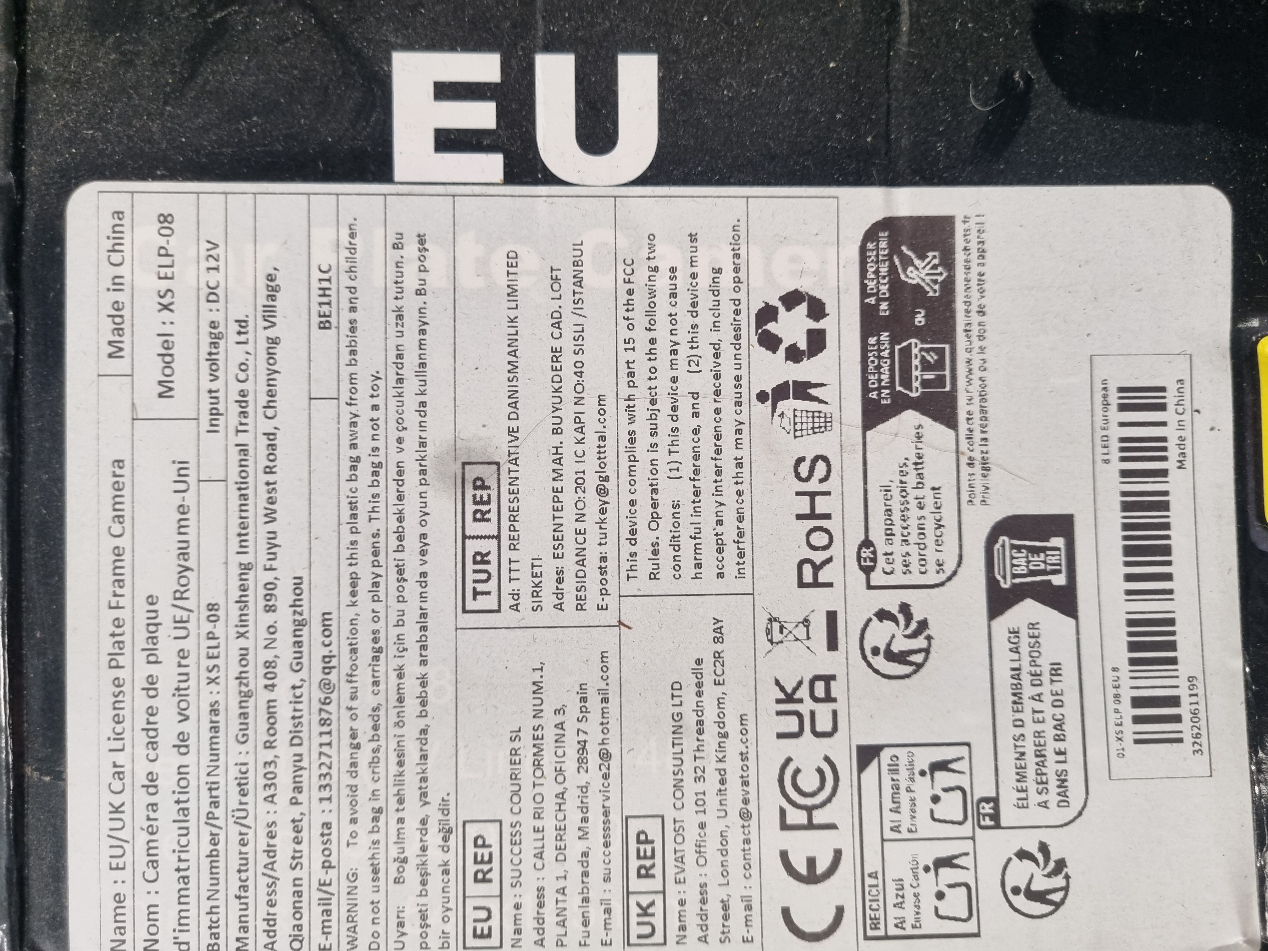 Lot 21: Guangzhou Xinsheng International Trade Co. Ltd. XS ELP-08 Licence Plate Reversing Camera