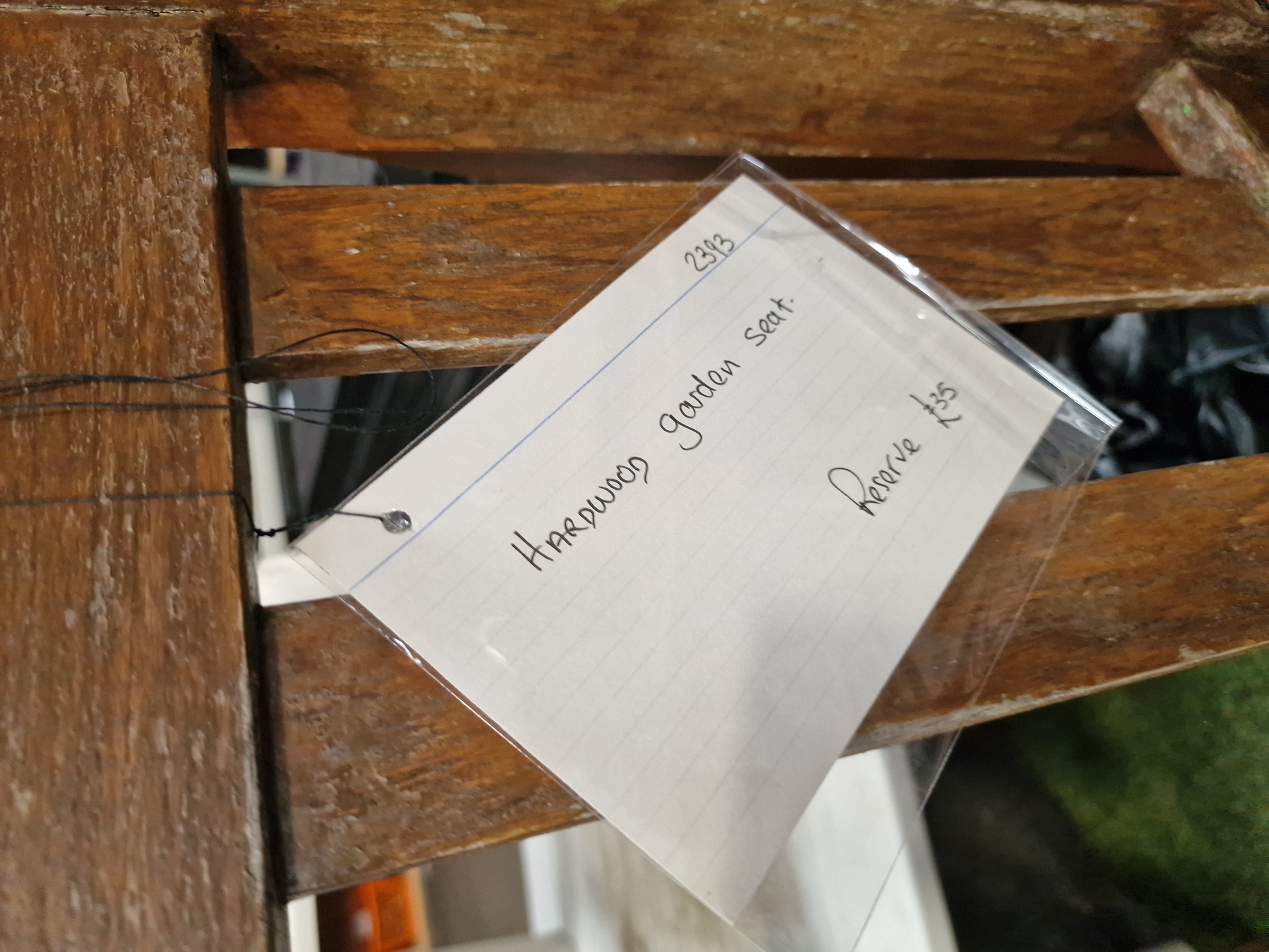 A traditional two-seater garden bench of slatted construction. The piece is manufactured from a dense hardwood, possibly teak, and features a backrest with vertical slats and a seat with horizontal slats. The frame is assembled using mortise and tenon joinery, with visible wooden dowel pins securing the shaped armrests to the uprights. No manufacturer marks, stamps, or labels are present on the structure. The item currently bears a handwritten auction tag numbered 2393 and a corresponding small white adhesive label on the top rail of the backrest.