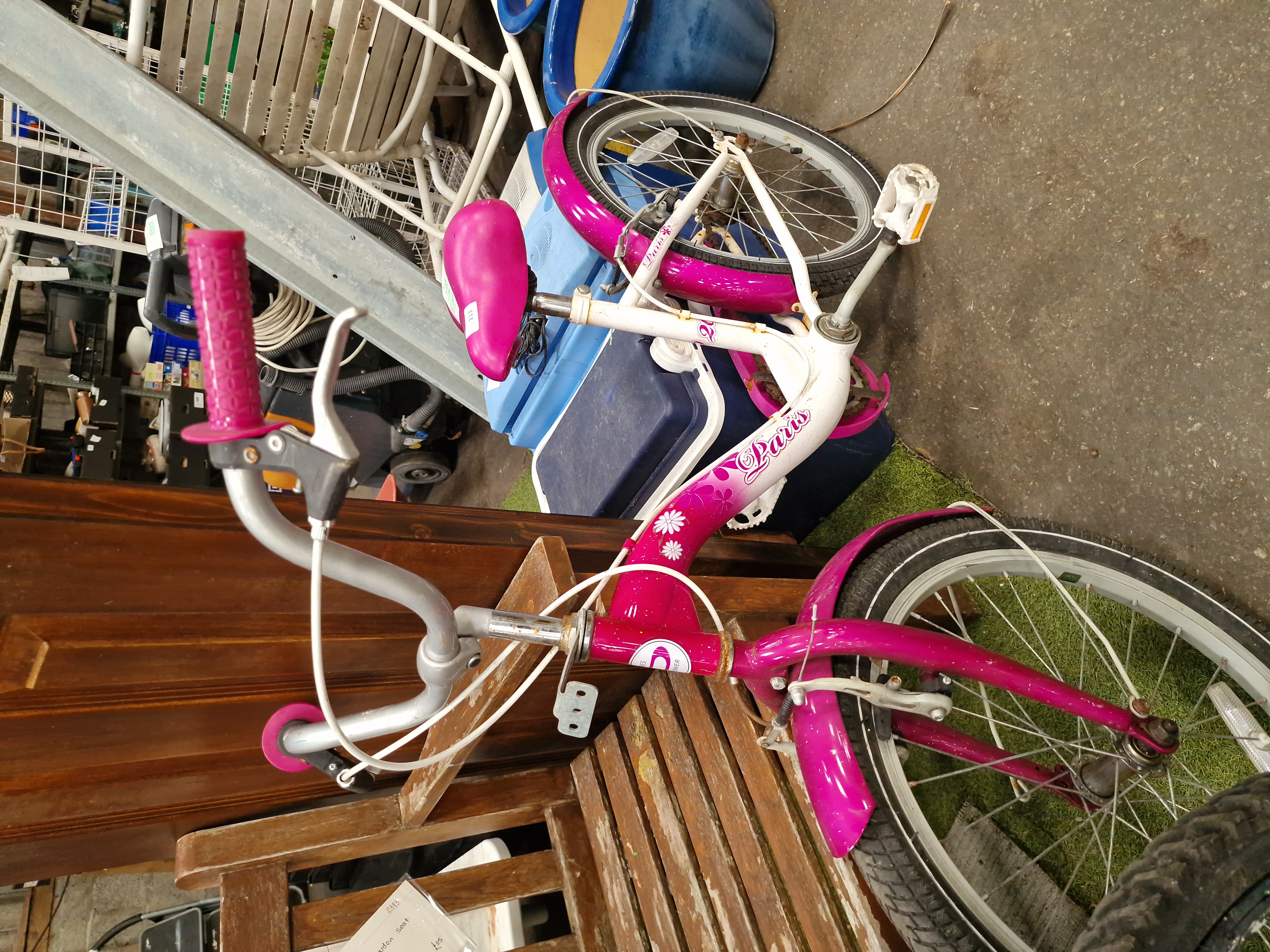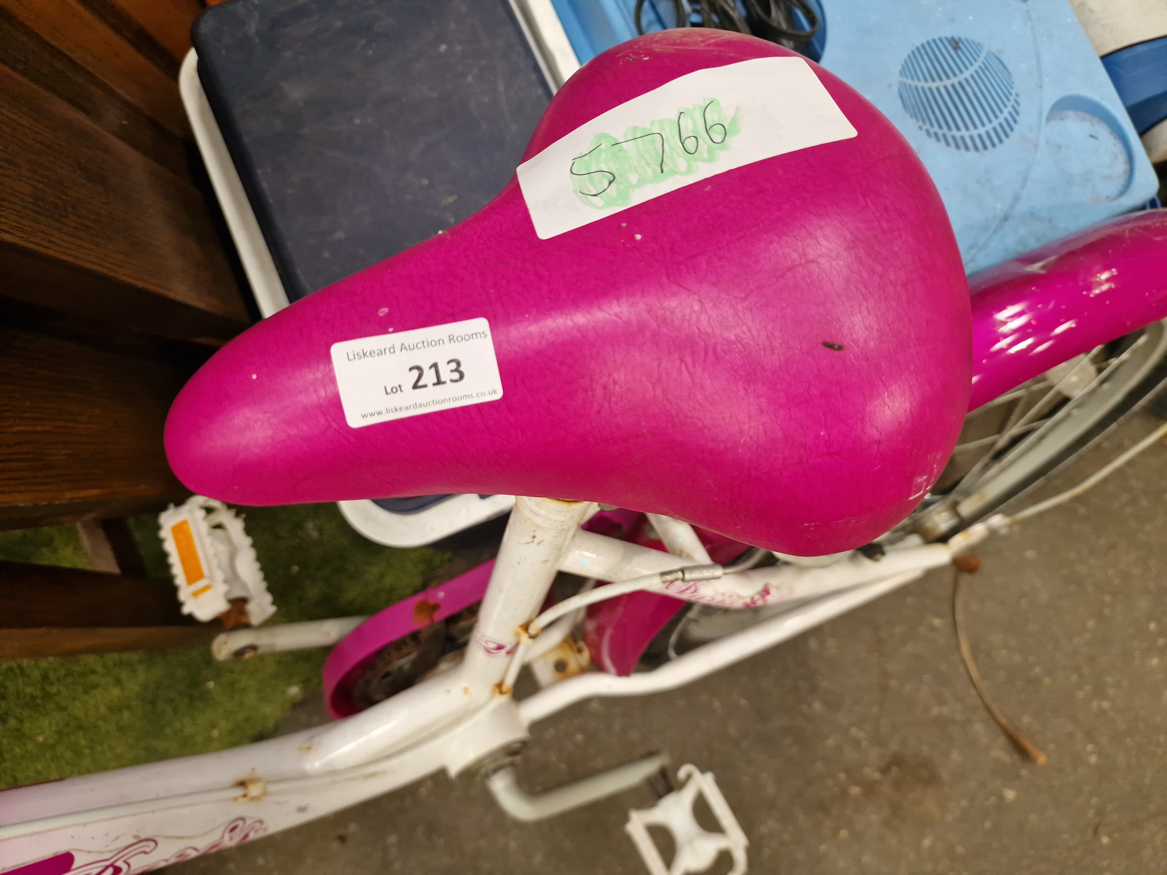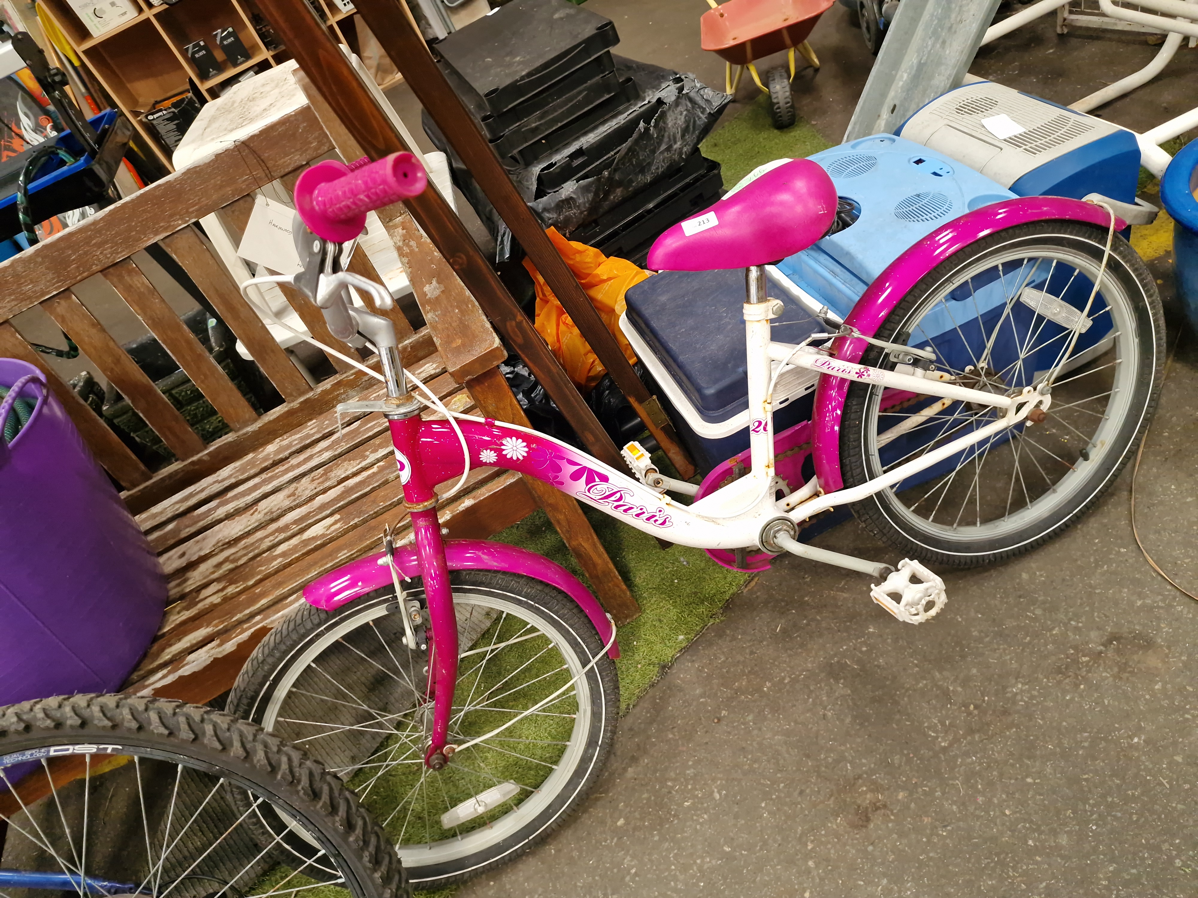 A child’s bicycle manufactured by Concept, model name Paris. The bicycle features a white and magenta colour scheme decorated with floral motifs and script lettering. The frame is constructed with a low-step design and is marked with the number 20. A circular badge on the head tube displays a stylized C logo and the brand name CONCEPT. The bike is equipped with a single front rim brake, white plastic pedals, and a magenta-coloured saddle. Two stickers are present on the saddle: one from Liskeard Auction Rooms for Lot 213 and another with the handwritten reference S766.