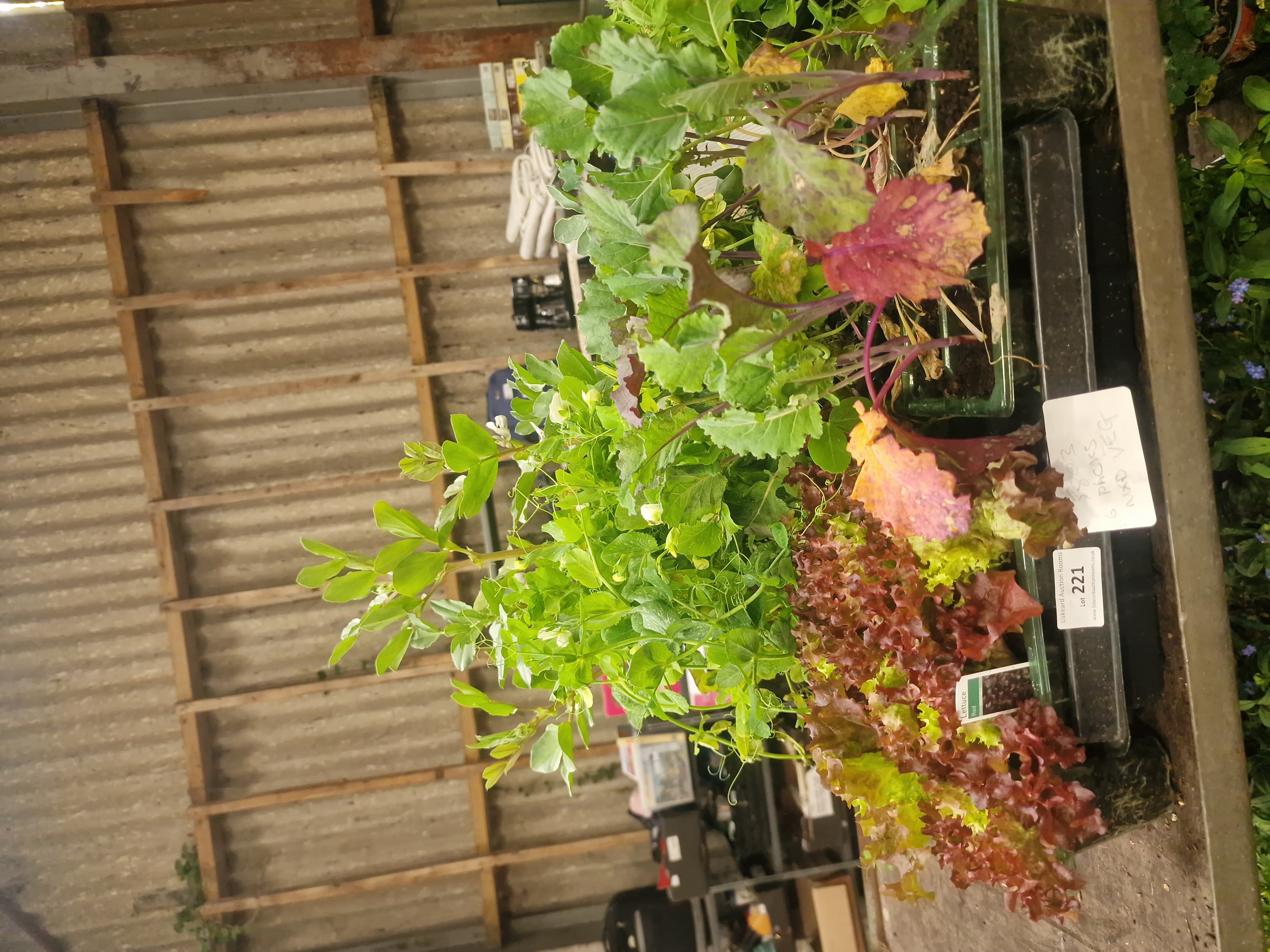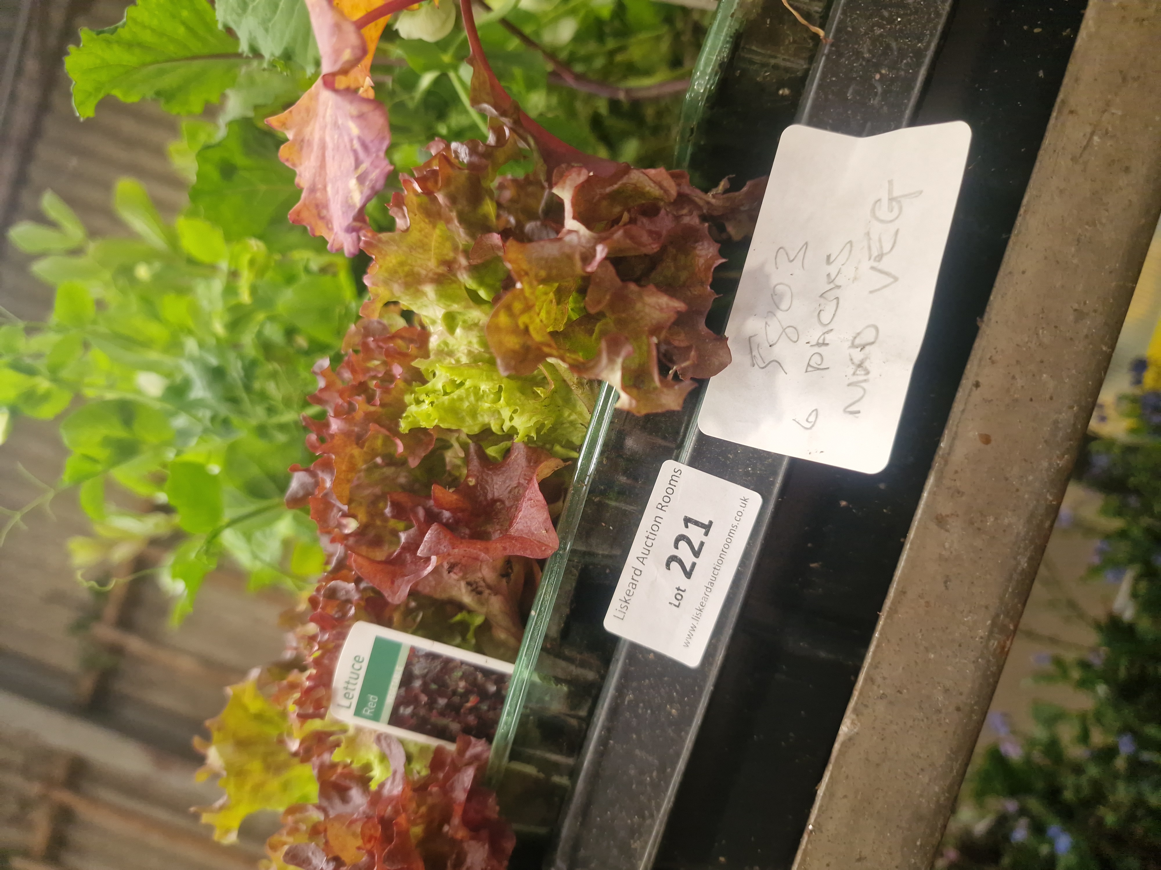 A collection of six packs of young vegetable seedlings in various stages of early growth. The assortment includes red loose-leaf lettuce with frilled burgundy and green foliage, legumes featuring green leaves, tendrils, and small white blossoms, and brassica varieties such as kale or cabbage displaying both green and reddish-purple leaves. The plants are housed in standard green and black plastic nursery trays. A handwritten white tag is included with the text 5803, 6 PACKS, MIXD VEG. A commercial identification label for the lettuce is present, marked Lettuce and Red with an illustrative photograph. The lot is further identified by a Liskeard Auction Rooms tag for Lot 221.