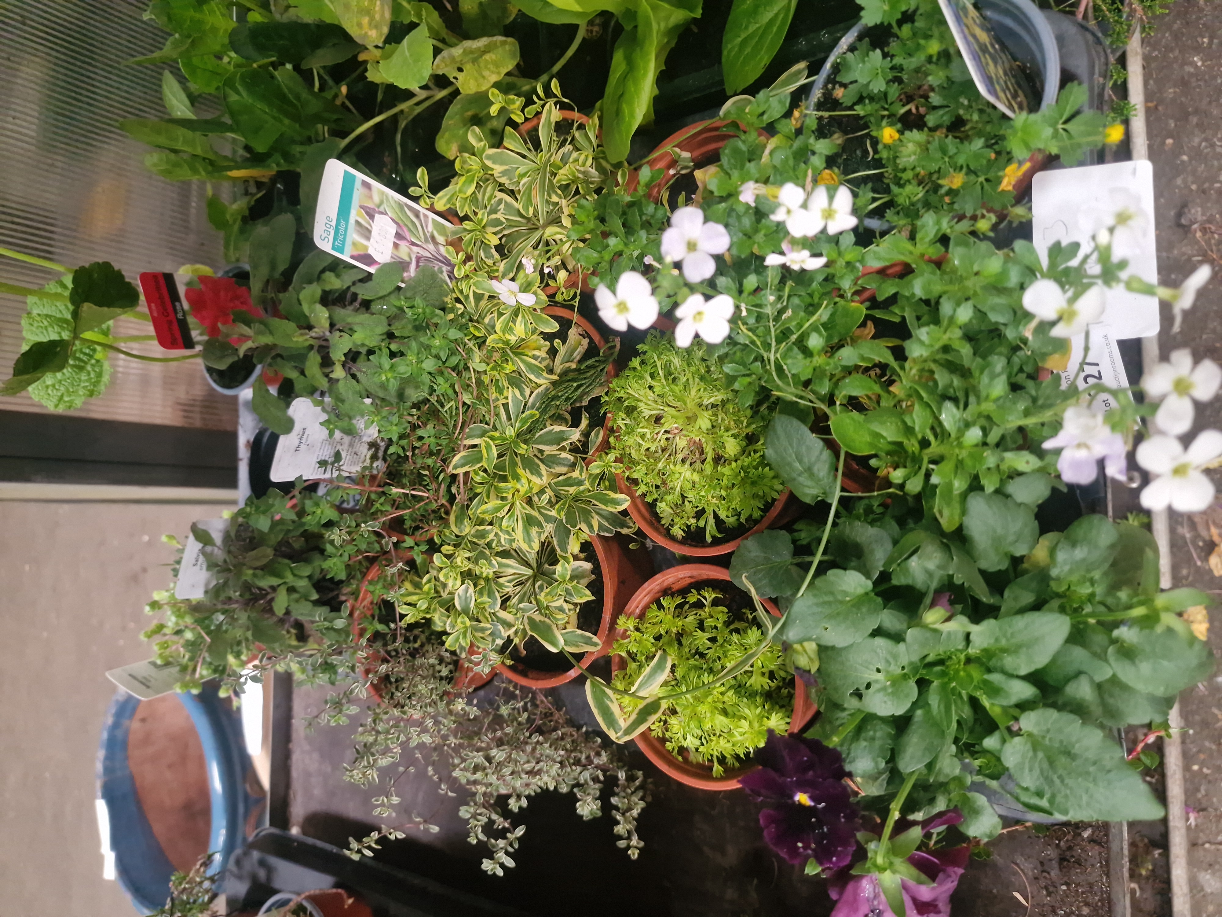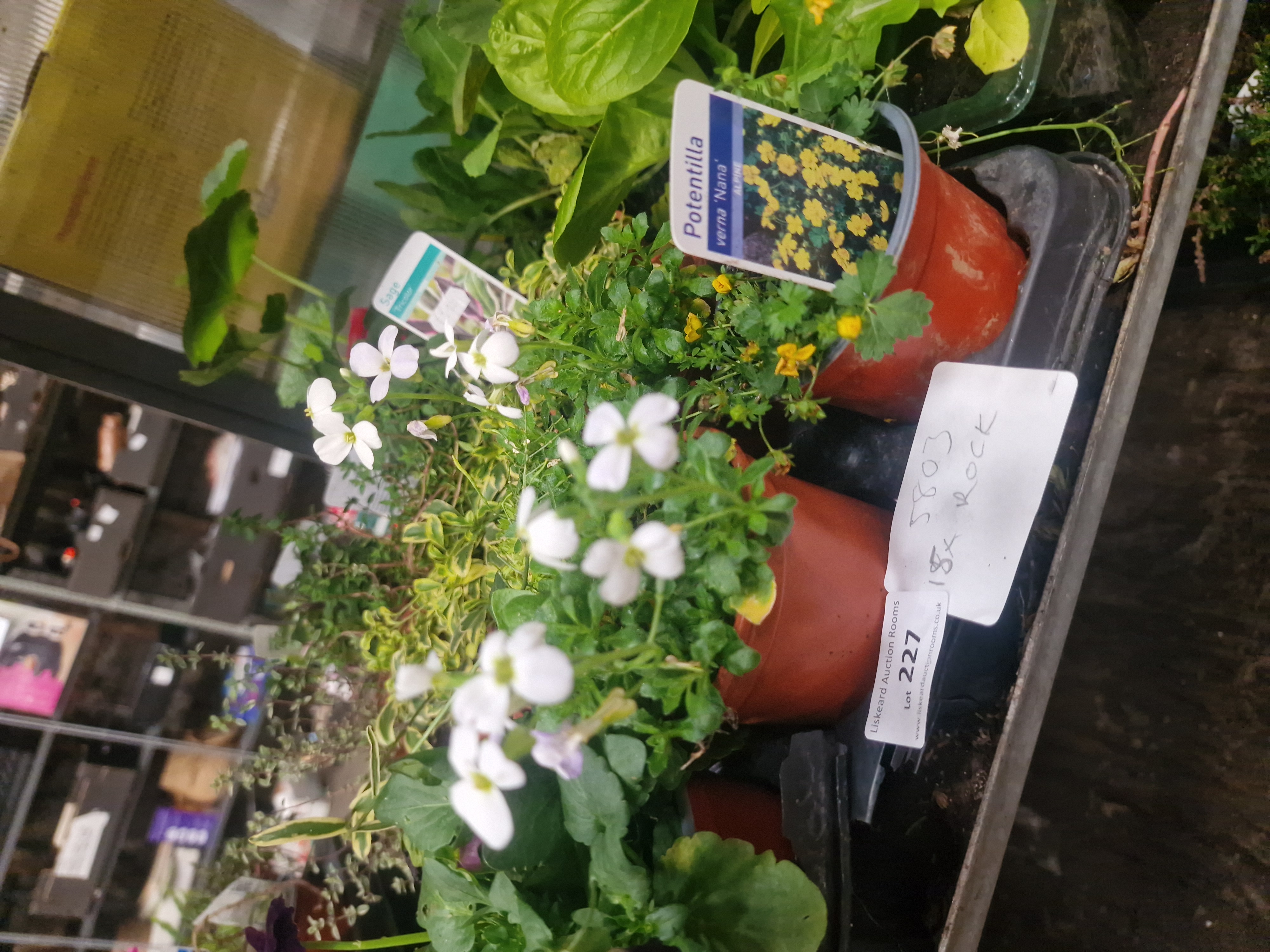 An assortment of 18 small garden and rockery plants. The collection includes various flowering and foliage varieties. Identified specimens include Sage Tricolor (Salvia officinalis Tricolor), Potentilla verna Nana ALPINE, and Thymus. The lot also features pansies (Viola) with purple blooms, white-flowering rockery plants, variegated foliage plants, and various green groundcovers. The plants are housed in individual brown plastic nursery pots, with the majority contained within a black plastic transport tray. The lot bears a printed label for Liskeard Auction Rooms designated as Lot 227 and a handwritten marker with the text J803 and 18x ROCK.