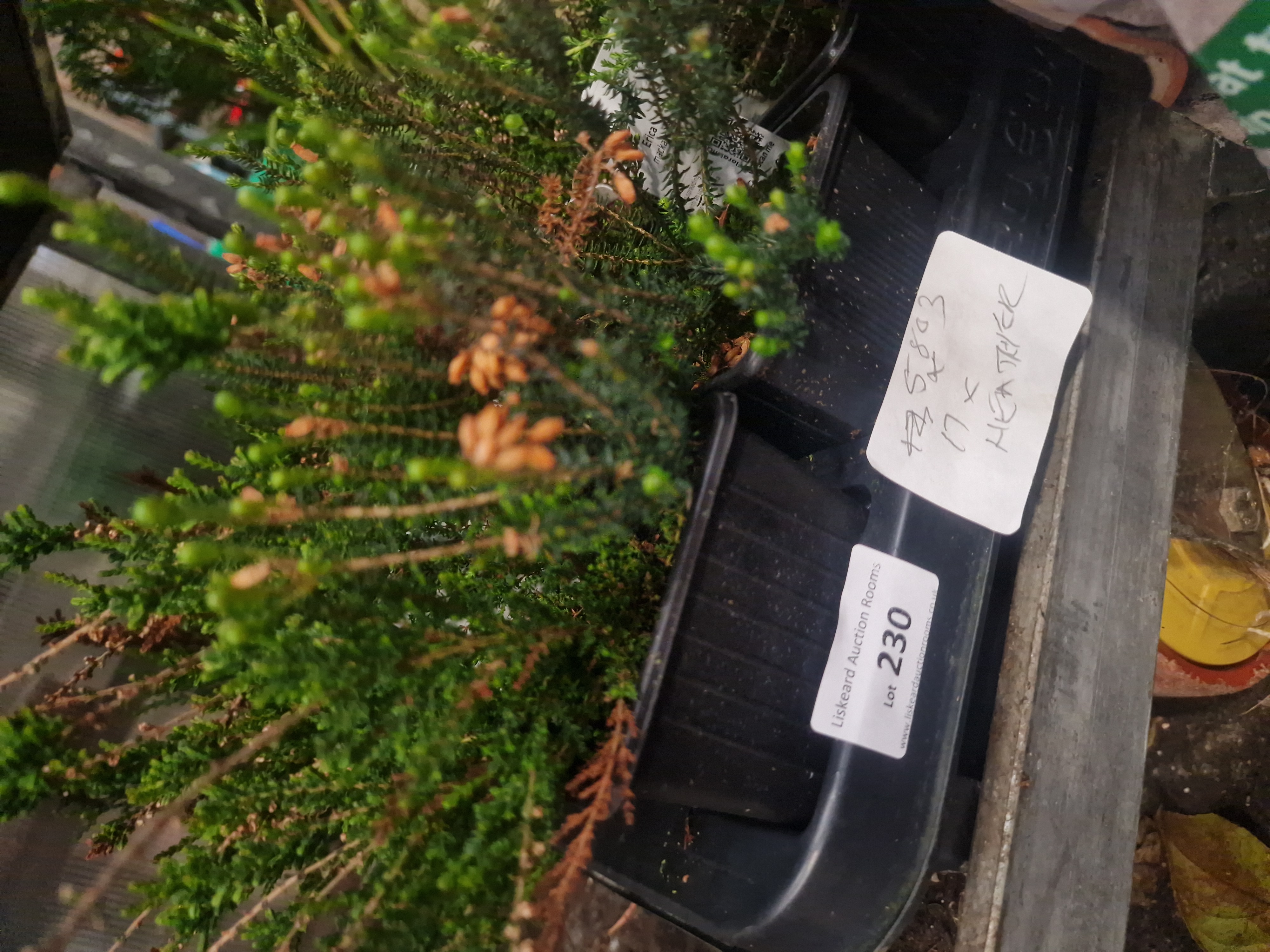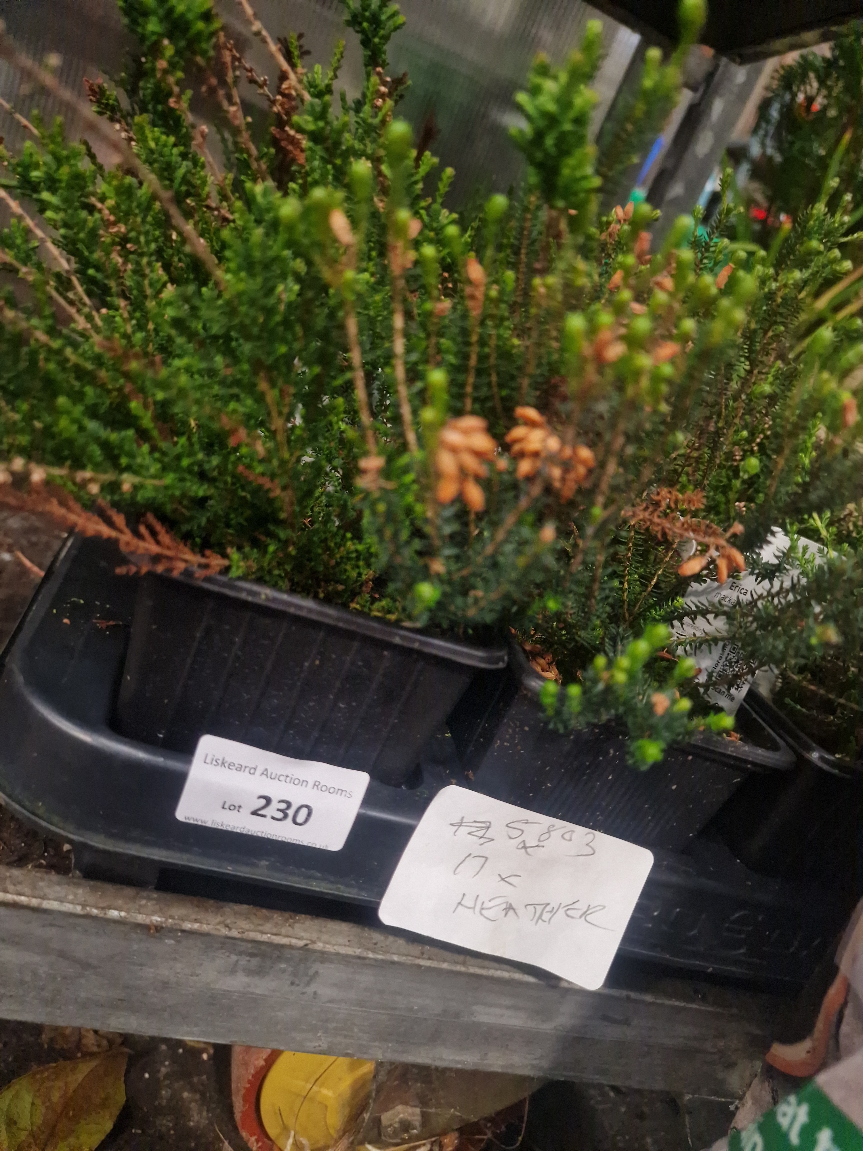 A collection of potted heather plants, including species identified by botanical labels as Calluna and Erica mackayana. The plants are housed in individual black plastic nursery pots and presented within a larger black plastic transport tray. The lot includes botanical identification tags, a handwritten note referencing the plants as heather alongside a numerical reference, and a Liskeard Auction Rooms lot sticker for Lot 230. The items are situated in a nursery or garden environment.