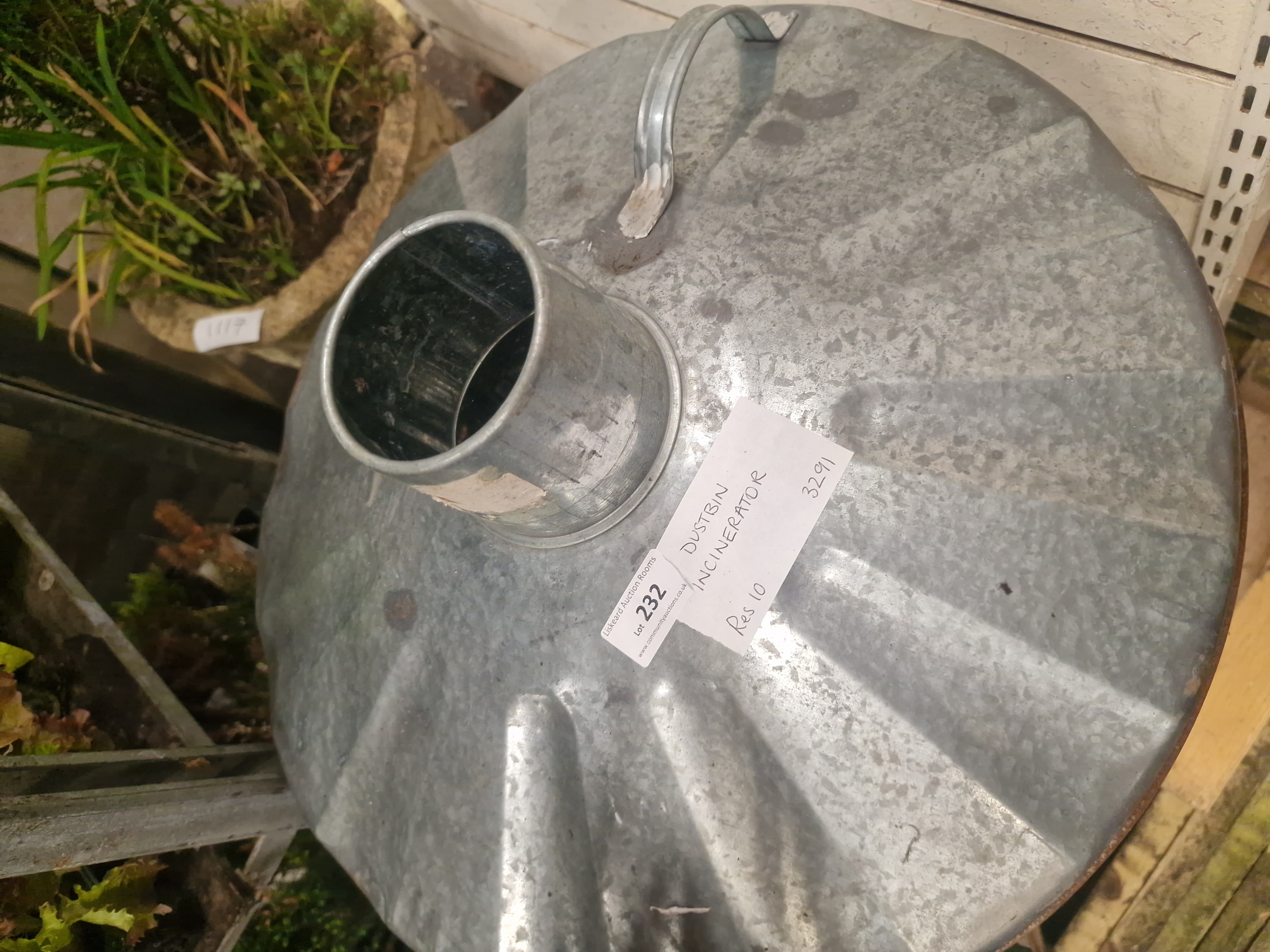 A contemporary utilitarian garden incinerator constructed from galvanised steel. The cylindrical body features corrugated walls for structural reinforcement and a series of circular ventilation holes near the base to promote airflow. The removable conical lid is fitted with a central cylindrical chimney flue and two riveted loop handles. There are no manufacturer marks, stamps, or engraved names visible on the body or lid. The item bears a white adhesive auction label for Liskeard Auction Rooms, Lot 232.