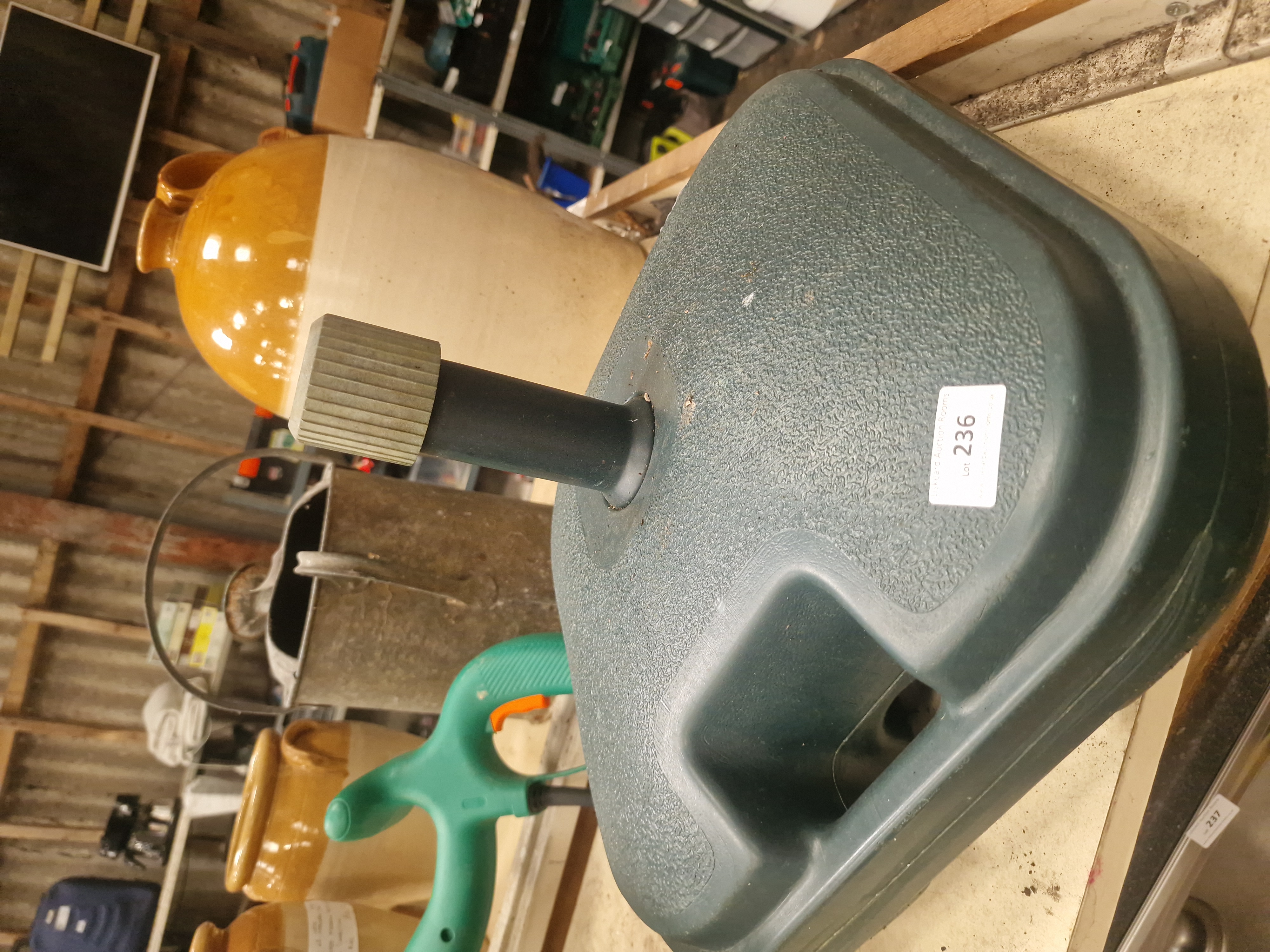 A fillable parasol or umbrella base constructed from dark green moulded plastic with a textured finish. The base features a central upright support column with a grey, ridged tightening collar and an integrated carrying handle for transport. The unit is designed to be weighted with water or sand to provide stability for an outdoor umbrella. It bears a white auction label marked Lot 236.