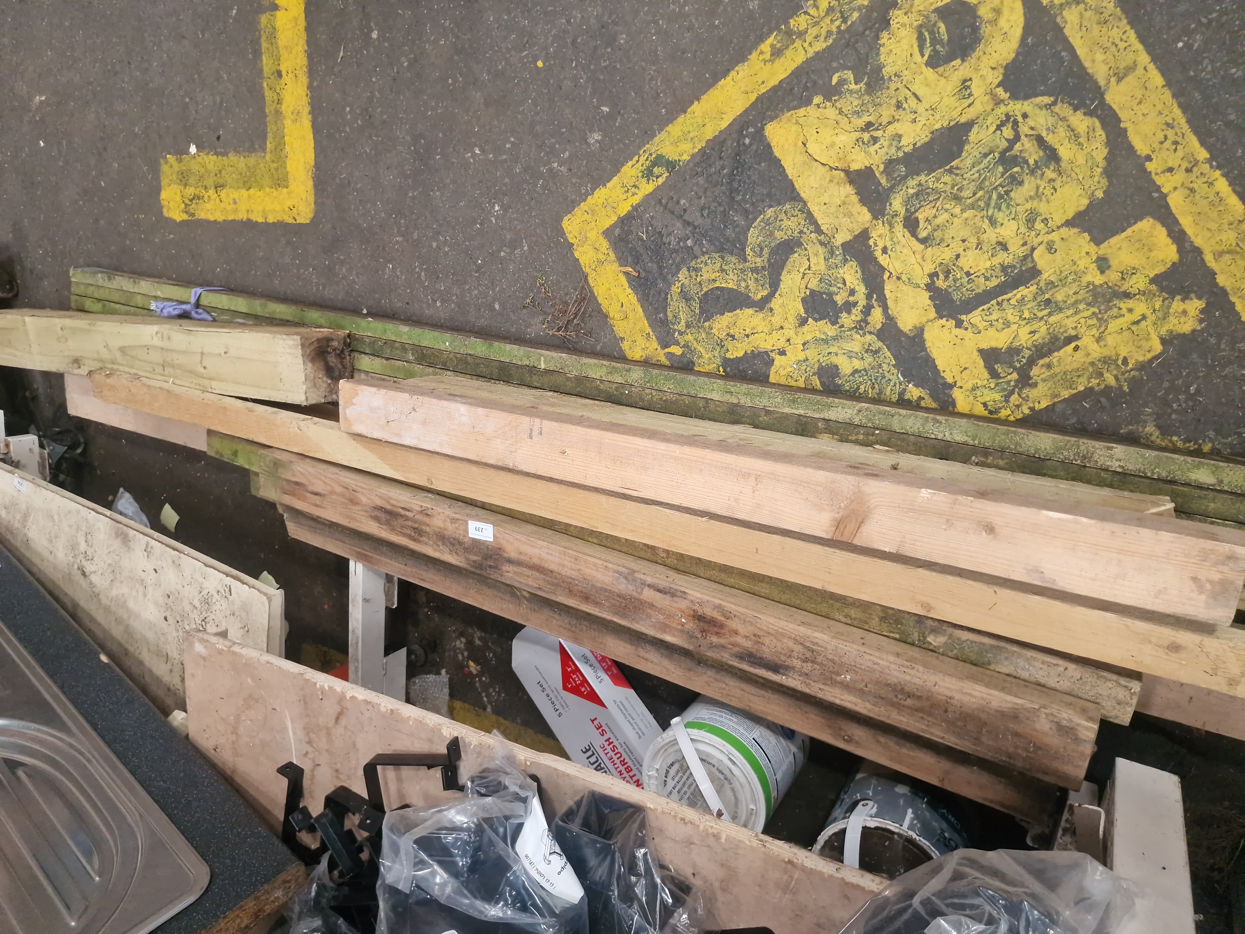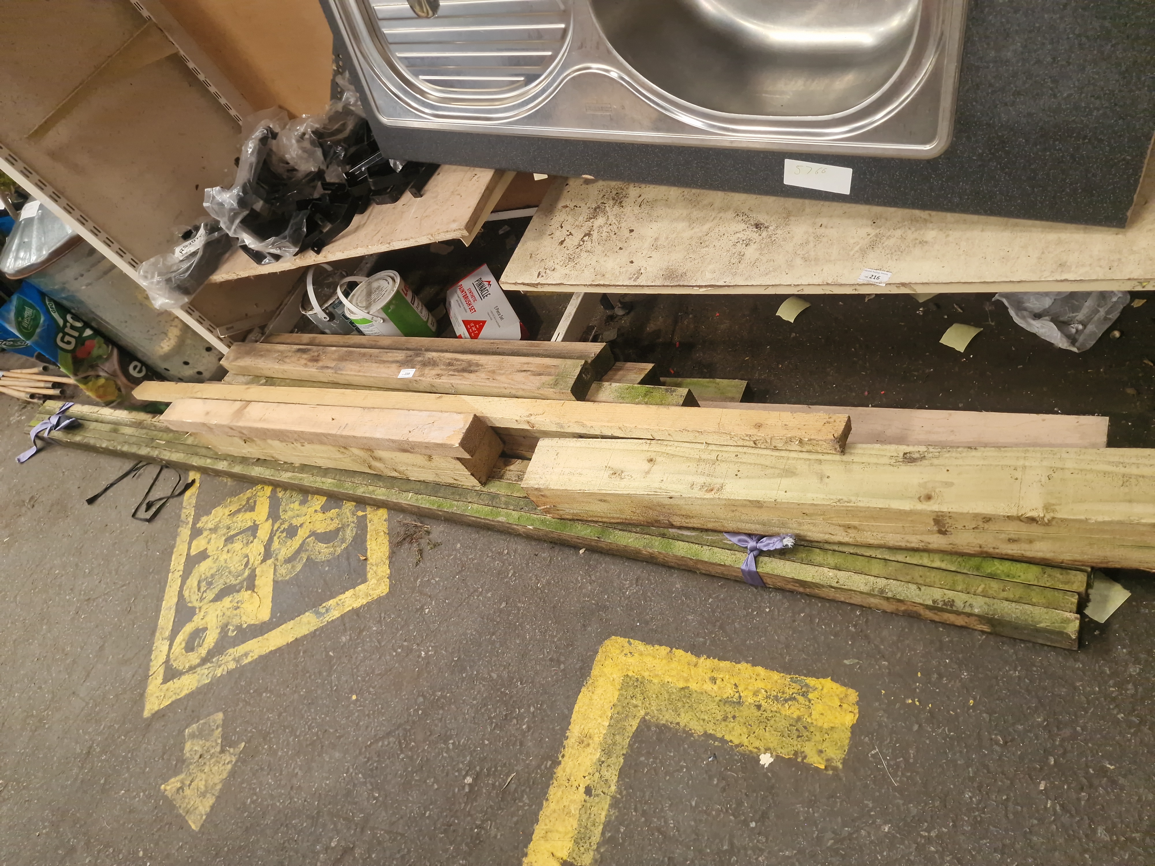 A collection of surplus building and home improvement materials. The lot includes several lengths of sawn timber in varying dimensions, including pressure-treated pieces with a visible green tint. Also present are multiple offcuts of plywood and manufactured sheet boards. The kitchen fixtures comprise a single-bowl, single-drainer stainless steel sink inset into a section of dark grey speckled laminate countertop. Decorating supplies include a boxed Pinnacle 5-piece synthetic paintbrush set and several paint tins. Hardware items consist of multiple black brackets and fittings, some of which are contained in original clear plastic packaging. Small white identification labels are present on various items, marked with the digits 239, 5766, and 216.