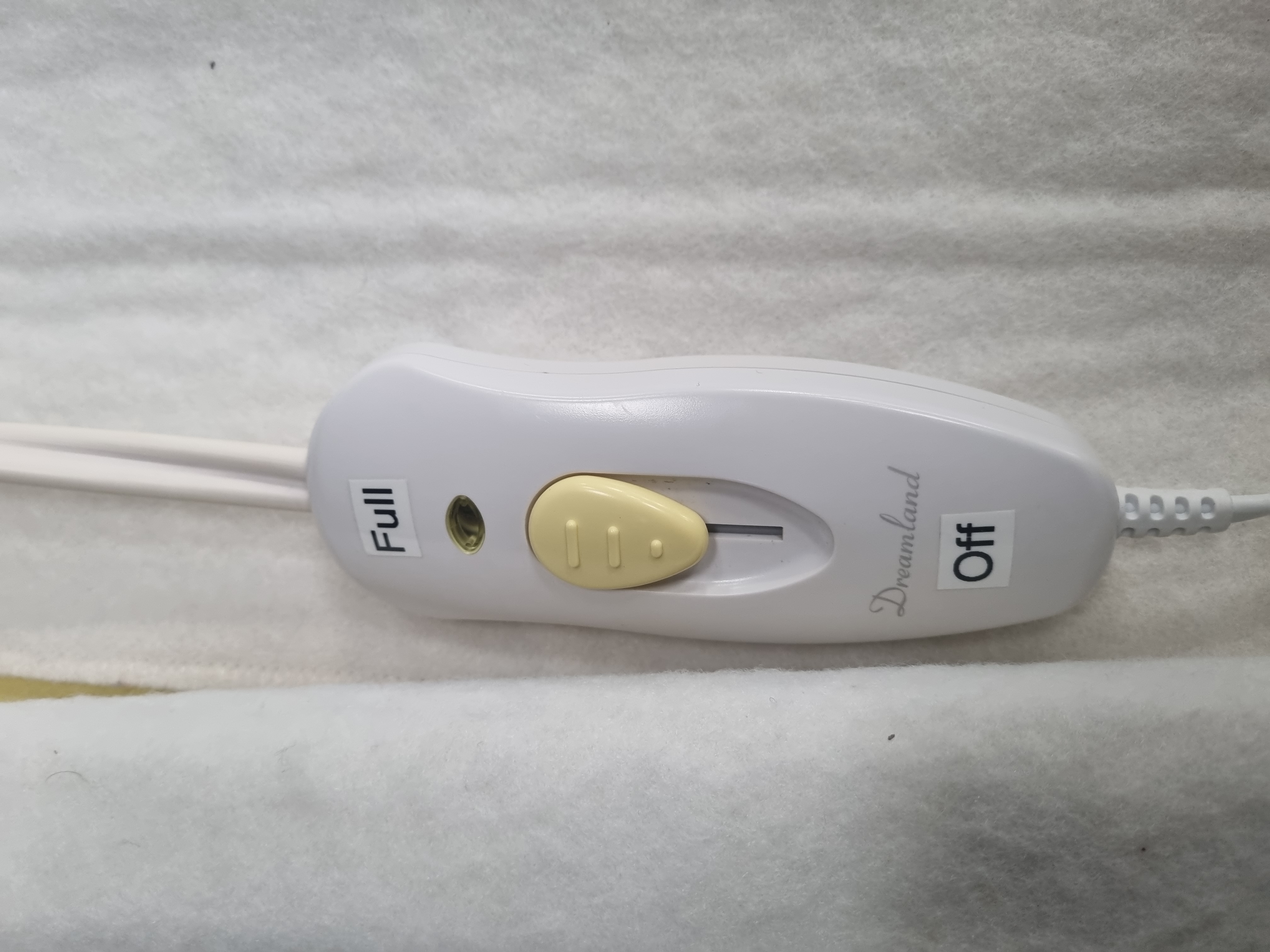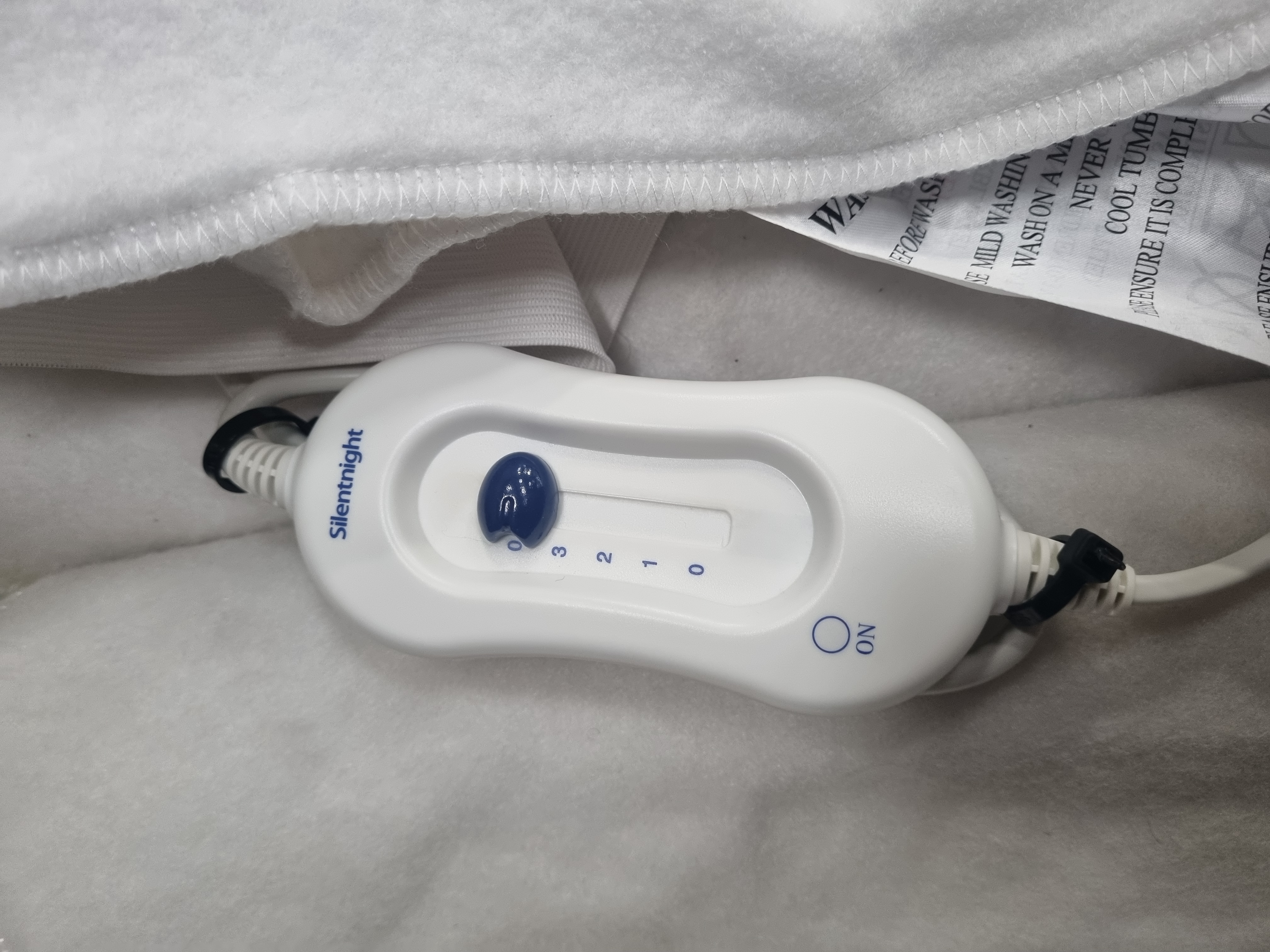 A collection of electric heated underblankets including examples by Silentnight and Dreamland. The units are constructed from a white fleece-like textile material. One unit features a white Silentnight-branded controller with a blue slider offering four heat settings (0, 1, 2, 3). Another unit incorporates a Dreamland-branded controller with a yellow sliding switch and added Full and Off labels. A textile label on one blanket indicates it was Made in the United Kingdom and bears the marks 38/20 and 298827AG alongside a CE symbol. All units are fitted with standard UK three-pin power plugs.