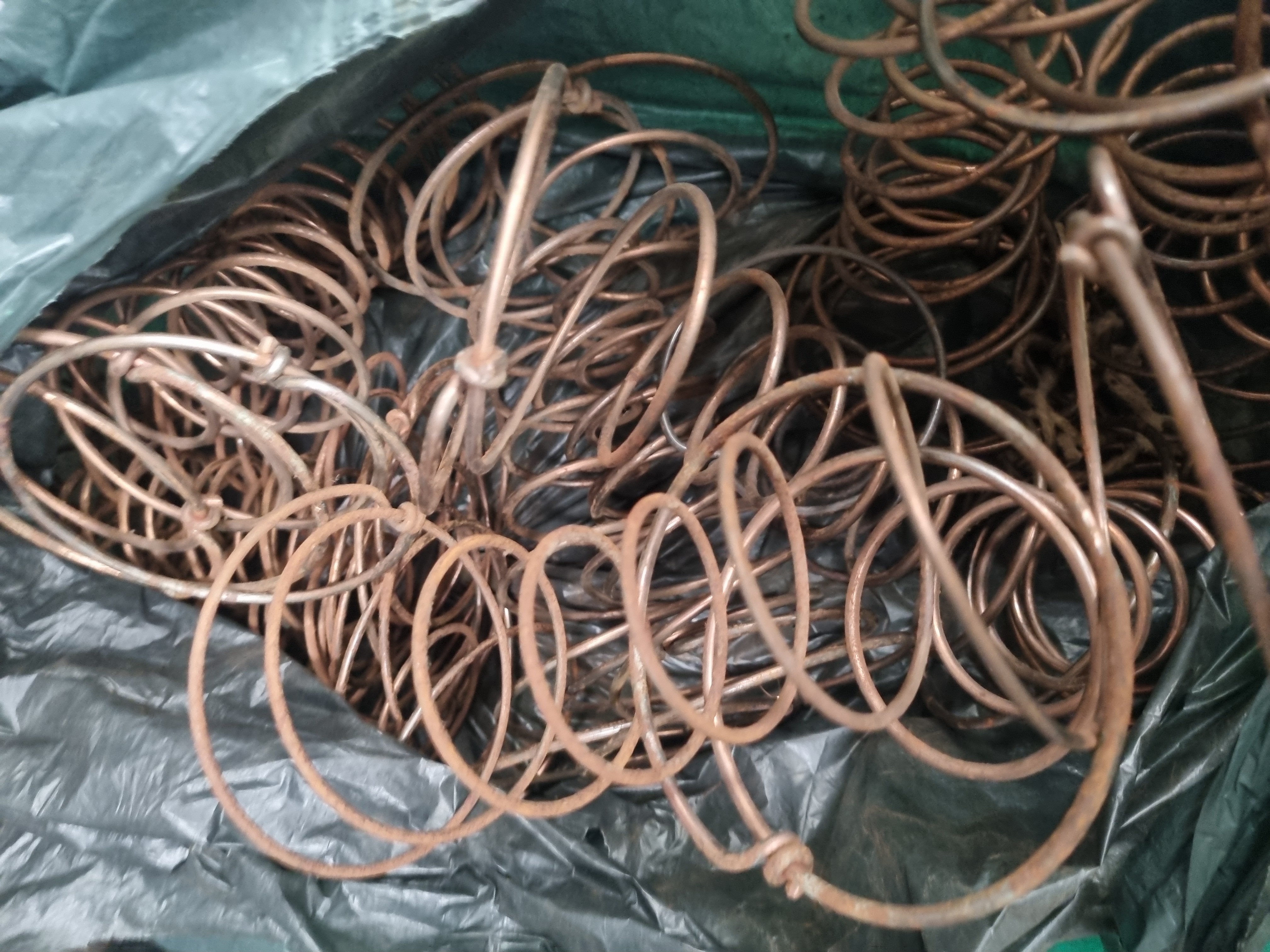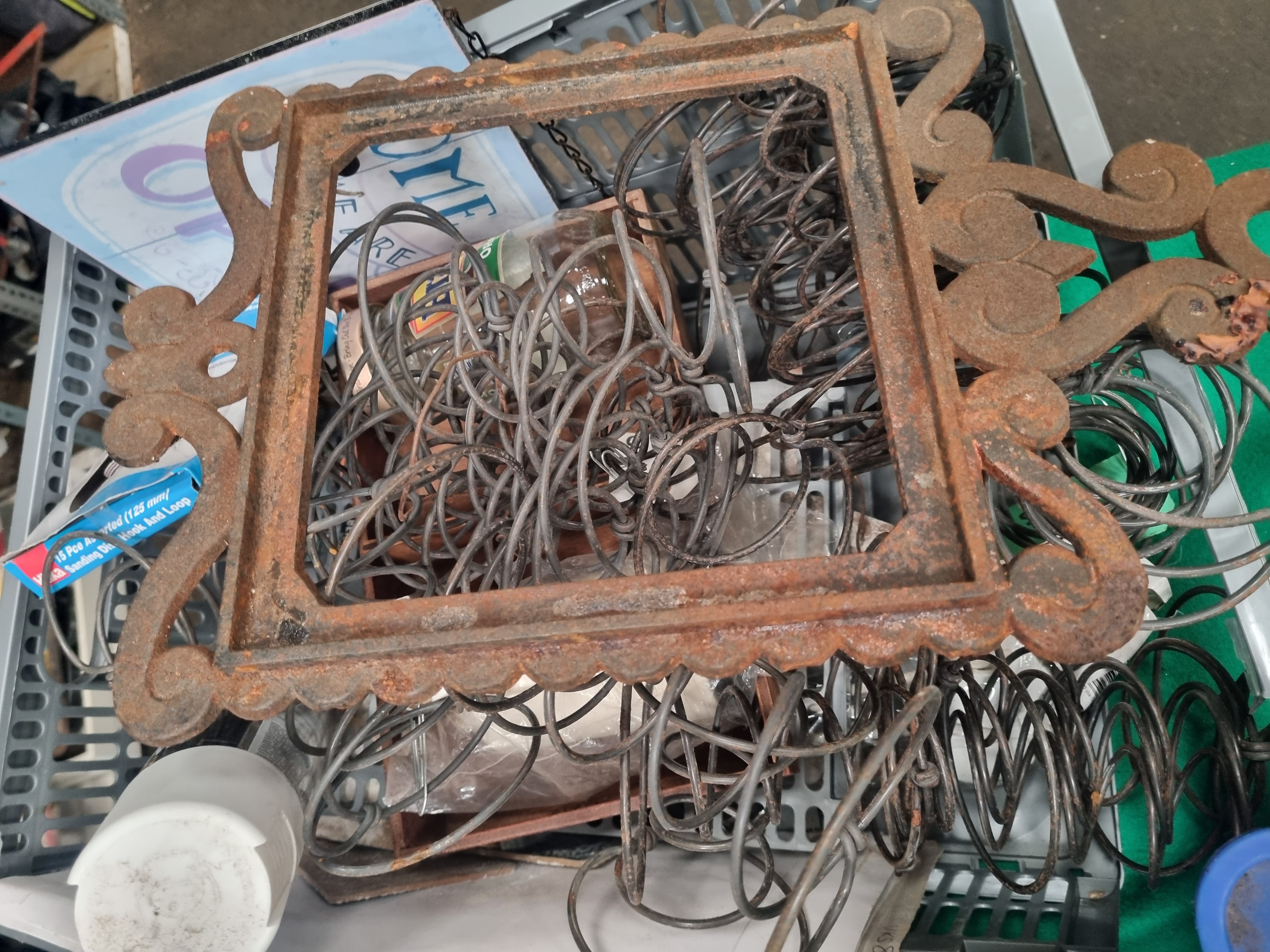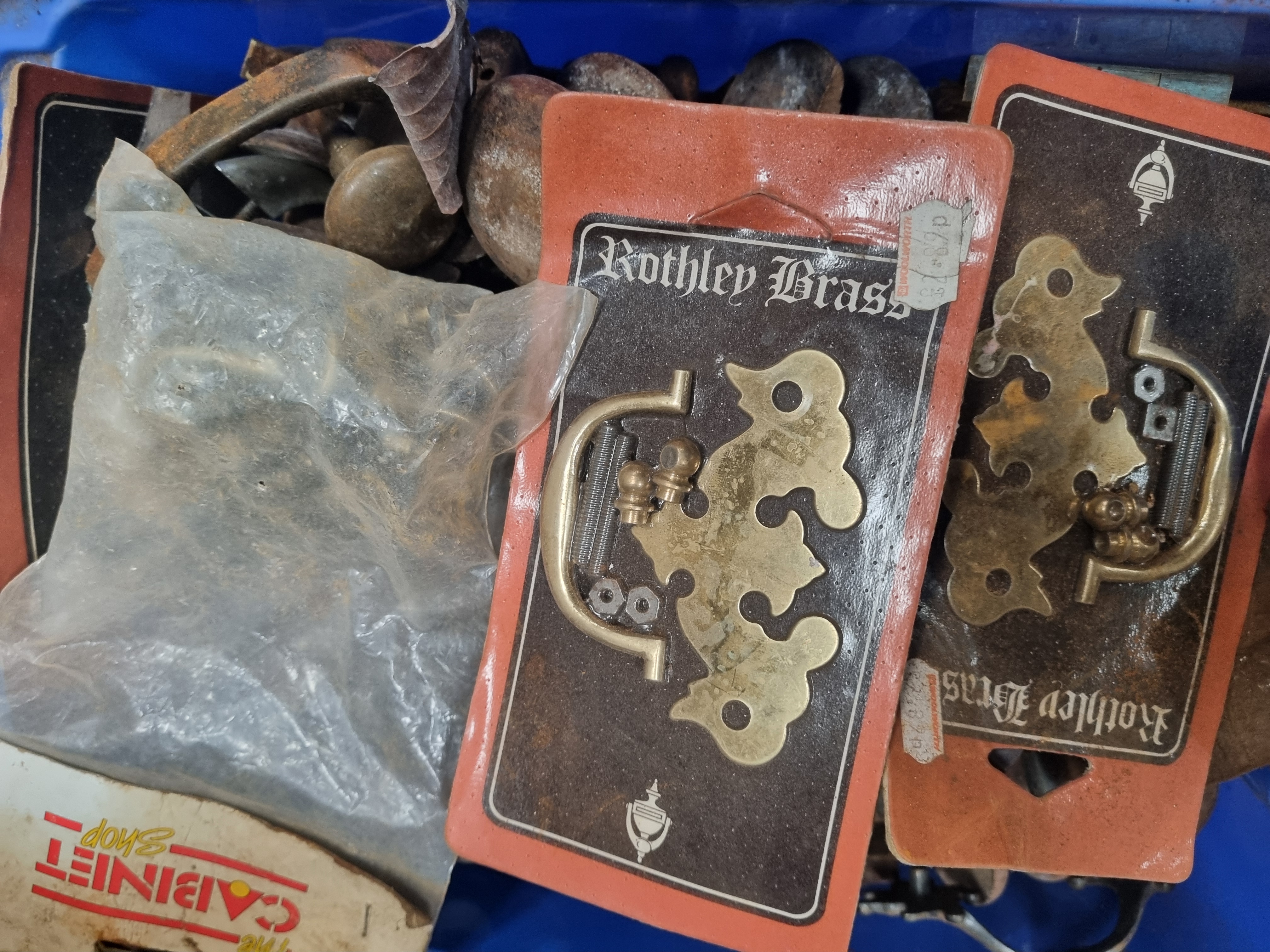 This collection comprises an extensive assortment of architectural and furniture hardware, salvage components, and upholstery supplies. The lot features a variety of cabinet and door fittings, including brass doorknobs, drop-handle drawer pulls, cup pulls, hinges, and decorative escutcheons. Several sets of brass drop-handles are present as new old stock in their original Rothley Brass carded packaging, which includes vintage retail price labels from Woolworth. Architectural salvage elements include a rectangular cast iron frame with decorative scrollwork borders. Furniture components consist of a large, curved mahogany-finished wooden element, likely a sofa or chair component, along with various turned wooden knobs and finials. The lot also includes a significant quantity of coiled metal upholstery springs. Visible markings include the Rothley Brass brand name on packaging and a lot tag from Liskeard Auction Rooms identifying the collection as Lot 24413. Materials observed include brass, cast iron, steel, and wood.