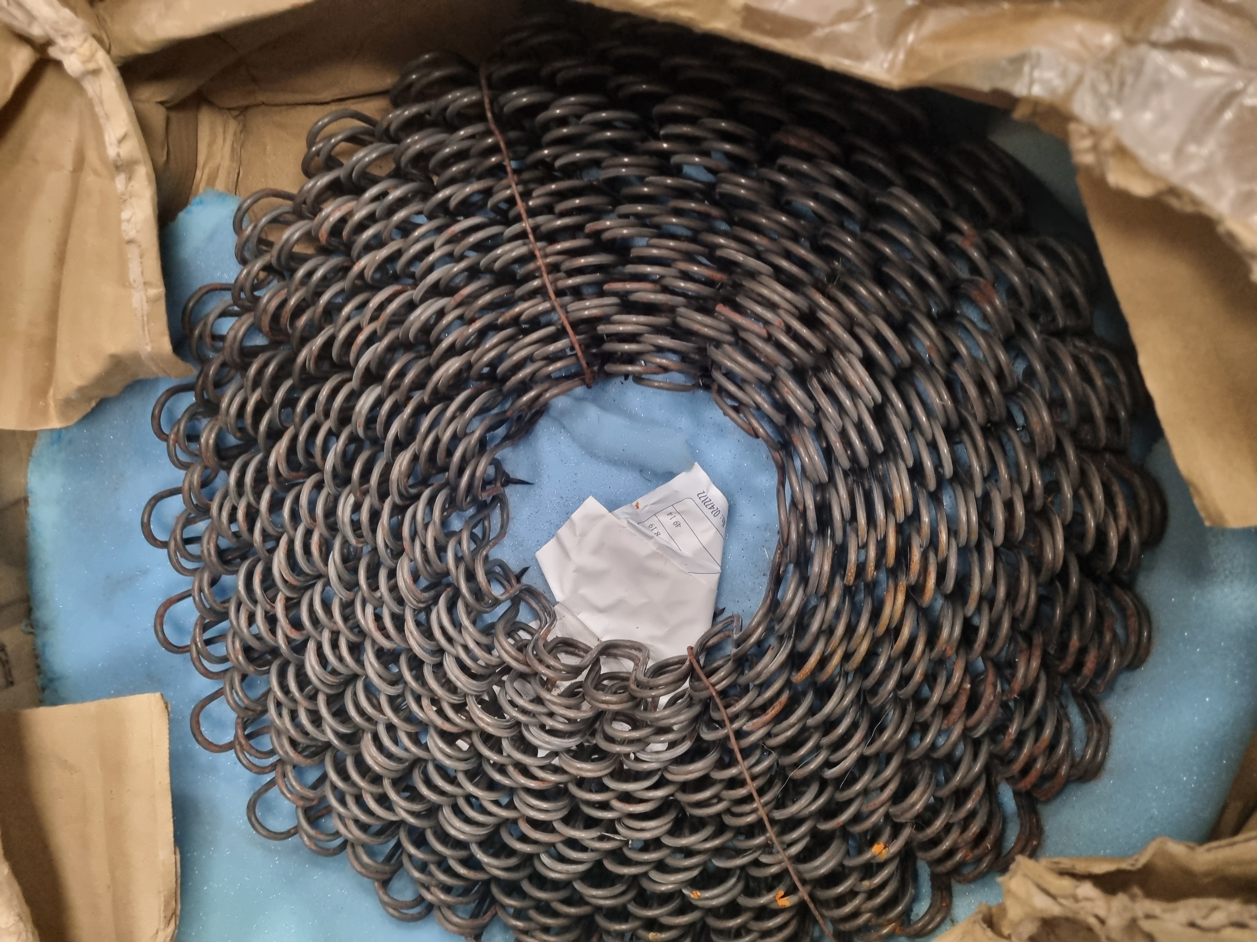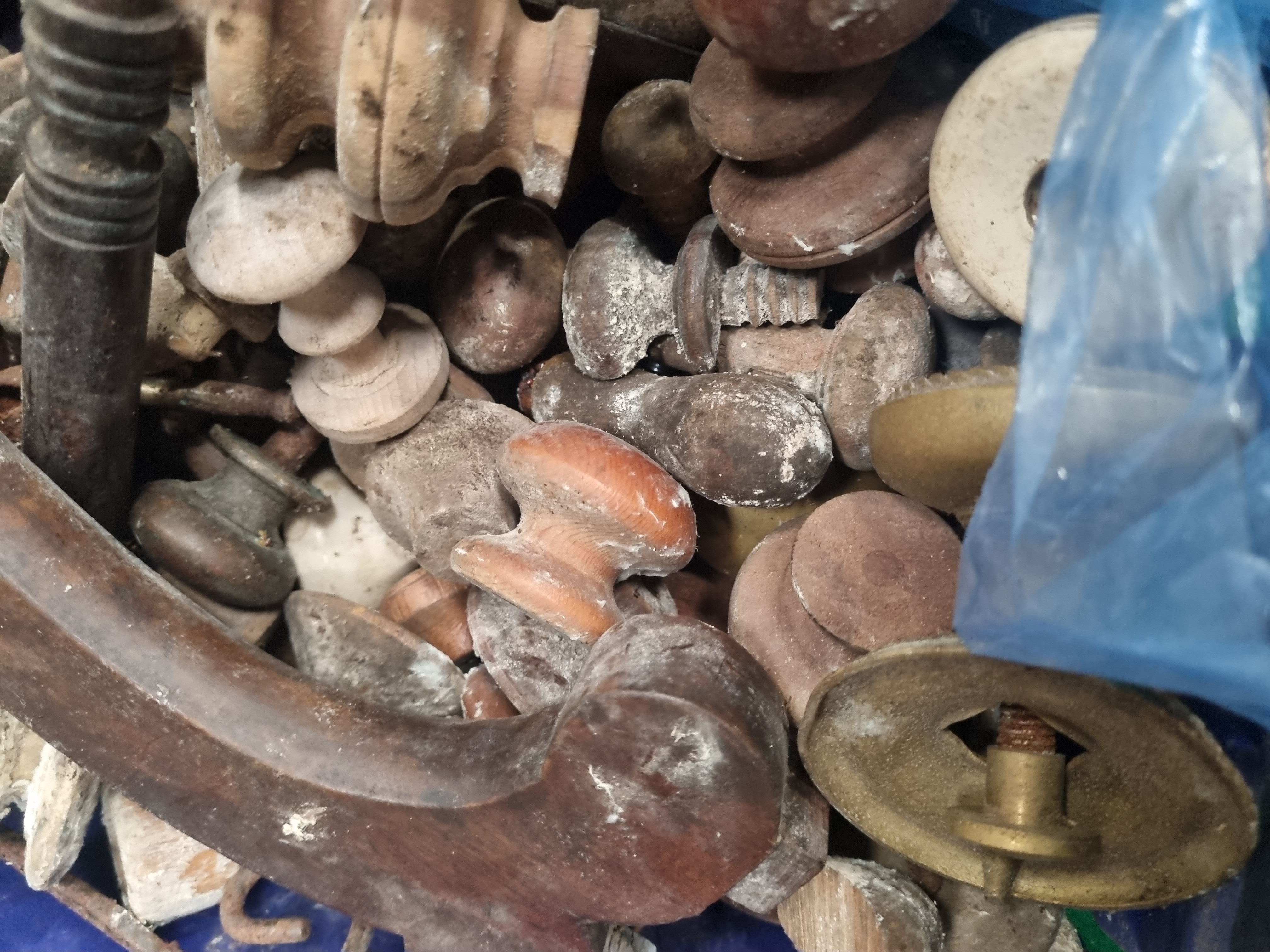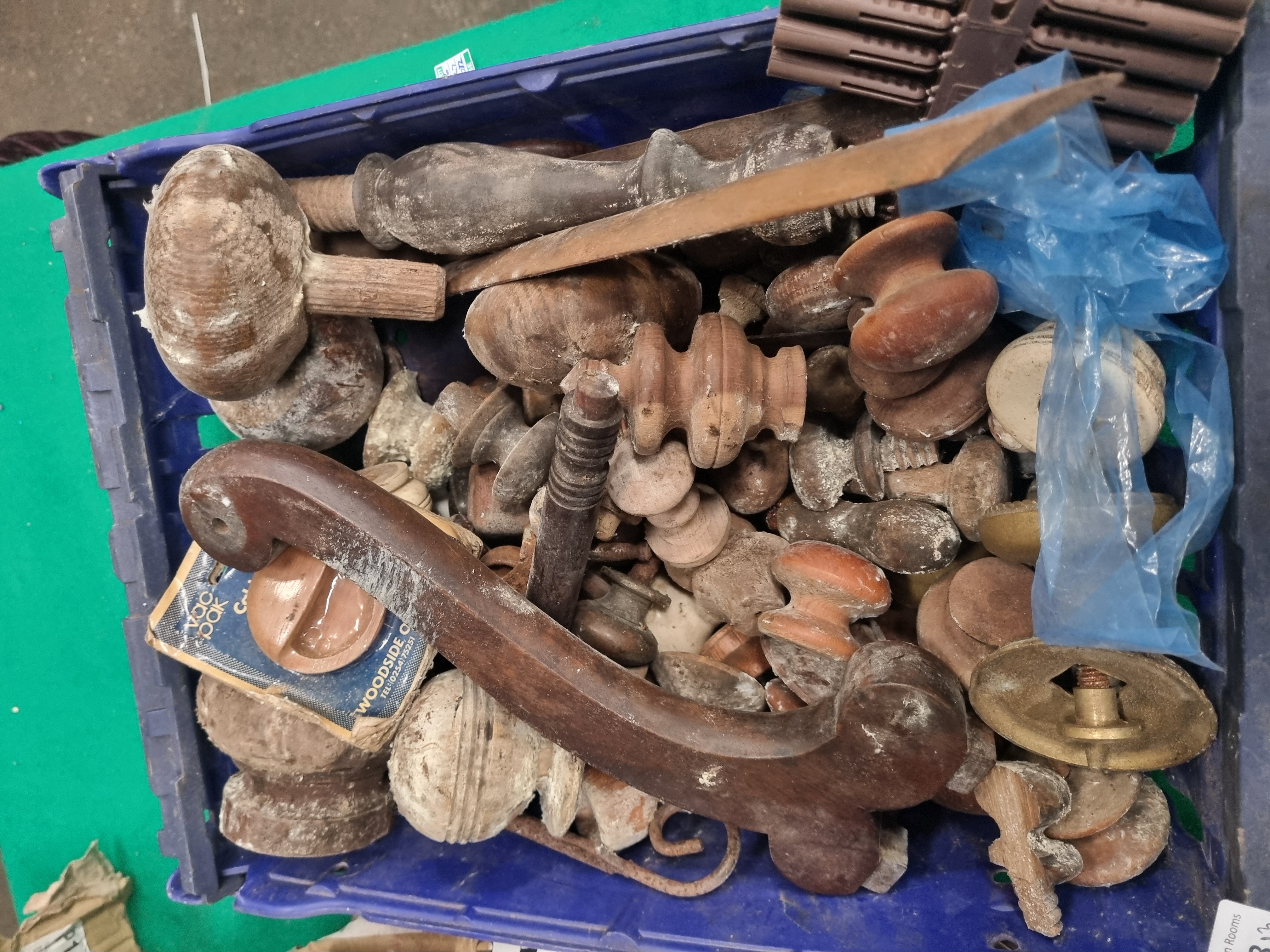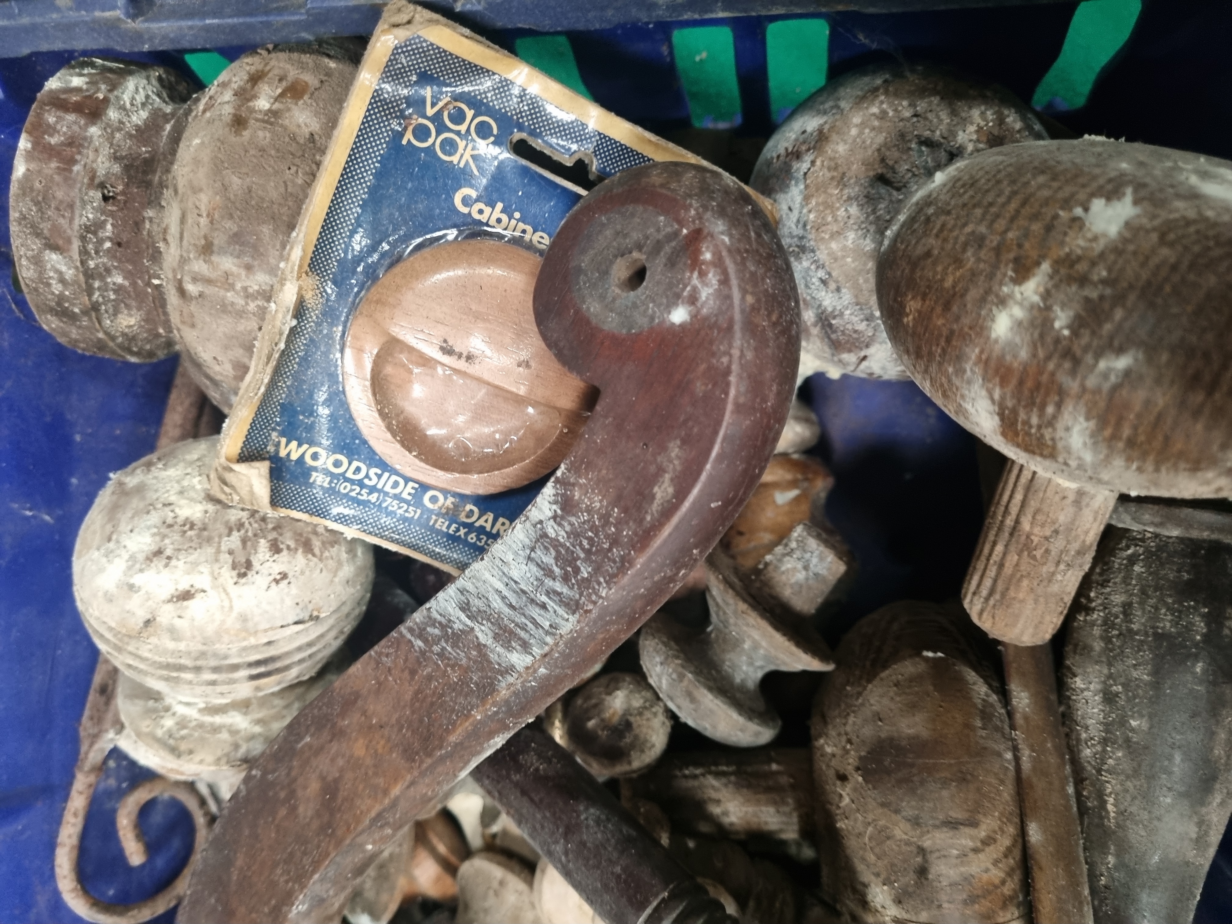 A large mixed lot comprising an assortment of furniture and architectural hardware along with a quantity of upholstery springs. The collection includes a diverse range of turned wooden knobs in various sizes and styles, including Victorian-style mahogany and pine examples. The lot features one white porcelain knob and several brass-toned metal backplates and drawer pulls. Also included is a large, curved, dark-wood armrest or structural element, likely from a Victorian sofa or chair, alongside various turned wooden finials and spindles. One item remains in its original vintage retail packaging, a carded product from Woodside of Darwen, Lancashire, bearing the printed text vac pak, Cabinet, and a 0254 area code. A separate large cardboard box contains a substantial coil of serpentine zig-zag steel upholstery springs. Materials include mahogany, pine, steel, brass-toned metal, and porcelain.