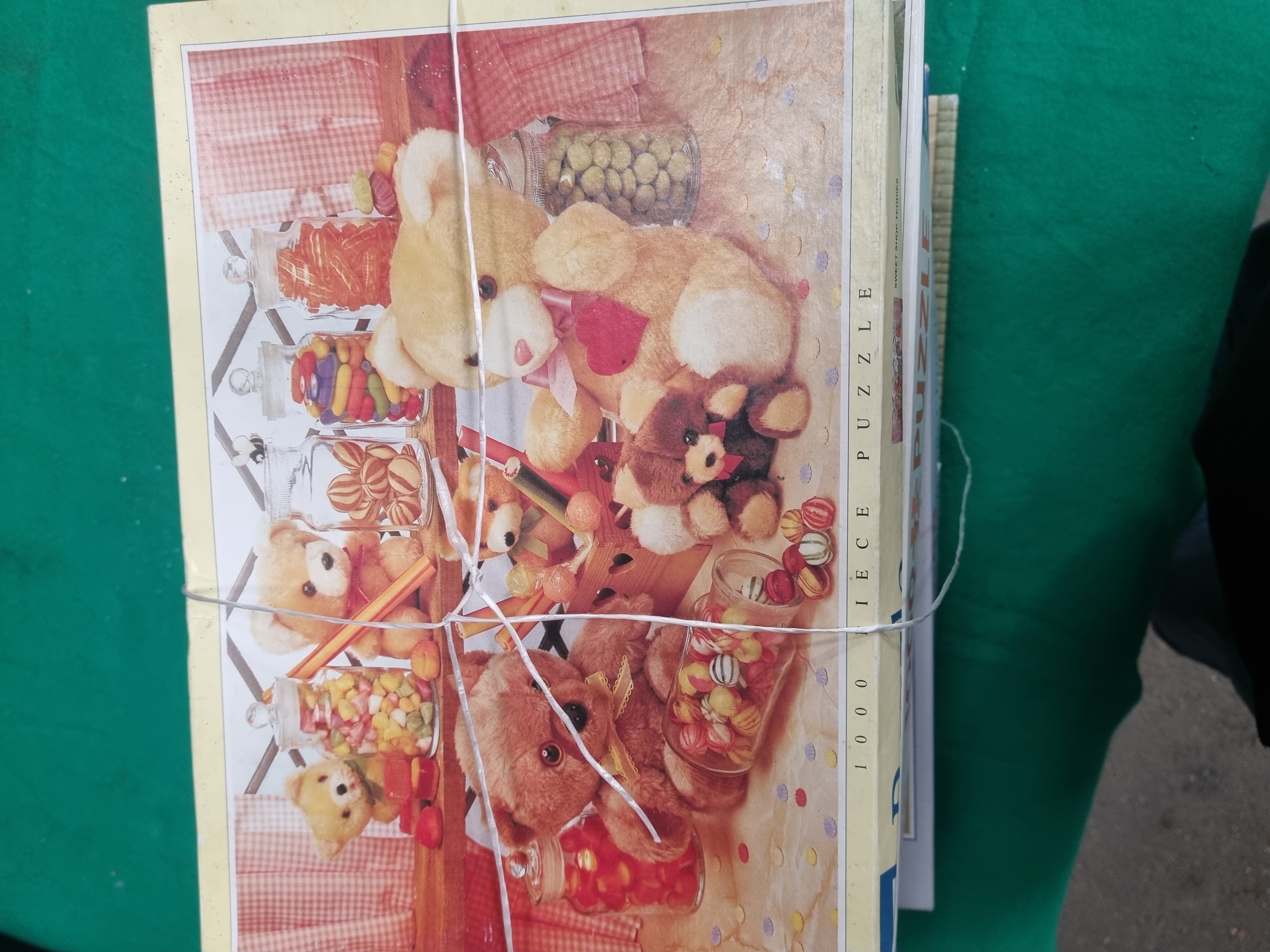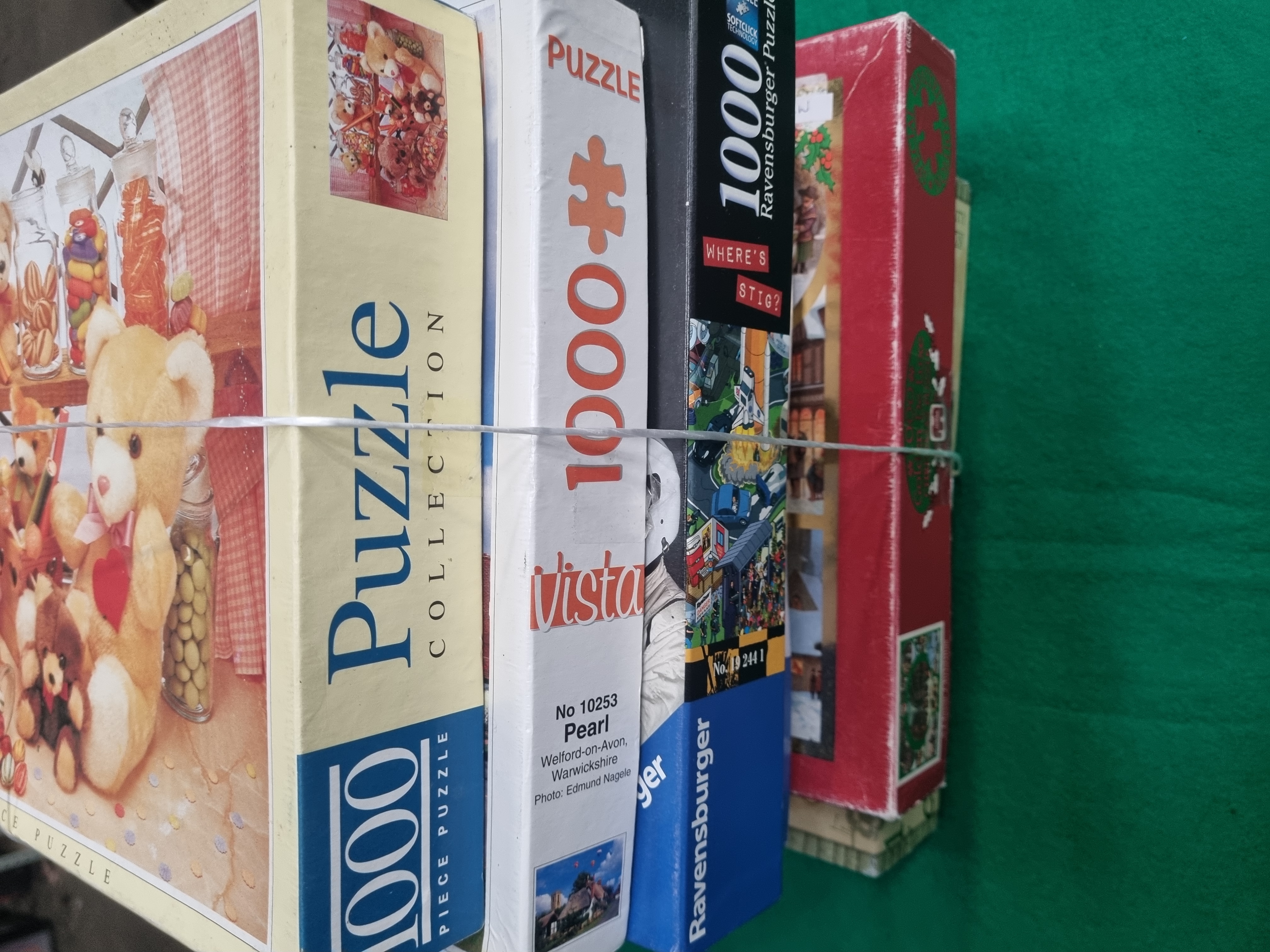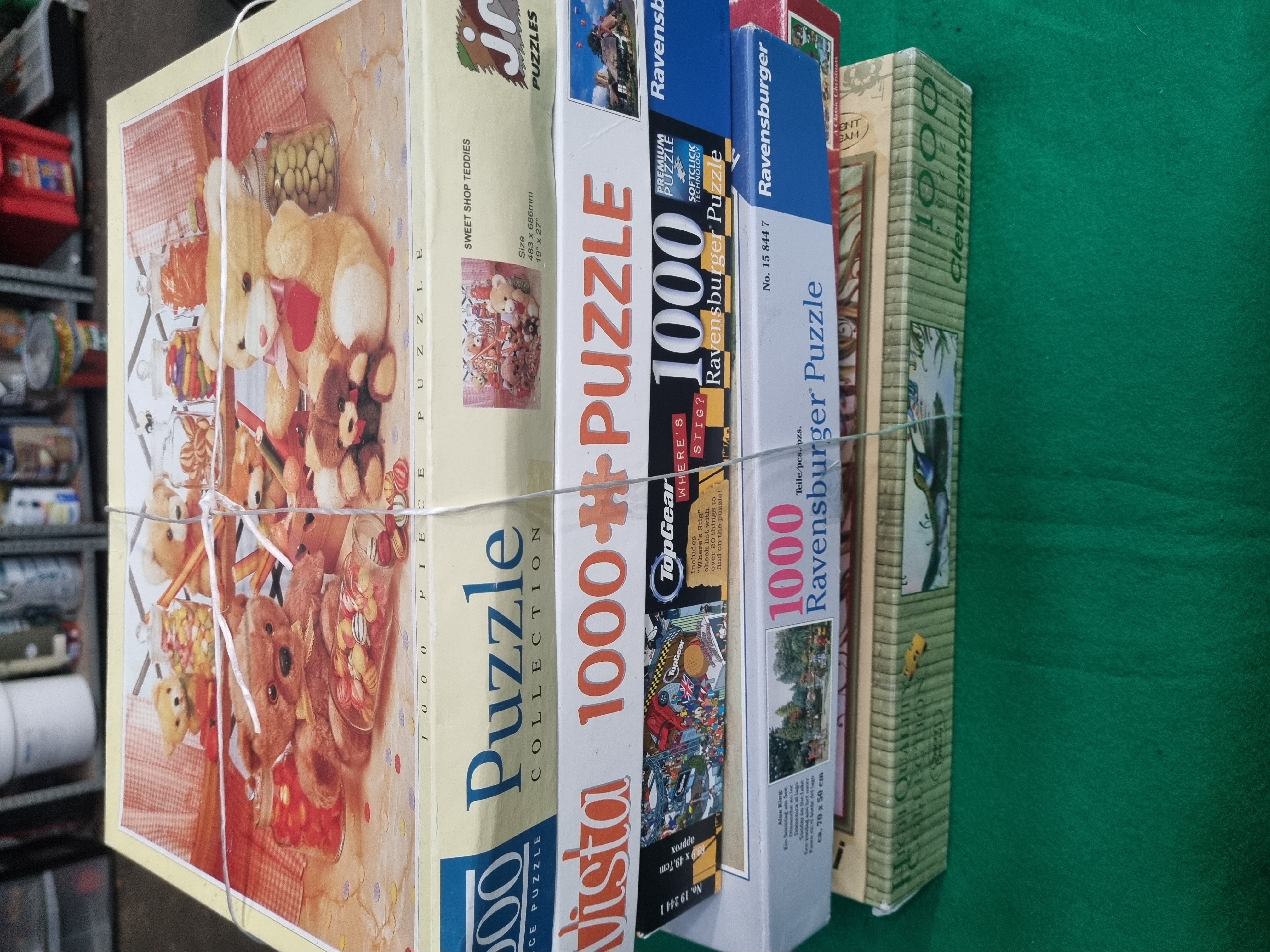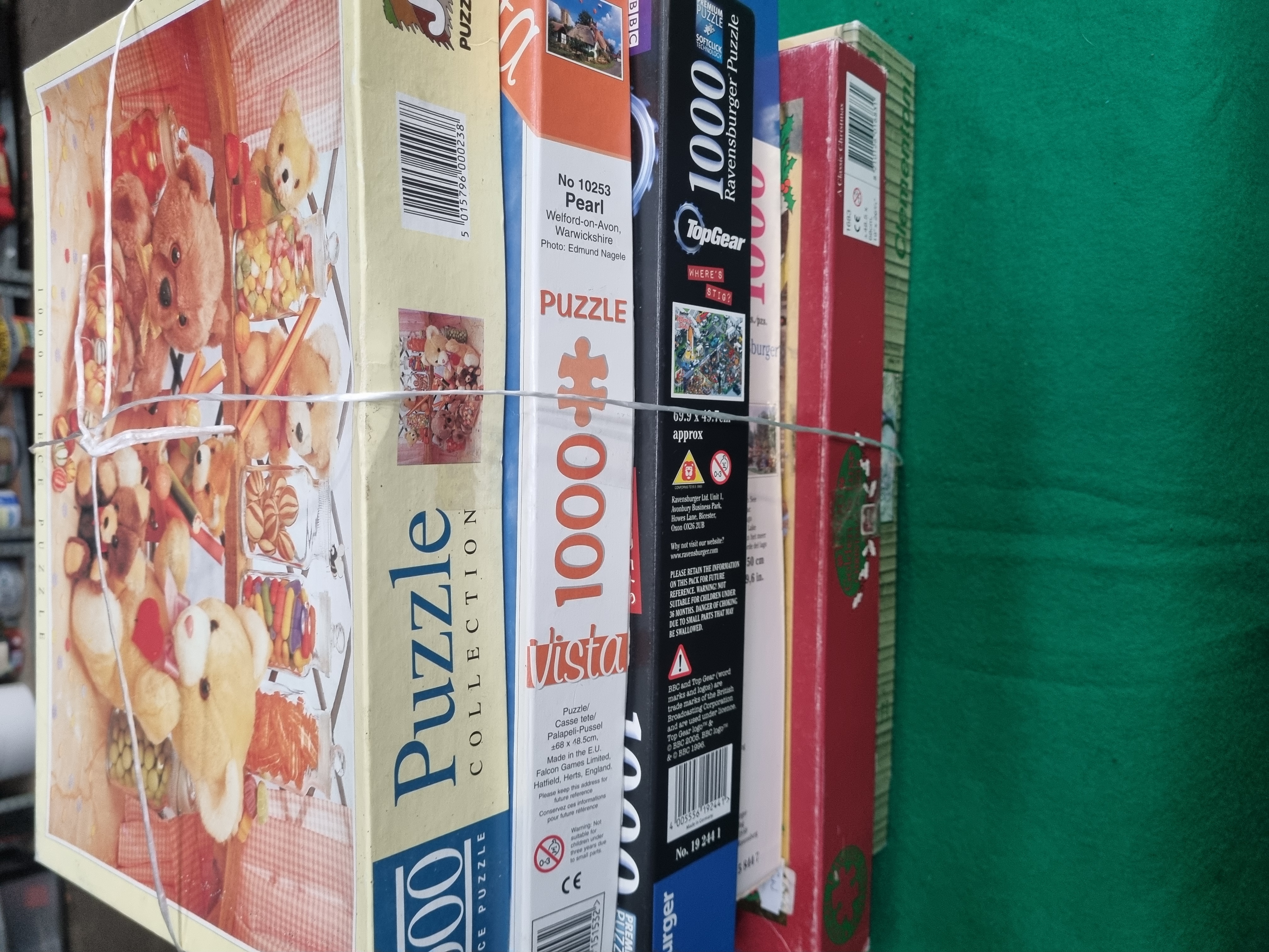 A collection of six 1000-piece jigsaw puzzles from various European manufacturers including Ravensburger, Clementoni, and Falcon Games Limited. The lot includes a JR Puzzles / Falcon Games Limited puzzle titled Sweet Shop Teddies, featuring a photographic image of teddy bears and jars of sweets, marked as made in the E.U. with barcode 5015796000238. A Vista puzzle titled Pearl, Welford-on-Avon, Warwickshire, model number 10253, with photography by Edmund Nagele. A Ravensburger Top Gear Where is Stig? puzzle, number 19 244 1, featuring Softclick Technology and BBC trademarks dated 2008. A second Ravensburger puzzle depicting a landscape garden scene, number 15 844 7. A Clementoni High Quality Collection nature scene featuring a hummingbird. A final puzzle in a red box titled A Classic Christmas. All items are constructed from printed cardboard and presented in their original packaging.