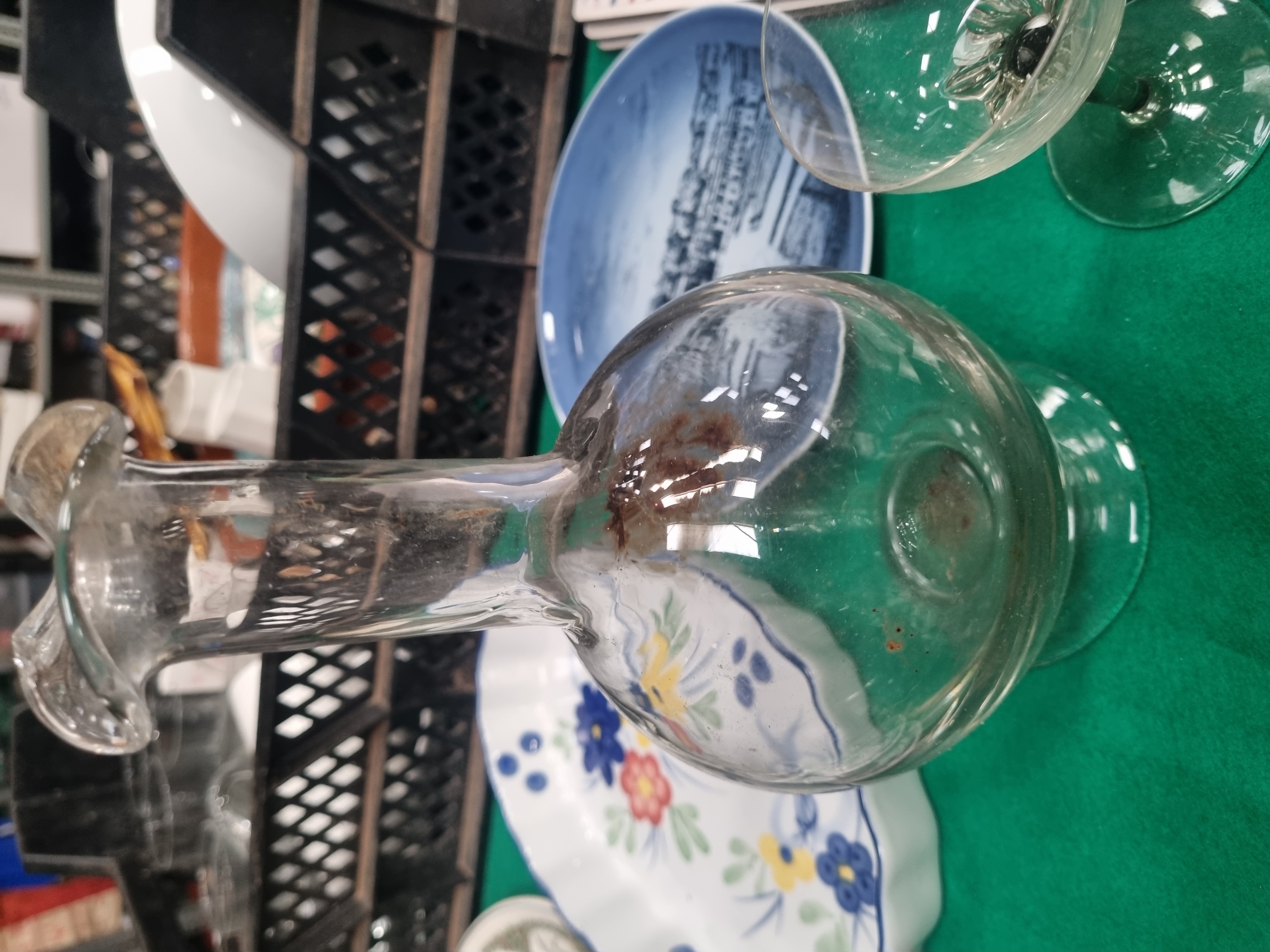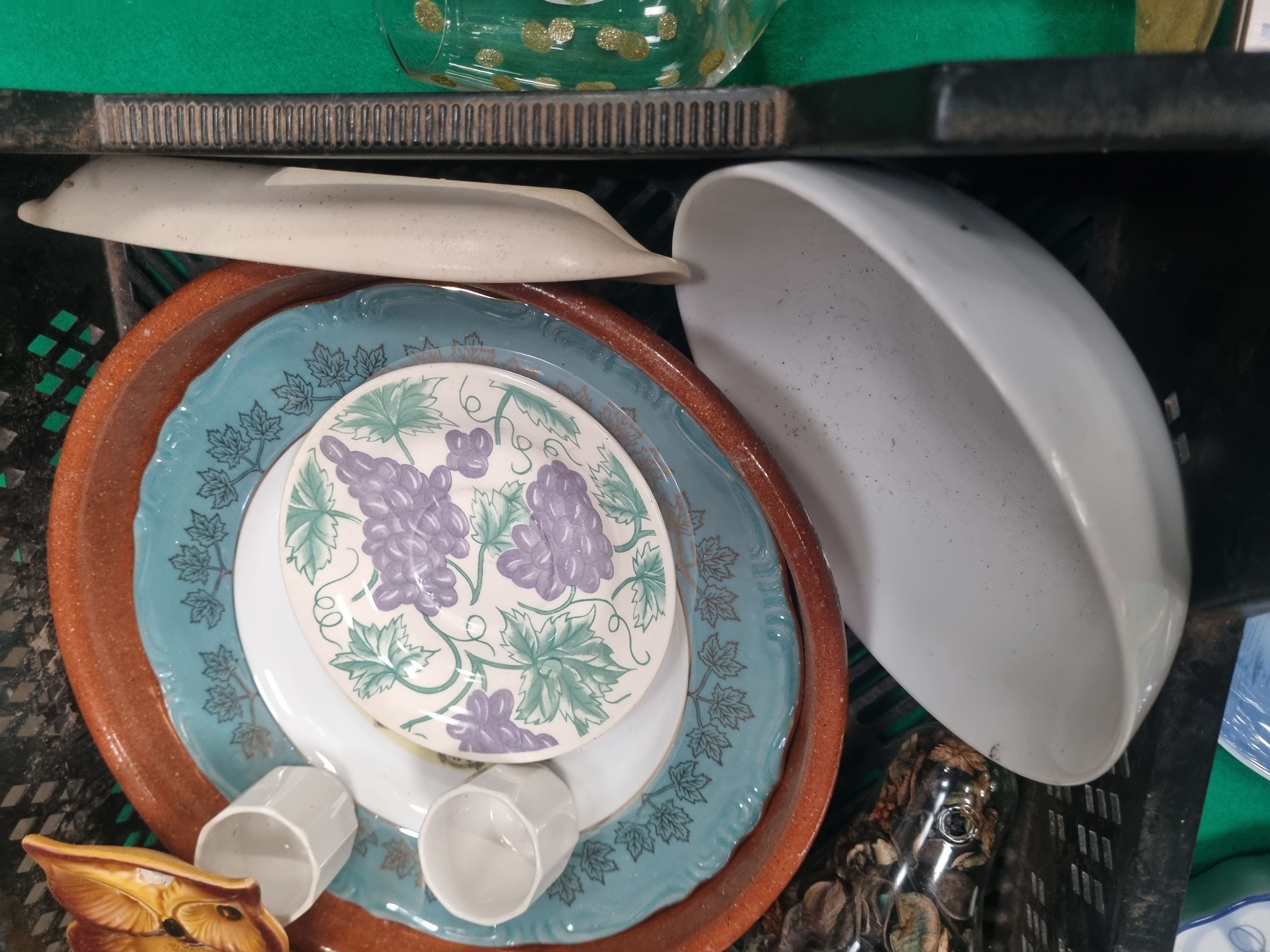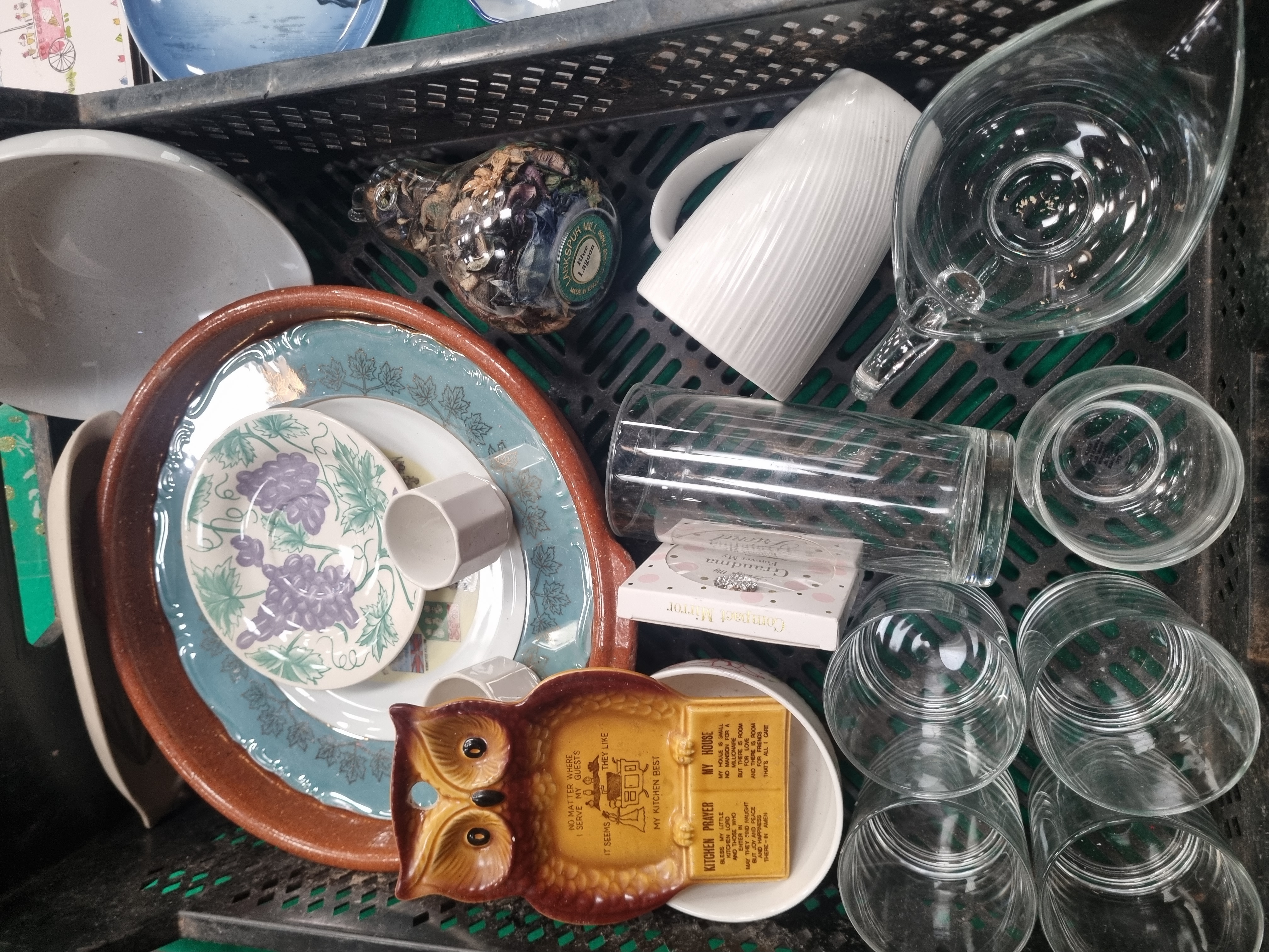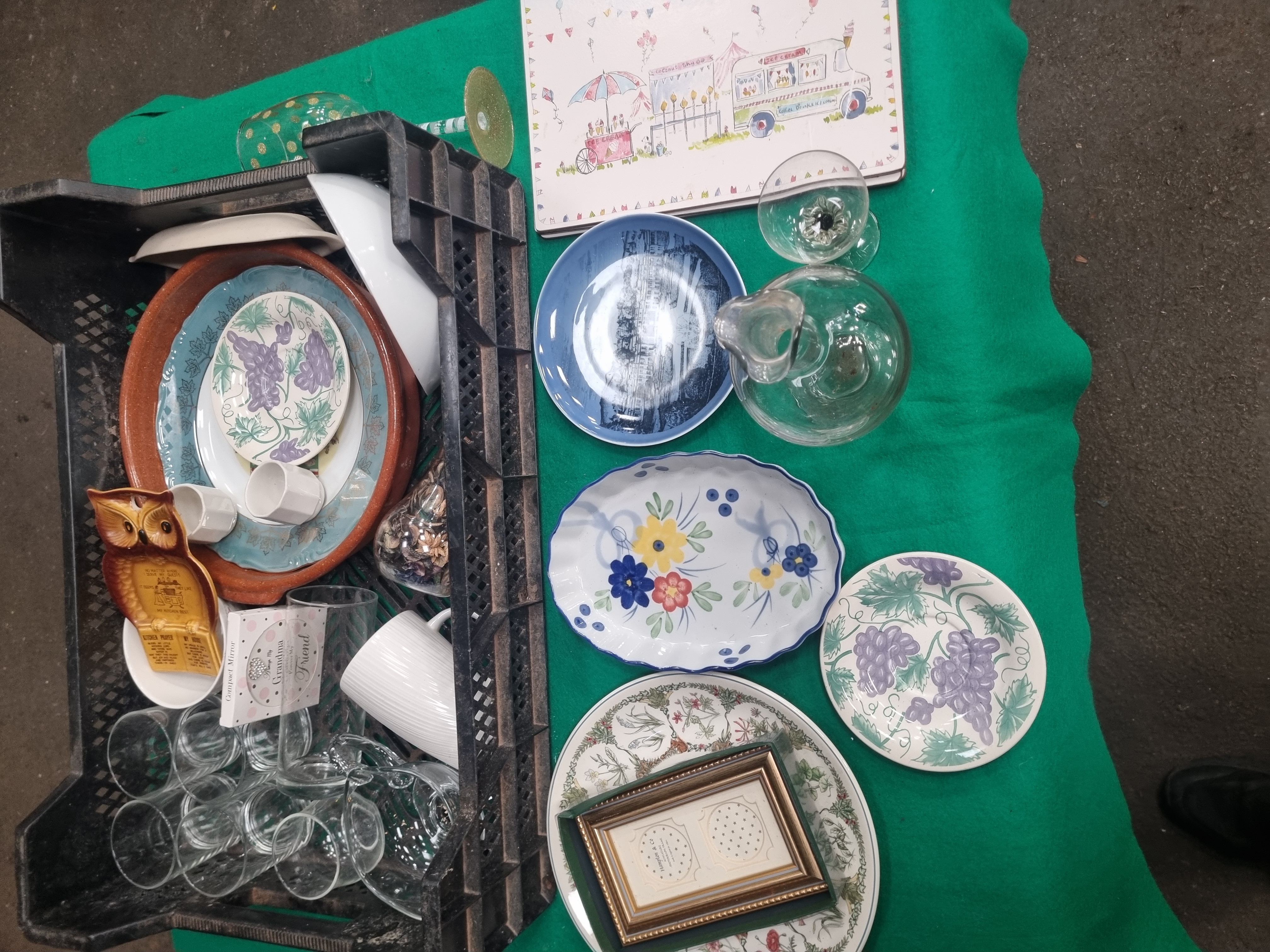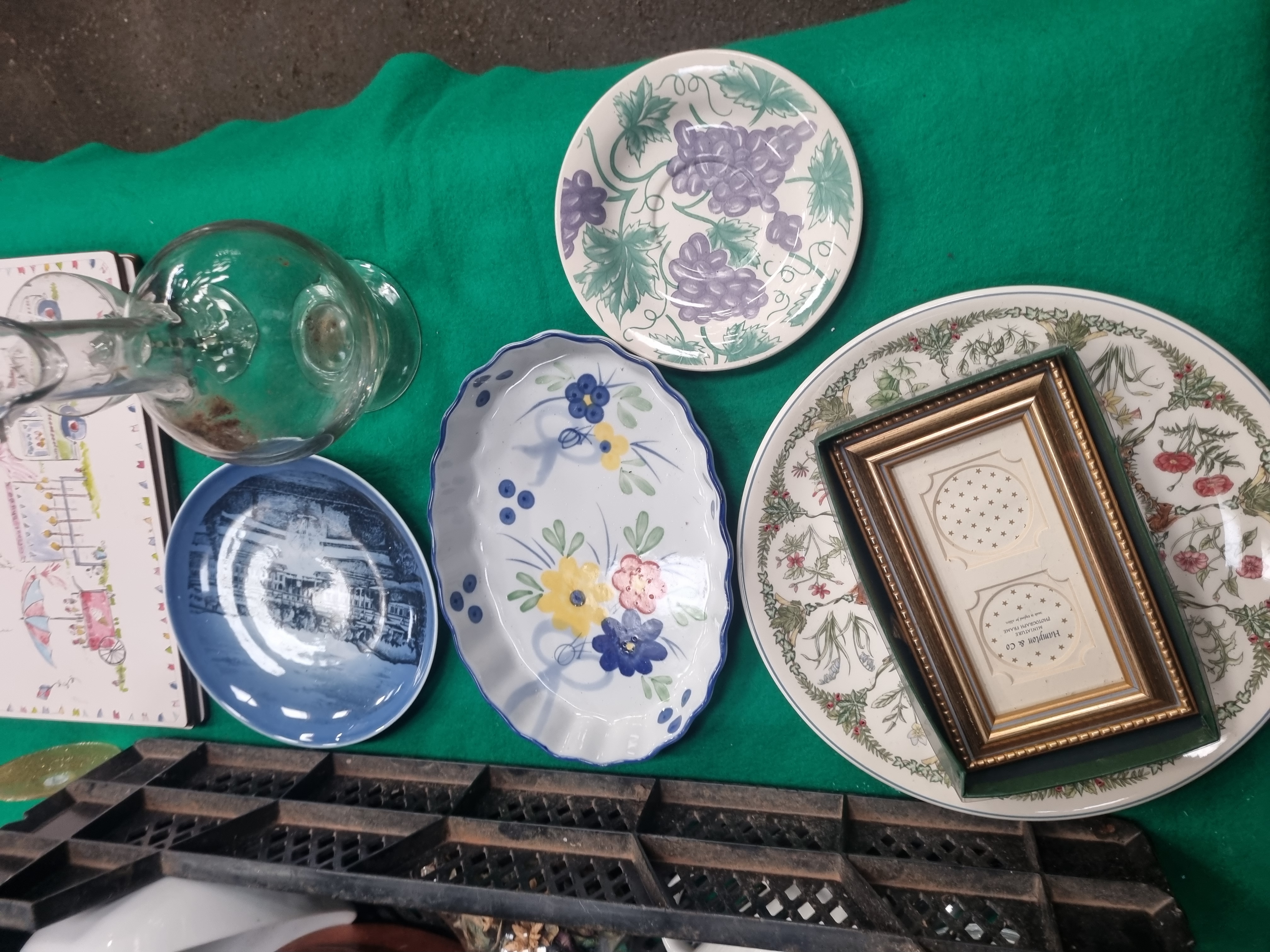 This mixed lot comprises an assortment of ceramic, glass, and decorative household items. The ceramic components include pieces in the Pfaltzgraff Grapevine pattern, decorated with transfer-printed purple grape clusters and green vine leaves on a white ground. The collection also features a blue and white transferware plate depicting a neoclassical stately home by a body of water, an oval serving dish with a scalloped blue rim and hand-painted floral motifs, and a dinner plate with a festive holly and evergreen border. A ceramic owl-shaped spoon rest is included, featuring a brown and yellow glaze and a printed Kitchen Prayer. Other ceramics include a large terracotta dish with an internal glaze, a white ribbed mug, a white bowl, and egg cups. The glassware section contains a clear decanter with a ruffled rim, a water jug, multiple cylindrical tumblers, and a wine glass with a green stem and gold-toned polka-dot decoration. A glass potpourri orb is present, bearing a label for Larkspur Mill, Blue Lagoon, Made in England. Additional items include a boxed miniature photograph frame by Hampton & Co, a boxed floral compact mirror, and an illustrated sketchbook.