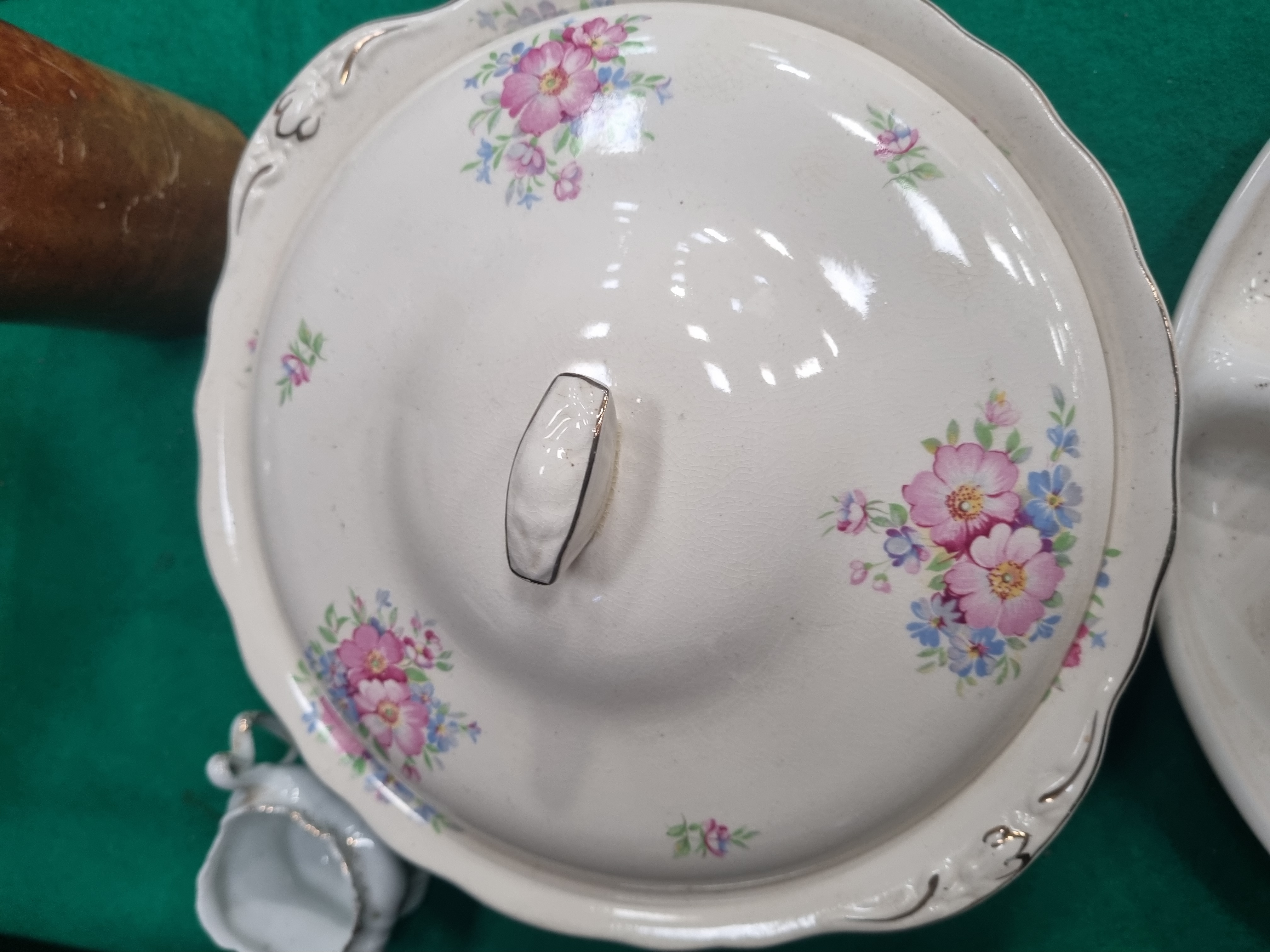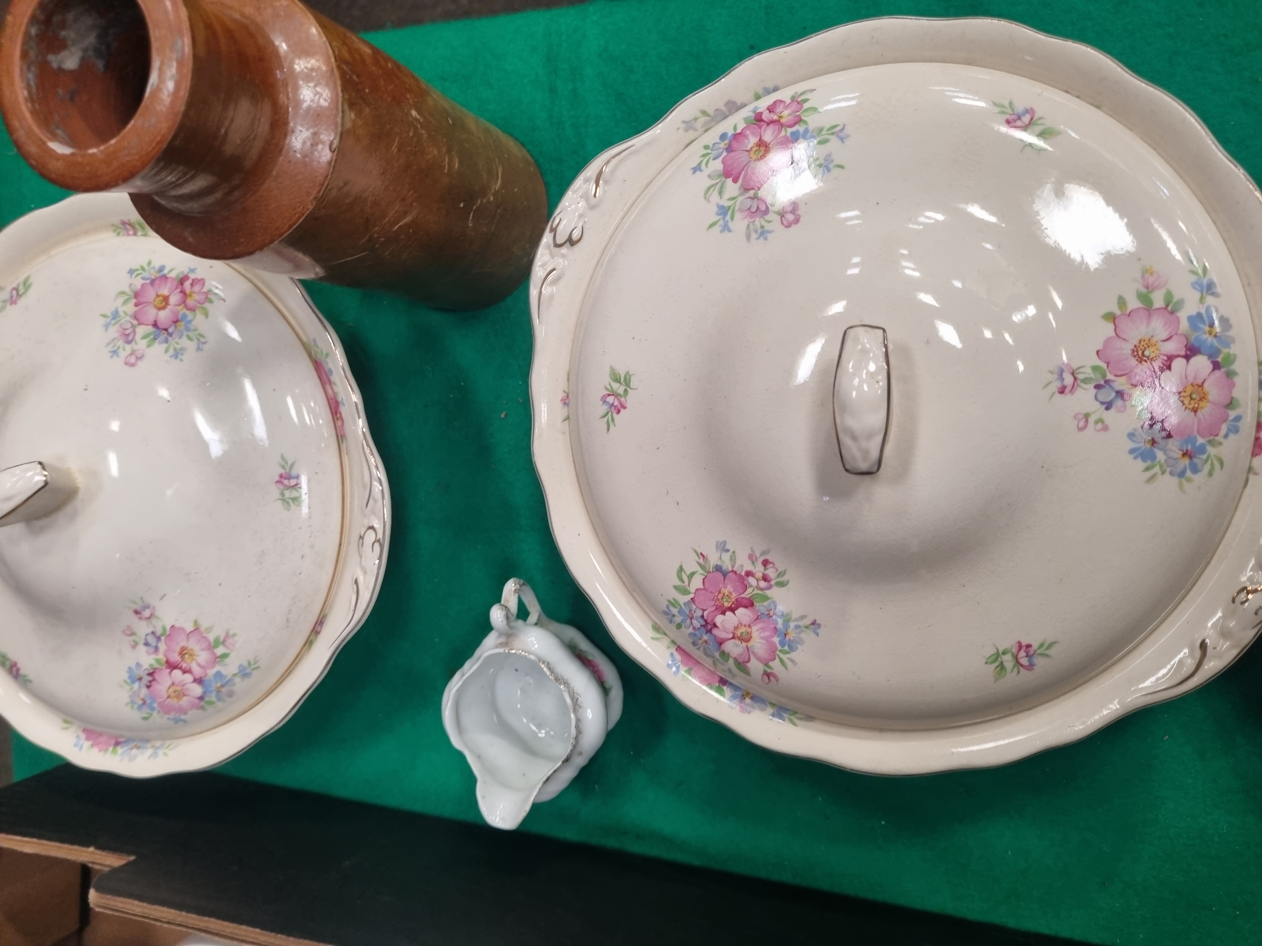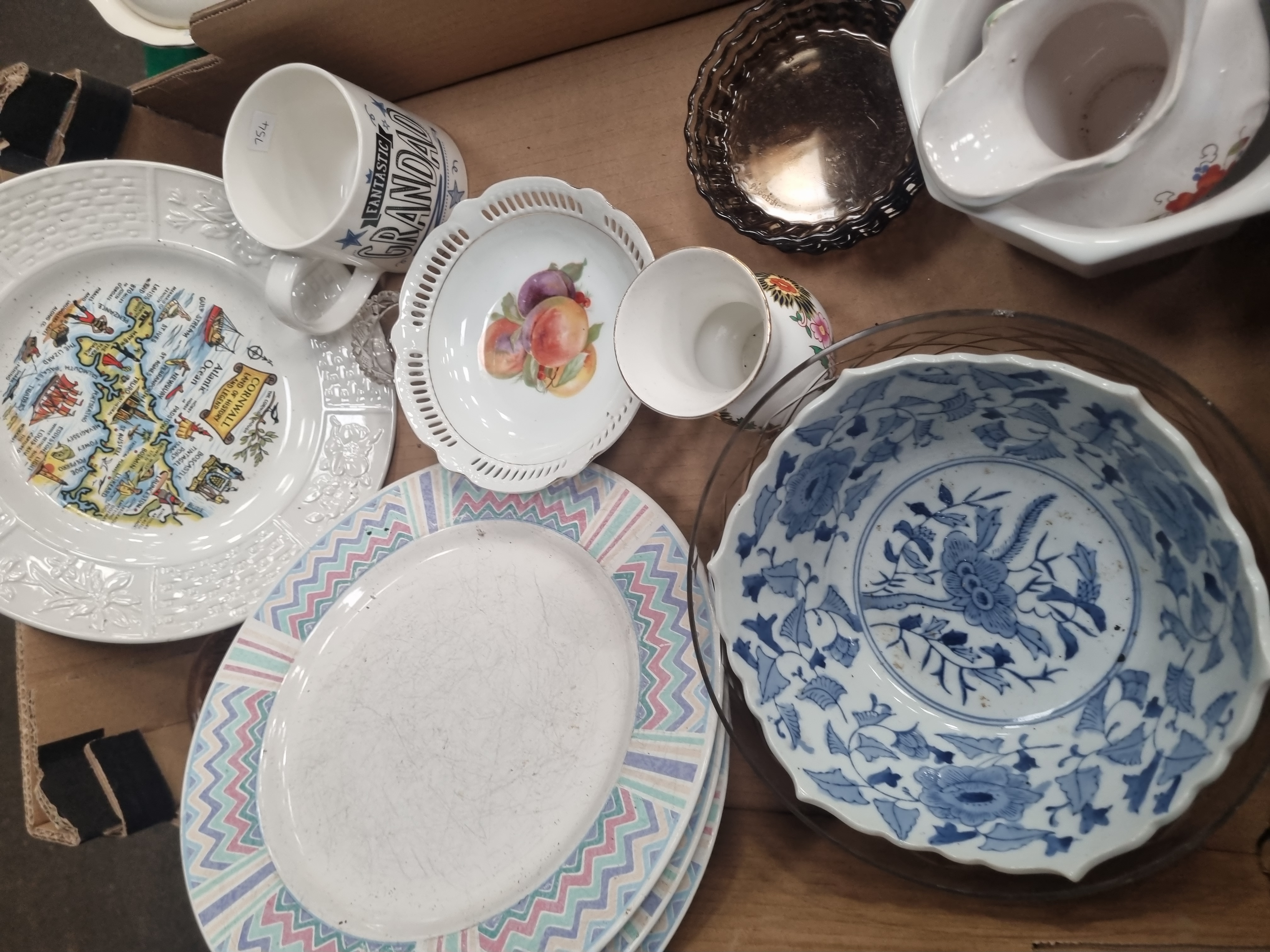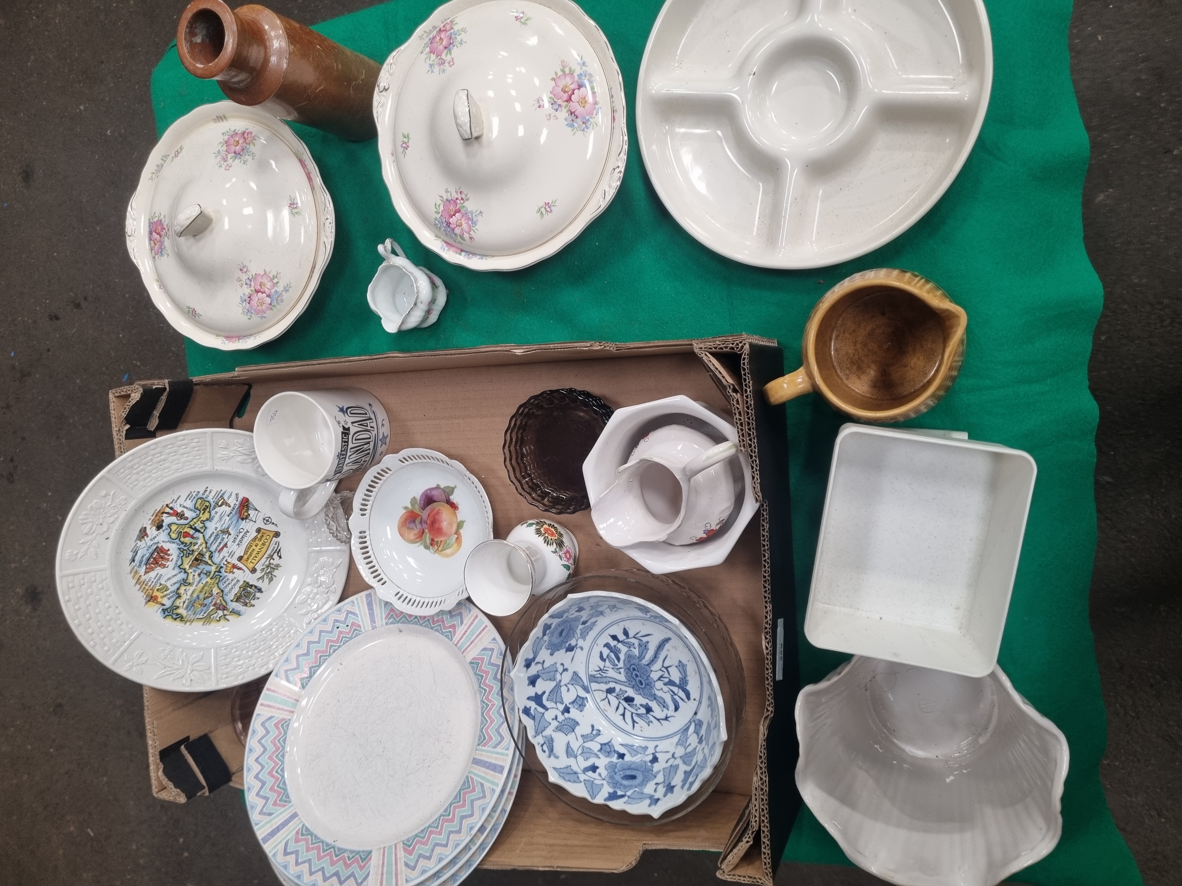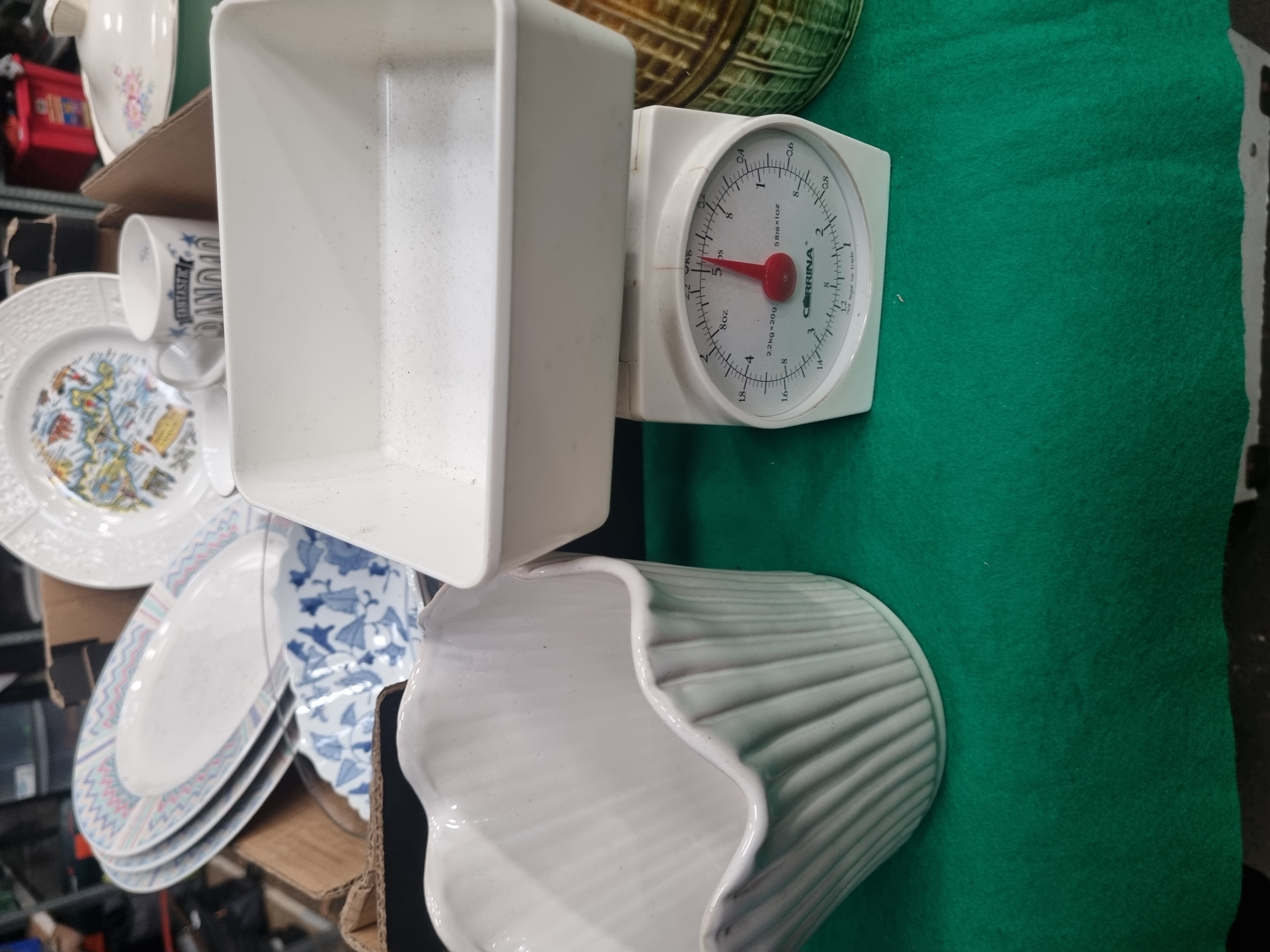 A collection of ceramic tableware and household items including a pair of lidded earthenware tureens decorated with polychrome transfer-printed floral patterns and relief-moulded scrollwork. The lot features a blue and white fluted ceramic bowl with an Oriental-style scene and a Cornwall Land of Legend commemorative plate with a relief-moulded lattice border. Also included is a porcelain fruit bowl with a reticulated lattice rim, a set of earthenware plates with pastel zigzag borders, and a large white fluted pitcher. The collection is further comprised of a brown salt-glazed stoneware bottle, a glazed earthenware pitcher, a cream-coloured divided hors d’oeuvres dish, a novelty mug inscribed Fantastic Grandad, and several small creamers and cups. Household accessories include a set of Corrina mechanical kitchen scales with a white plastic body and a red pointer dial, and a small fluted bowl in smoked glass.