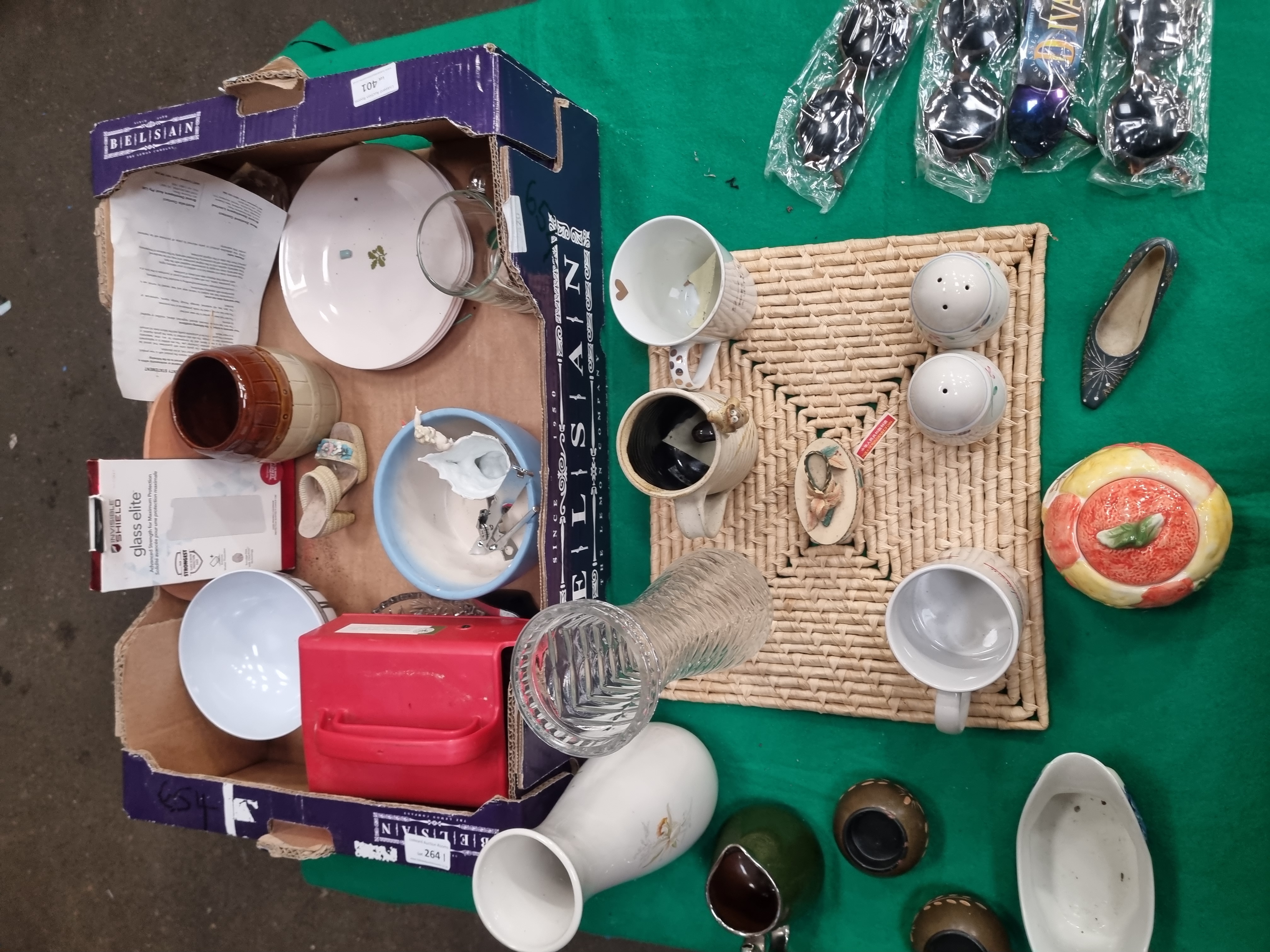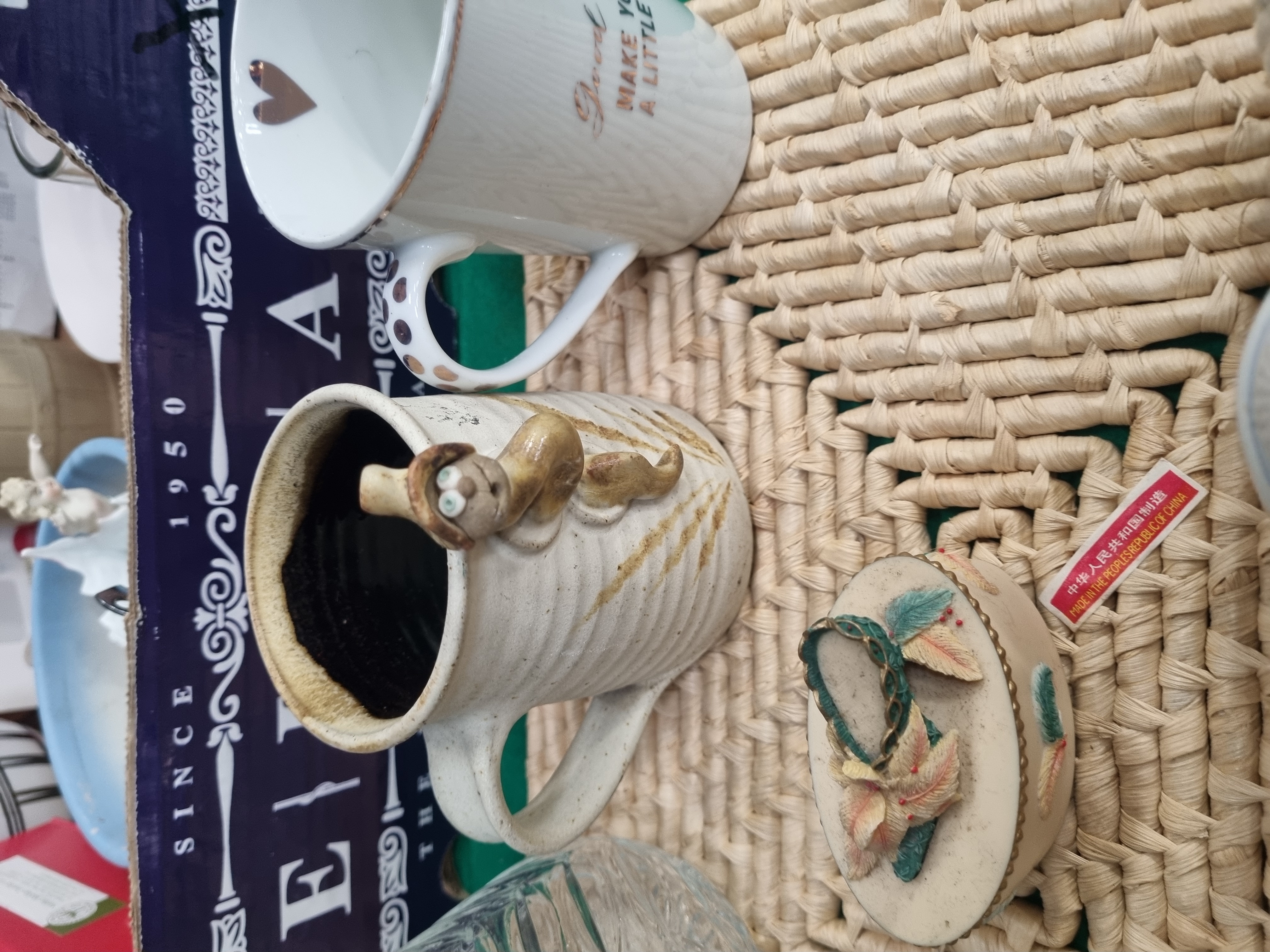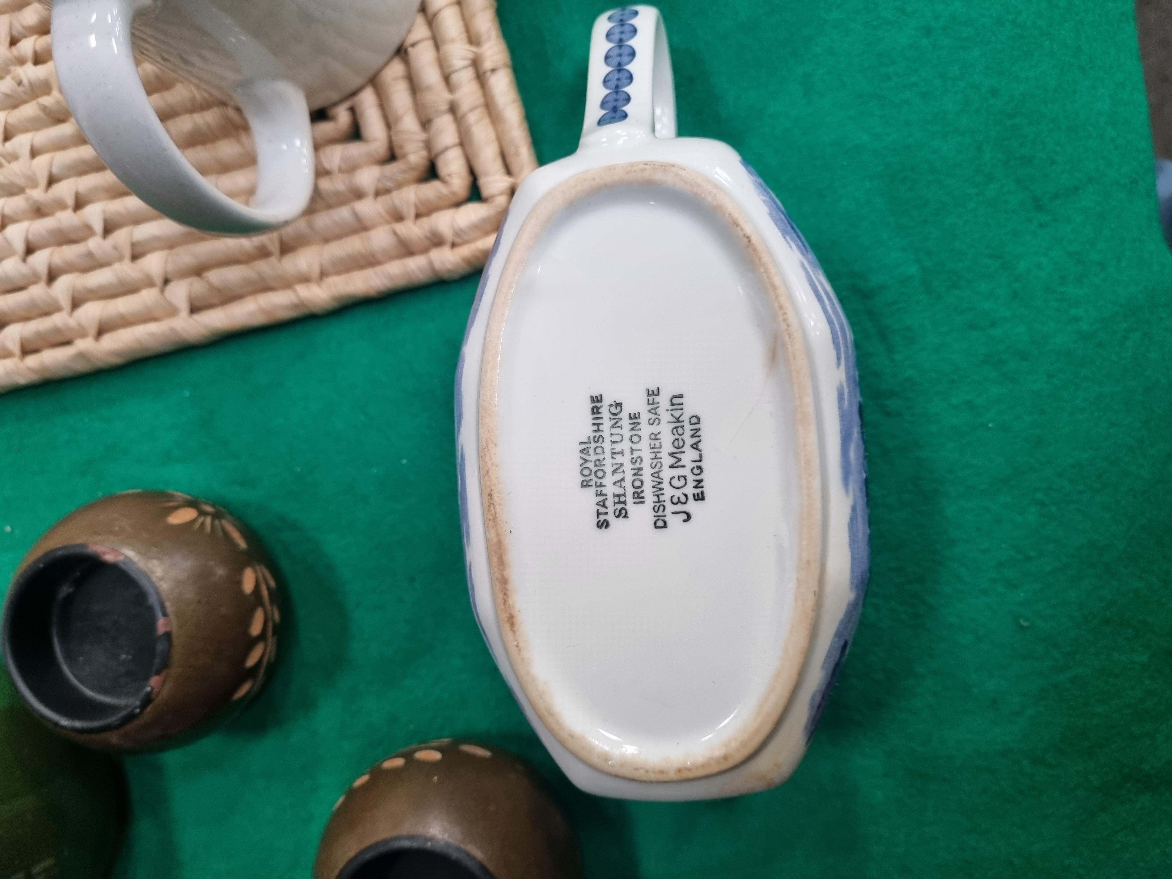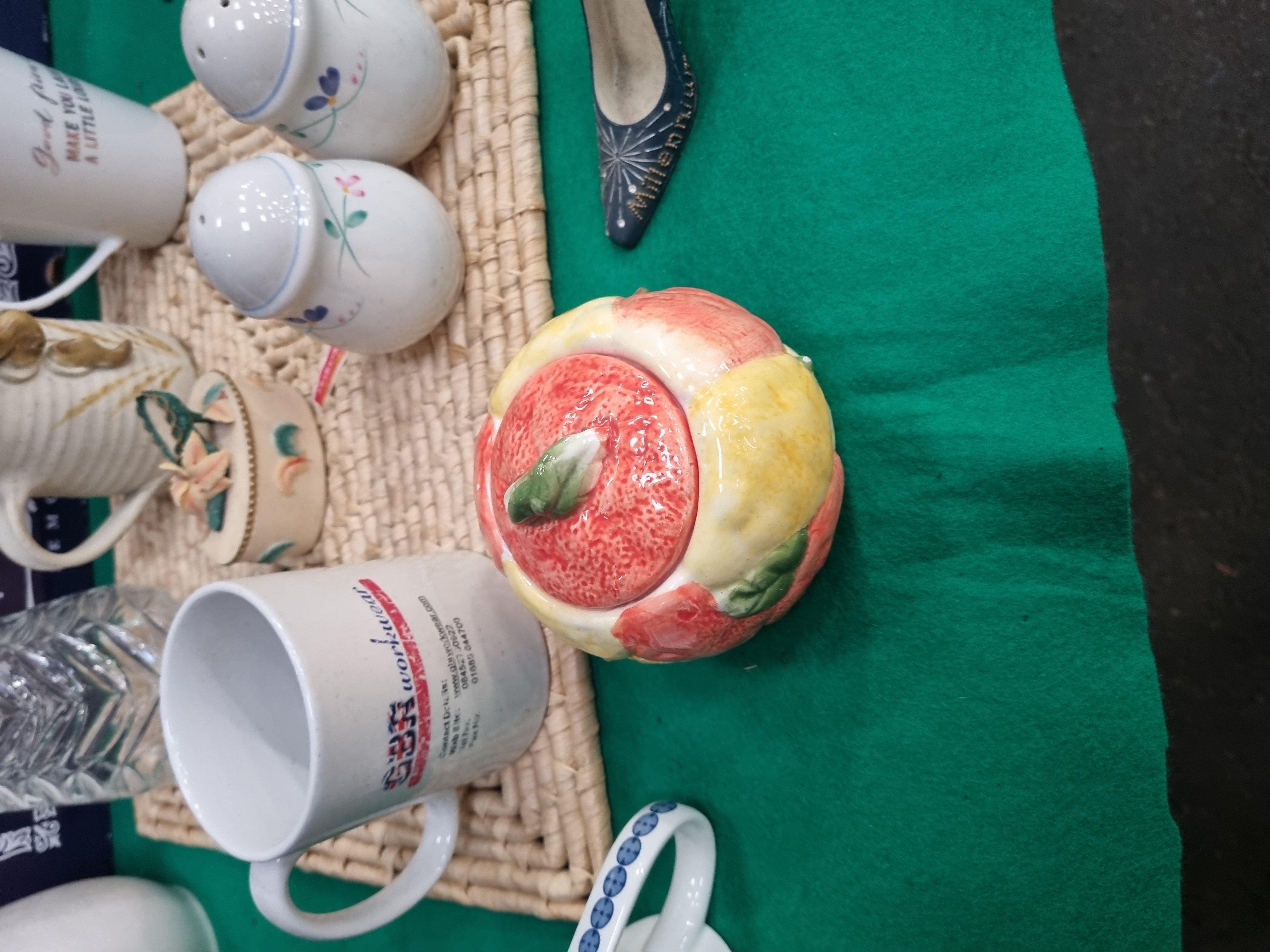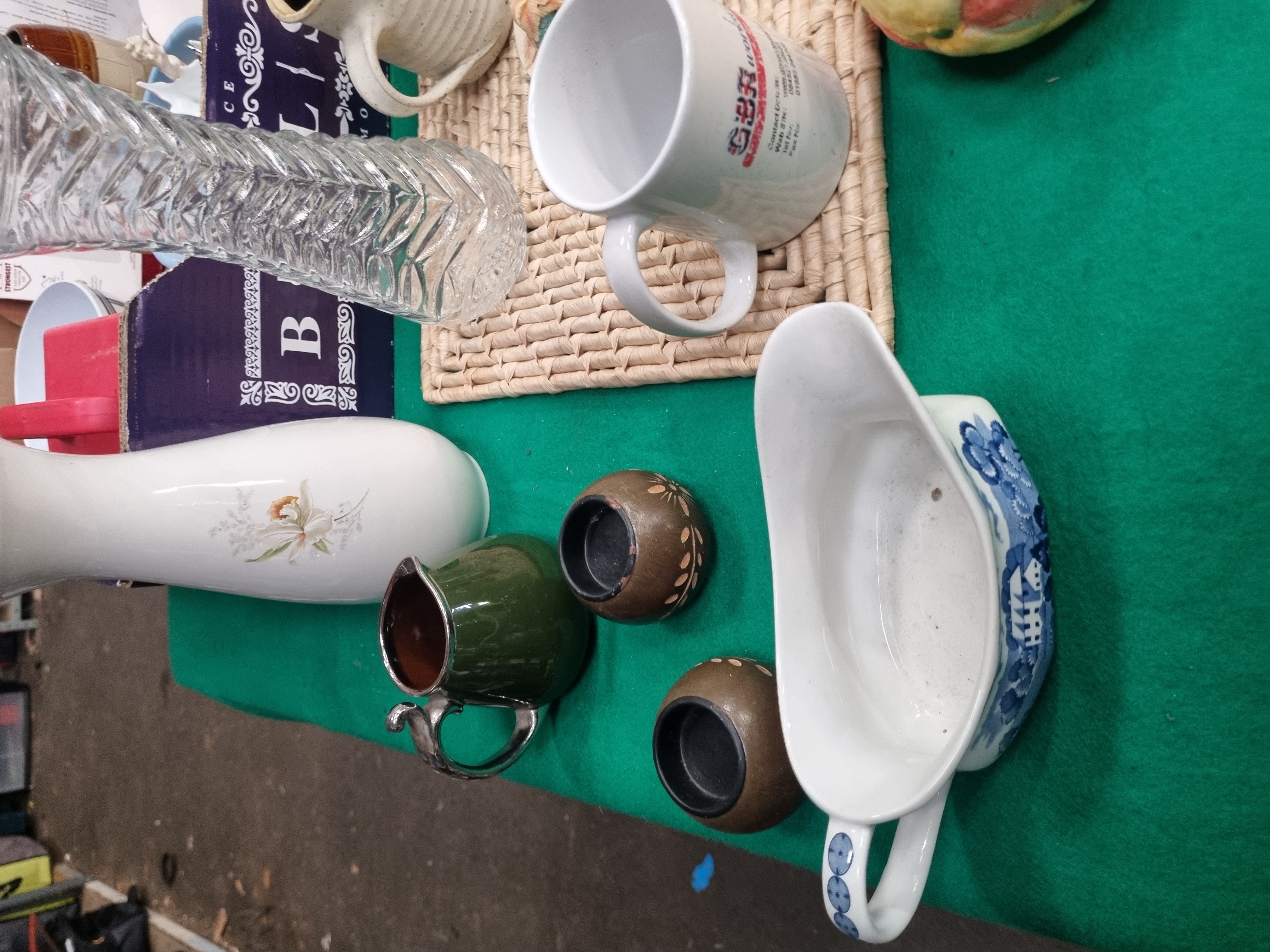 This lot comprises an assortment of household ceramics, glassware, and miscellaneous items. Featured is a J&G Meakin ironstone gravy boat in the Shantung pattern, decorated with blue transfer-printed Oriental-style pagodas and floral motifs. The base bears the printed mark Royal Staffordshire Shantung Ironstone J&G Meakin England. The collection includes several mugs, such as a promotional GBR workwear earthenware mug, a ribbed stoneware mug with an applied ceramic animal figurine, and a porcelain mug with heart decoration. Further ceramic items consist of a pair of baluster-form salt and pepper shakers with floral sprigs, a lidded pot modelled as a peach, an oval trinket box with a relief-moulded floral lid, and a porcelain vase with lily decoration. Also present are a green glazed miniature jug with a metal handle, two brown-glazed pots with slip-trailed decoration, a ceramic shoe ornament, and various plates and bowls. Glassware is represented by a clear cut-glass vase with geometric patterns. Miscellaneous contents include several pairs of contemporary sunglasses in plastic packaging, a red plastic storage carrier, and a woven fibre mat, all housed in a purple cardboard box.