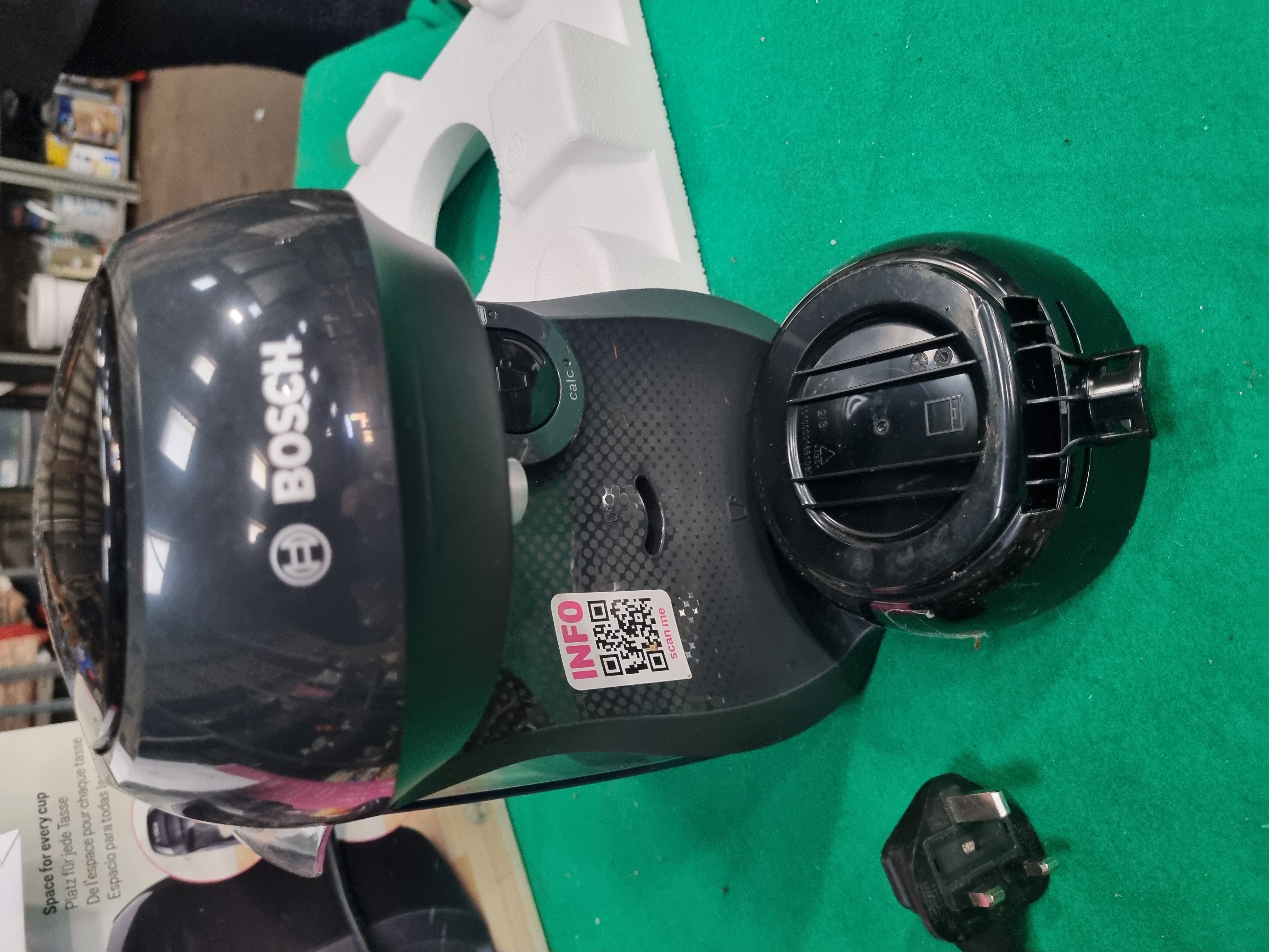 A Bosch Tassimo Happy pod coffee machine constructed with a black plastic body. This appliance uses the Tassimo T-Disc pod system and features one-touch operation for drink preparation. The design includes a removable 0.7 litre water tank positioned at the side and an adjustable, removable cup stand. Maintenance features include an automatic cleaning and descaling programme indicated by a calc light. The Bosch manufacturer name is printed on the top lid and main body, while the Tassimo brand name appears on the front drip tray area. A sticker with a QR code and the text INFO scan me is attached to the side. The machine is fitted with a standard UK 3-pin plug and is presented with its original retail box and partial internal styrofoam packaging.