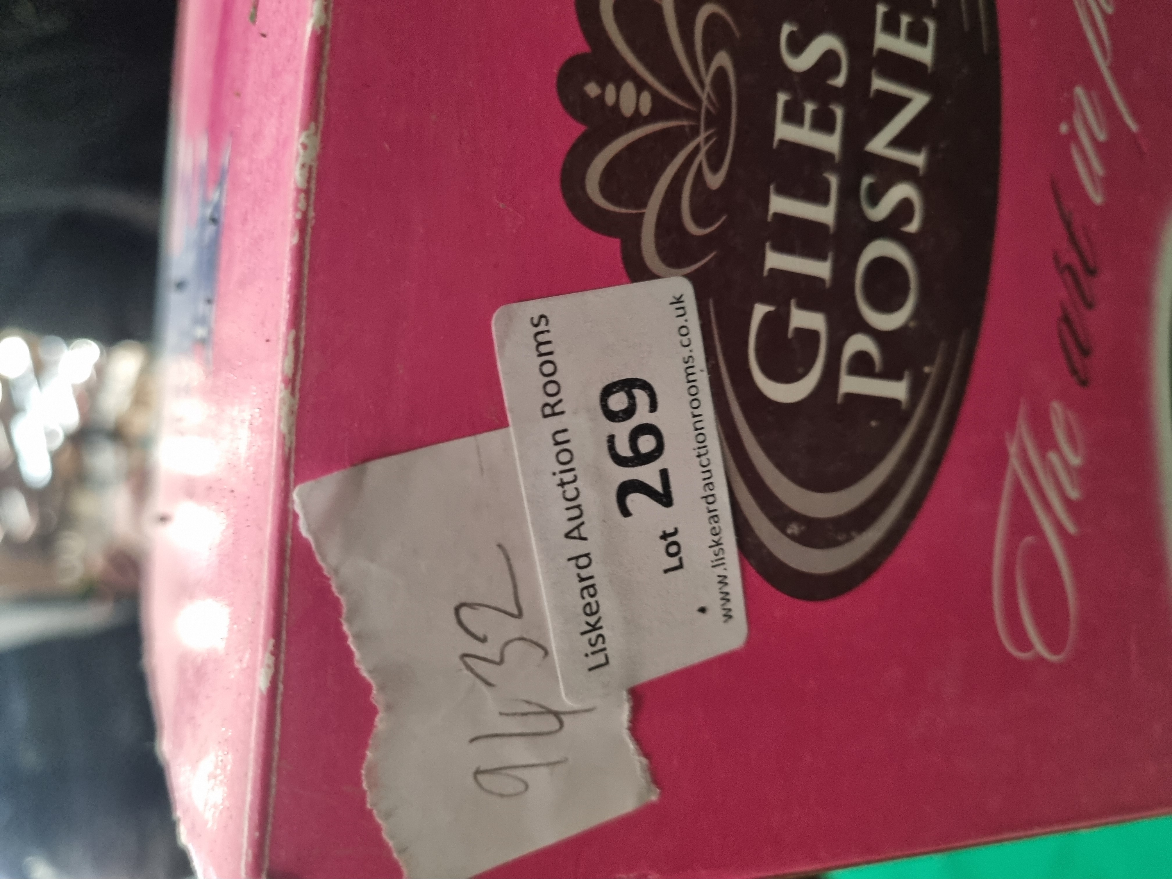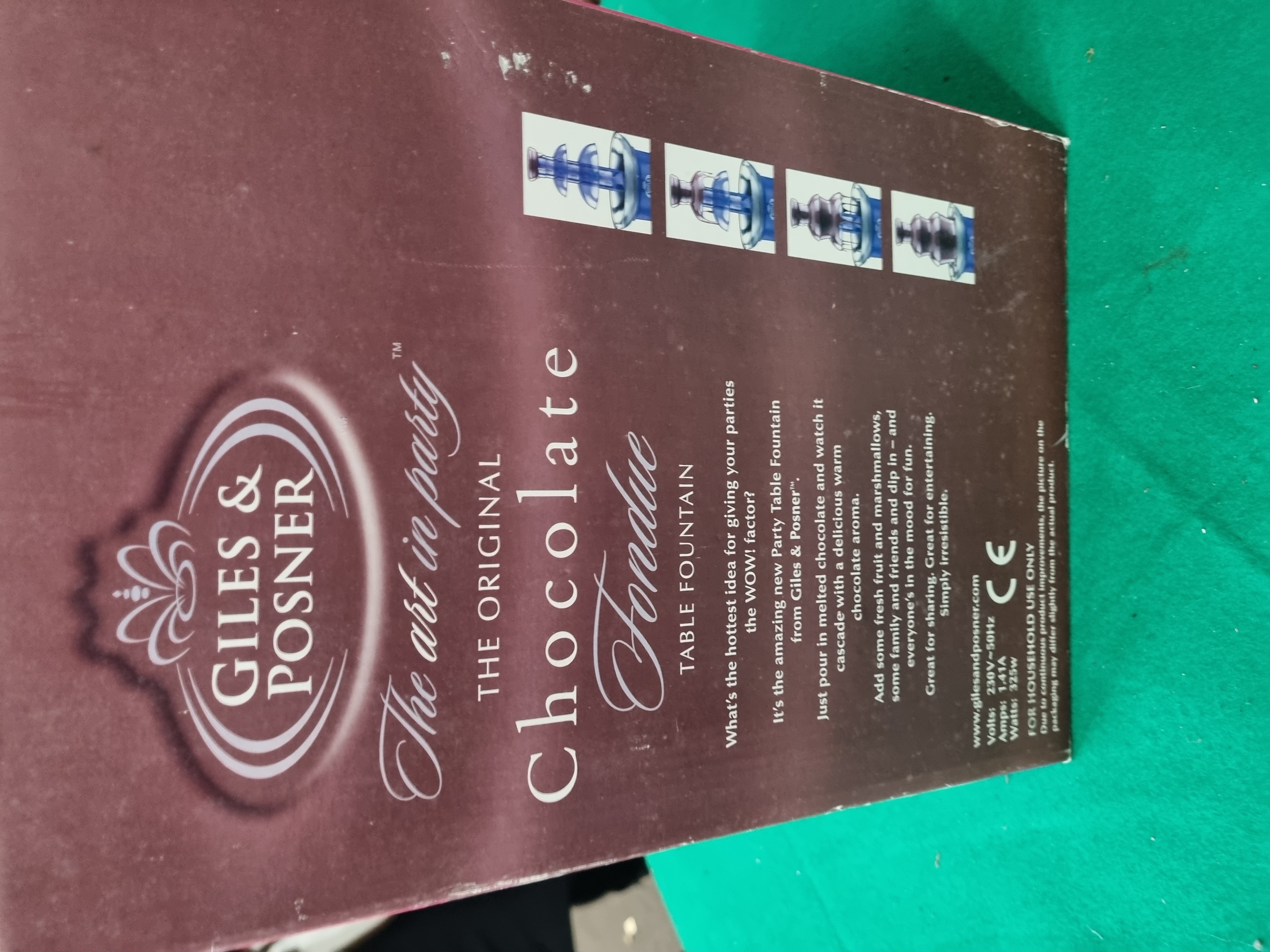 A Giles & Posner brand domestic kitchen appliance, marketed as the Party! The Original Chocolate Fondue Table Fountain. The unit features a tiered fountain design with a purple base. Technical specifications printed on the packaging indicate a power rating of 325W and a voltage of 230V~50Hz. The item bears a CE mark. The brand logo features the name Giles & Posner within an oval border surmounted by a crown. The packaging includes a barcode with the number 5060106320049.