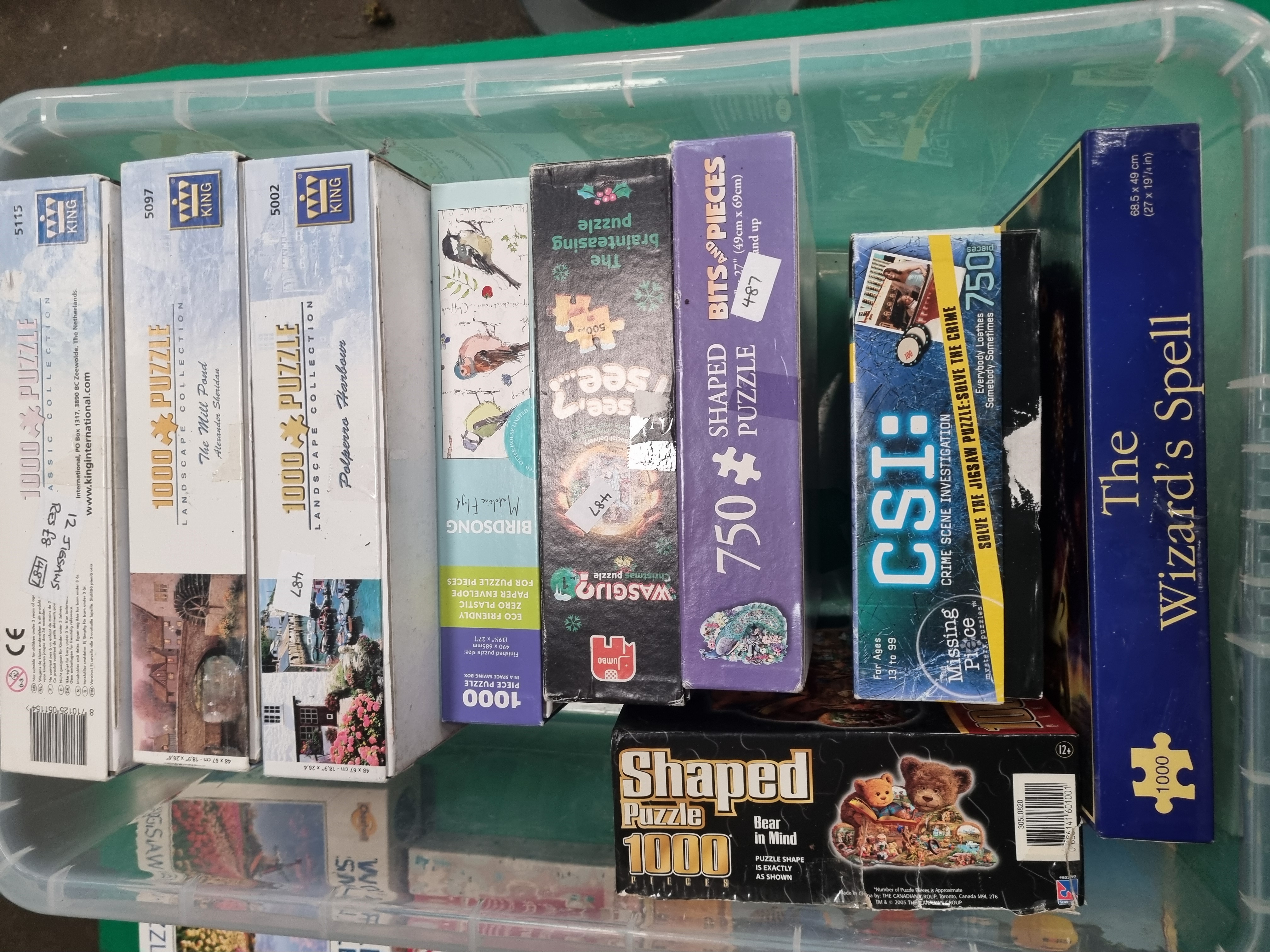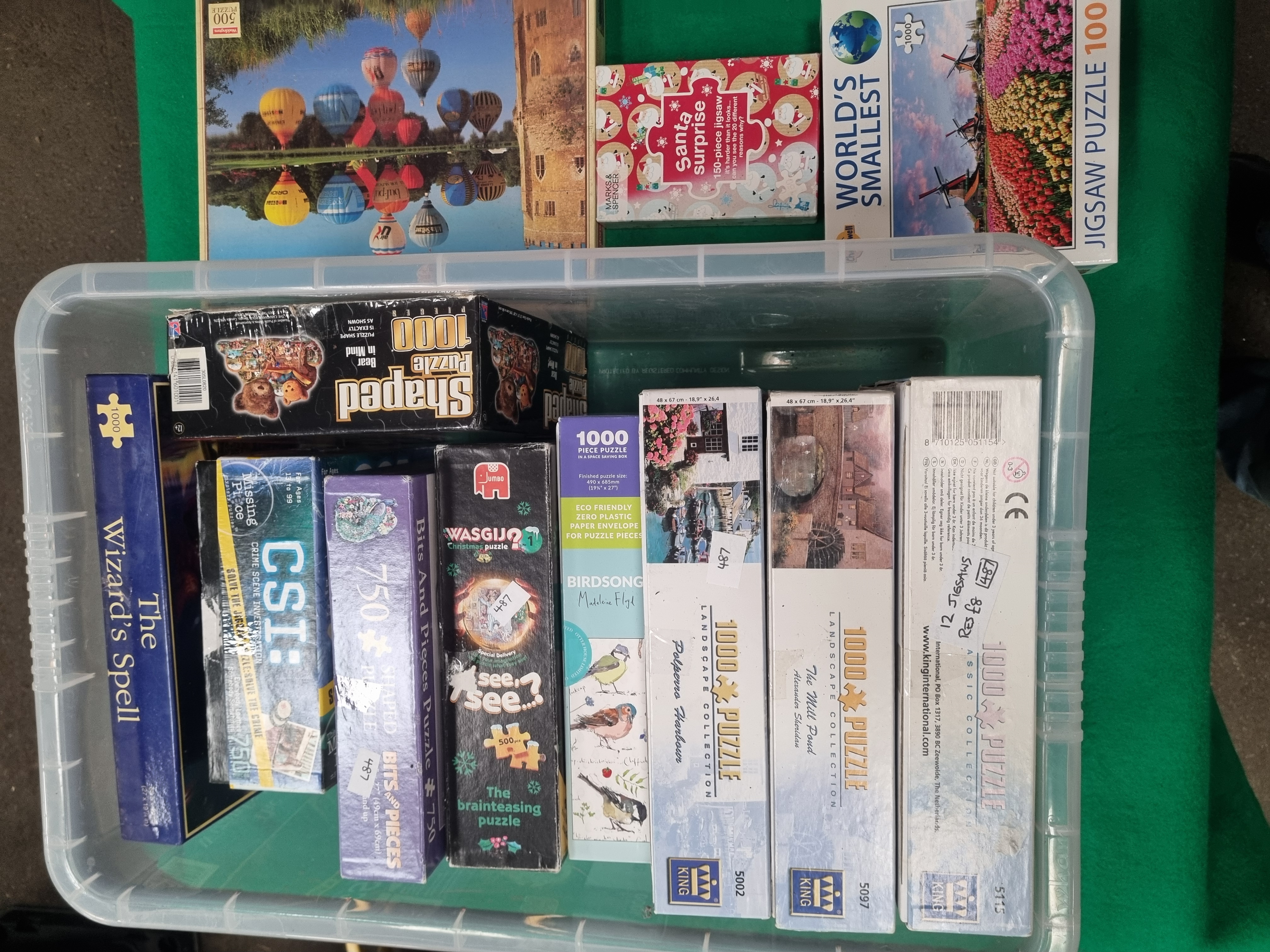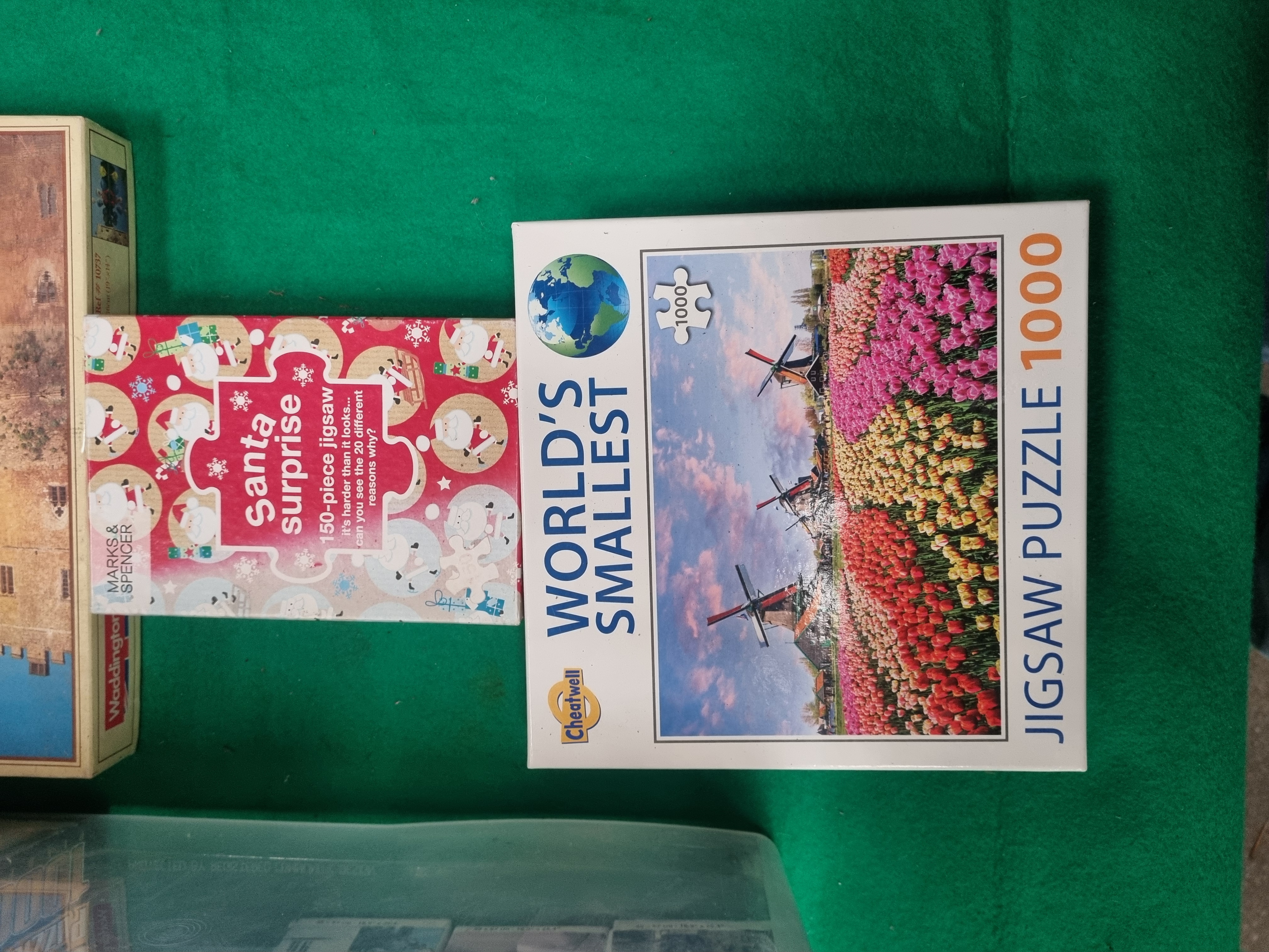 The assortment further contains The Wizard’s Spell 1000-piece fantasy puzzle, a Bear in Mind 1000-piece shaped puzzle by The Canadian Group, and a Birdsong 1000-piece puzzle featuring Madeline Floyd artwork in eco-friendly packaging. Smaller format puzzles include the World’s Smallest Jigsaw Puzzle (1000 pieces) by Cheatwell Games depicting windmills and tulips, a Marks & Spencer Santa Surprise 150-piece puzzle, and a Waddingtons 500-piece puzzle showing hot air balloons over a castle. All items are constructed from printed cardboard and housed in their original retail boxes.