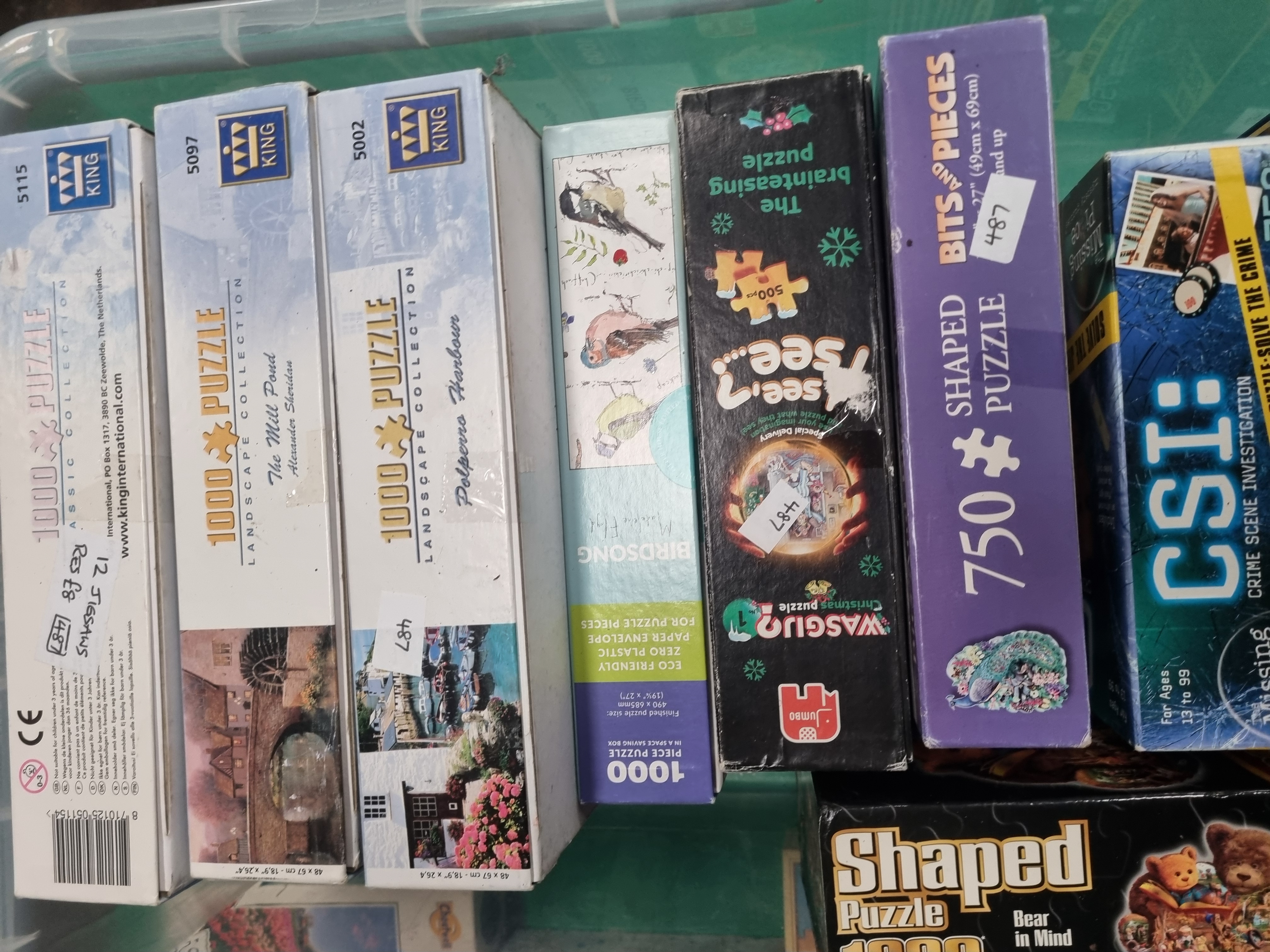 A collection of 12 boxed jigsaw puzzles featuring a variety of themes, piece counts, and manufacturers. The group includes three 1000-piece puzzles from the King Landscape Collection: The Mill Pond by Alexander Sheridan (Item No. 5097), Polperro Harbour (Item No. 5002), and a Classic Collection title (Item No. 5115). Also present is a Wasgij? Christmas Puzzle No. 1 (500 pieces) by Jumbo, a Bits and Pieces 750-piece shaped peacock puzzle, and a CSI: Crime Scene Investigation mystery puzzle titled Everybody Loathes Somebody Sometimes (750 pieces).