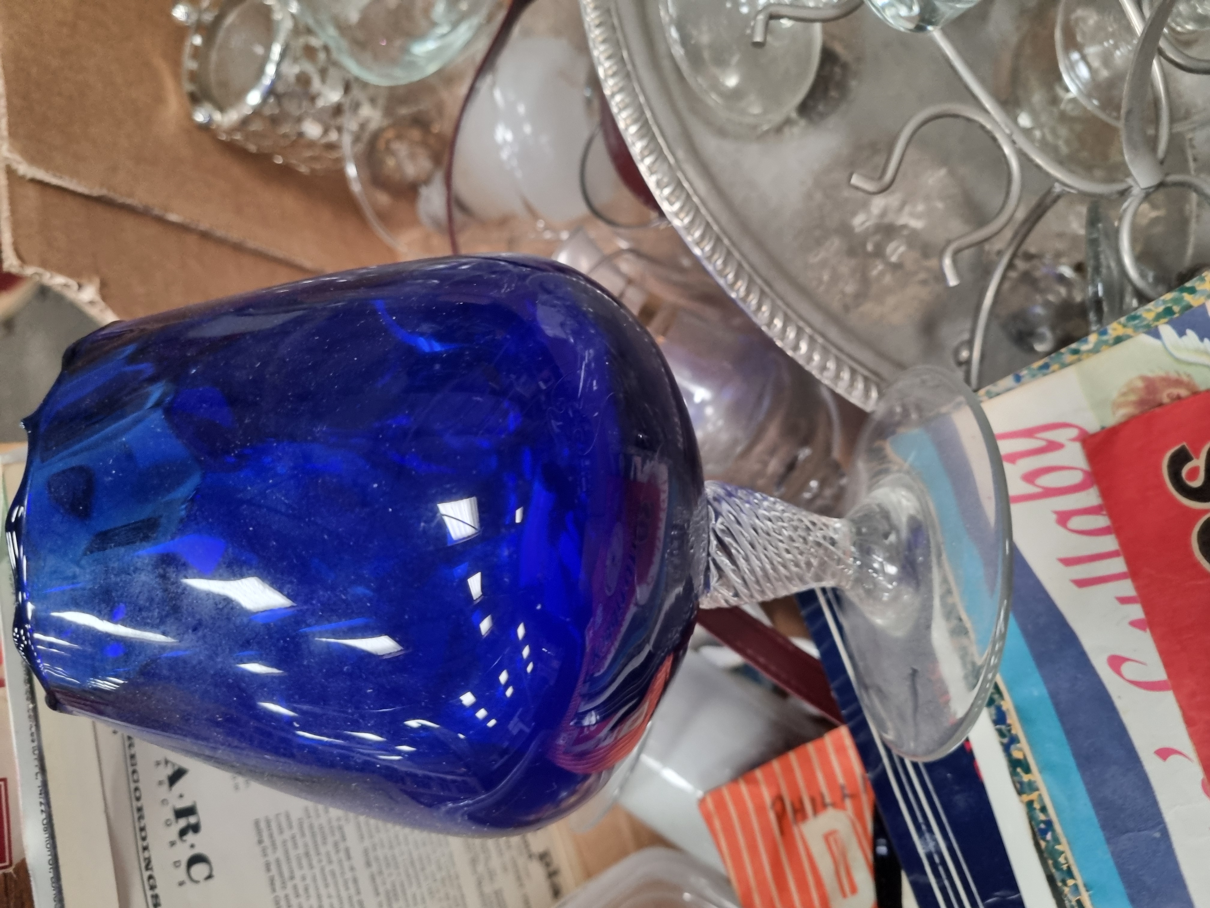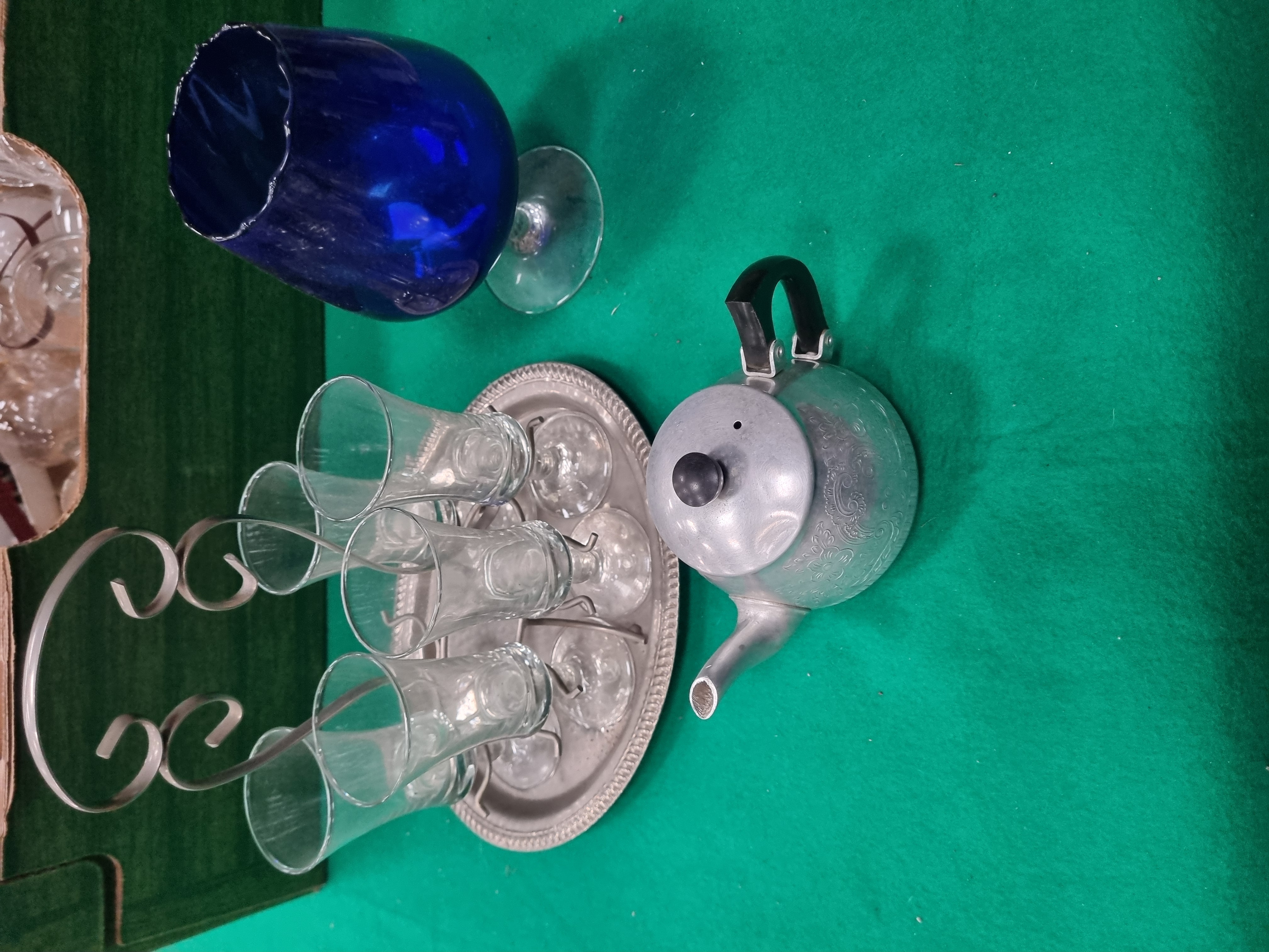 An assortment of vintage 45 RPM vinyl records and ephemera, featuring singles from prominent labels including RCA Victor, Decca, London Records, and Mercury Records. Visible titles include Jim Reeves I Won’t Forget You (RCA-1400) and Anna Marie (RCA 1385), The Bachelors I Wouldn’t Trade You For The World (F.11949), Roy Orbison Indian Wedding (HLU 9952), and Anita Wood Hawaiian Wedding Song (45-AMT 1025). The collection also includes a selection of Kidditunes small-format children’s records, likely 78 RPM, distributed by Lumar Ltd, Swansea, including On Ilkla Moor Baht at (LM 17). The glassware comprises a large cobalt blue goblet with a clear wrythen style twisted stem and a plain circular foot, alongside a variety of clear stemmed glasses and tumblers, some featuring etched or printed patterns. Metalware items include a small aluminium teapot with an embossed floral and scrollwork body, fitted with a black composite handle and lid knob. Also included is a circular metal tray with a beaded rim and a scrolling wire carrier designed to hold small glasses.