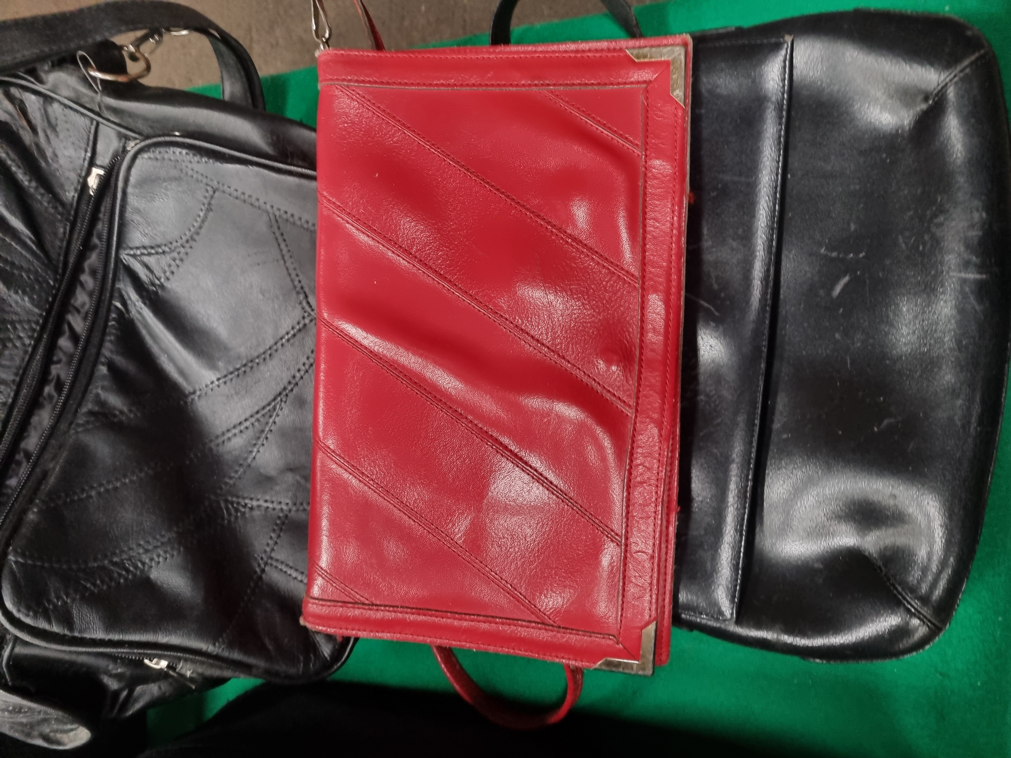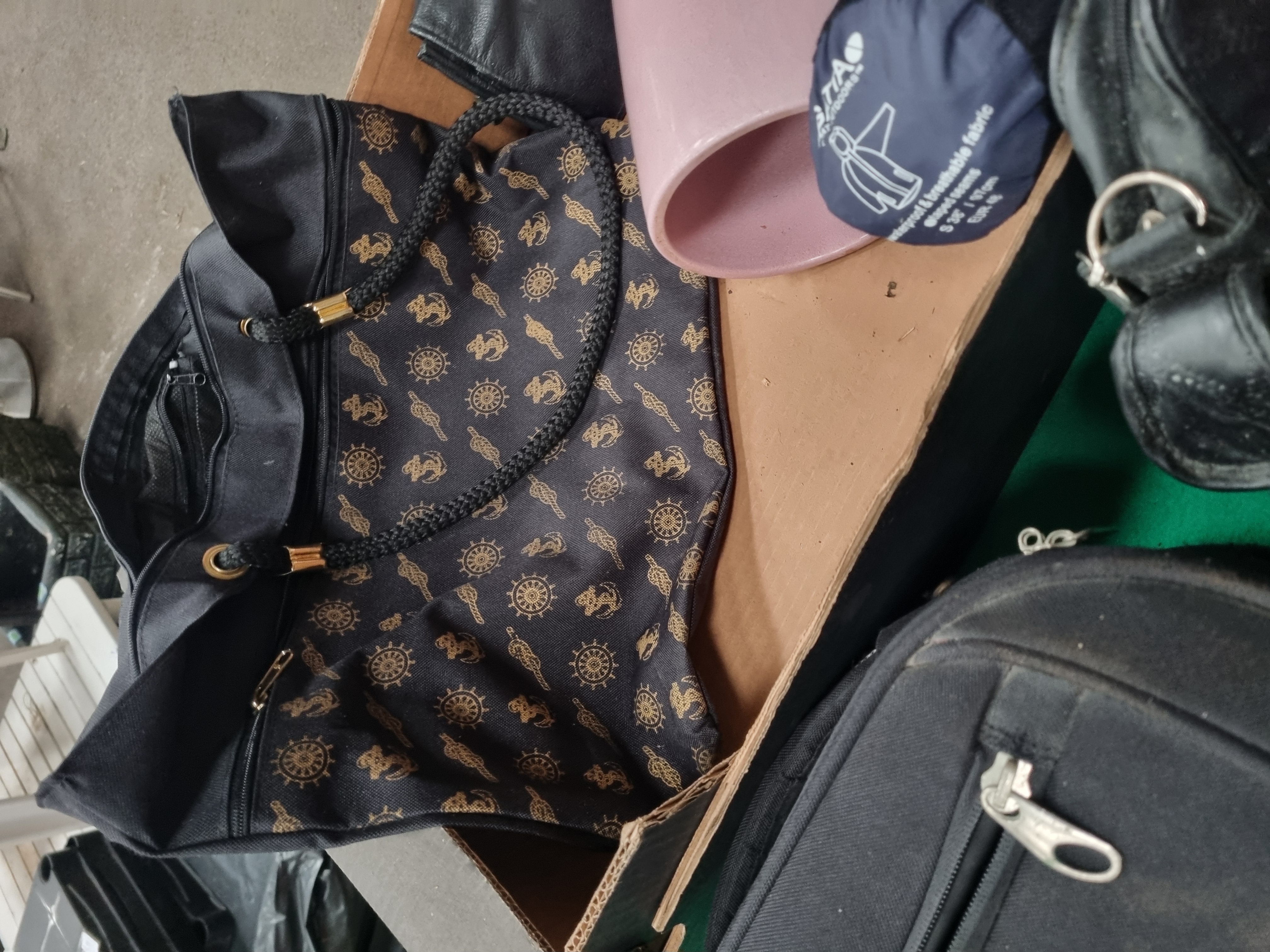 A collection of mixed luggage, handbags, and outdoor apparel. The group includes a Fiore brand soft-shell rolling suitcase in black and grey textile, featuring an oval metal brand badge to the front and multiple zipped exterior pockets. Also present is a large black fabric nautical tote bag decorated with a repeating gold-tone ship’s wheel and anchor motif, fitted with black twisted rope handles and gold-tone metal attachments. The lot features a vintage-style red leather clutch bag with diagonal quilted stitching and gold-tone metal corner reinforcements. Additional items include a black leather shoulder bag with curved decorative stitching and silver-tone zips, a black flap-over handbag, and a Regatta Great Outdoors packable waterproof jacket in navy blue. The collection is accompanied by a pink ceramic or plastic vessel and various small black pouches. The suitcase currently bears a lot tag for Liskeard Auction Rooms.