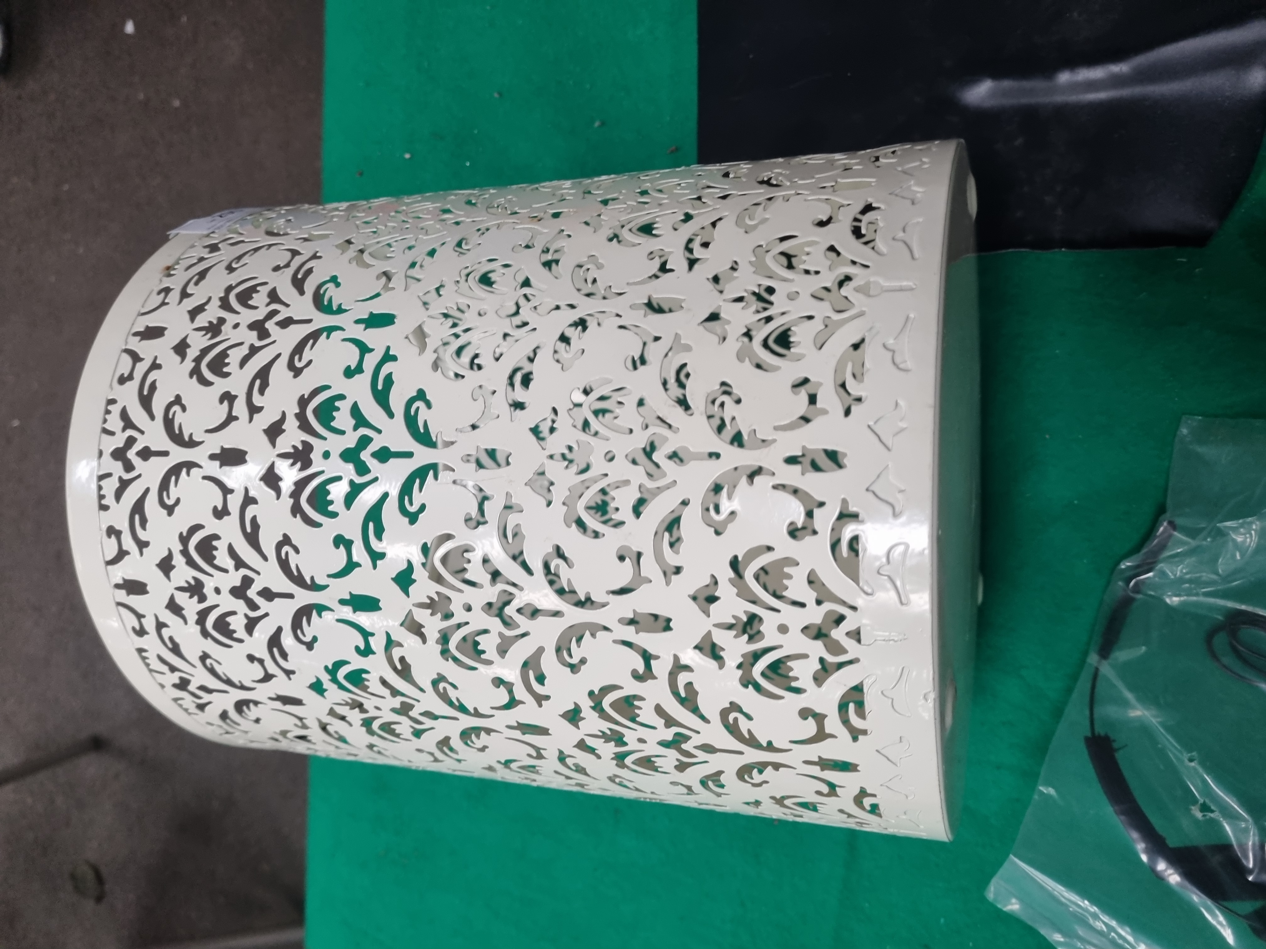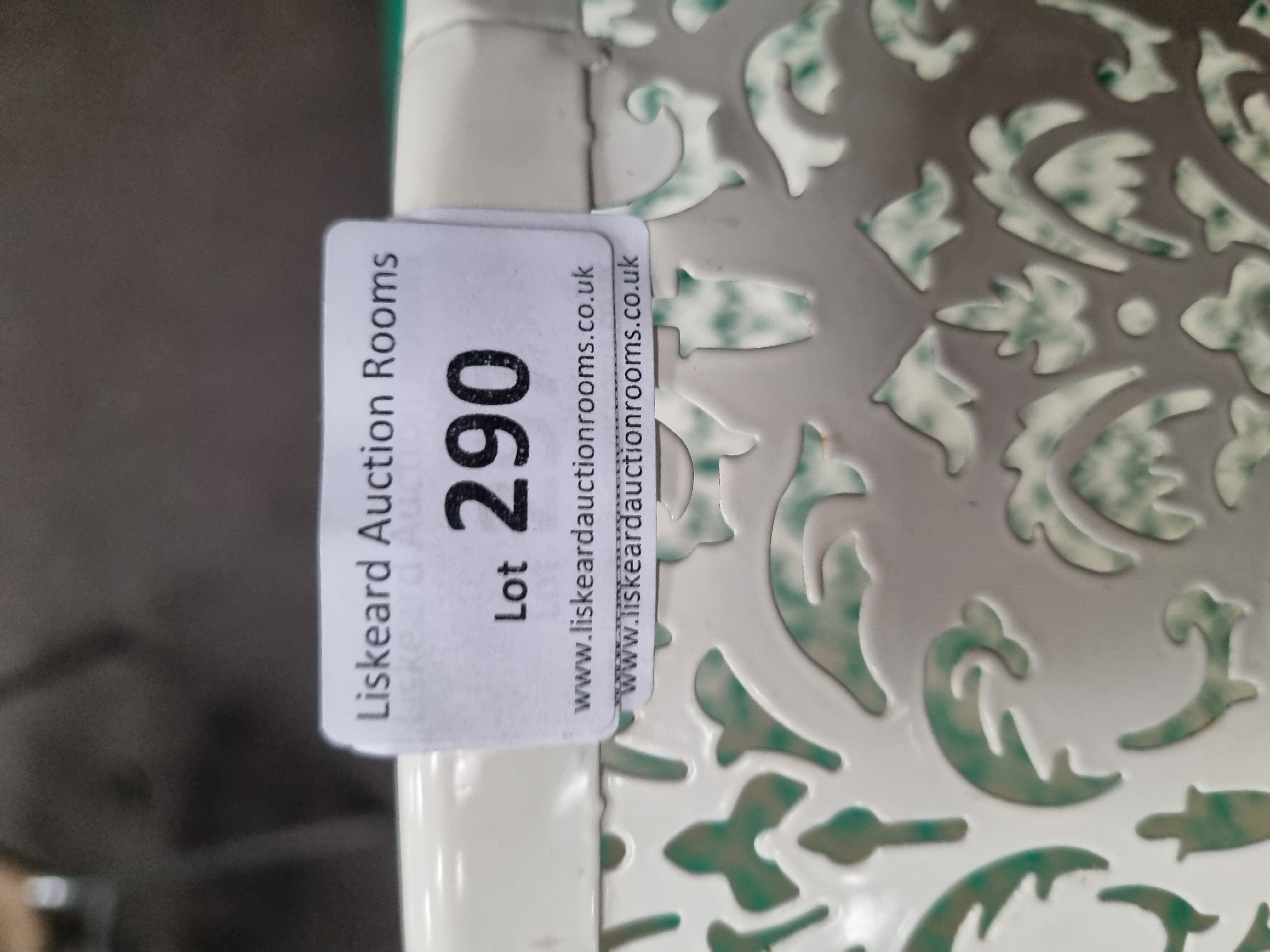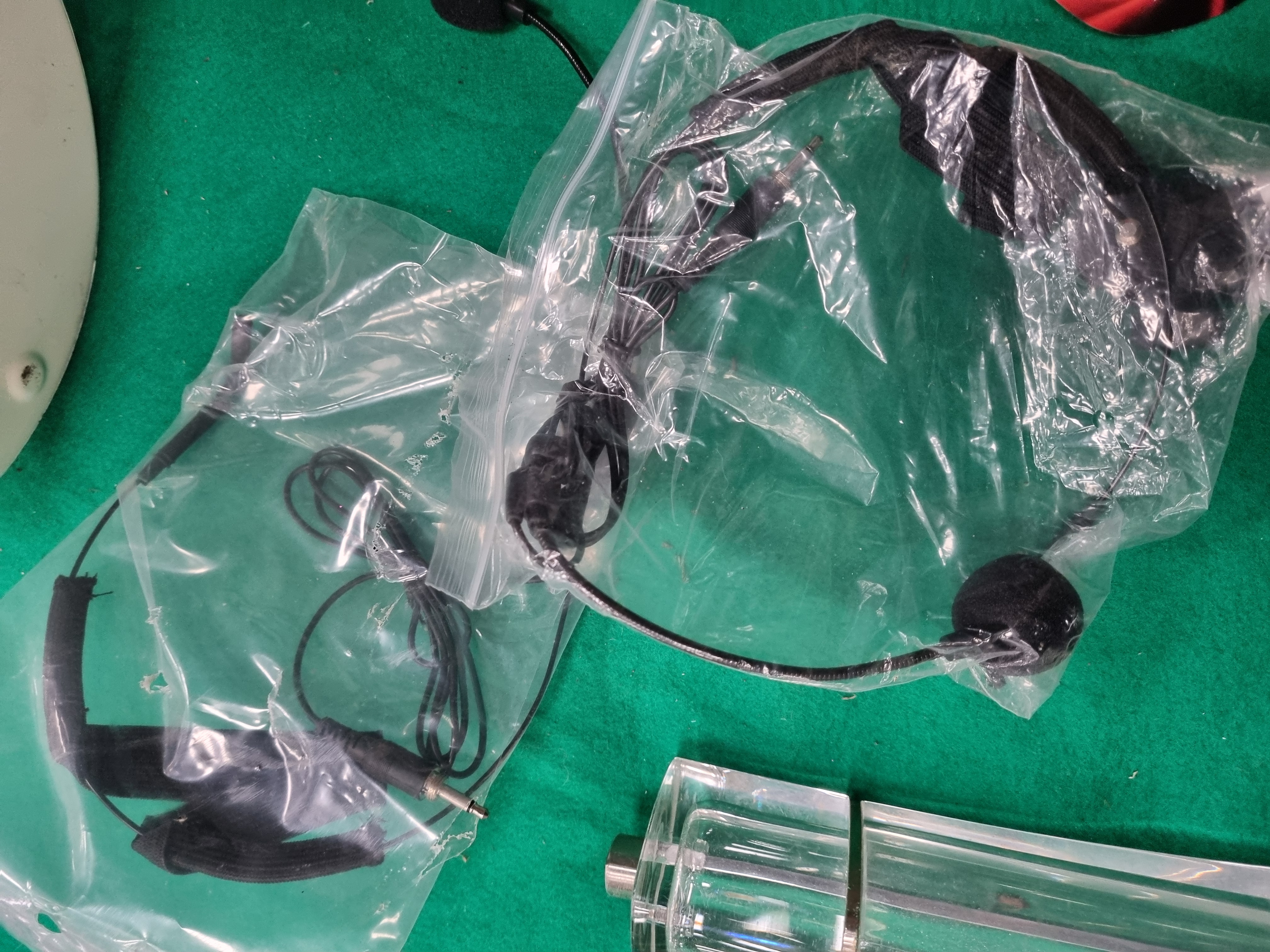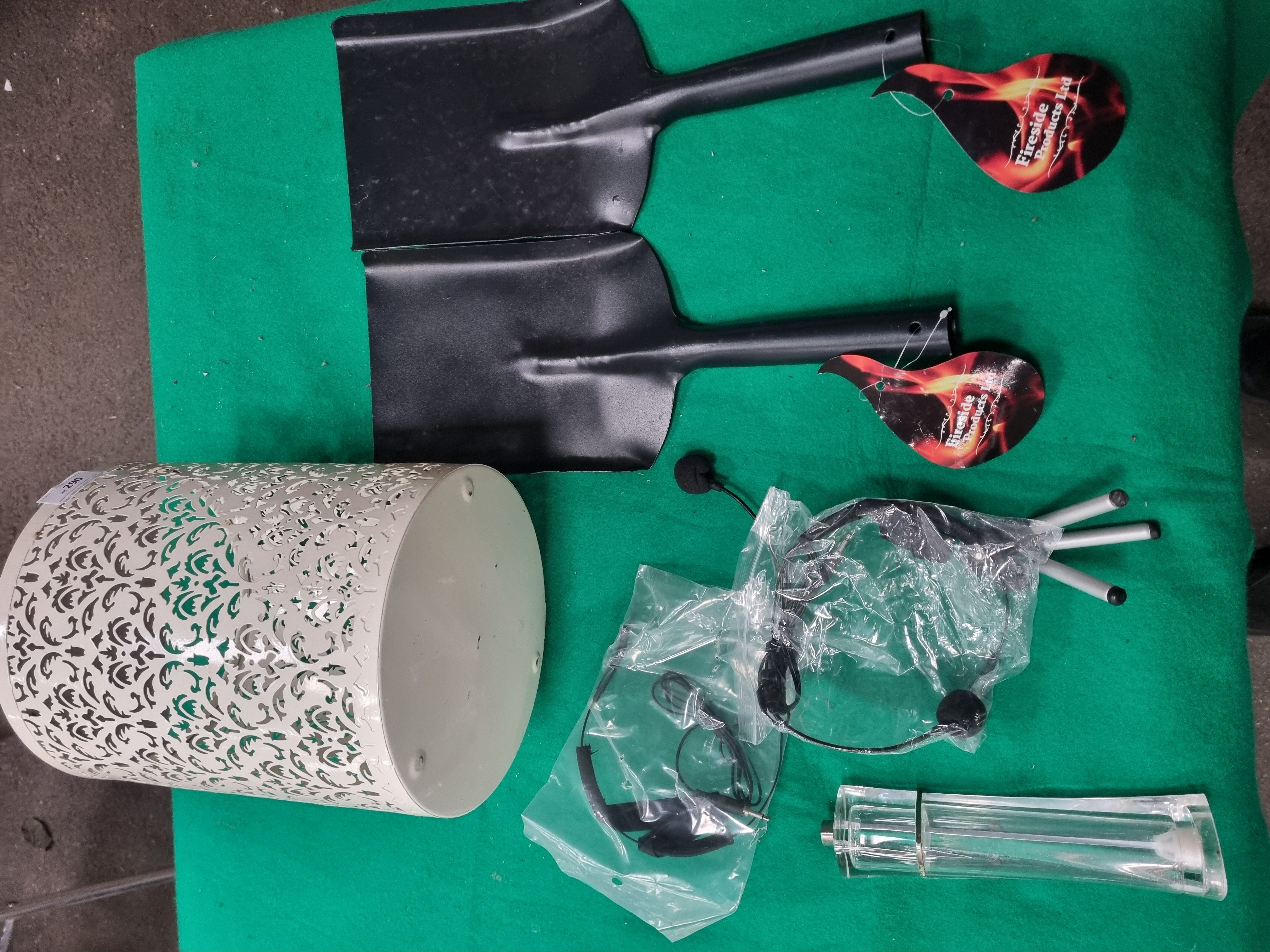 An assortment of household and electronic items. The lot includes a pair of black-coated metal fireside shovels, both retaining original retail card tags for Fireside Products Ltd featuring a flame graphic. Also present is a cream-painted metal cylindrical vessel featuring an all-over pierced foliate and scrollwork design, in the style of a decorative solar lantern cover or wastepaper bin. The lot further contains two black headsets with adjustable boom microphones, each housed in clear plastic packaging, and a silver-toned tabletop tripod with a standard threaded mount and black plastic fittings. Additionally, there is a clear faceted acrylic object with metal components, appearing to be a salt or pepper mill or decorative vessel. One item bears a lot sticker for Liskeard Auction Rooms, Lot 290.