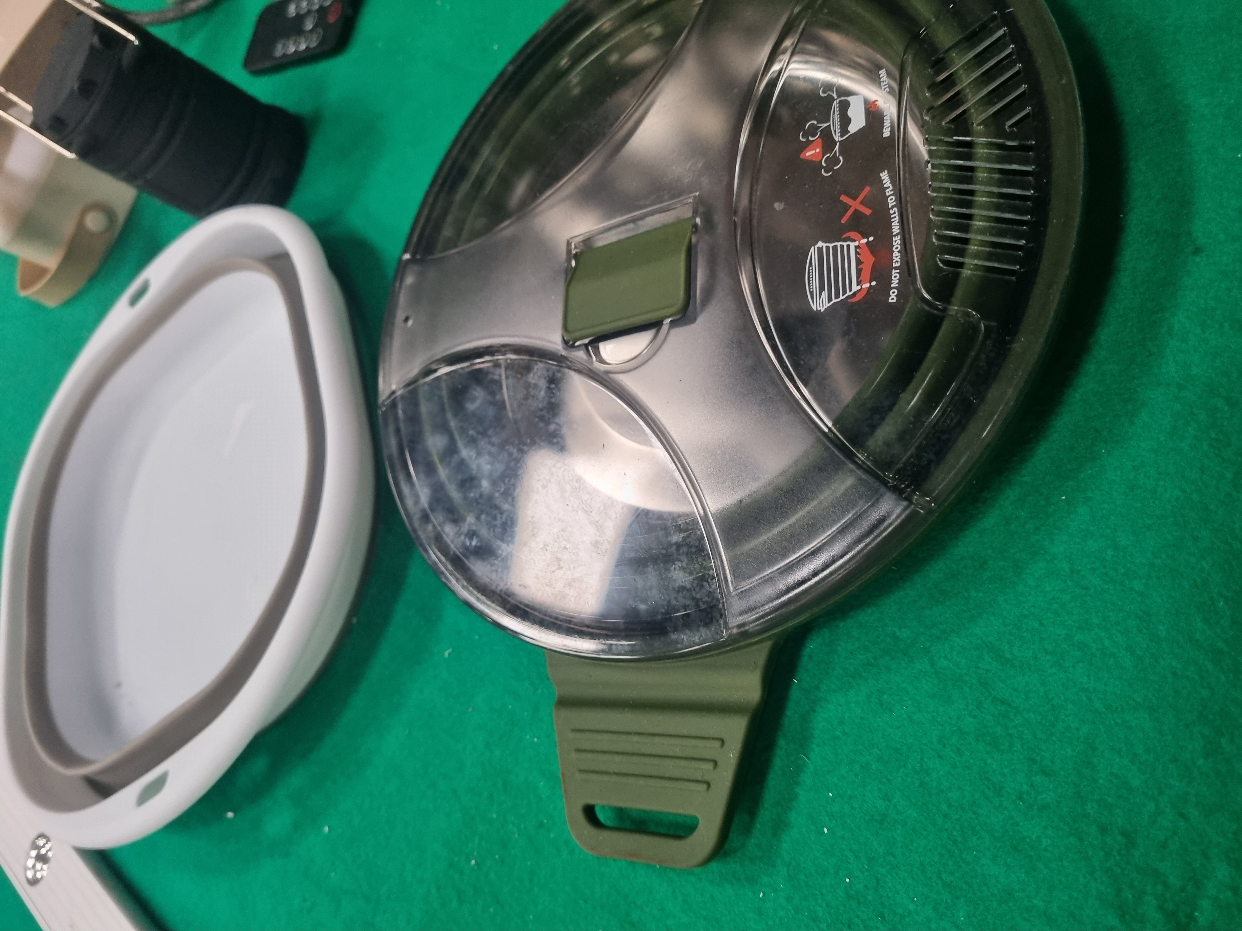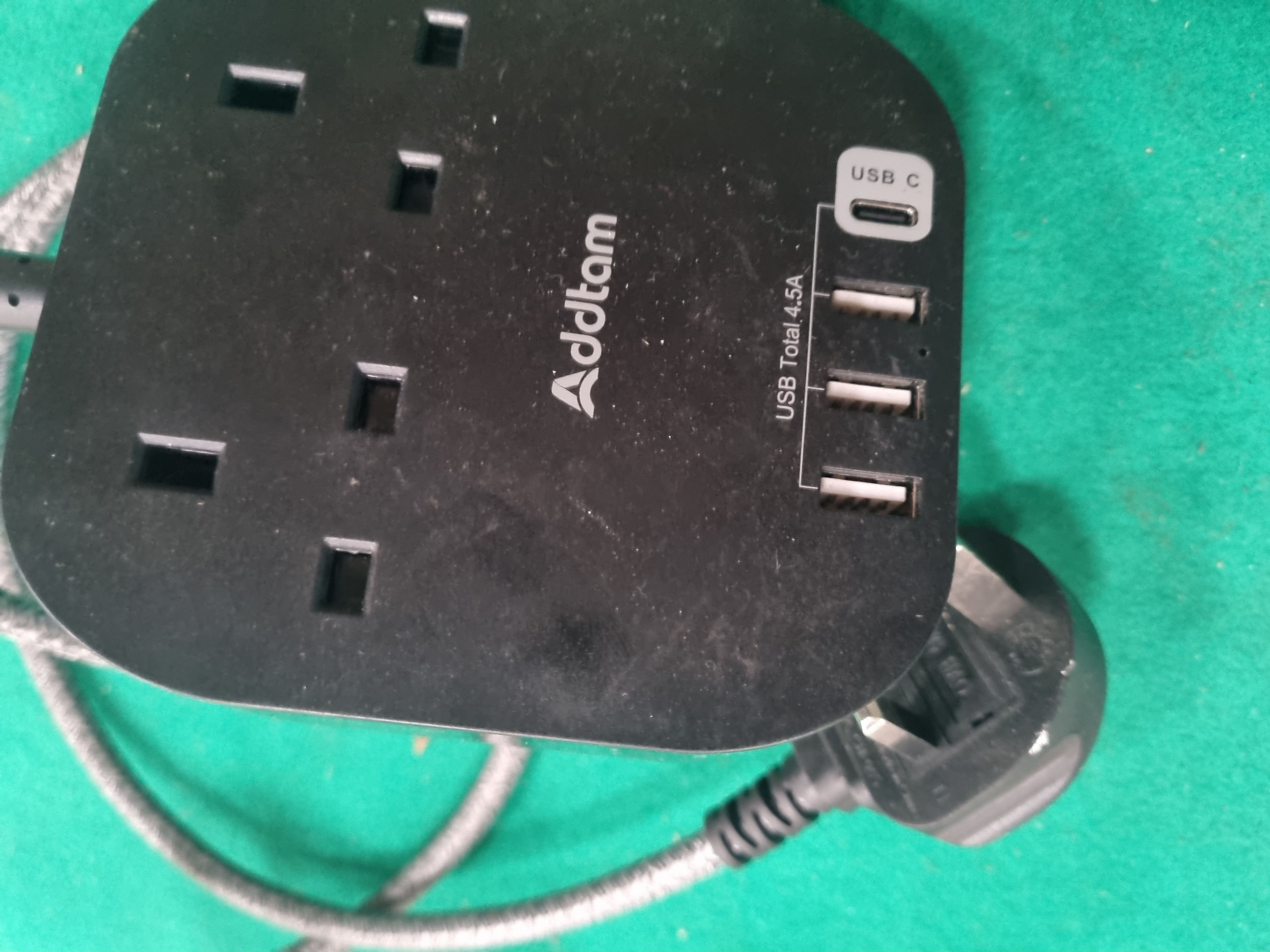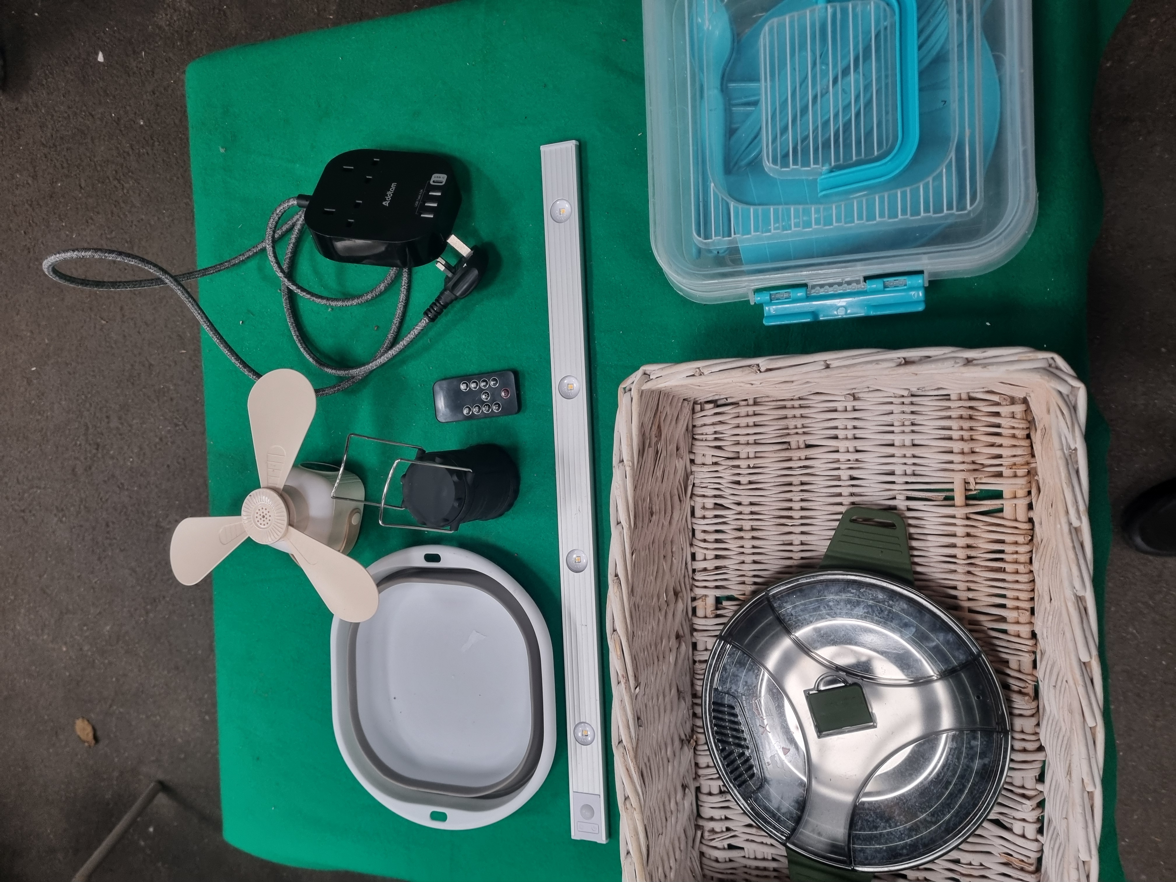 This lot comprises a collection of assorted household, camping, and electrical items. The electrical components include an Addtam brand power strip featuring three UK 3-pin sockets, three USB-A ports, and one USB-C port, fitted with a grey braided cable and a standard British Type G plug. Also included is a slim white LED strip light with an integrated PIR sensor and a small black remote control. The camping and outdoor selection consists of a grey and white collapsible silicone bowl, a green and grey collapsible camping kettle or pot with a clear plastic lid, and a small battery-operated portable fan with cream-coloured blades. The lid of the collapsible pot bears safety warnings reading BEWARE OF STEAM and DO NOT EXPOSE WALLS TO FLAME. Storage items include a clear plastic box containing a set of blue plastic picnic-ware, including plates, cups, and cutlery, and a rectangular white-painted wicker storage basket. The basket has a small paper tag attached with the handwritten numerals 4692.