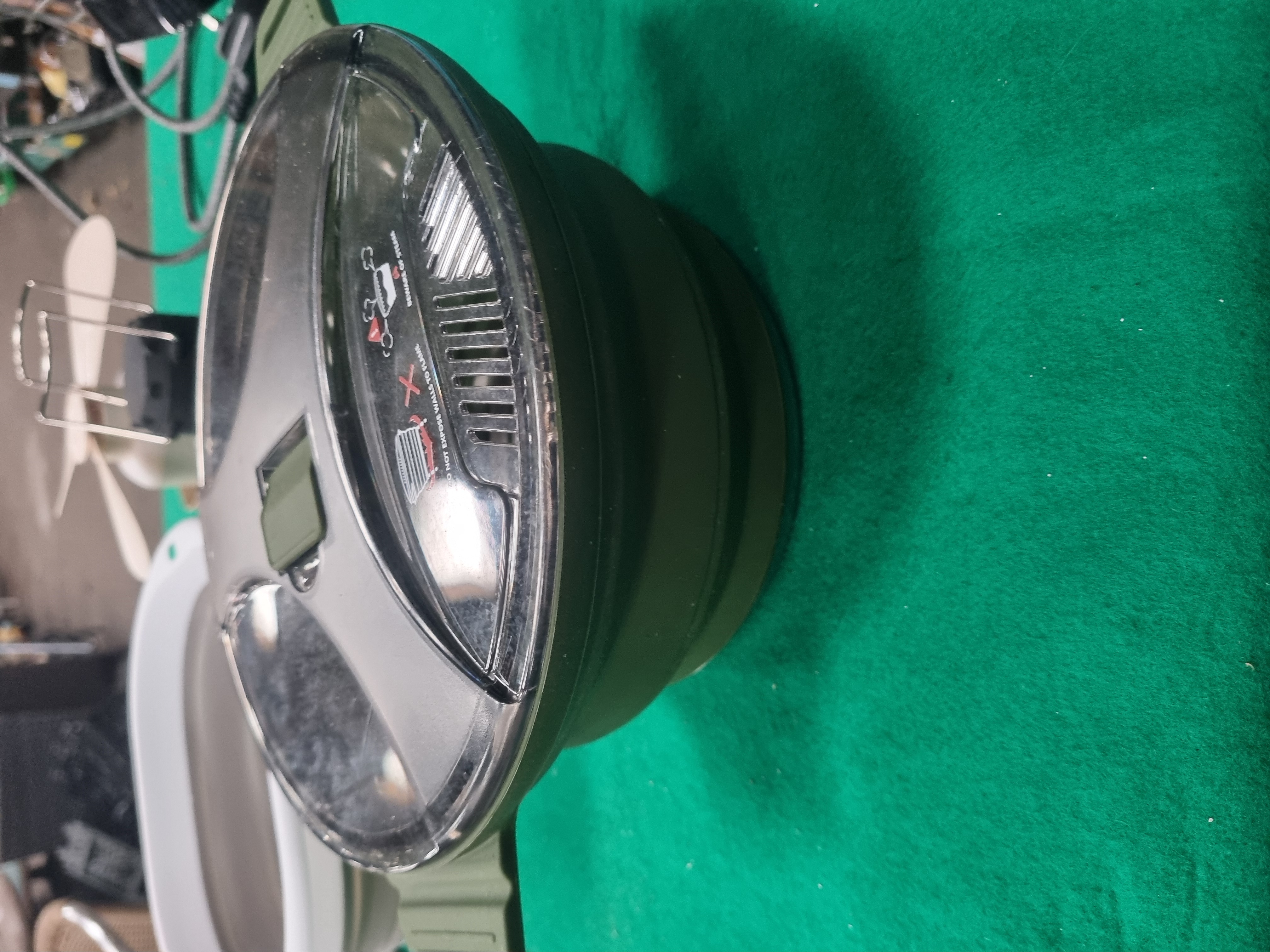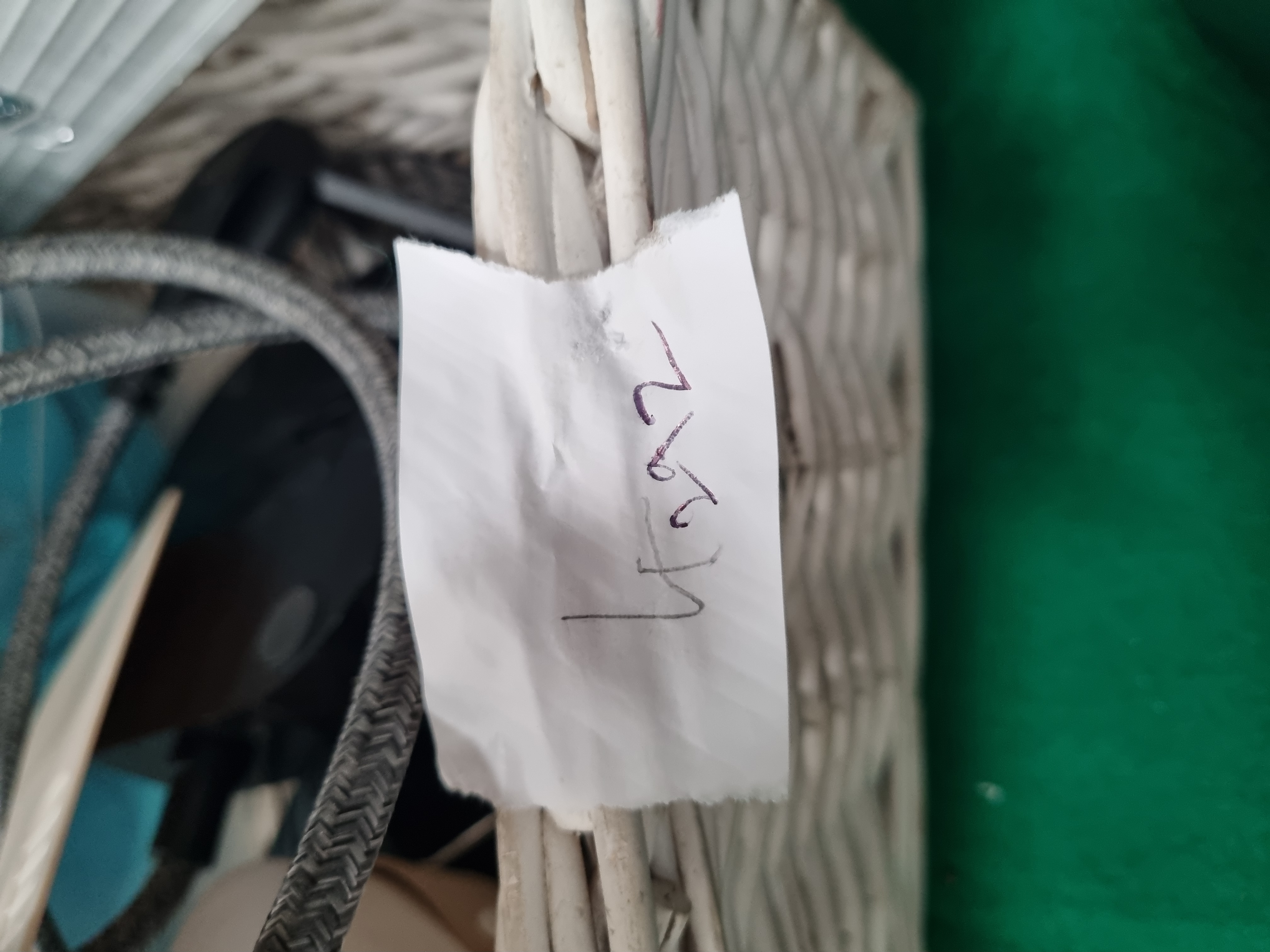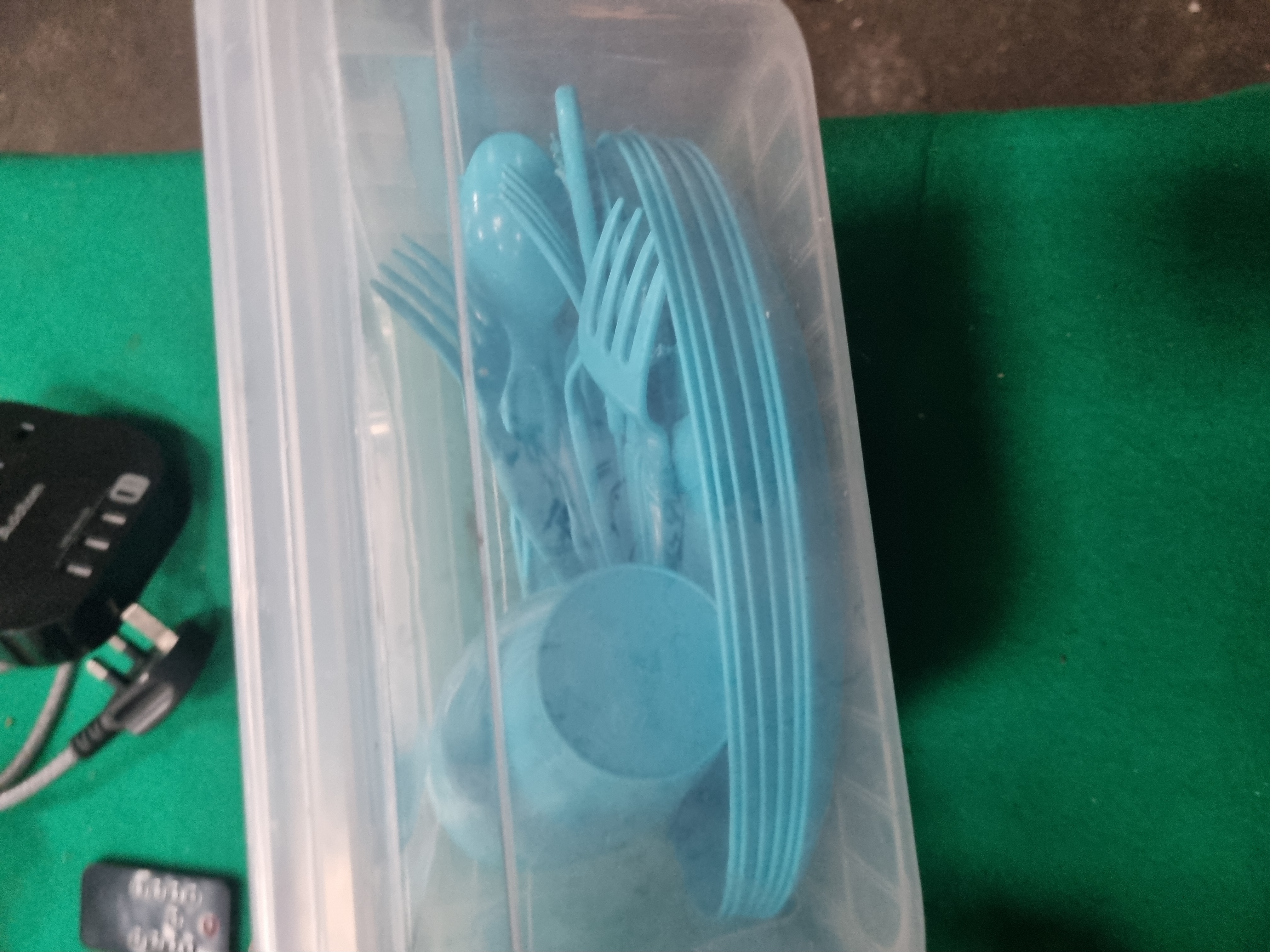 This lot comprises a collection of assorted household, camping, and electrical items. The electrical components include an Addtam brand power strip featuring three UK 3-pin sockets, three USB-A ports, and one USB-C port, fitted with a grey braided cable and a standard British Type G plug. Also included is a slim white LED strip light with an integrated PIR sensor and a small black remote control. The camping and outdoor selection consists of a grey and white collapsible silicone bowl, a green and grey collapsible camping kettle or pot with a clear plastic lid, and a small battery-operated portable fan with cream-coloured blades. The lid of the collapsible pot bears safety warnings reading BEWARE OF STEAM and DO NOT EXPOSE WALLS TO FLAME. Storage items include a clear plastic box containing a set of blue plastic picnic-ware, including plates, cups, and cutlery, and a rectangular white-painted wicker storage basket. The basket has a small paper tag attached with the handwritten numerals 4692.