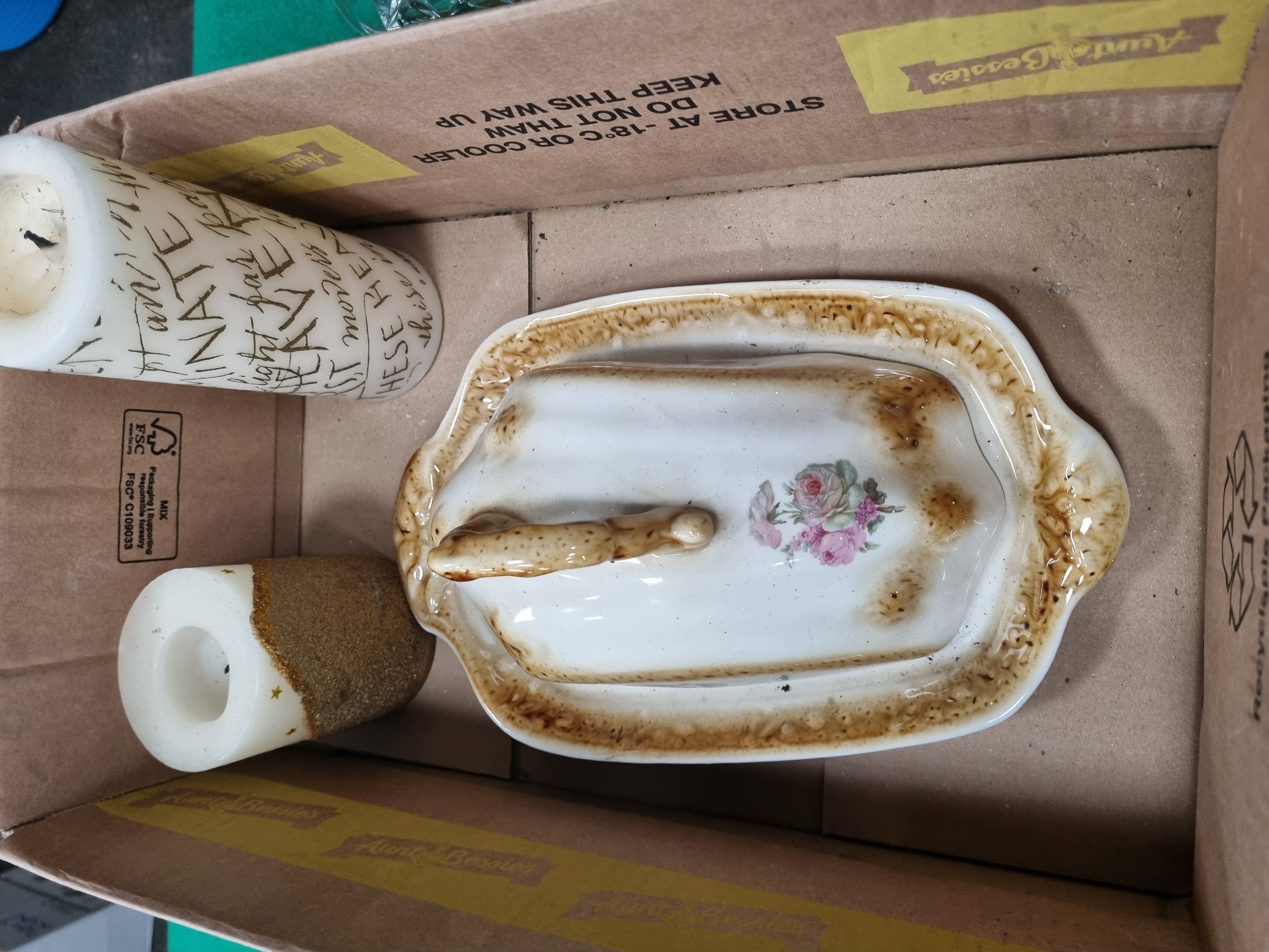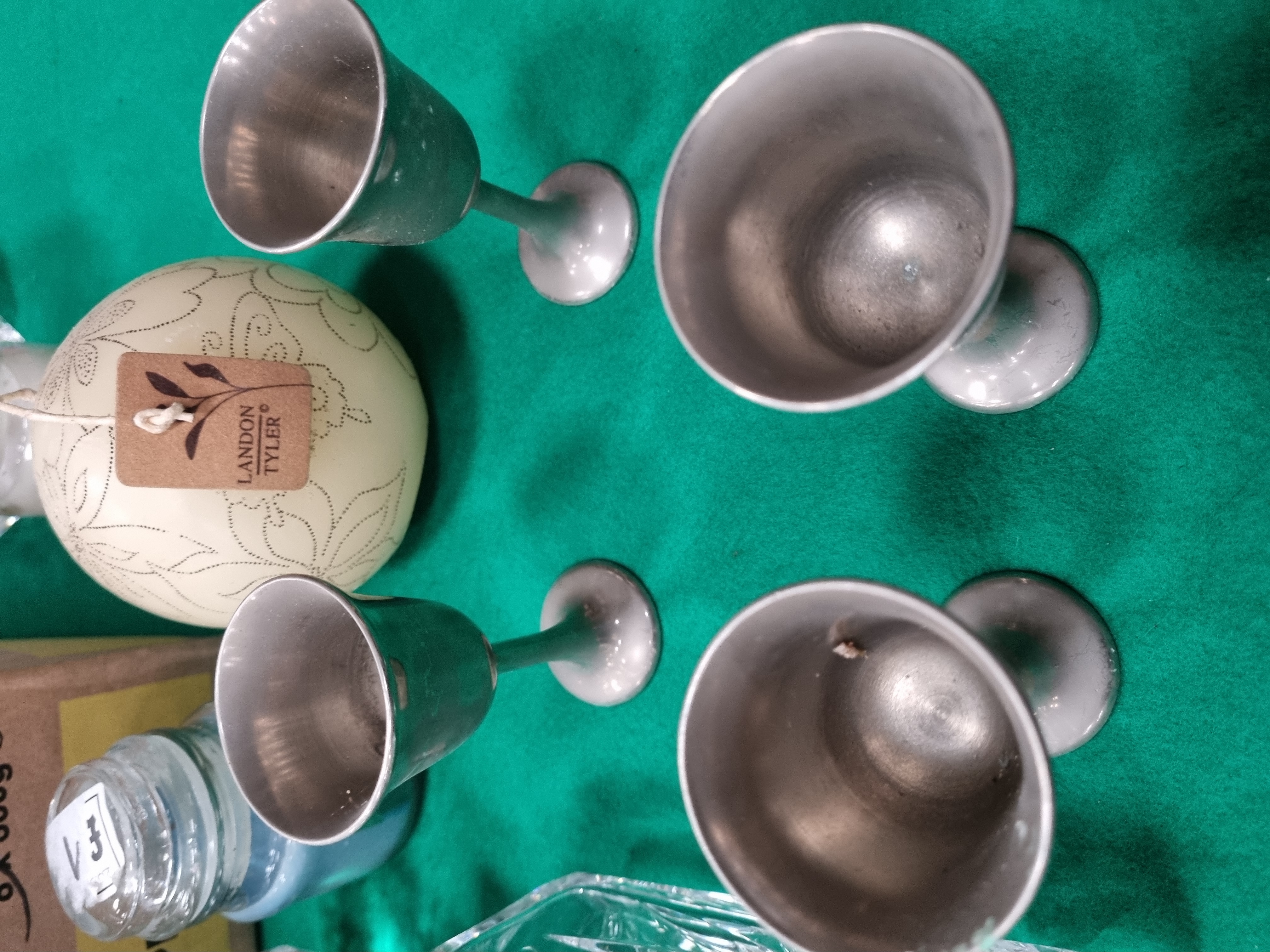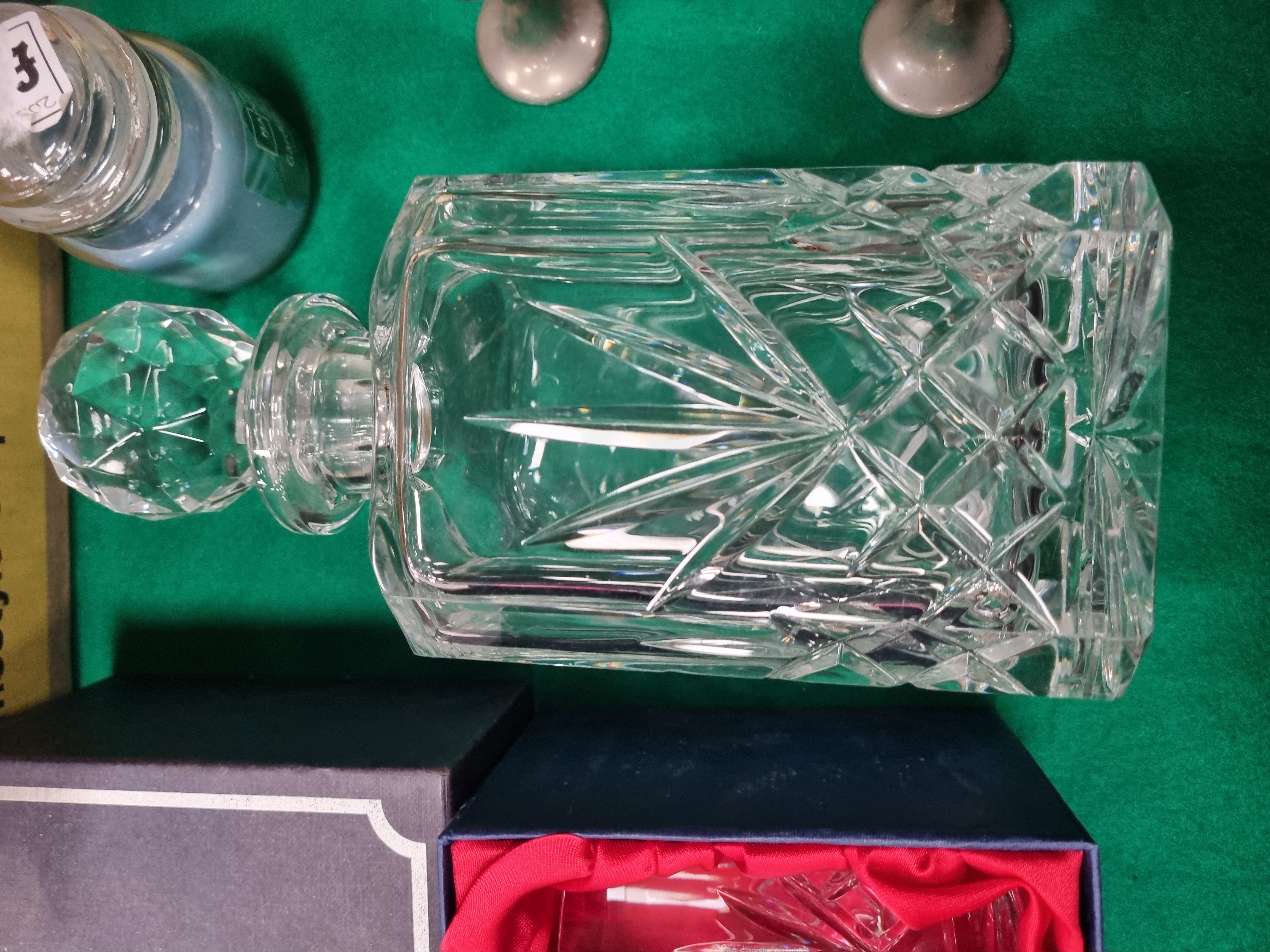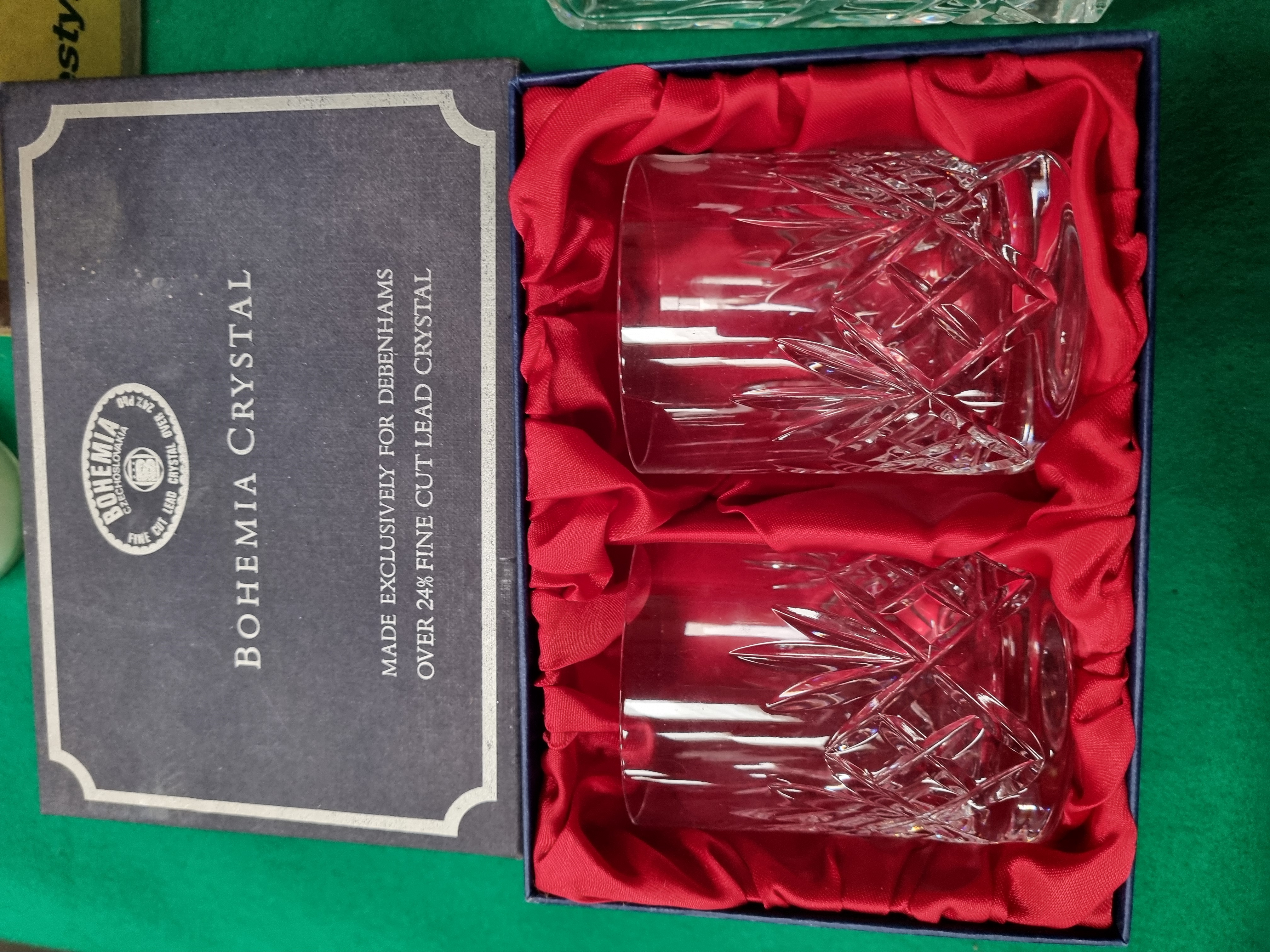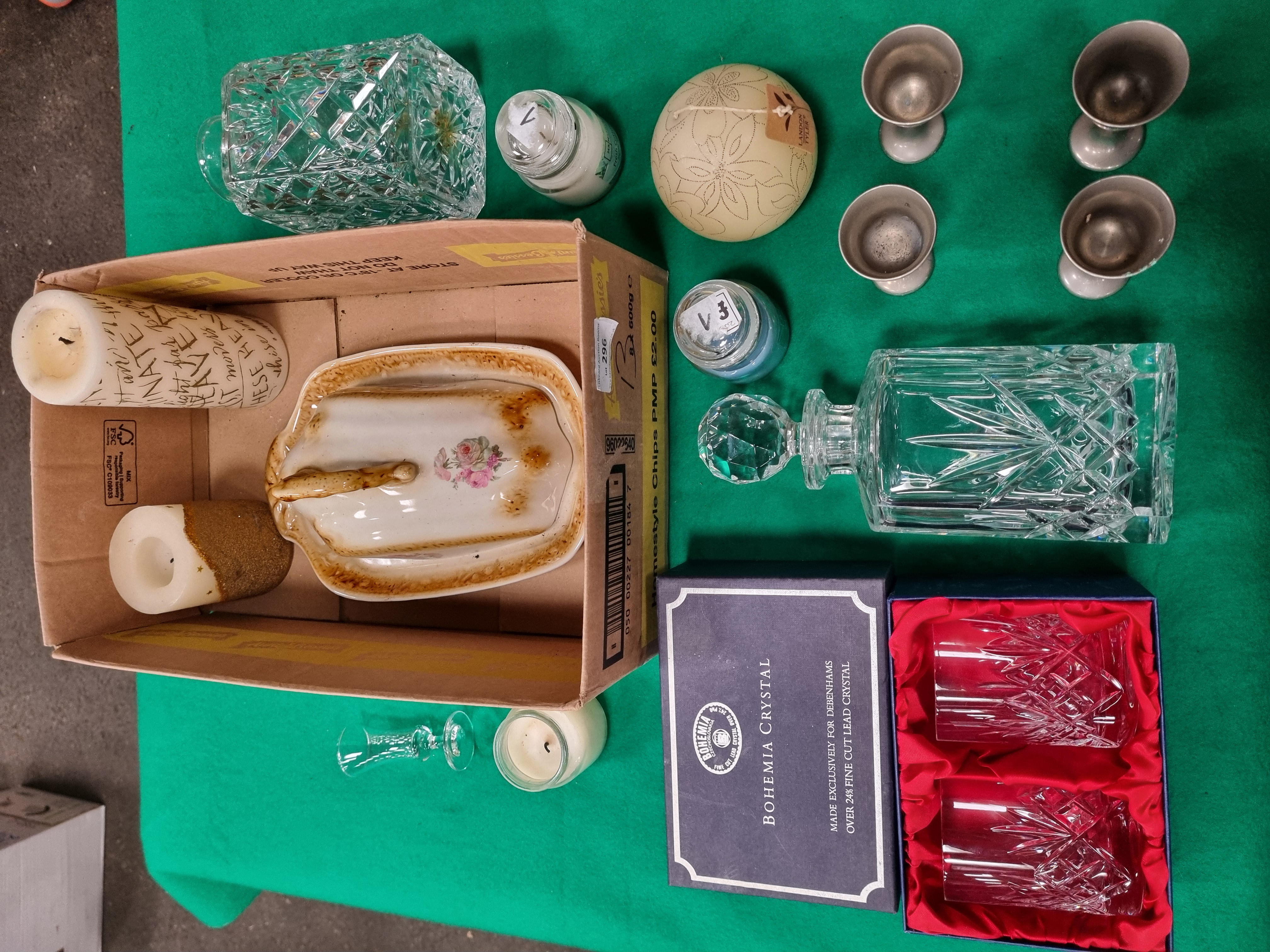 A mixed collection of glassware, ceramics, and decorative items. The lead crystal includes a boxed pair of tumblers by Bohemia Crystal, made exclusively for Debenhams, featuring a deep-cut pattern of diamonds and starbursts. The box bears the Bohemia Czechoslovakia seal and specifies over 24 per cent PbO lead crystal. Also included is a square-bodied crystal spirit decanter with a multifaceted stopper, decorated with cross-hatched diamond and fan motifs. Further glassware consists of a heavy square-form cut glass vessel with a bold diamond pattern and a single small cordial glass with a faceted stem. The ceramic component features a rectangular covered dish with a transfer-printed floral rose motif and a mottled brown decorative border. The metalware includes a set of four small stemmed goblets with a matte grey finish in the style of pewter. The lot is completed by an assortment of decorative candles, including a large cream-coloured spherical candle by Landon Tyler with etched floral patterns, a pillar candle featuring cursive script text, and various smaller candles.