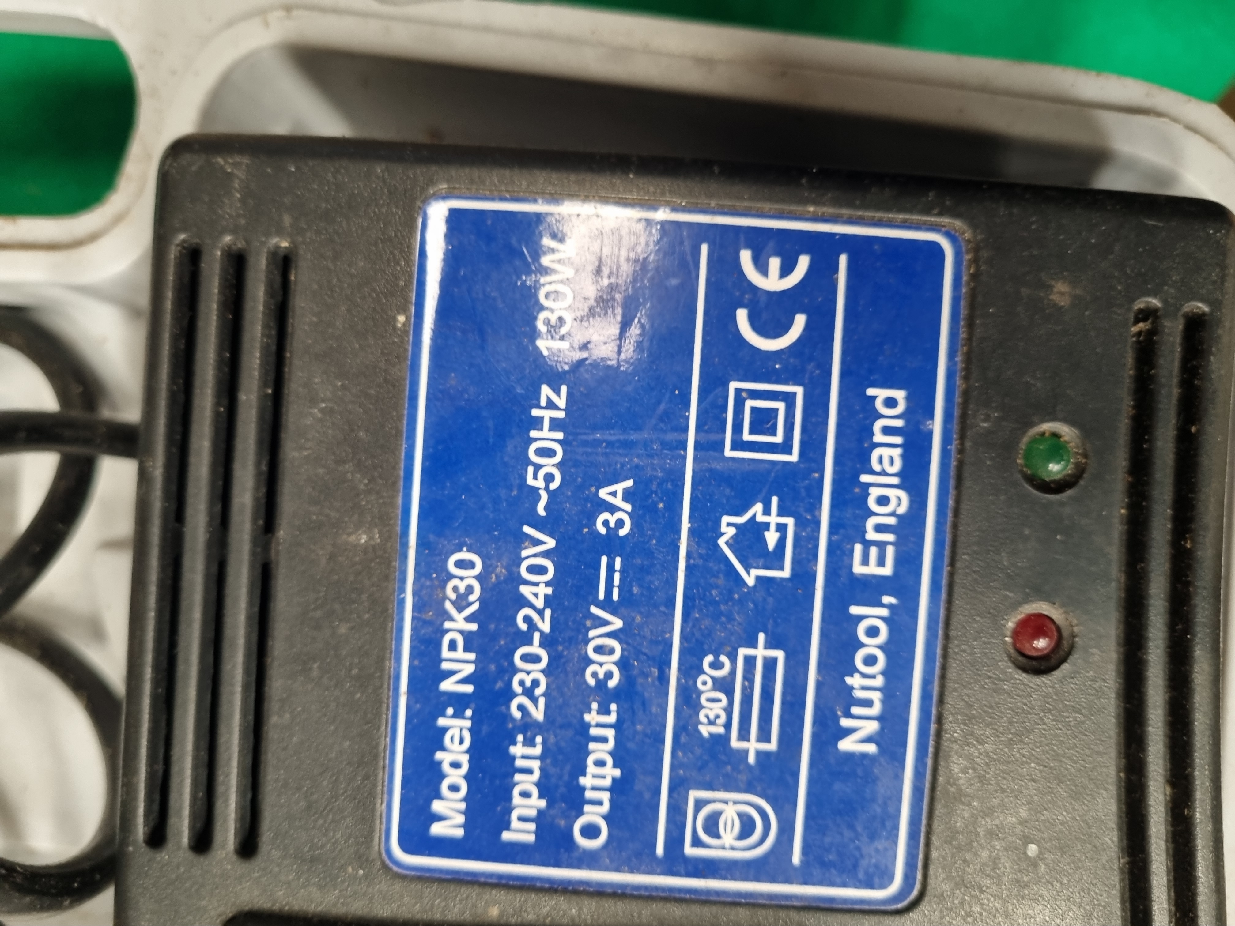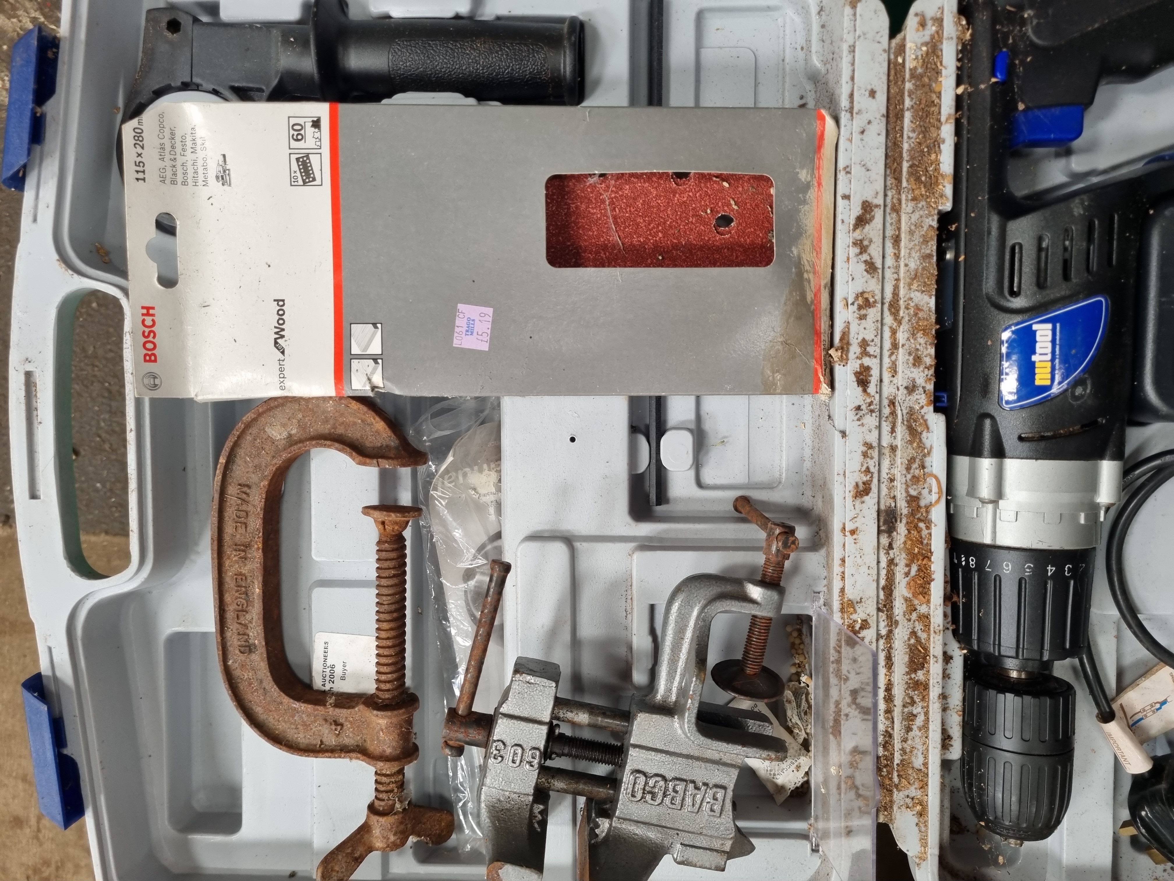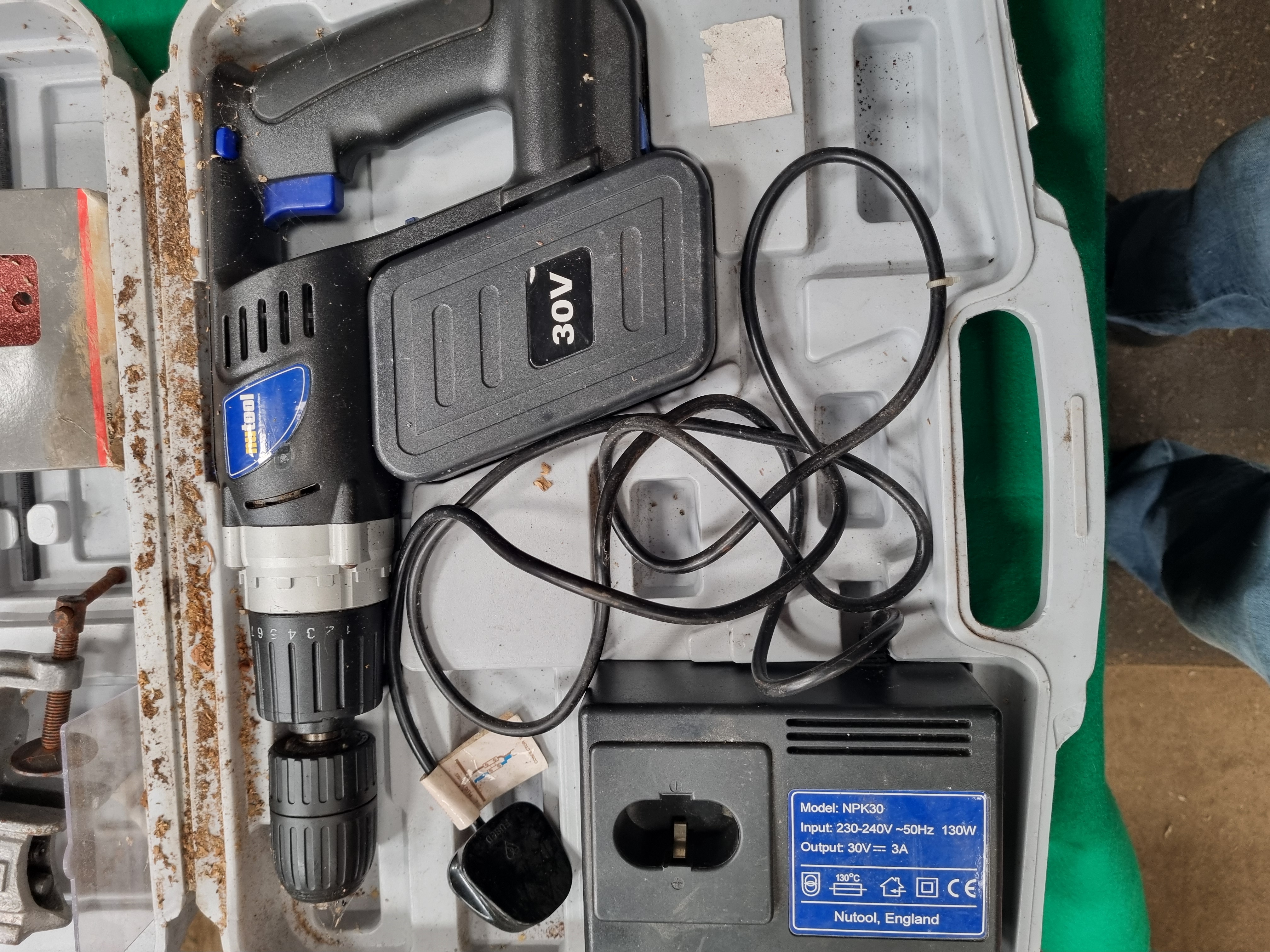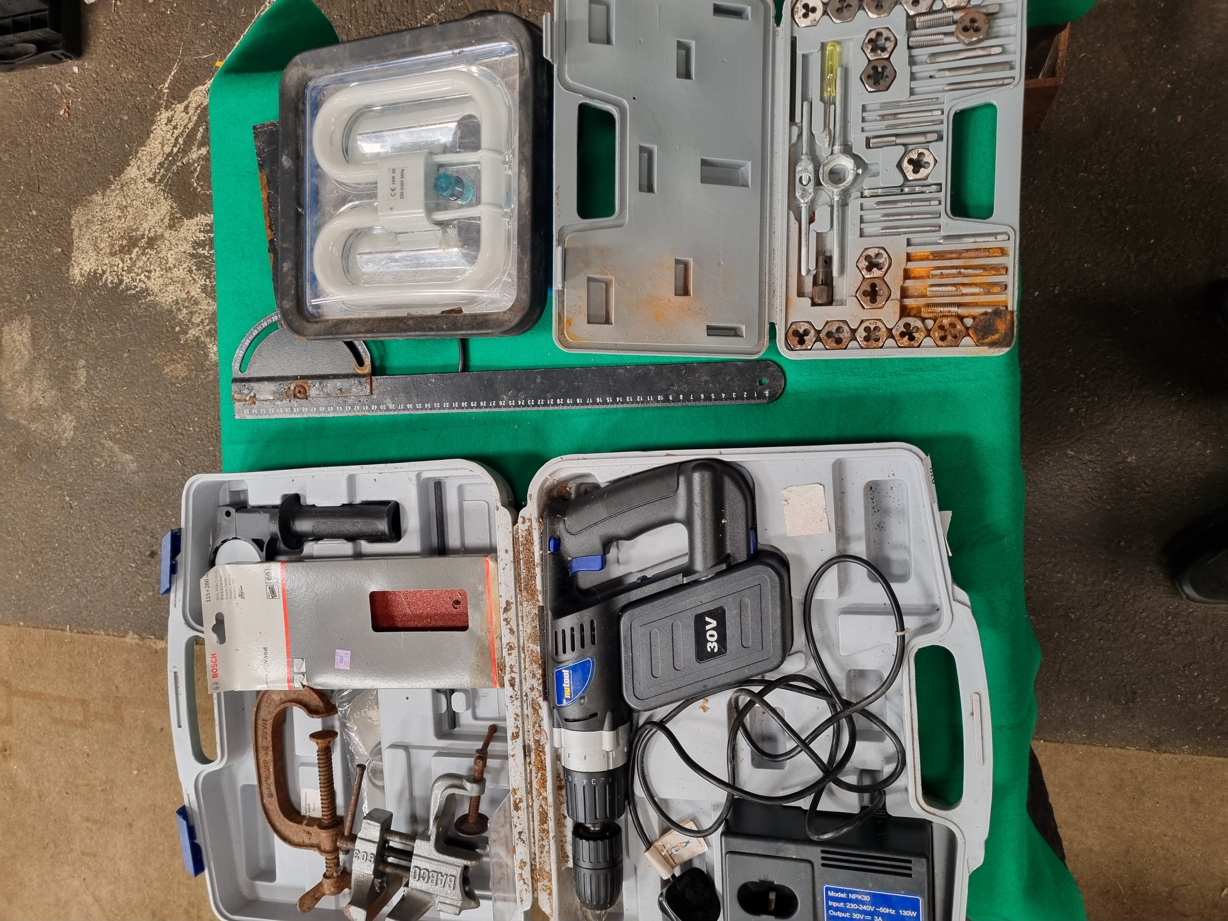 This collection of workshop equipment features a Nutool cordless drill and driver with a 30V battery and a dedicated charging station. The charging station is marked Model NPK30 and Nutool, England. The drill is constructed with a plastic housing and metal chuck, housed in a fitted grey plastic carry case. The lot includes a metric and imperial tap and die set containing various taps, dies, two tap wrenches, and a die stock, presented in a grey plastic case. Clamping tools include a heavy duty cast iron C-clamp marked MADE IN ENGLAND, a portable bench vice marked BABCO 809, and an additional lightweight adjustable clamp. A large metal protractor with an integrated rule is included, with the head graduated 0 to 90 degrees and the arm marked 0 to 55 cm. Also present is a partial pack of Bosch Expert for Wood sanding sheets and a portable fluorescent work light fitted with a 38W 2D bulb.