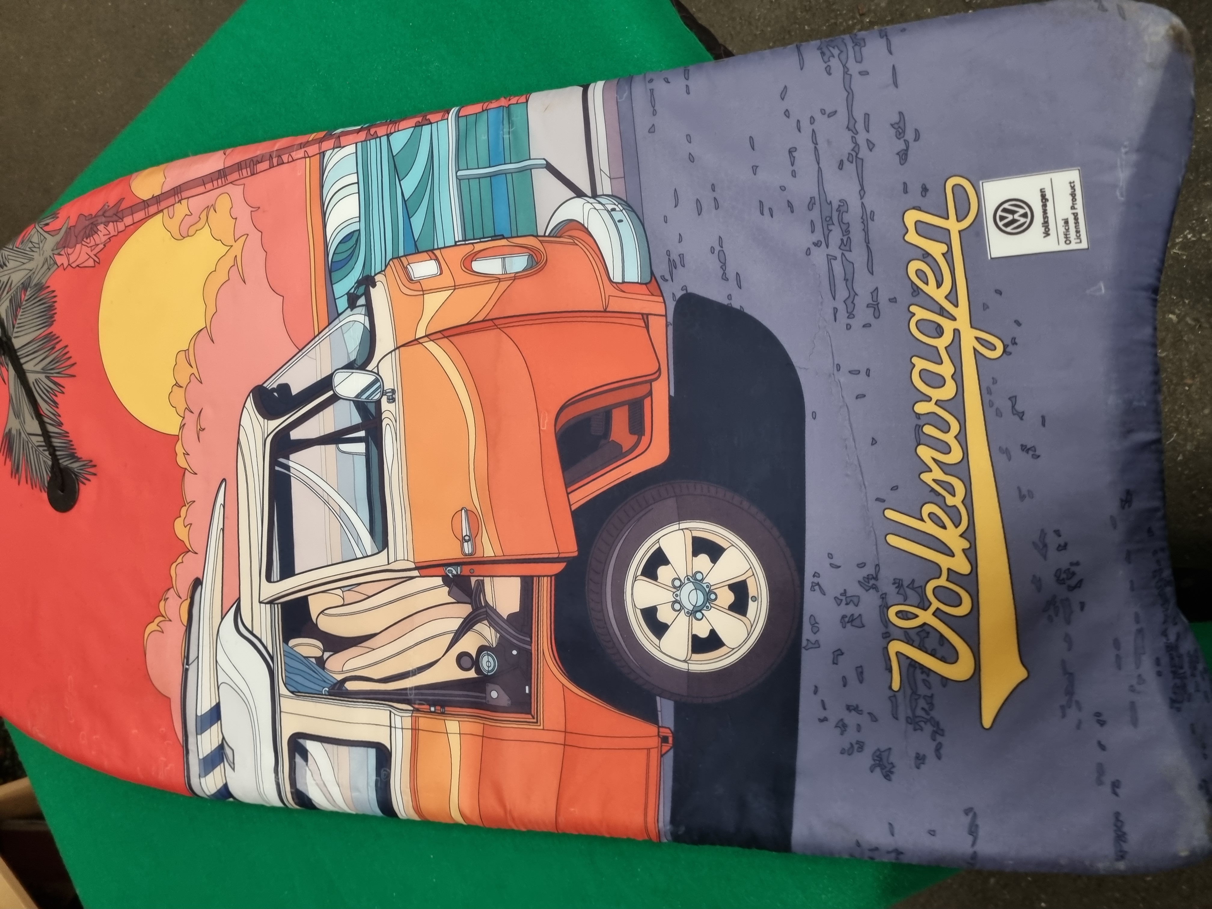 A collection of four foam bodyboards featuring various graphic designs and brandings. The group includes a light blue board bearing the Saltrock Surf Co. logo, an officially licensed Volkswagen product depicting a camper van against a beach sunset, a board with a printed underwater scene featuring sharks and marine life, and a black Tribal Board with orange and grey flame-style graphics. The boards are constructed from lightweight foam materials, likely EPS cores, typical of recreational bodyboards. One board is fitted with a black cord wrist leash. Accompanying the boards is a large tub containing crabbing lines and fishing nets.