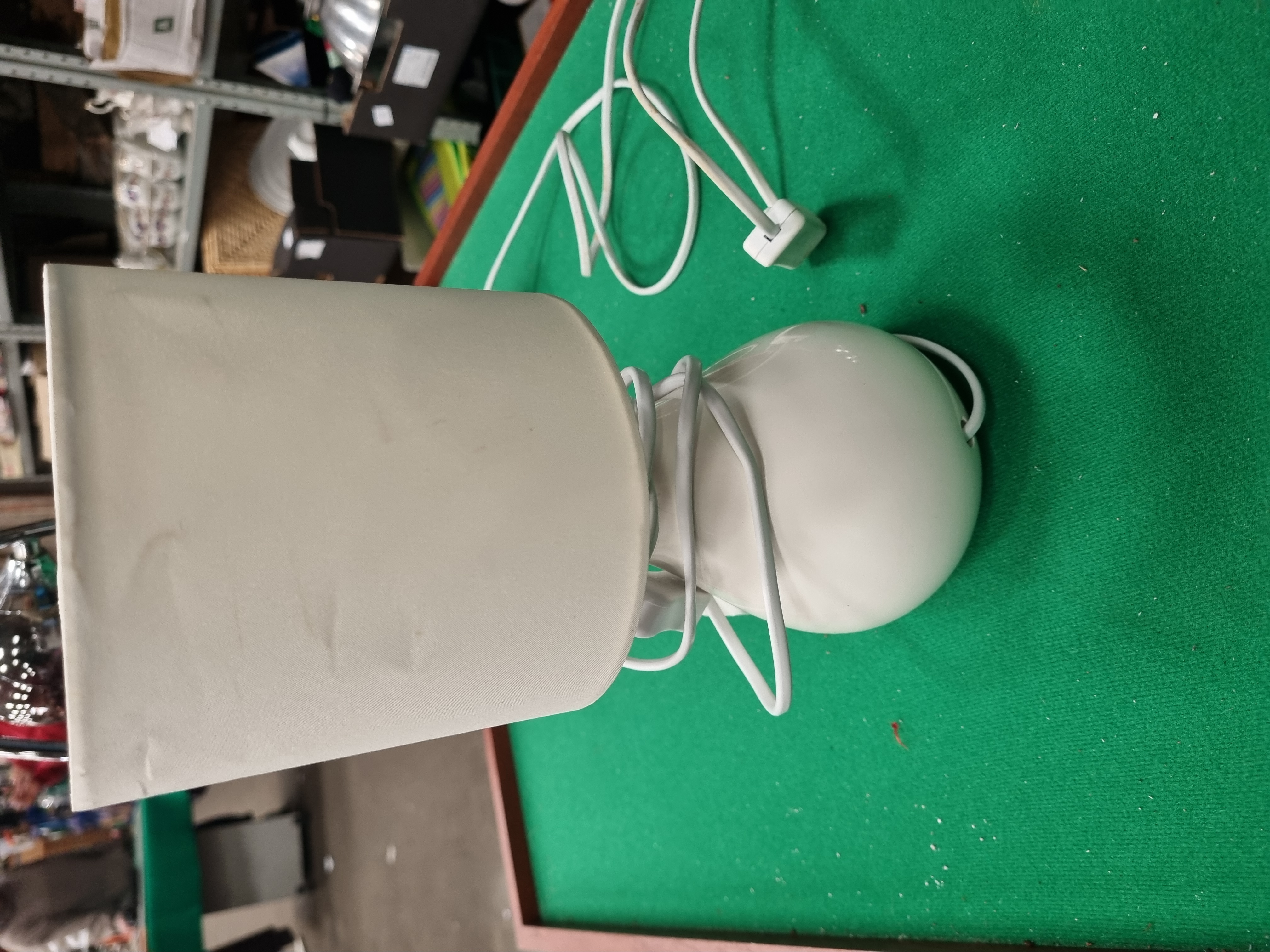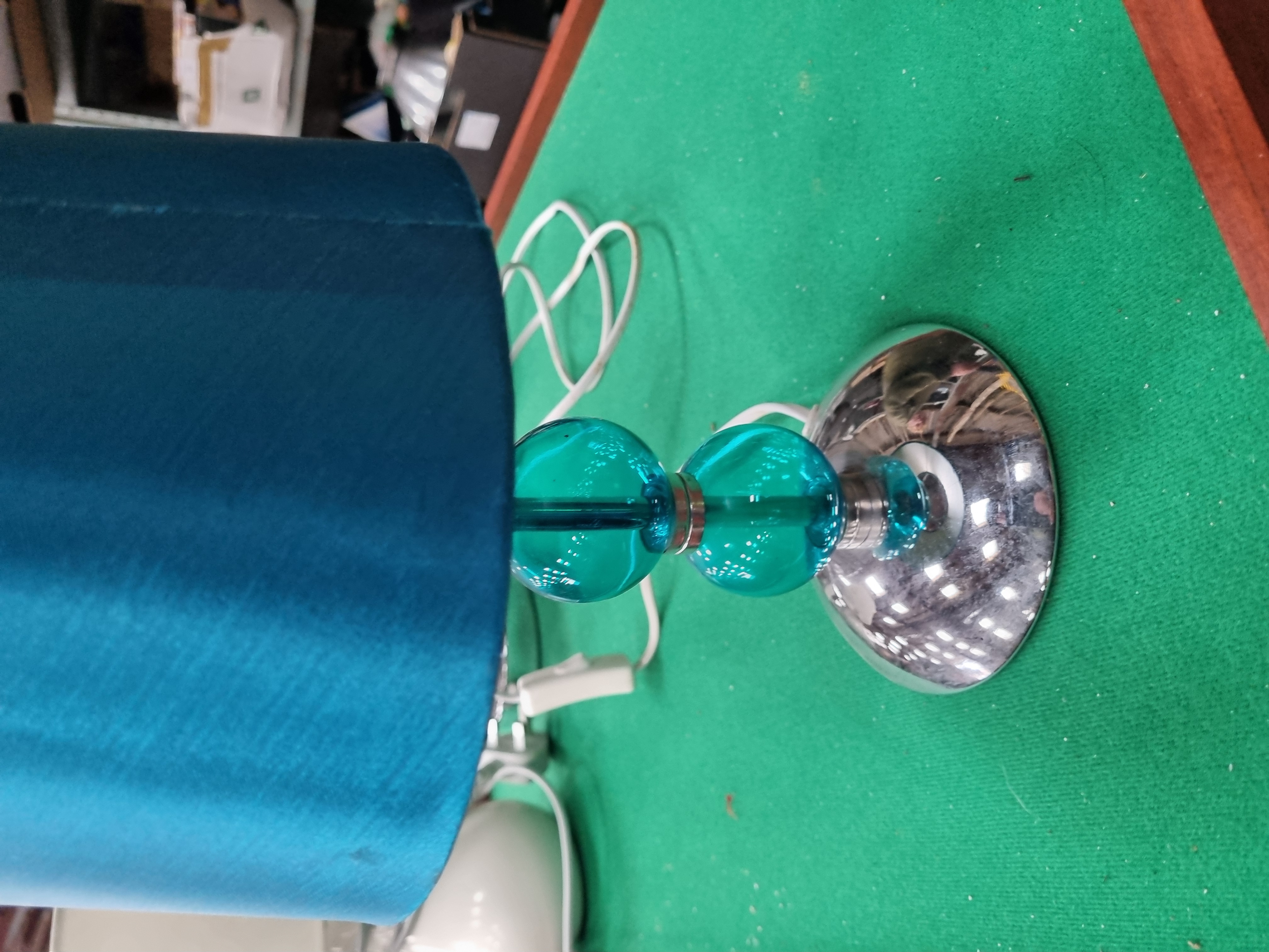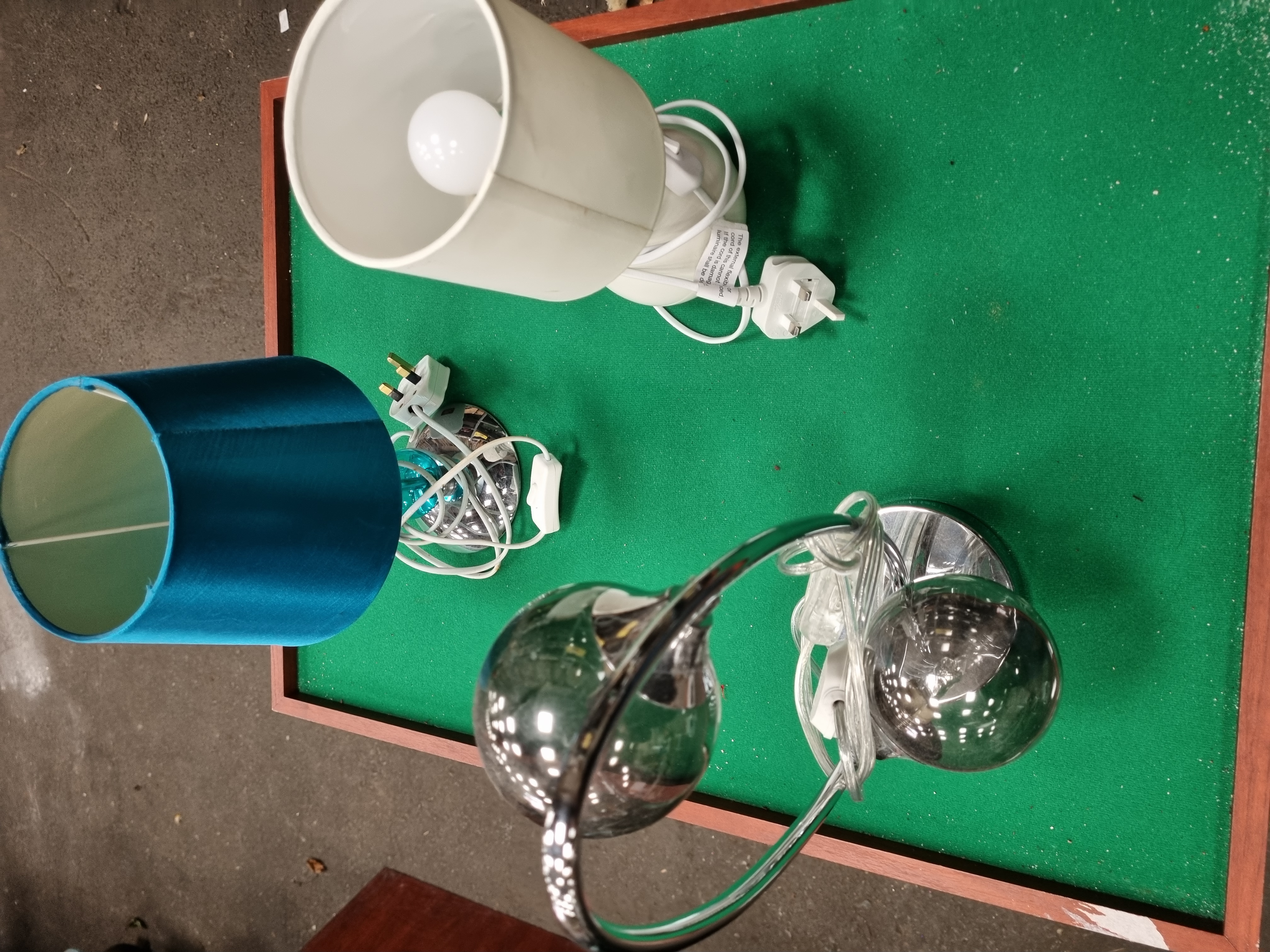 A trio of contemporary table lamps of varying designs. The first lamp features a polished chrome-finish domed metal base with a stem decorated with two transparent teal-coloured spherical ornaments, topped with a cylindrical teal fabric shade. The second lamp comprises a white glazed ceramic base of bulbous, egg-like form with a tapered white fabric shade. The third lamp is designed in the mid-century modern atomic style, featuring a polished chrome circular base with a single arched support arm suspending a clear glass spherical globe shade. All lamps are fitted with standard UK 3-pin plugs and in-line rocker switches. No maker’s marks are visible on the bases or bodies.