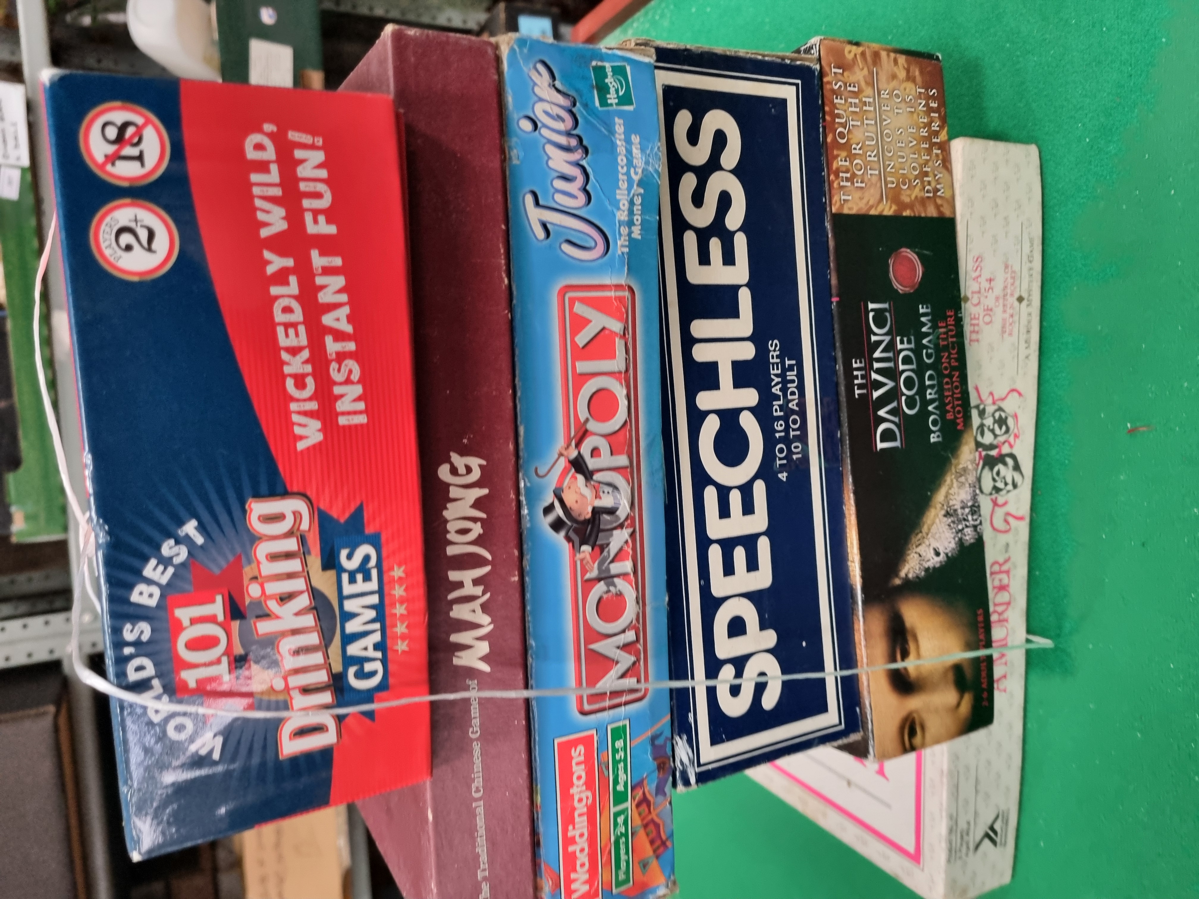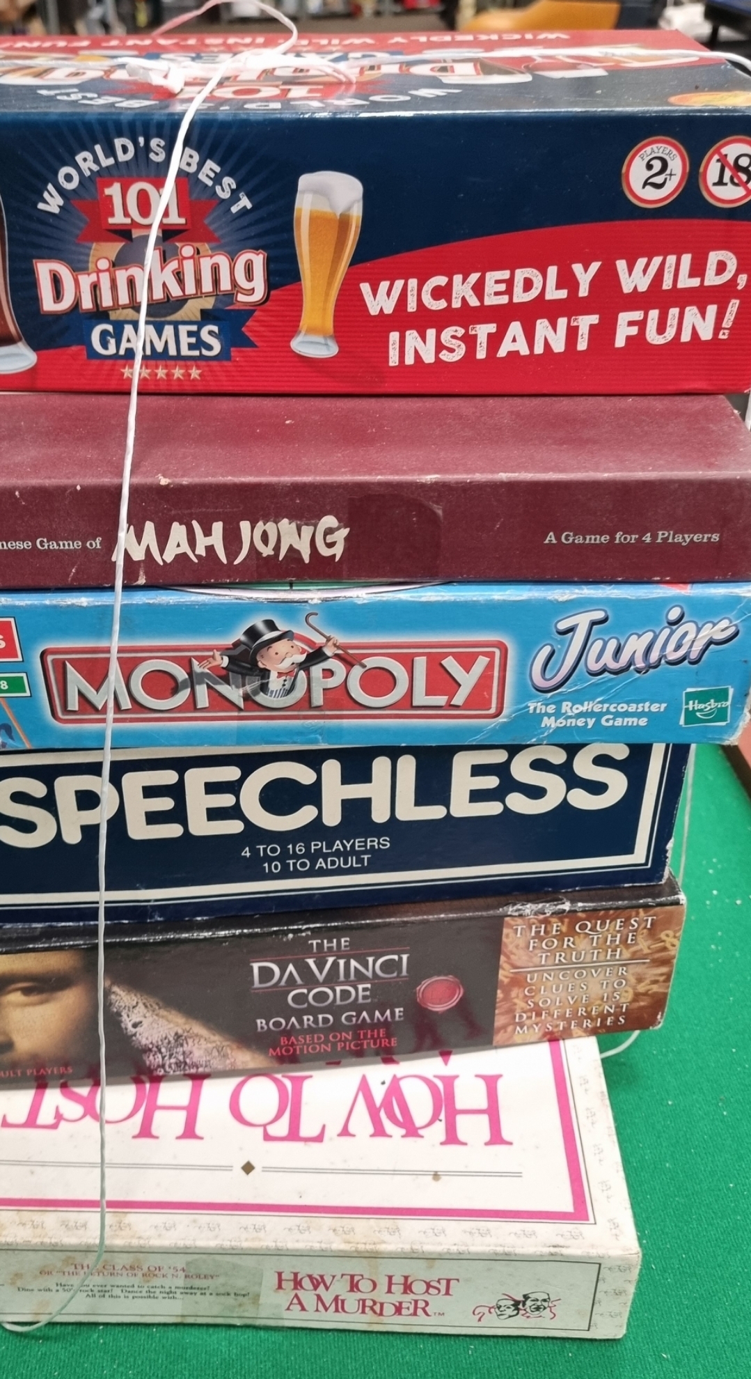 A collection of six contemporary board and party games in original retail boxes. The assortment includes 101 Drinking Games by Cheatwell Games, an 18 plus rated party game; a boxed set of The Traditional Chinese Game of Mah Jong in a maroon finish; Monopoly Junior The Rollercoaster Money Game, featuring Waddingtons and Hasbro branding; Speechless, a party game for four to sixteen players; The Da Vinci Code Board Game, based on the motion picture; and How To Host A Murder, The Class of 54 or The Return of Rock N. Roley edition, marked Product No. 40. The items are constructed from printed cardboard and paper.