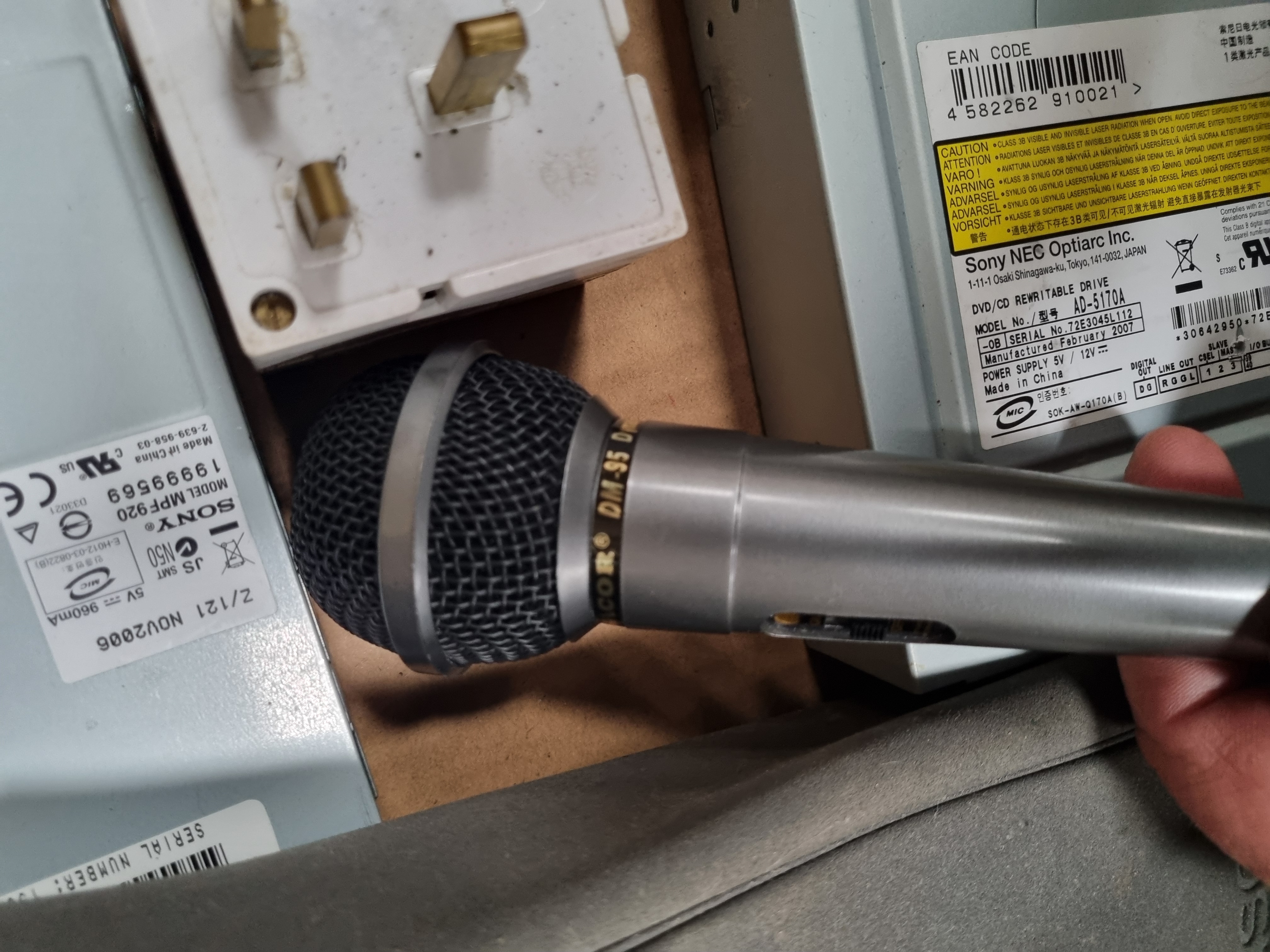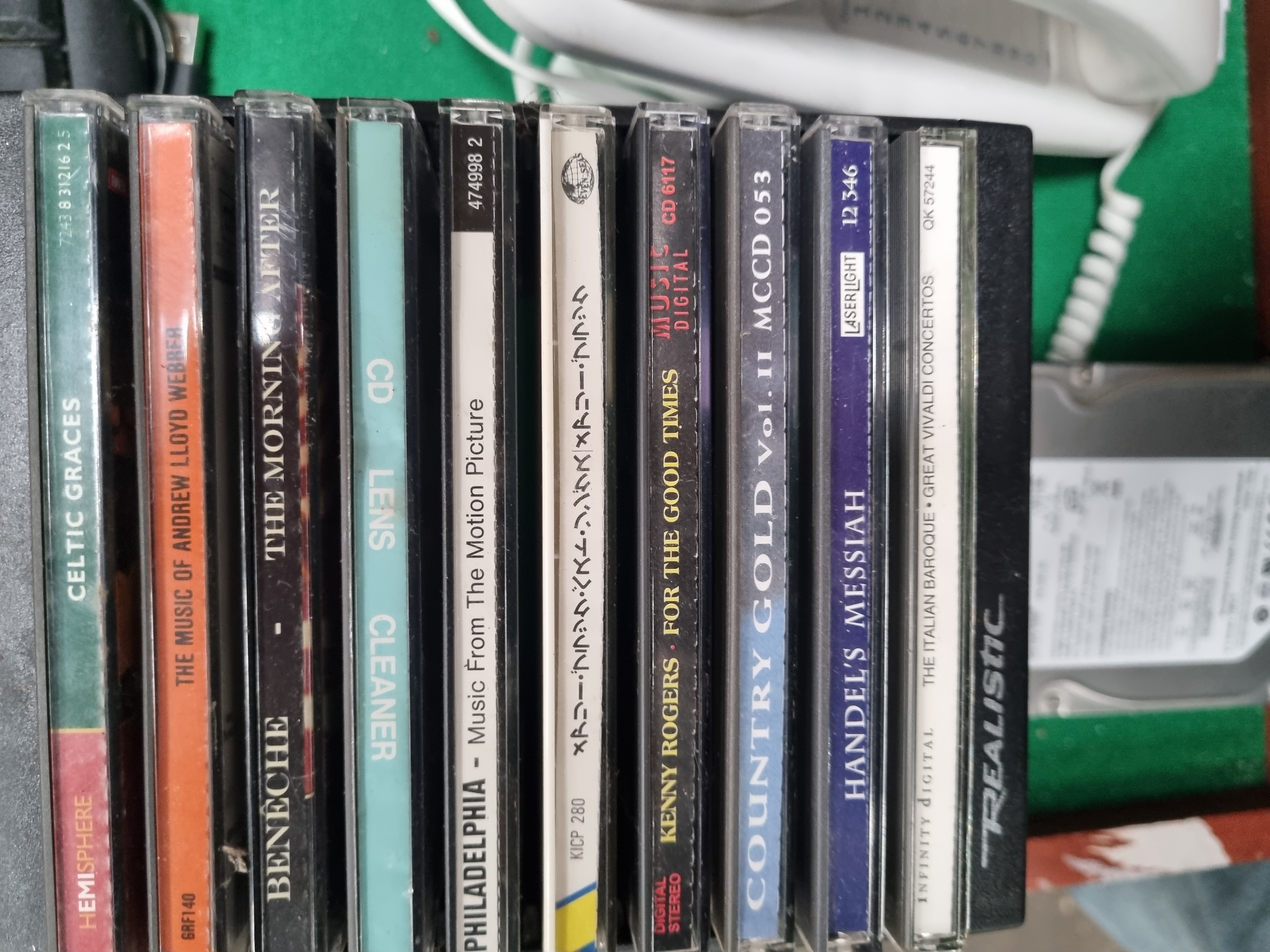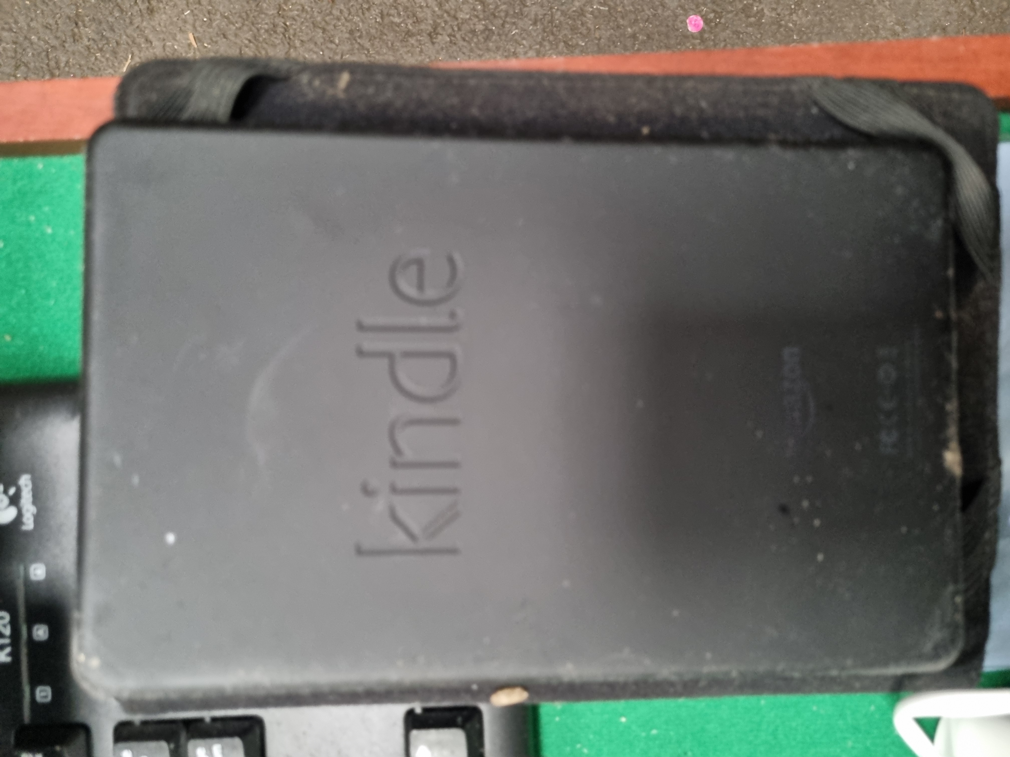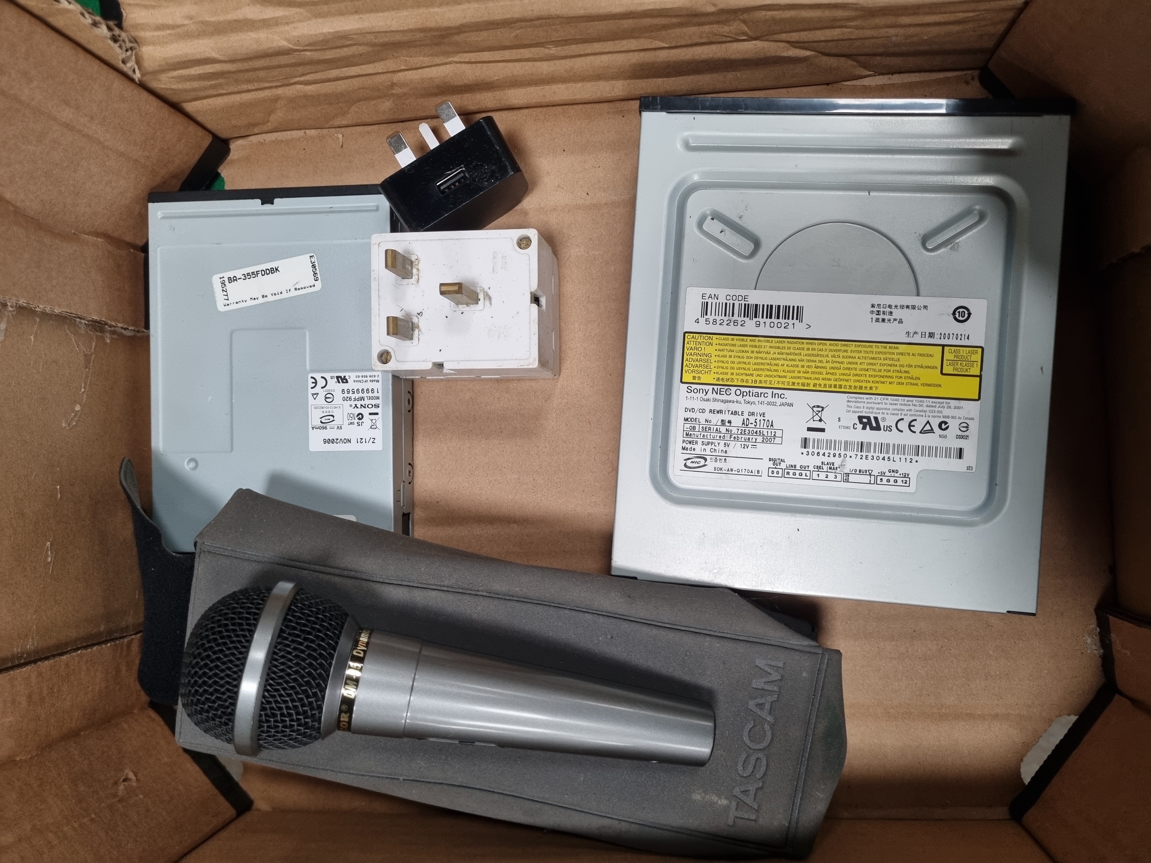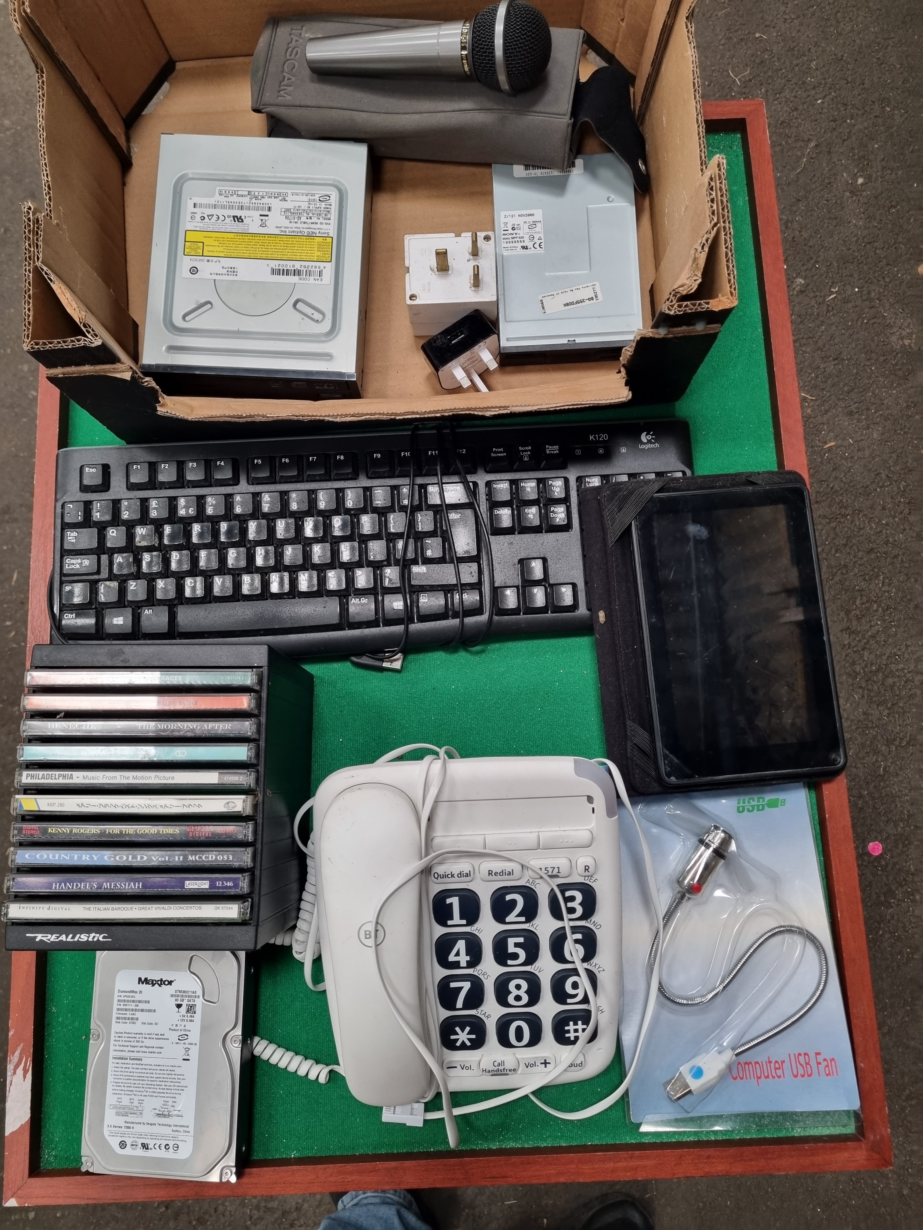 An assortment of consumer electronics and computing components. The lot includes an early-generation Amazon Kindle e-reader housed in a black fabric protective case. Computing peripherals comprise a Logitech K120 wired USB keyboard and a flexible silver-toned USB-powered fan in original packaging. Internal hardware includes a Sony NEC Optiarc DVD/CD rewritable drive, model AD-5170A, manufactured February 2007, serial number 72E3045L112; a Sony floppy disk drive, model MPF920, serial number 6999666 I; and a Maxtor DiamondMax 10 160GB PATA133 internal hard disk drive, serial number L40N3W1H. Communication equipment features a BT Big Button corded telephone designed for accessibility with large numerical keys and a help button. Audio equipment includes a KOR DM-95 dynamic handheld microphone with a Tascam branded padded storage bag. Media storage consists of a Realistic branded black plastic CD rack containing ten compact discs with various titles including Celtic Graces, The Music of Andrew Lloyd Webber, Beneche – The Morning After, Philadelphia – Music From The Motion Picture, Kenny Rogers – For The Good Times, Country Gold Vol. II, Handel’s Messiah, and The Italian Baroque – Great Vivaldi Concertos. Two UK 3-pin power adapters are also included.