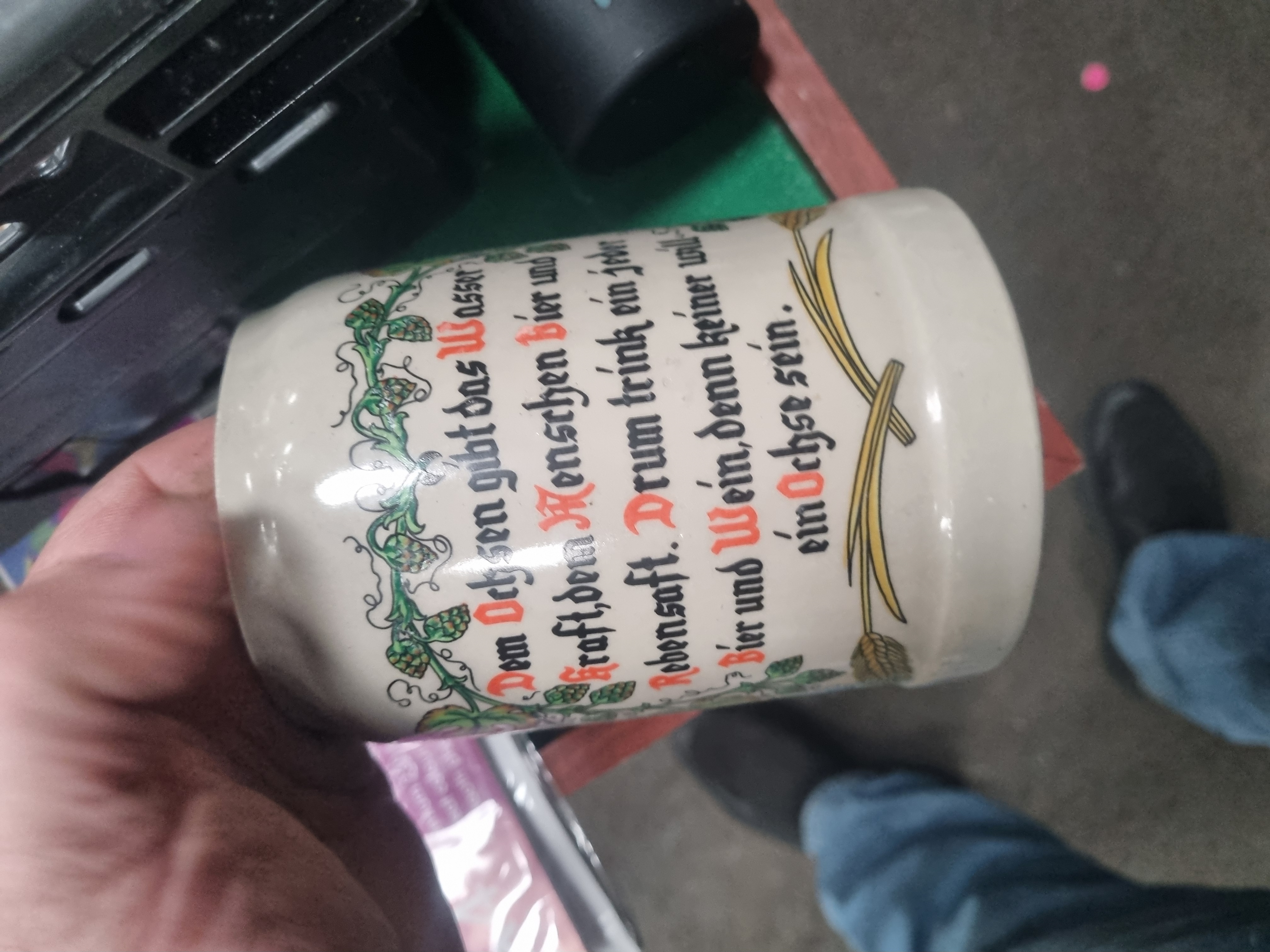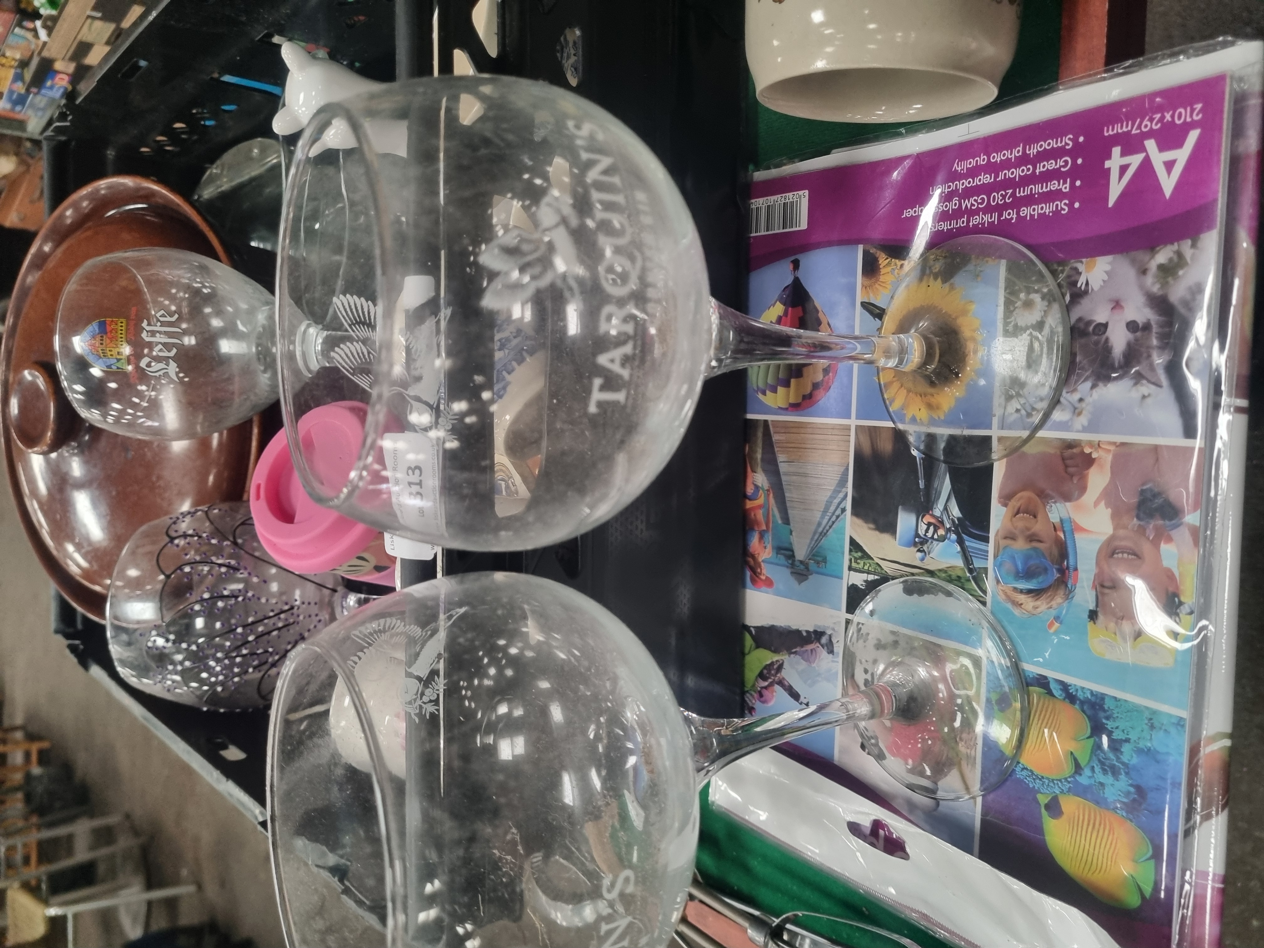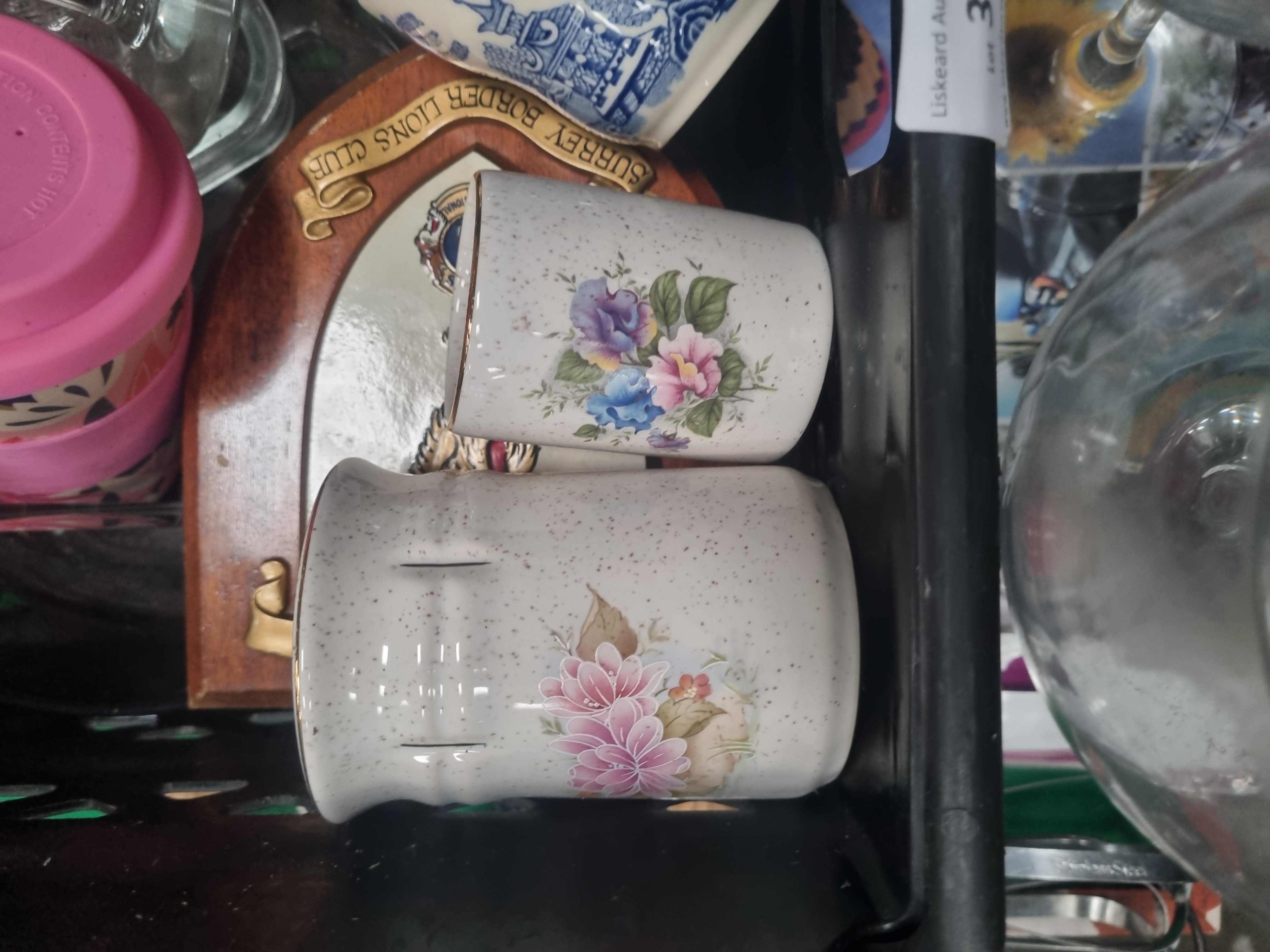 A collection of household ceramics, glassware, and decorative items. The lot includes two Kernewek Pottery stoneware jars featuring cream speckled glazes and transfer-printed floral designs in pink, blue, and purple. One jar bears a brown printed mark to the base for Kernewek, Goonhavern, Cornwall, featuring a heraldic crest with the motto One and All. The collection also features a large circular lidded casserole dish with a deep brown ferruginous glaze and a cream stoneware beer stein decorated with German Fraktur script and transfer-printed hops and barley motifs. Further ceramics include a blue and white transfer-printed mug with bird and floral designs, two plain cream-glazed cups, and a small white ceramic animal figurine. The glassware section contains two Tarquin’s Gin Copa de Balon glasses with etched logos, a Leffe beer chalice with a polychrome crest, a stemmed glass with hand-painted purple and white dot-and-line patterns, and various clear glass bowls and dishes. Miscellaneous items include a shield-shaped wooden commemorative plaque for the Surrey Border Lions Club with an enamelled emblem and an unopened pack of A4 230 GSM gloss inkjet photo paper.