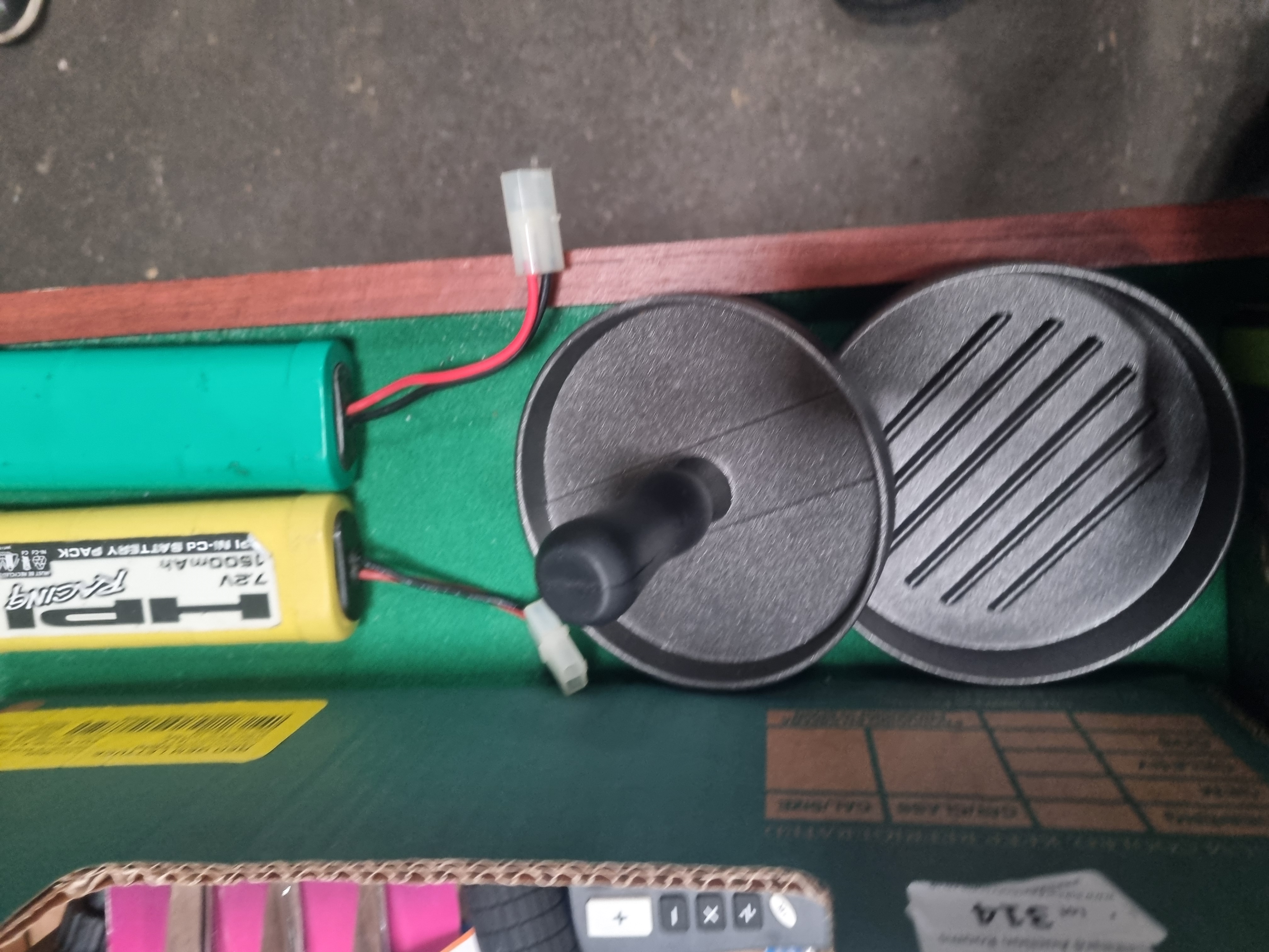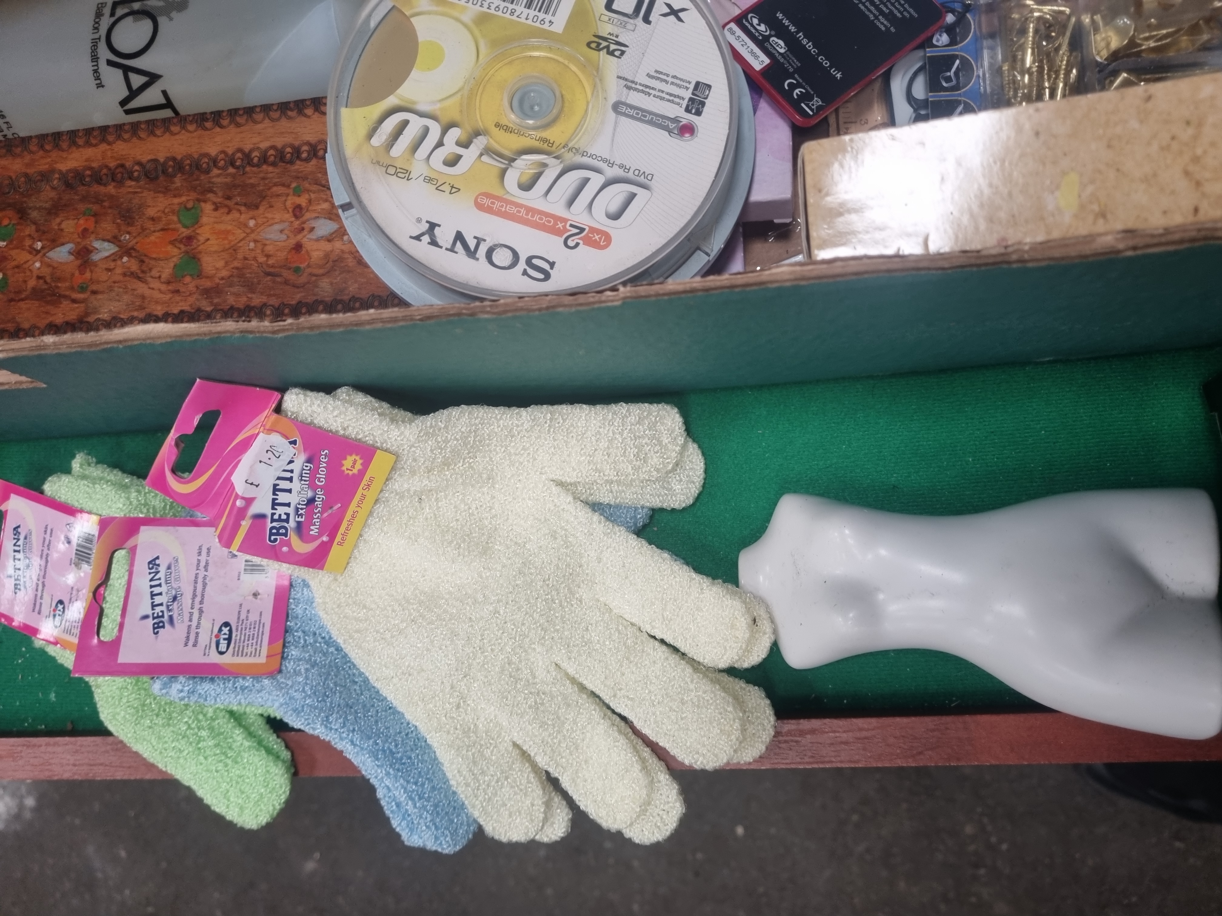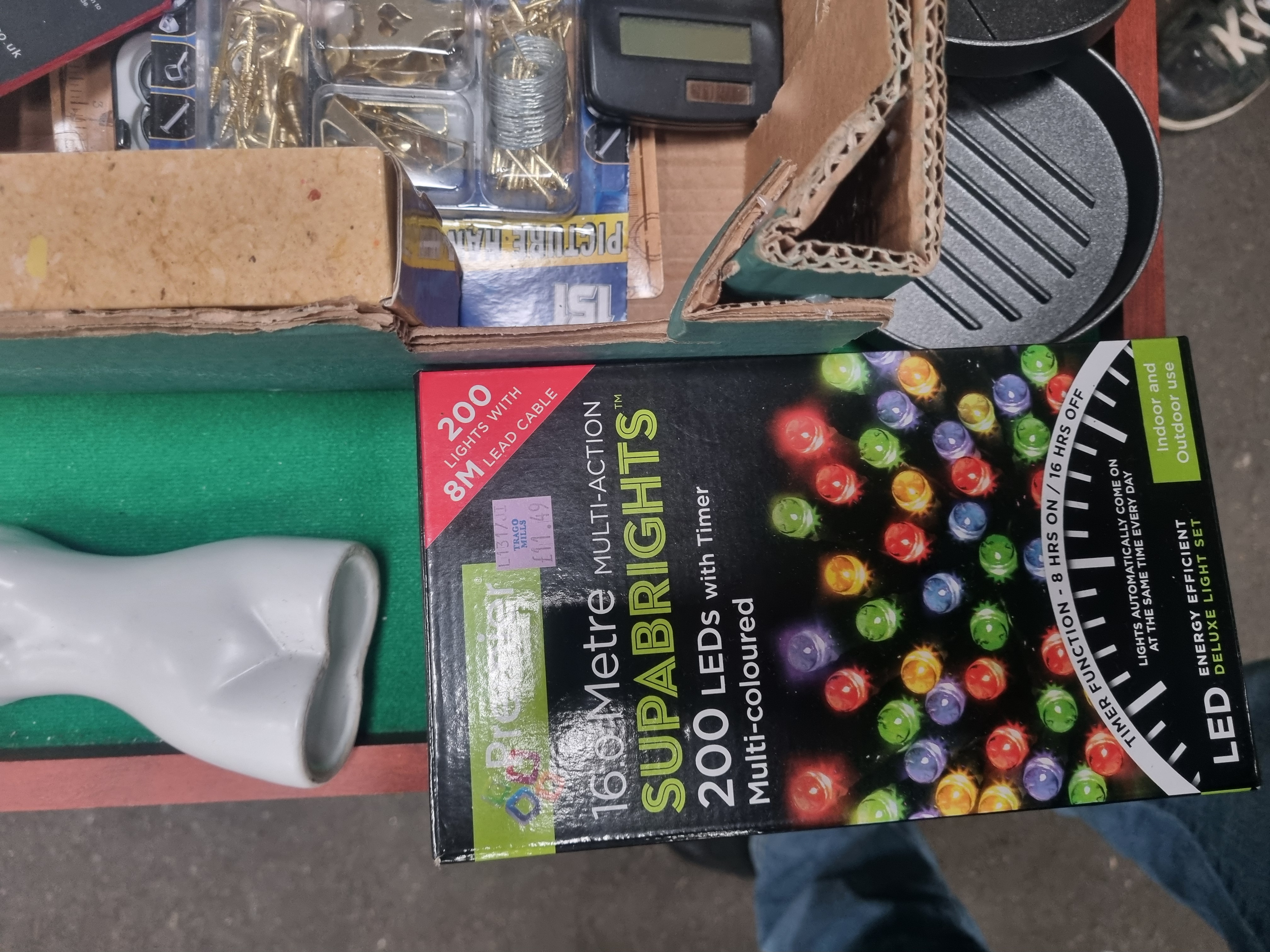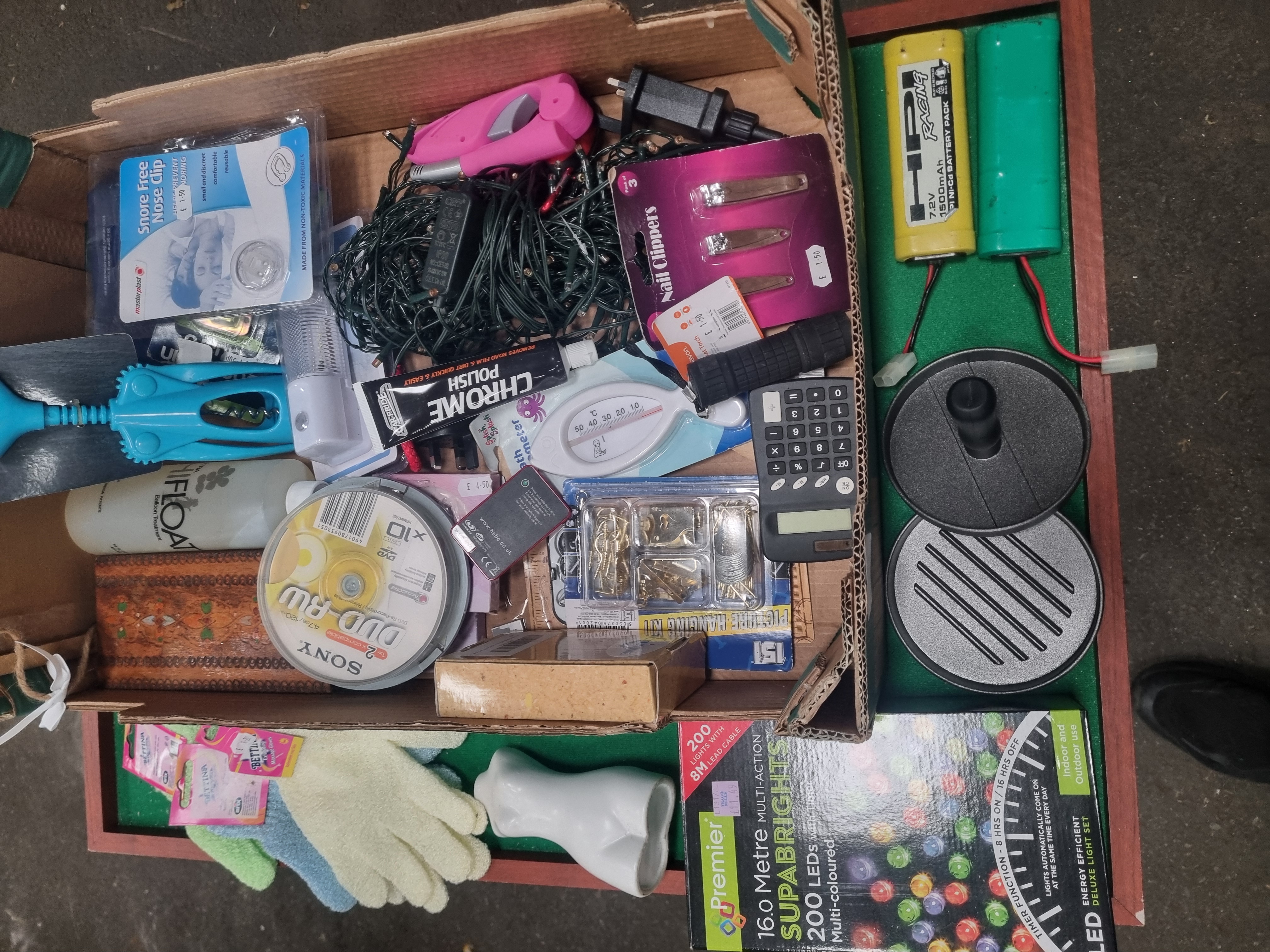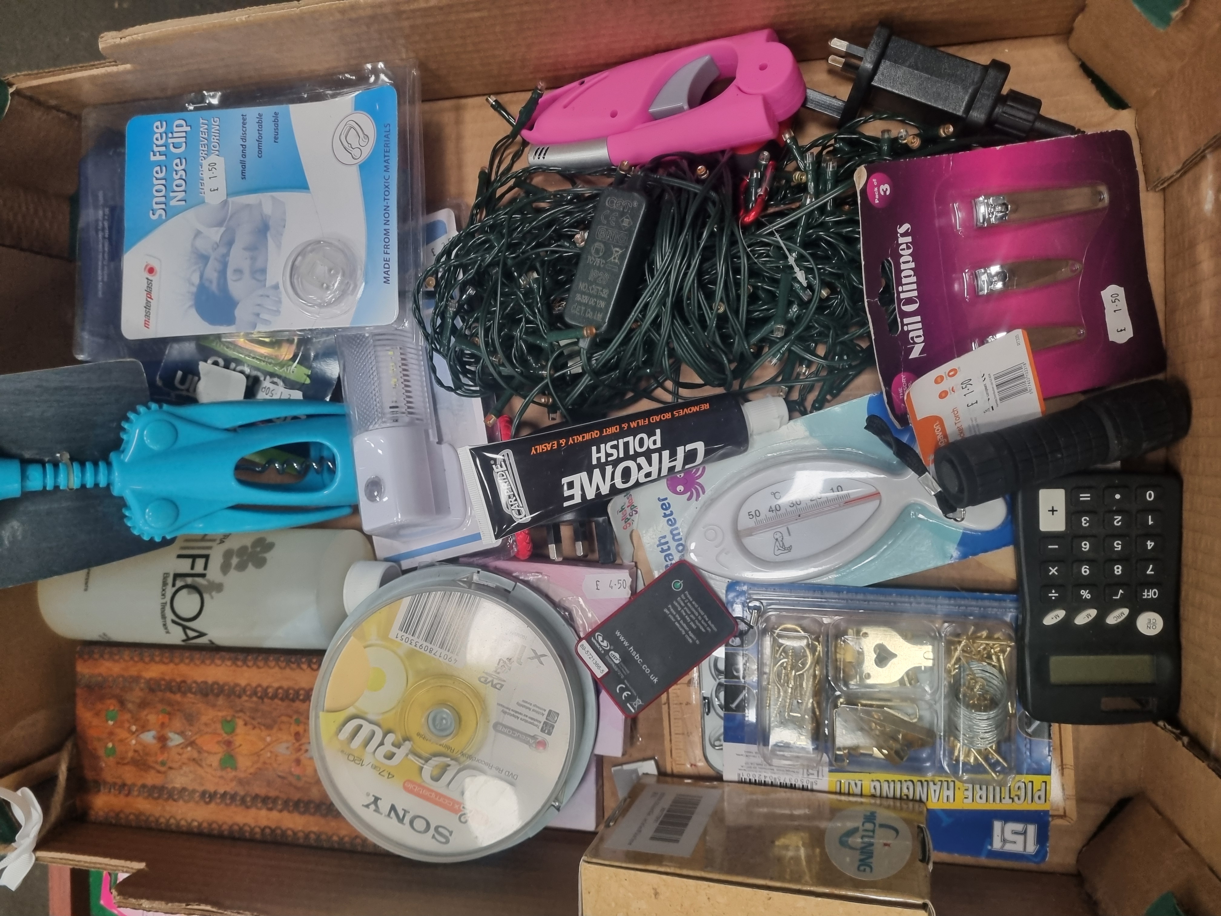 An assortment of consumer goods and household items across various categories. Electronics and power components include a Sony DVD-RW spindle pack, a boxed set of Premier Supabrights 200 multi-action LEDs (16.0 metres), a tangled set of loose green fairy lights with a control box marked C.E.T. Co. Ltd, and two 7.2V Ni-Cd rechargeable battery packs including one yellow HPI Racing 1500mAh unit and one unmarked green unit. Further electronic items include an HSBC digital secure key, a black handheld calculator, and a white LED plug-in sensor light. Hardware and utility items comprise a 151 brand Picture Hanging Kit in a blister pack, a tube of Car Pride Chrome Polish, a pink-cased glue gun or long-reach lighter, a blue plastic multi-tool, and a cast iron burger press with a ridged base and handled press. Personal care and household products include Masterplast Snore Free Nose Clips, a retail pack of three metal nail clippers, multiple pairs of Bettina exfoliating massage gloves in various colours, a bottle of Hi-Float balloon treatment, and a white fish-shaped bath thermometer. Decorative and miscellaneous pieces include an oblong wooden box featuring an inlaid pattern on the lid and a small white ceramic sculptural piece in the form of a stylized human torso.