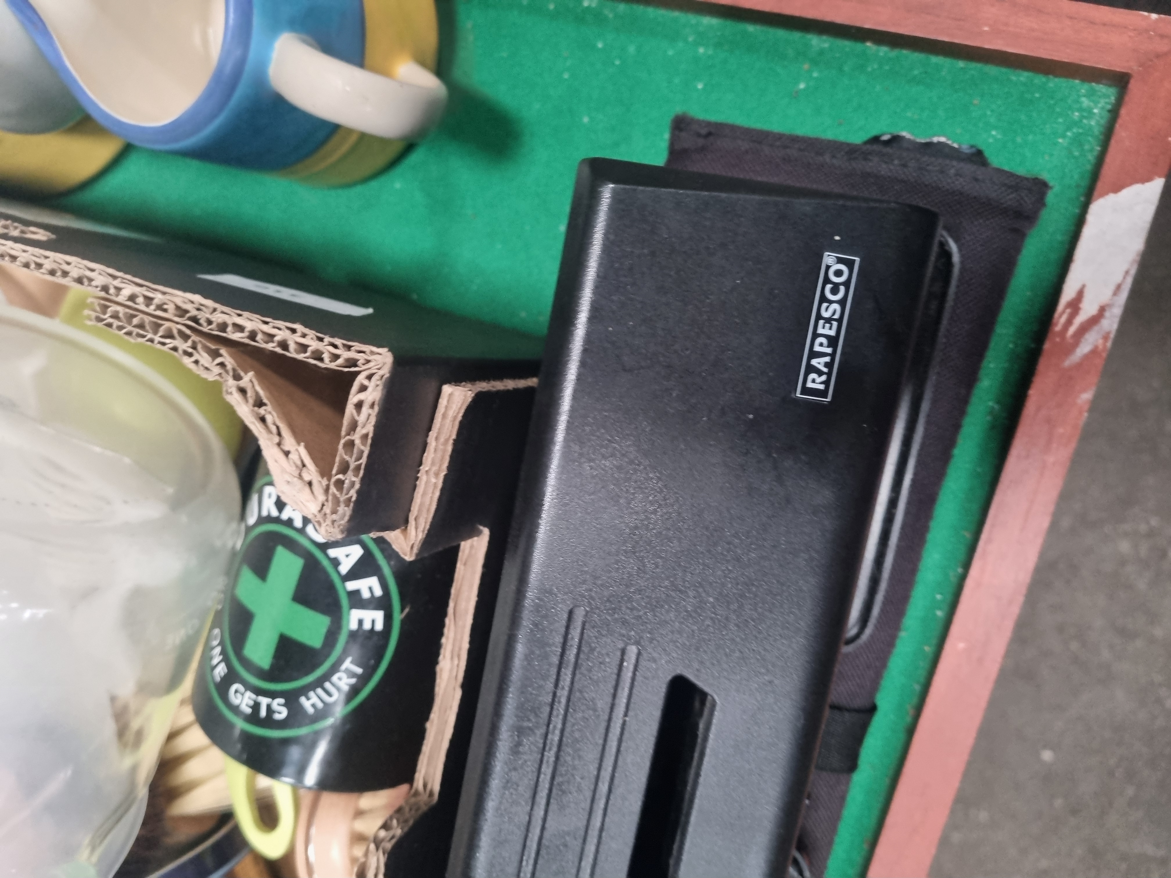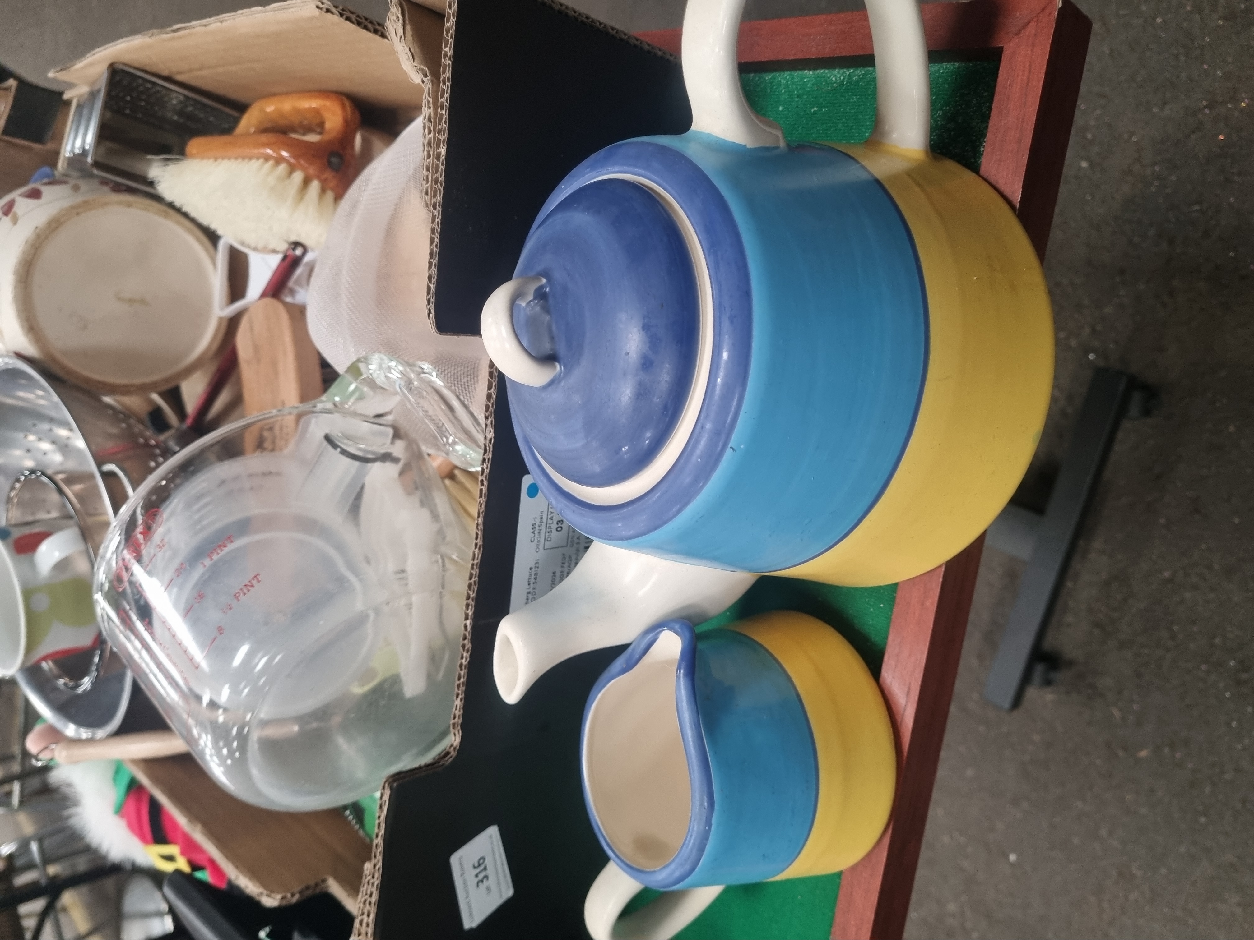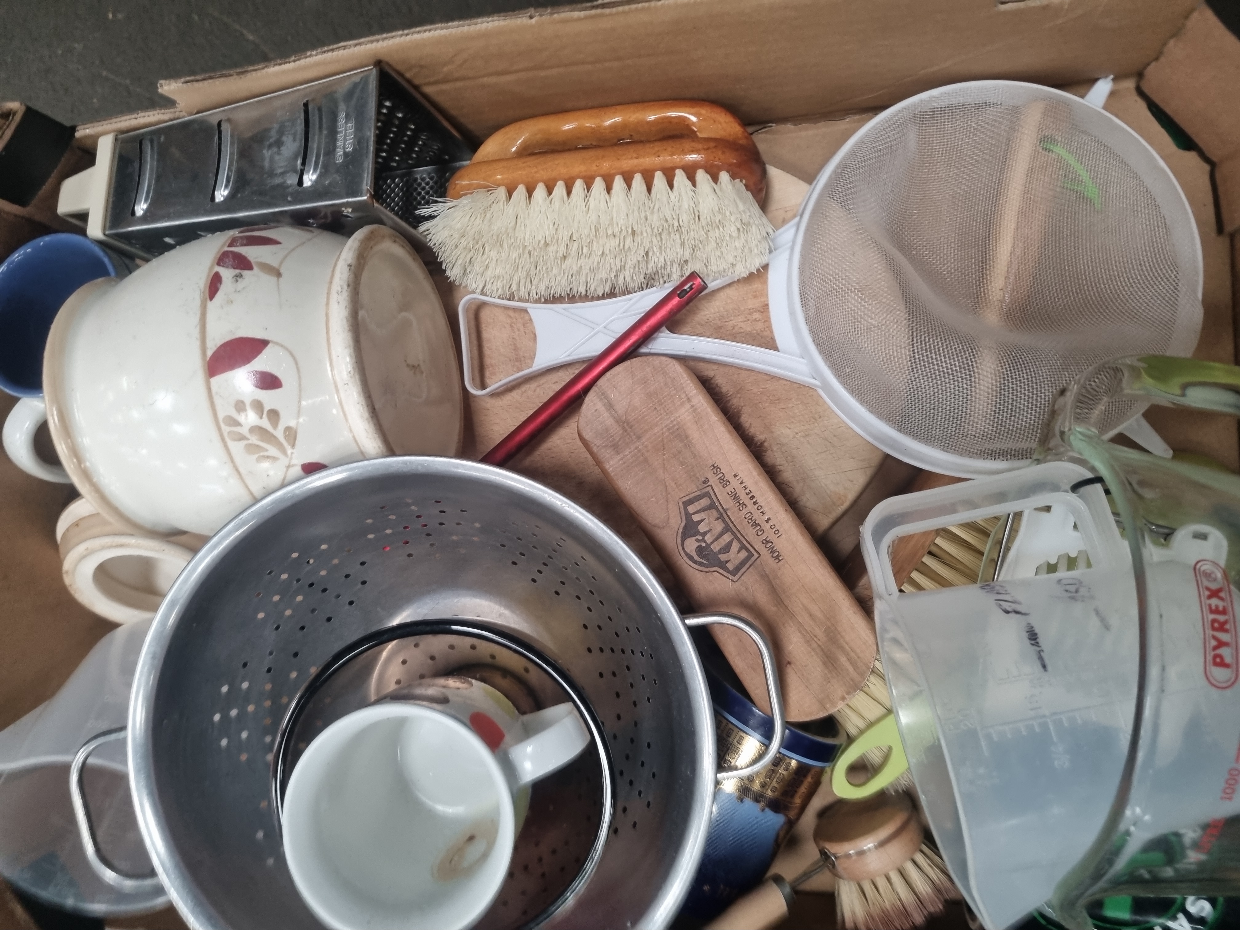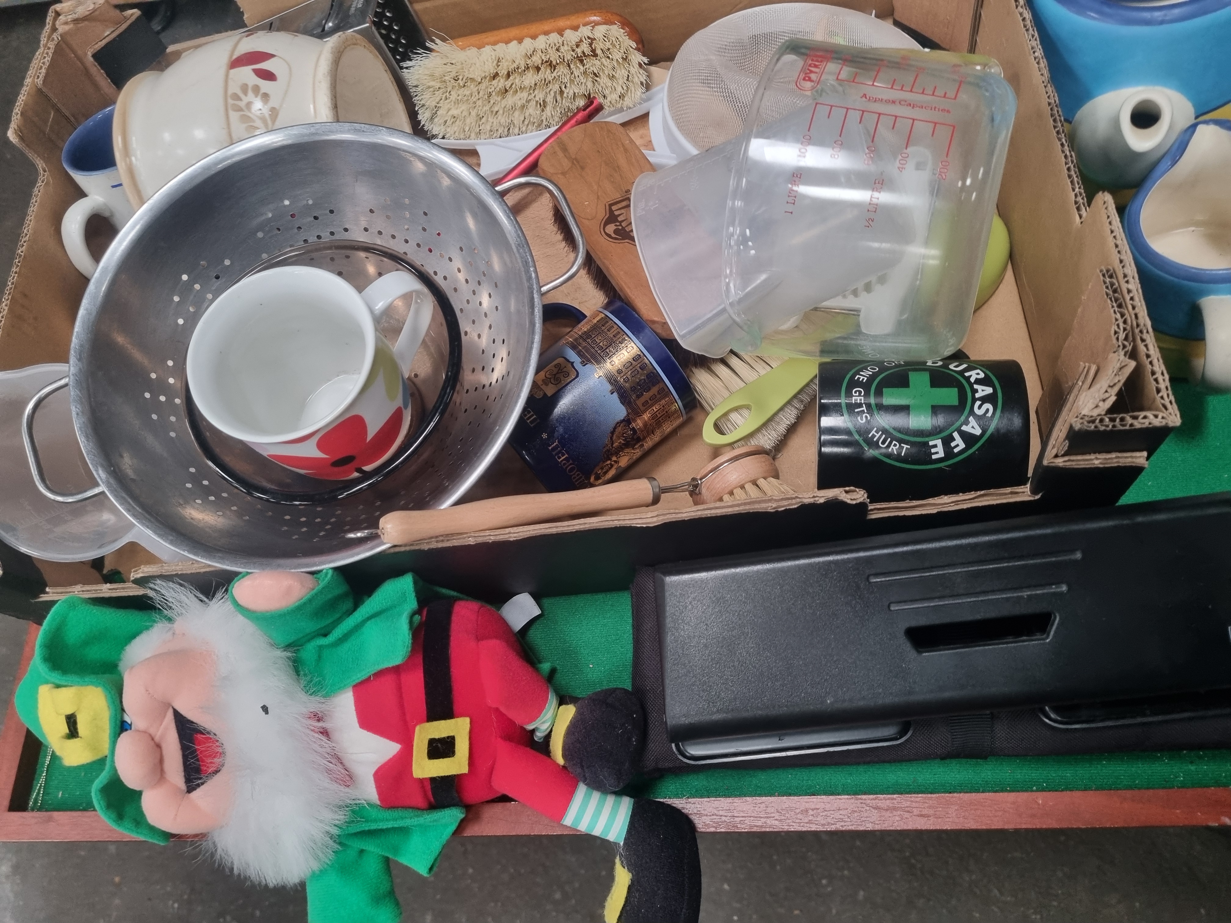 This lot comprises a varied collection of domestic utility items and kitchenware. The ceramic selection includes a teapot and matching cream jug featuring hand-painted horizontal bands in shades of blue and yellow, and a large heavy ceramic bowl with a cream glaze and red leaf motifs around the rim. Glass and plastic items include a Pyrex glass measuring jug and a Pyrex plastic measuring jug, both featuring red imperial and metric graduations. The assortment of mugs includes a white mug with a red floral pattern, a black promotional mug inscribed Durasafe – No One Gets Hurt, and a blue mug with a gold-tone architectural transfer print. Metalware consists of a stainless steel colander with twin handles and a four-sided stainless steel box grater. Cleaning and maintenance tools include a Kiwi Honor Guard shine brush with 100 percent horsehair, a long-handled wooden dish brush, a wooden utility brush, and a mesh sieve with a white plastic frame. Office and miscellaneous items include a black Rapesco heavy-duty hole punch and a small plush elf figure in green and red attire.