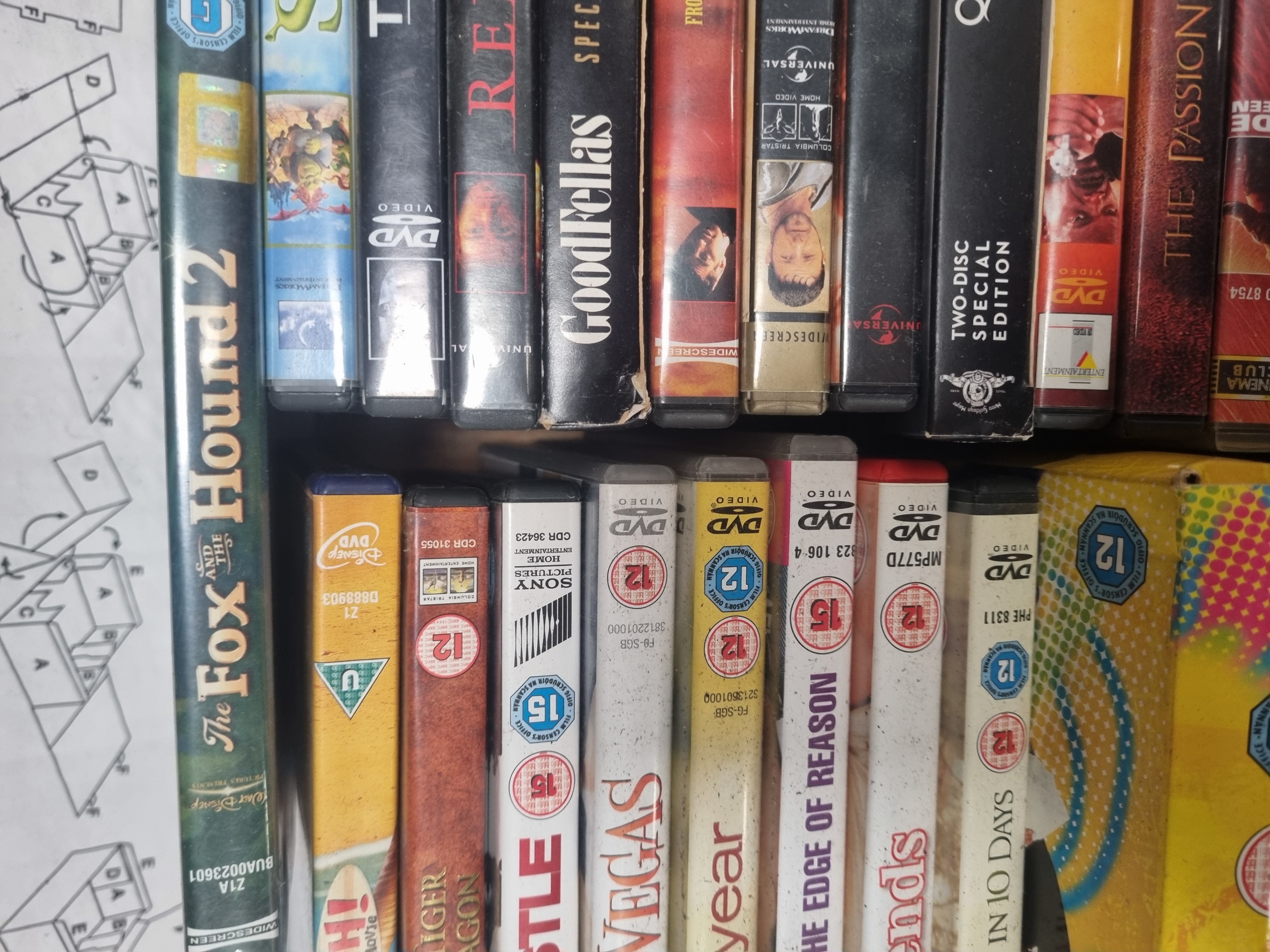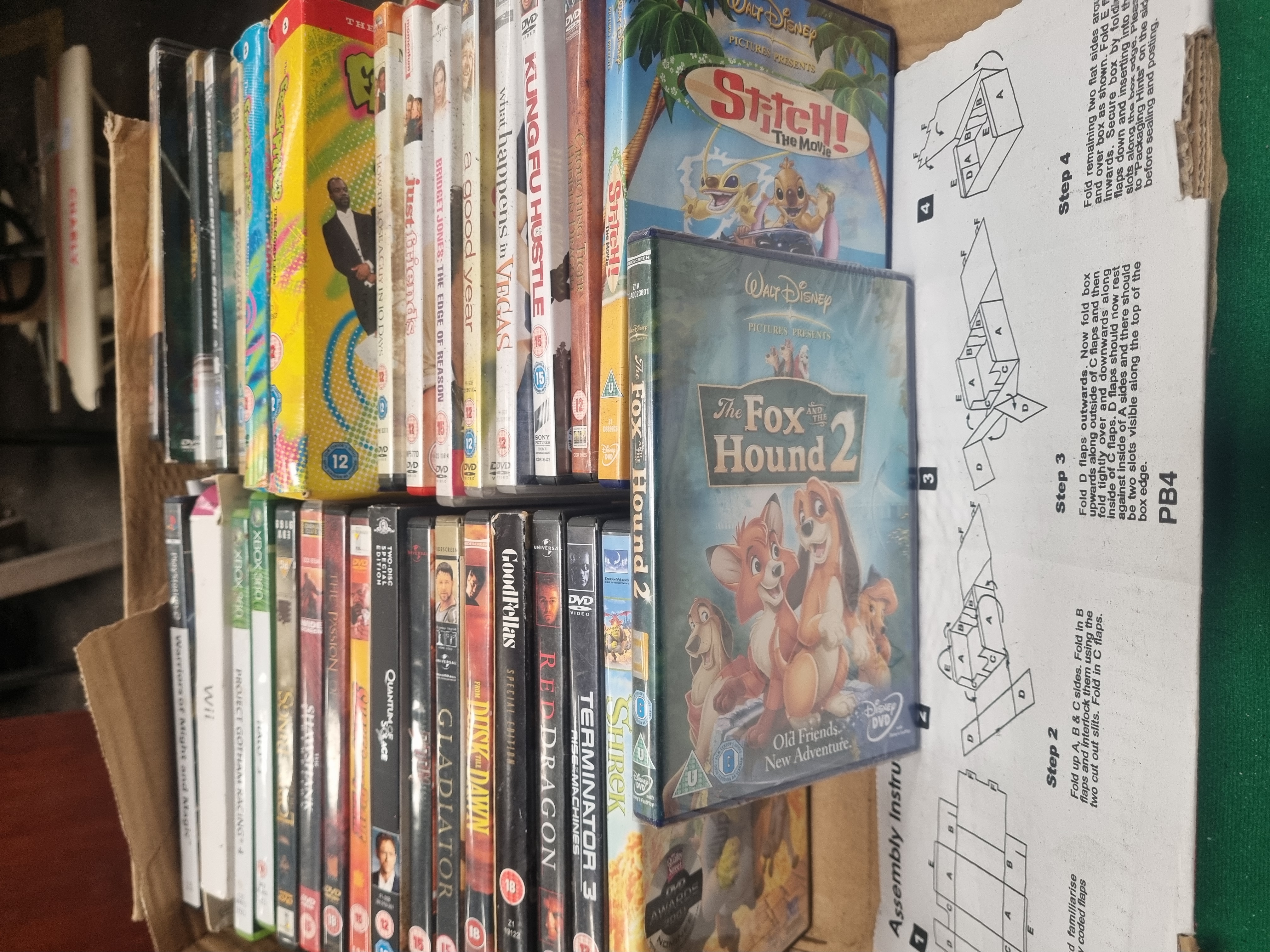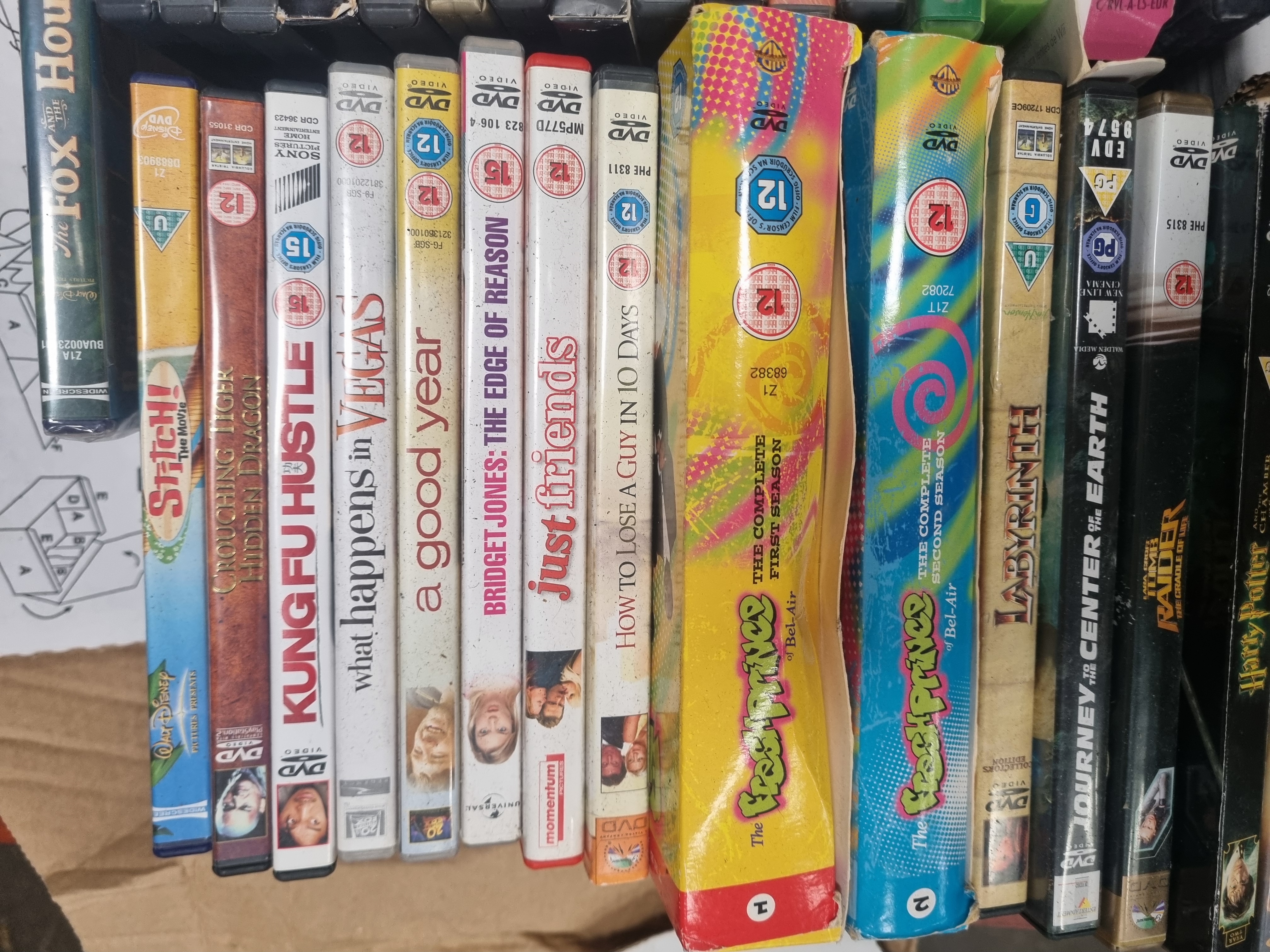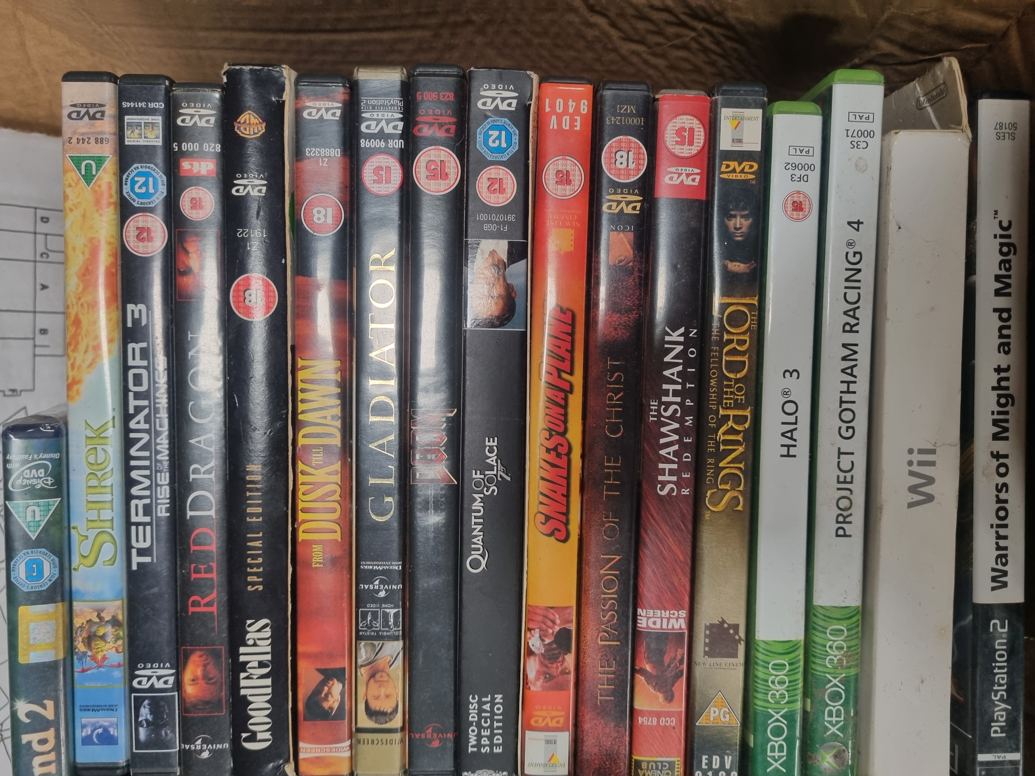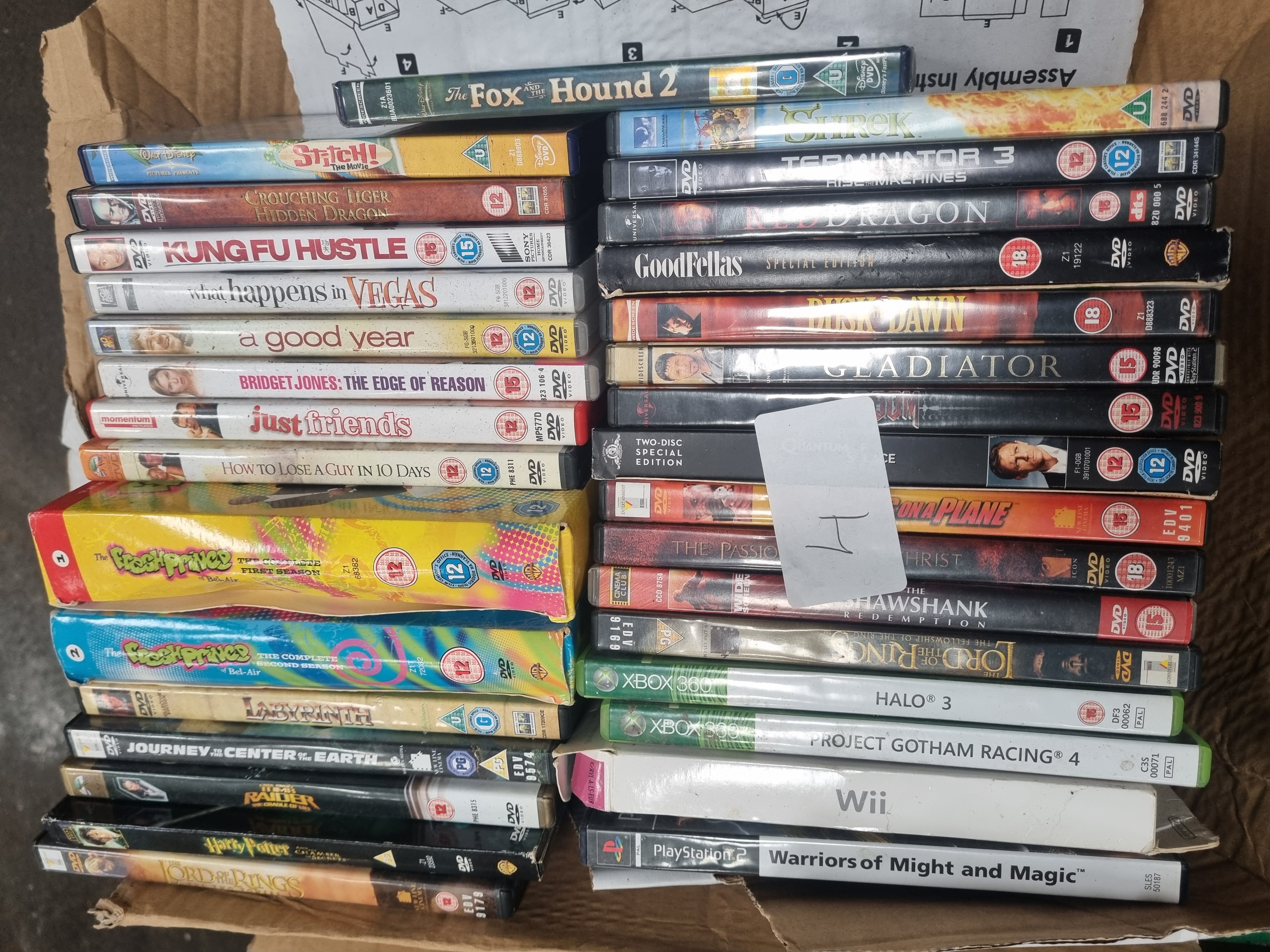 This lot comprises approximately 27 home entertainment items including feature films on DVD, television box sets, and video games for various consoles. The DVD selection includes animation titles such as Walt Disneys The Fox and the Hound 2 and Stitch! The Movie, and Shrek. Action and thriller titles include Crouching Tiger, Hidden Dragon, Kung Fu Hustle, Terminator 3: Rise of the Machines, Red Dragon, Gladiator, Doom, Quantum of Solace Two-Disc Special Edition, Snakes on a Plane, and Tomb Raider: The Cradle of Life. Drama and crime films include GoodFellas Special Edition, The Shawshank Redemption, The Passion of the Christ, and From Dusk Till Dawn. Comedy and romance titles include What Happens in Vegas, A Good Year, Bridget Jones: The Edge of Reason, Just Friends, and How to Lose a Guy in 10 Days. Fantasy and adventure titles include The Lord of the Rings: The Fellowship of the Ring, Labyrinth, Journey to the Center of the Earth, and Harry Potter and the Chamber of Secrets. Television content consists of The Fresh Prince of Bel-Air The Complete First Season and The Complete Second Season. Video games include Halo 3 and Project Gotham Racing 4 for Xbox 360, Warriors of Might and Magic for PlayStation 2, and one title for the Nintendo Wii in an original white case. All items appear to be UK PAL region releases with corresponding BBFC age ratings including U, PG, 12, 15, and 18. The lot is housed in a cardboard box bearing a Liskeard Auction Rooms lot sticker for Lot 319.