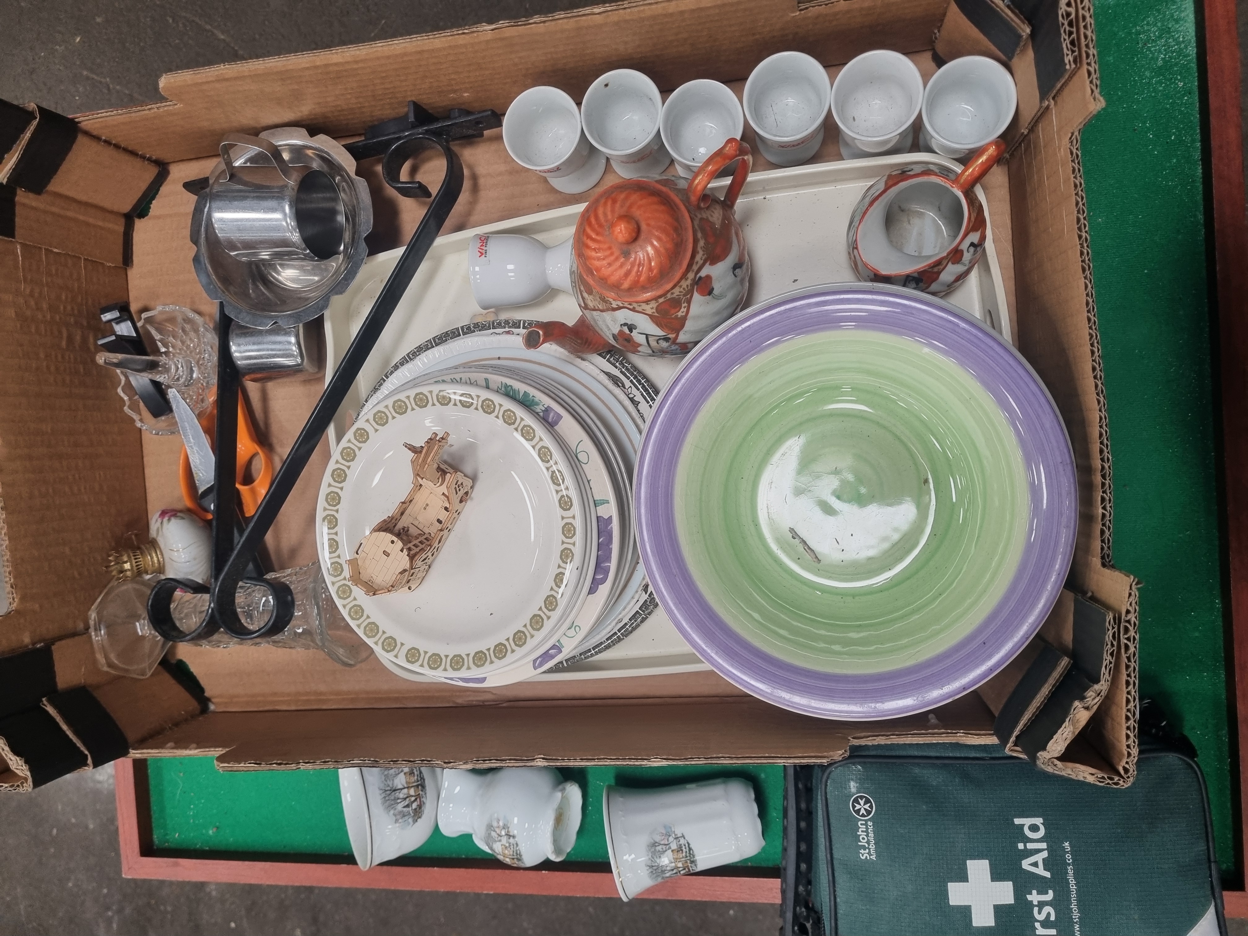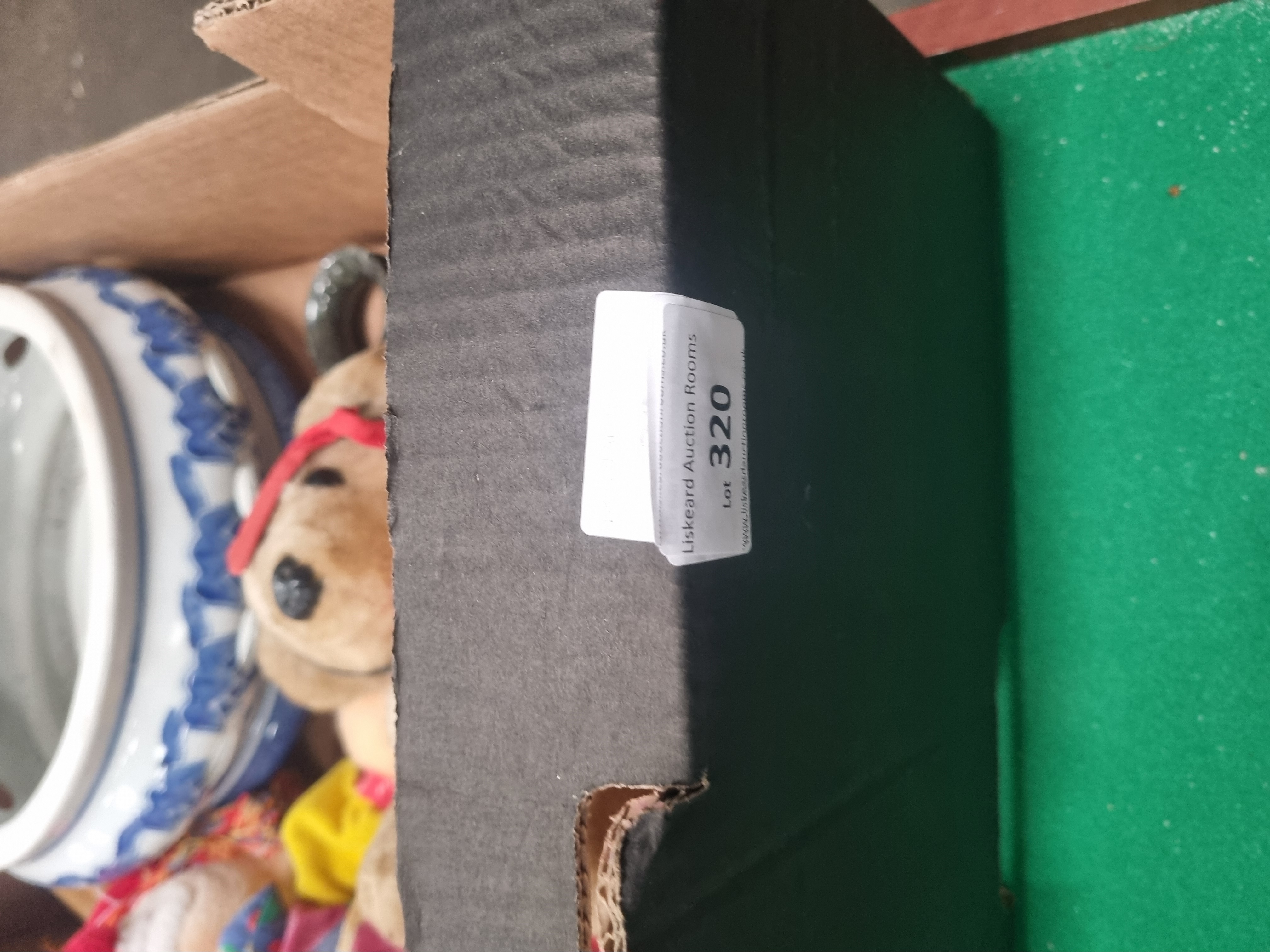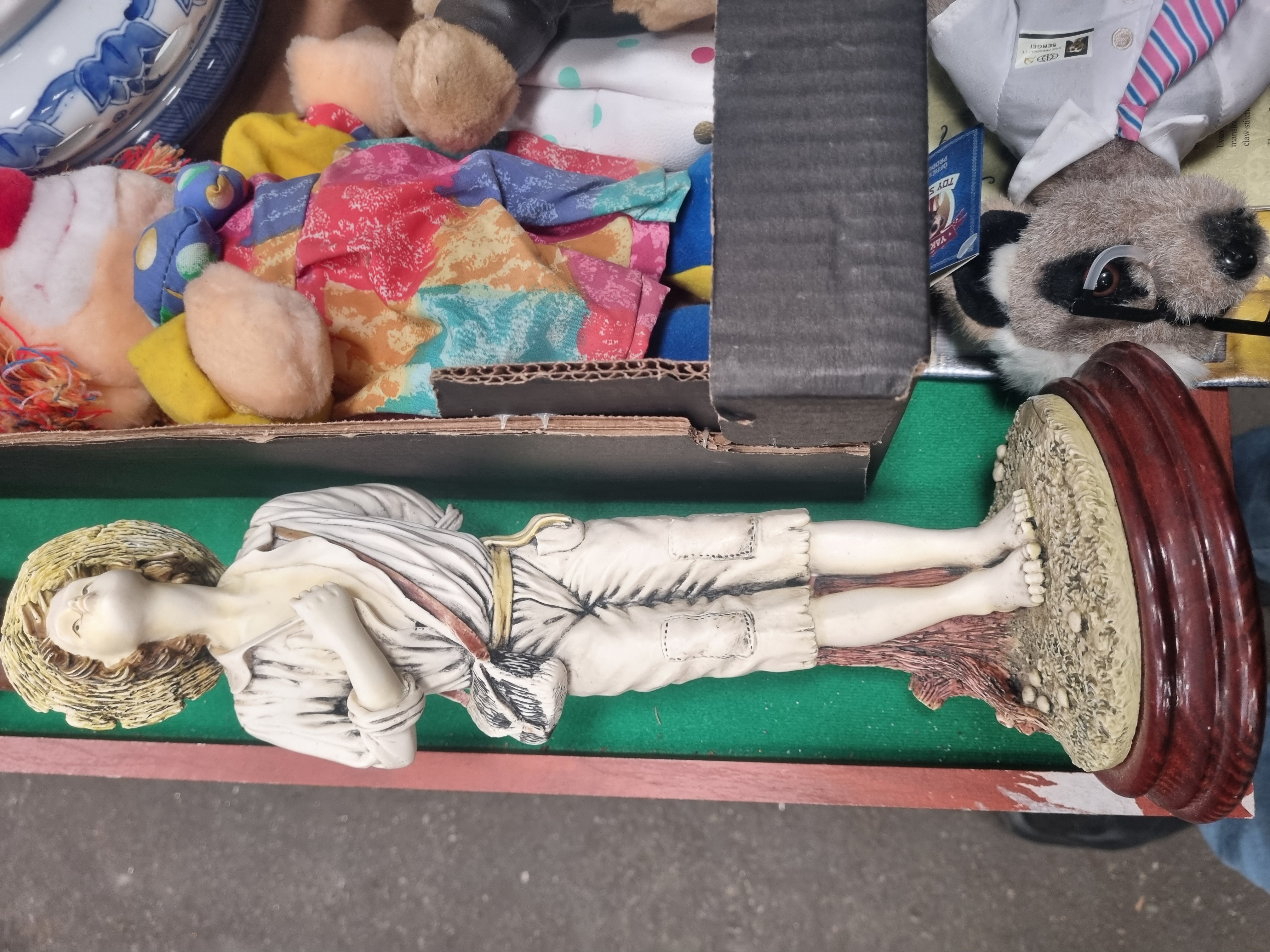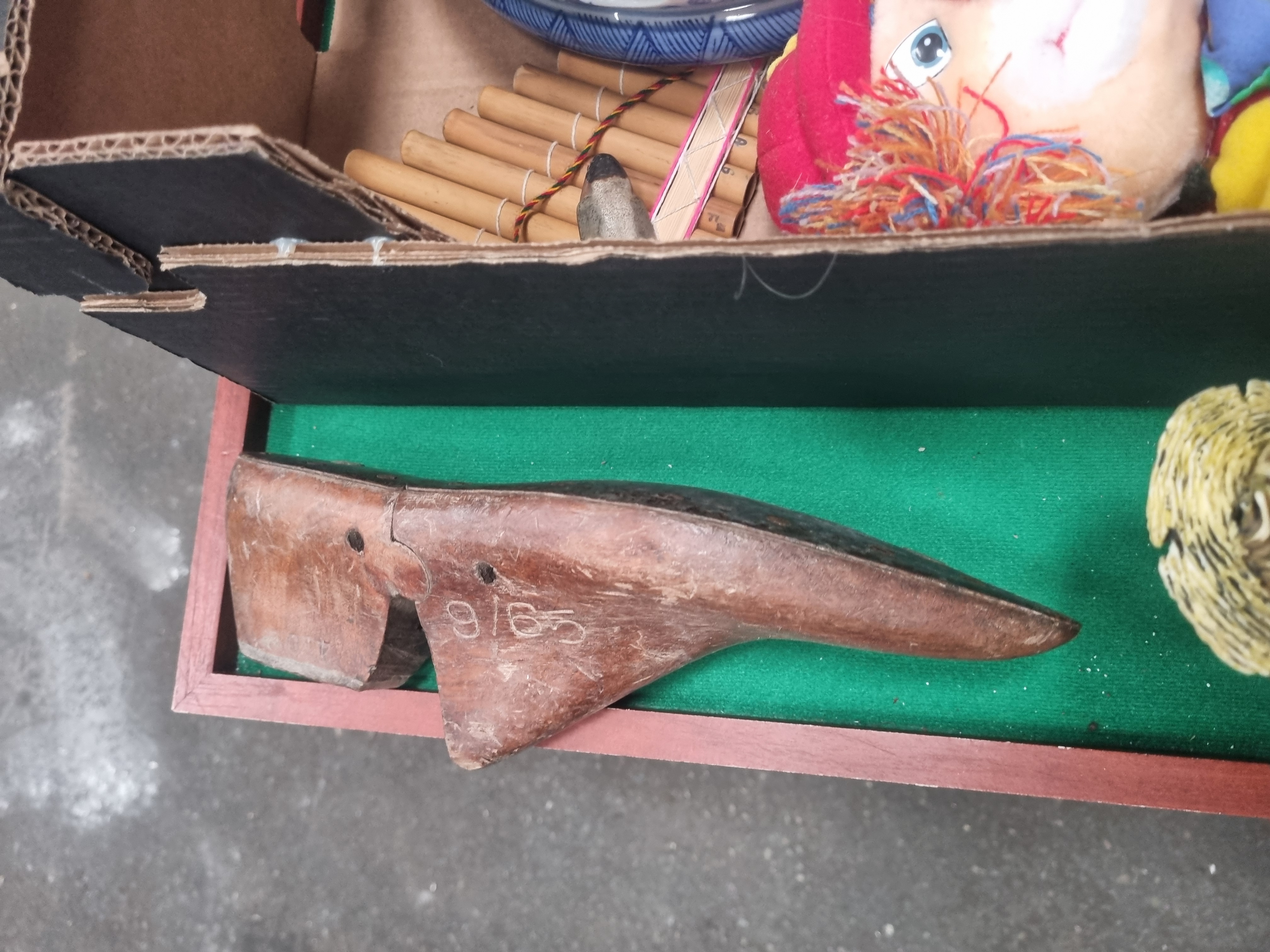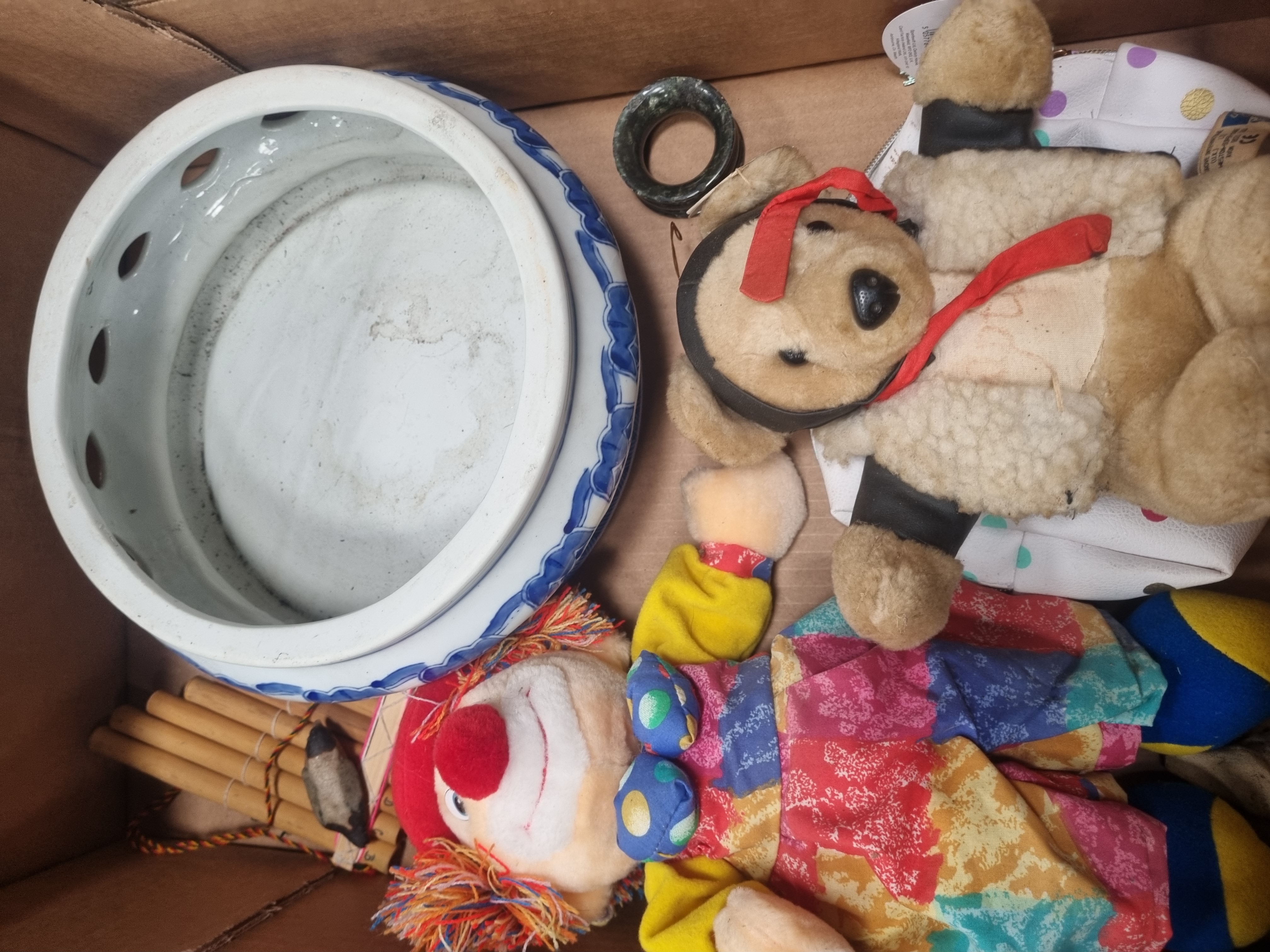 This lot comprises an assortment of decorative items, collectibles, and soft toys. The collection includes a Sergei character plush meerkat from the Compare the Meerkat advertising campaign, manufactured for Yakov’s Toy Shop. The figure is dressed in a white shirt, striped tie, and spectacles, housed in its original cardboard display box with printed branding. Included is a decorative figurine of a person in rural attire wearing a broad-brimmed hat and carrying a satchel. The piece is constructed from a cast composite material with a matte finish and is mounted on a circular wooden plinth with a mahogany-style finish. The lot further contains a glazed ceramic bowl or planter featuring a blue foliate and scrollwork border on a white ground, with a series of circular pierced decorative holes around the upper body. Also present is a carved hardwood shoe last, incised with the numbers 9/65. Additional items include a patchwork plush clown doll with multicoloured yarn hair, a beige plush teddy bear wearing a black vest and red bandana, a small set of bamboo panpipes bound with cord, and a polished dark green hardstone ring.