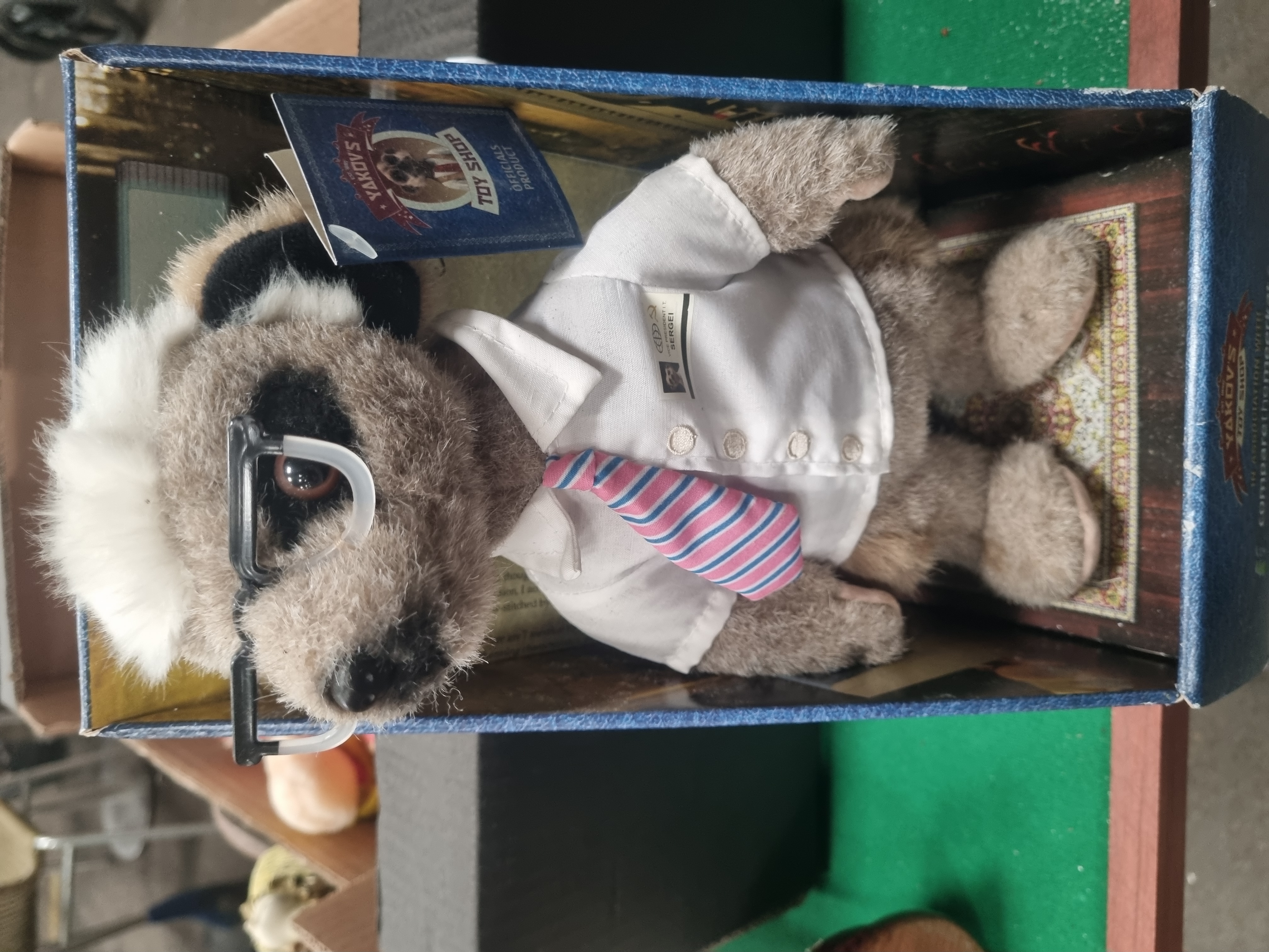 Lot 320: An Assortment of Collectibles including a Boxed Sergei Meerkat Plush, Decorative Figurine, and Ceramic Planter