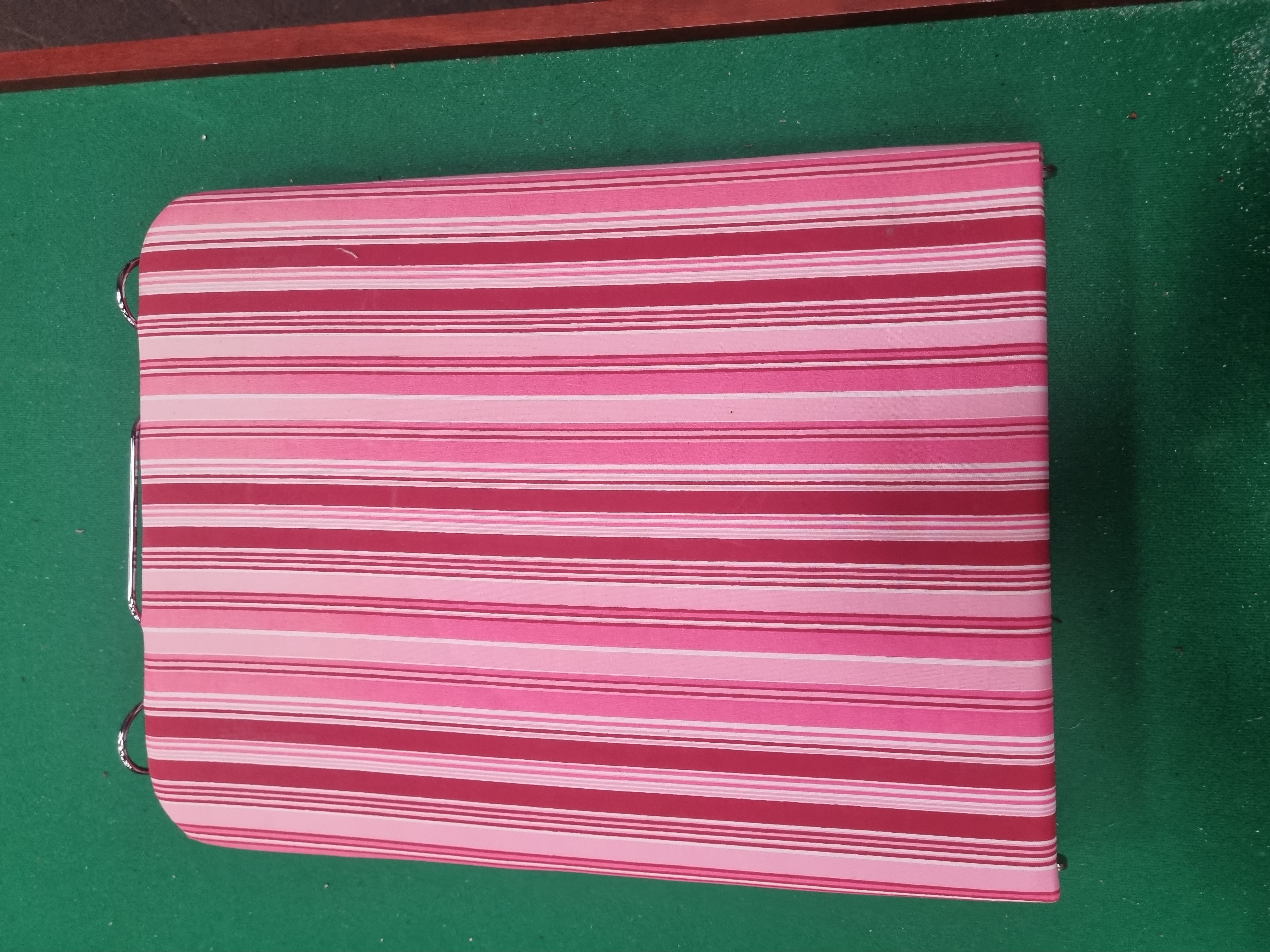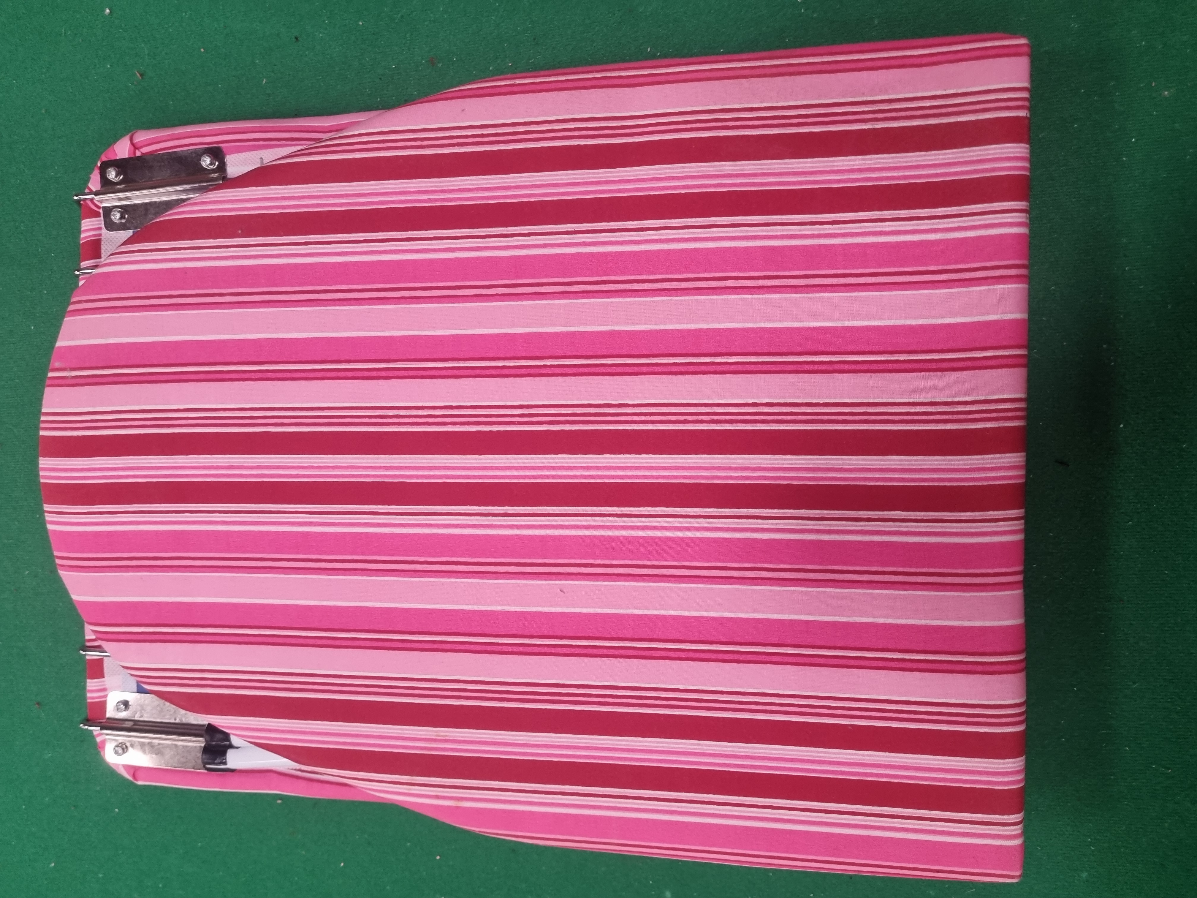 A folding tabletop ironing board featuring a two-section hinged design for compact storage. The board is constructed with a metal frame and equipped with white-coated folding legs fitted with black non-slip feet. It includes an integrated chrome-finished slide-out wire iron rest. The padded ironing surface is upholstered in a fabric cover with a horizontal stripe pattern in shades of pink, white, and burgundy. The underside of the board features a blue fabric backing and metal hardware. No manufacturer marks are present.