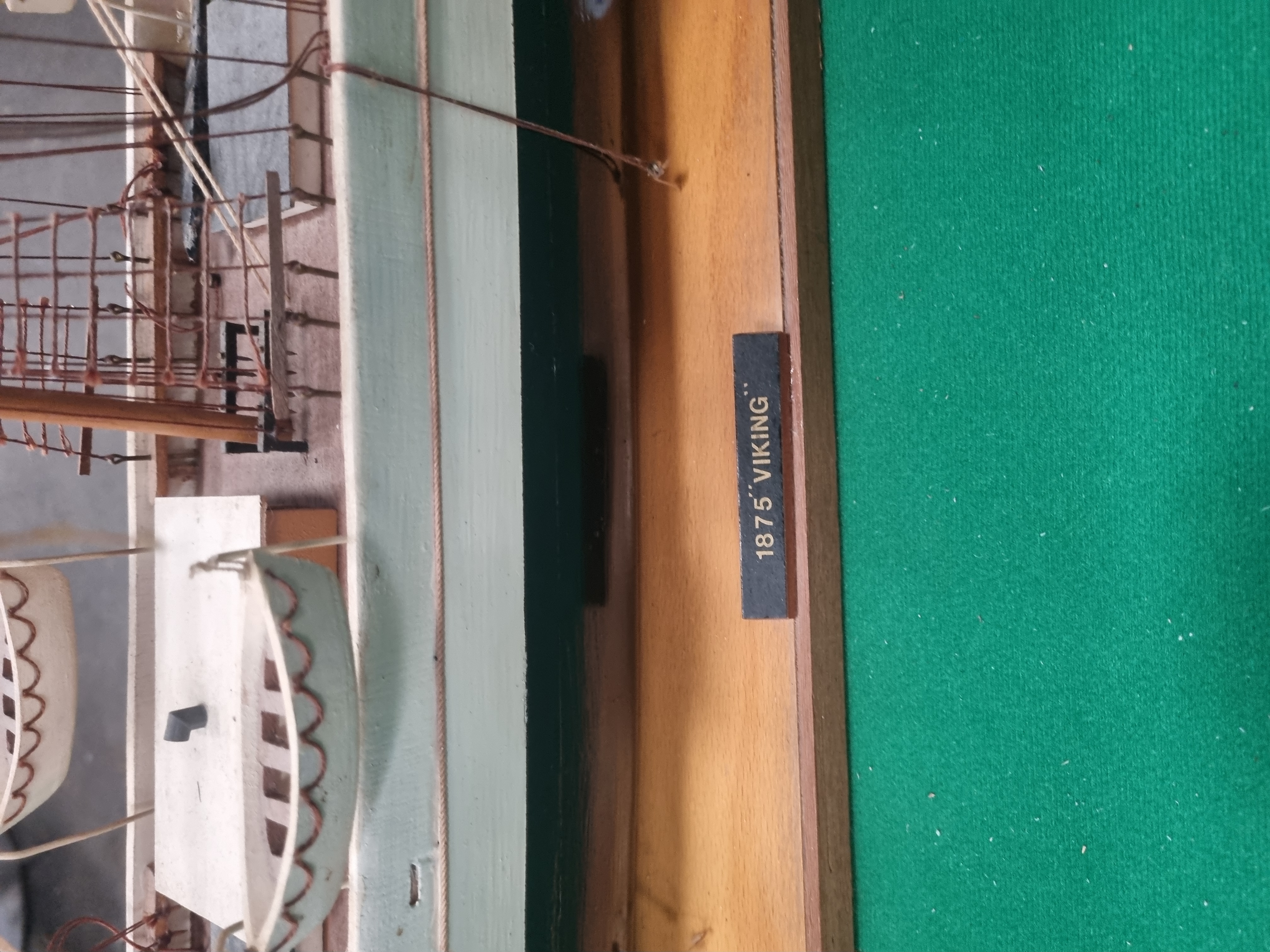 A hand-built wooden scale model of a four-masted sailing ship, identified by an attached plaque as the 1875 Viking. The model is constructed with a wooden hull, masts, and yards, featuring intricate cordage for the standing and running rigging. The hull is finished with a white upper section and a dark green lower section below the waterline. The deck is populated with various scale details including lifeboats on davits, deck houses, and perimeter railings. The model is mounted upon a rectangular wooden display base. A black plaque with gold-coloured lettering is fixed to the base, transcribed as 1875 VIKING.