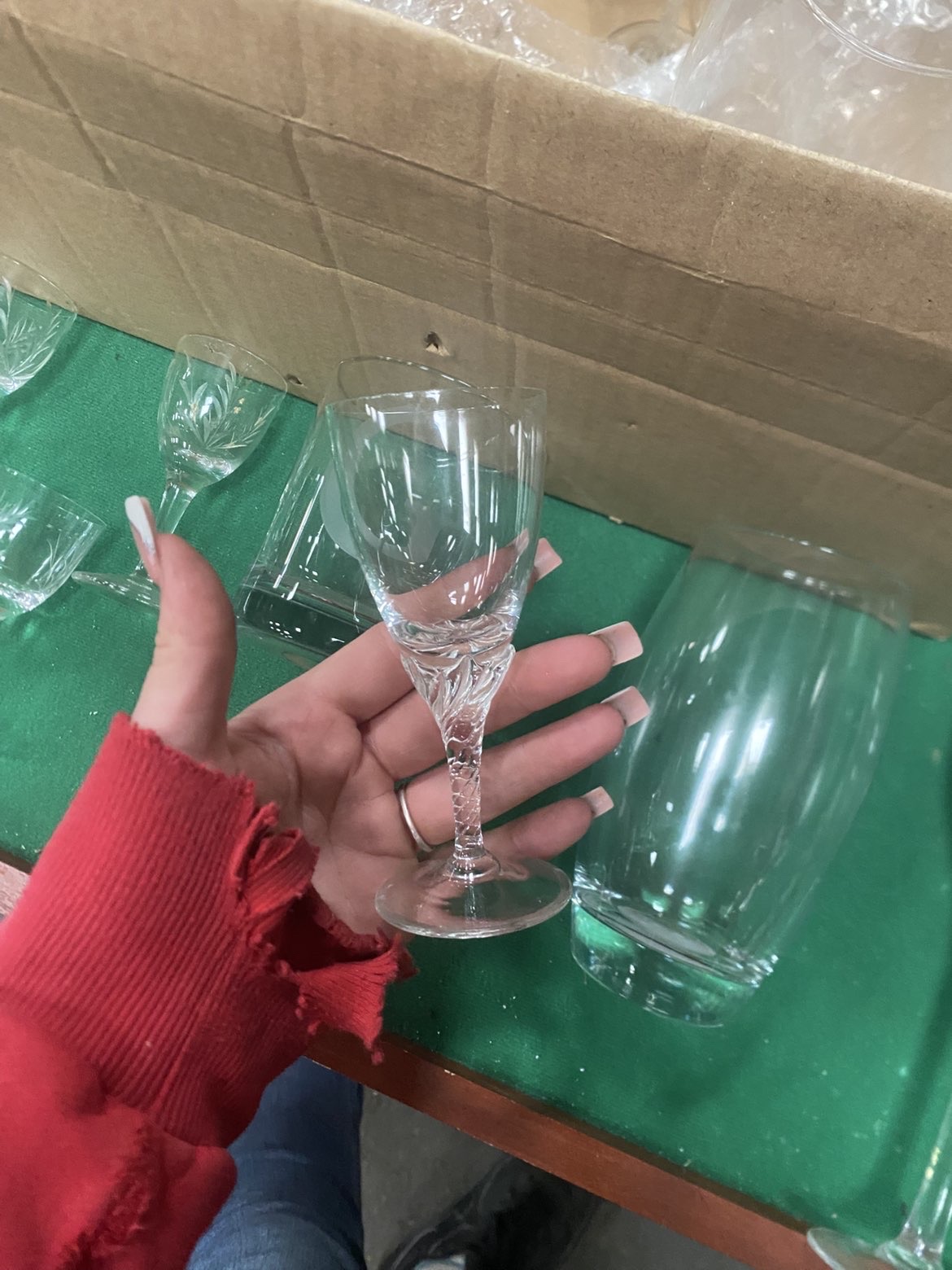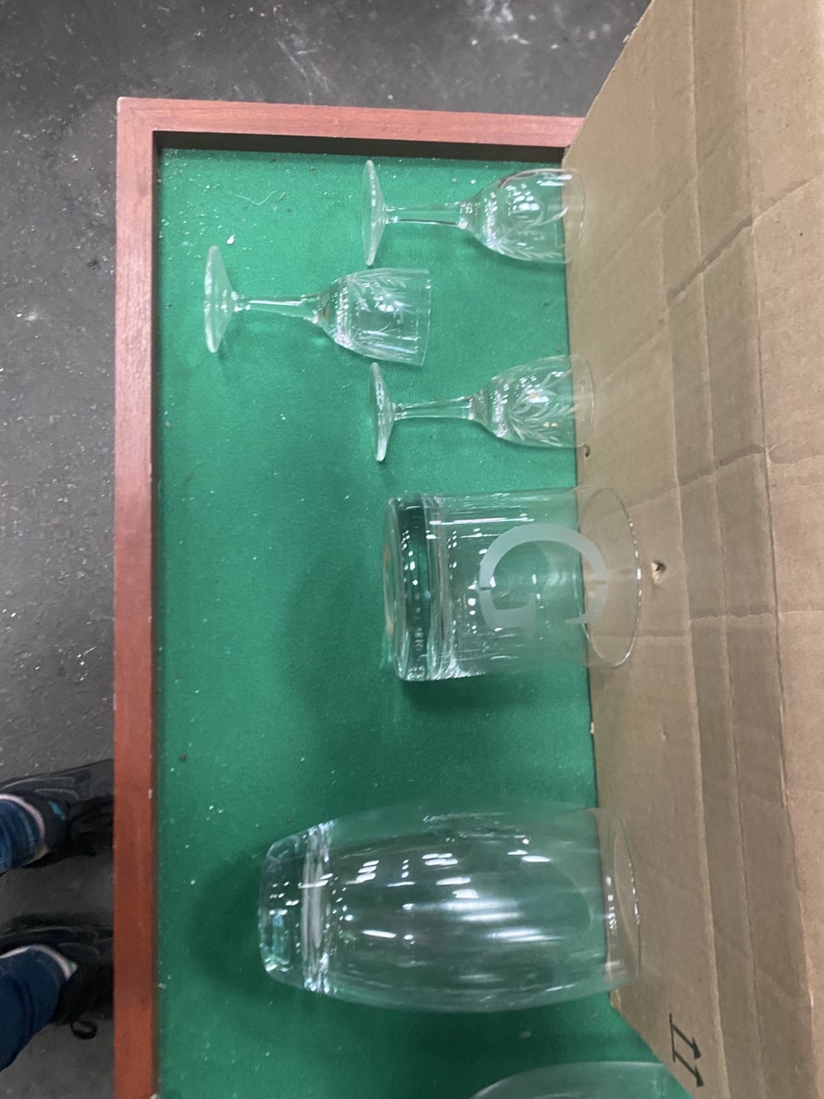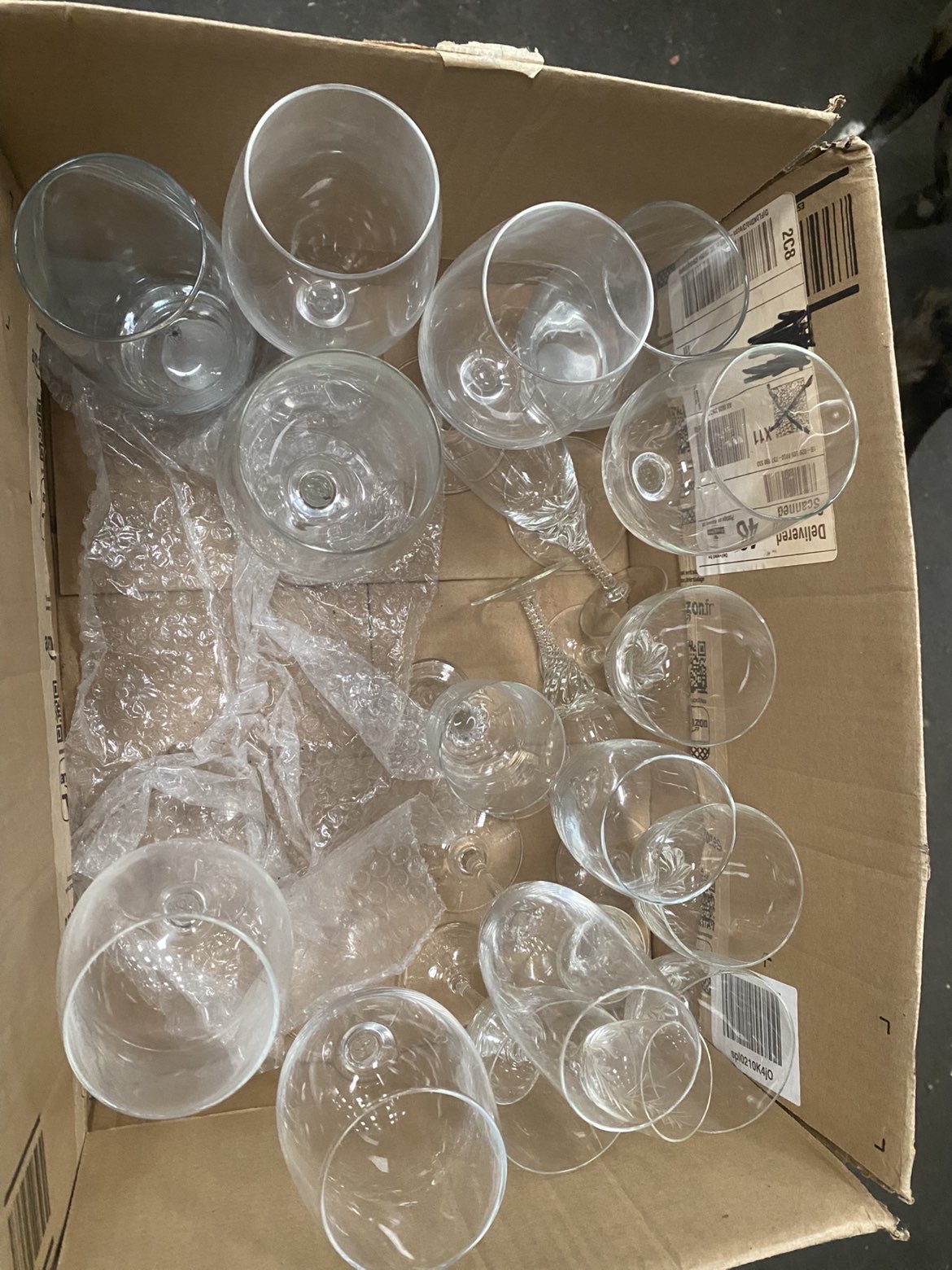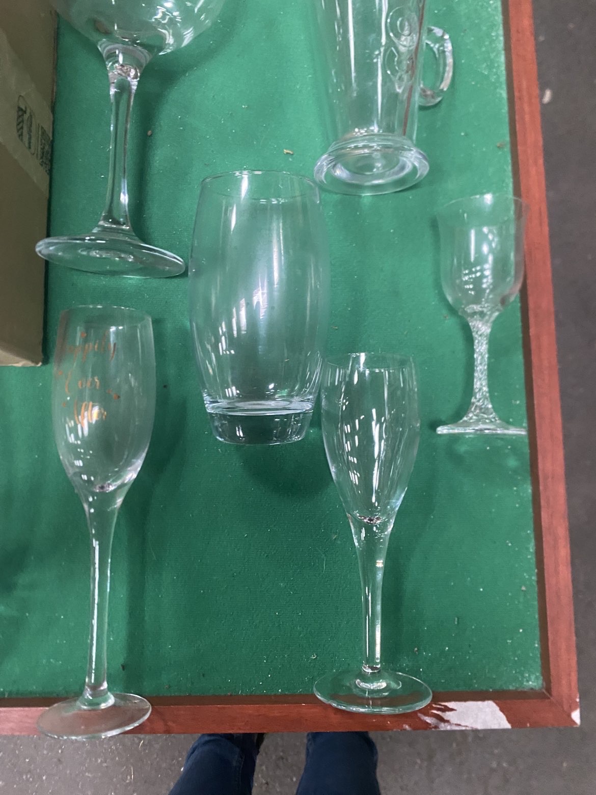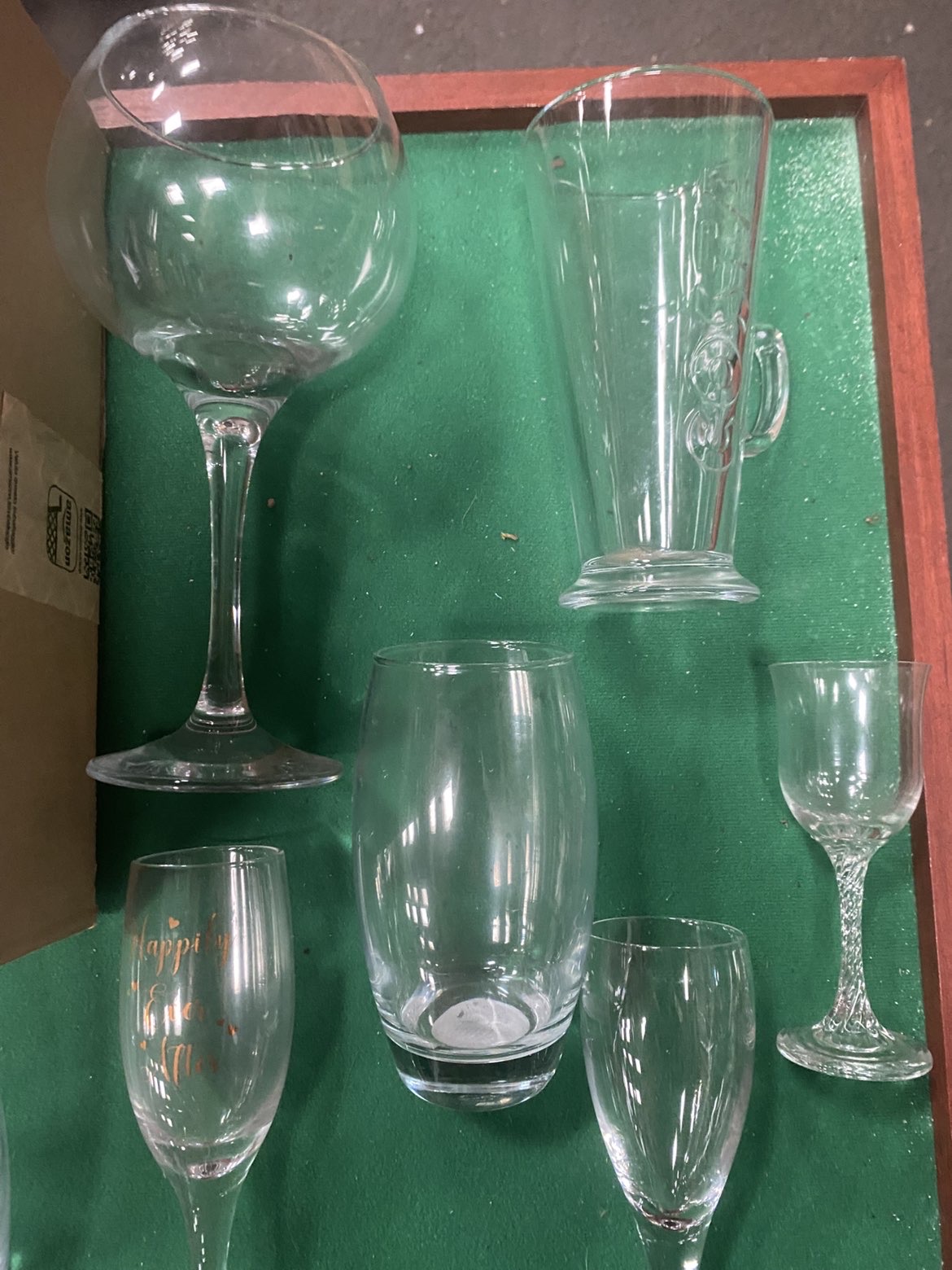 An assortment of approximately twenty pieces of glassware of various forms and styles. The collection includes a large balloon-style gin glass, a conical Irish coffee mug with a molded handle, and two champagne flutes, one of which features gold-tone script reading Happily Ever After. Also present are multiple stemmed wine glasses and various tumblers. Notable decorative elements include a set of three small stemmed glasses with etched foliate patterns, a heavy-based tumbler with an etched capital letter G, and a small liqueur glass featuring a decorative twisted stem. No manufacturer marks or signatures were identified on the pieces.