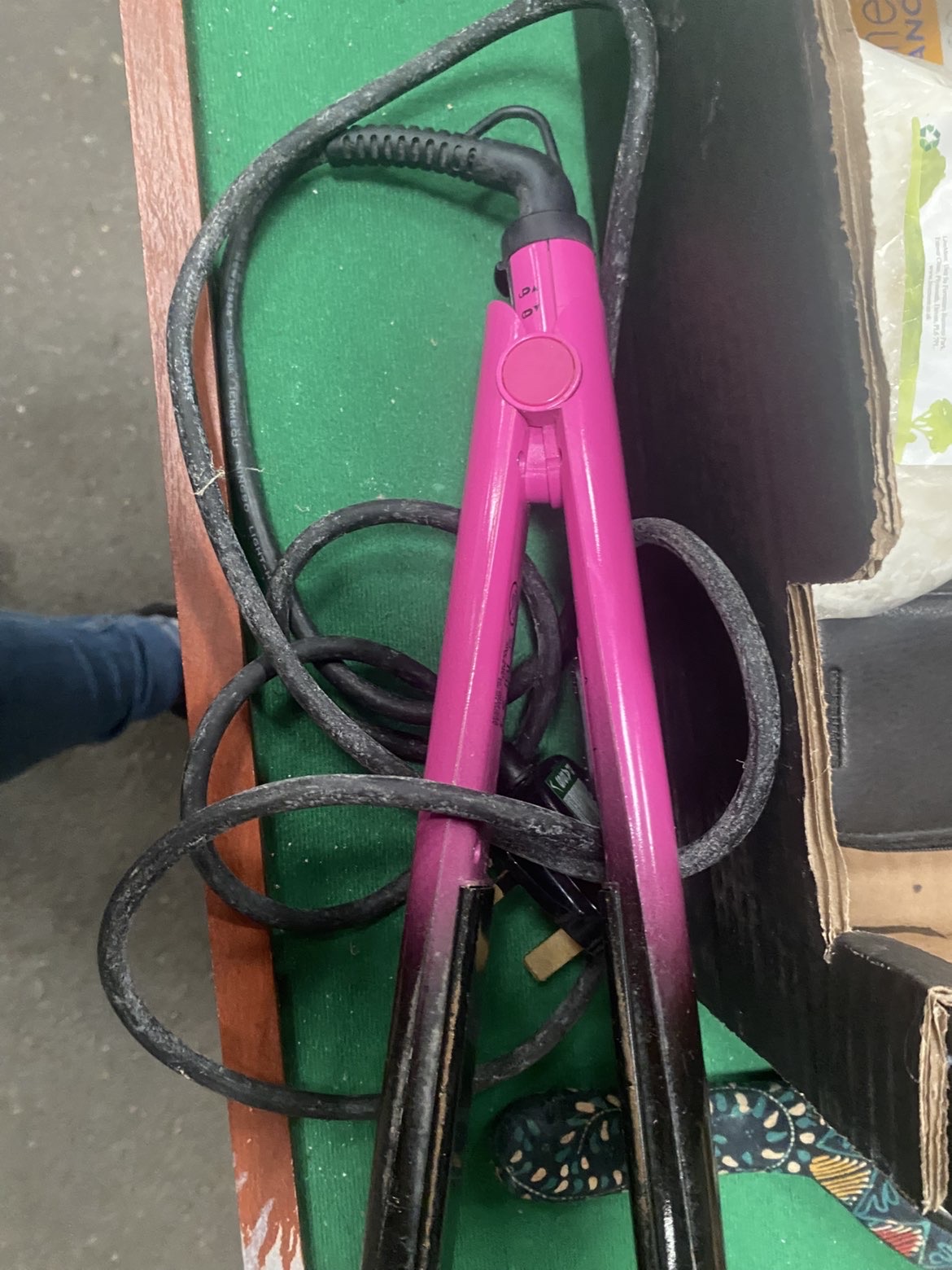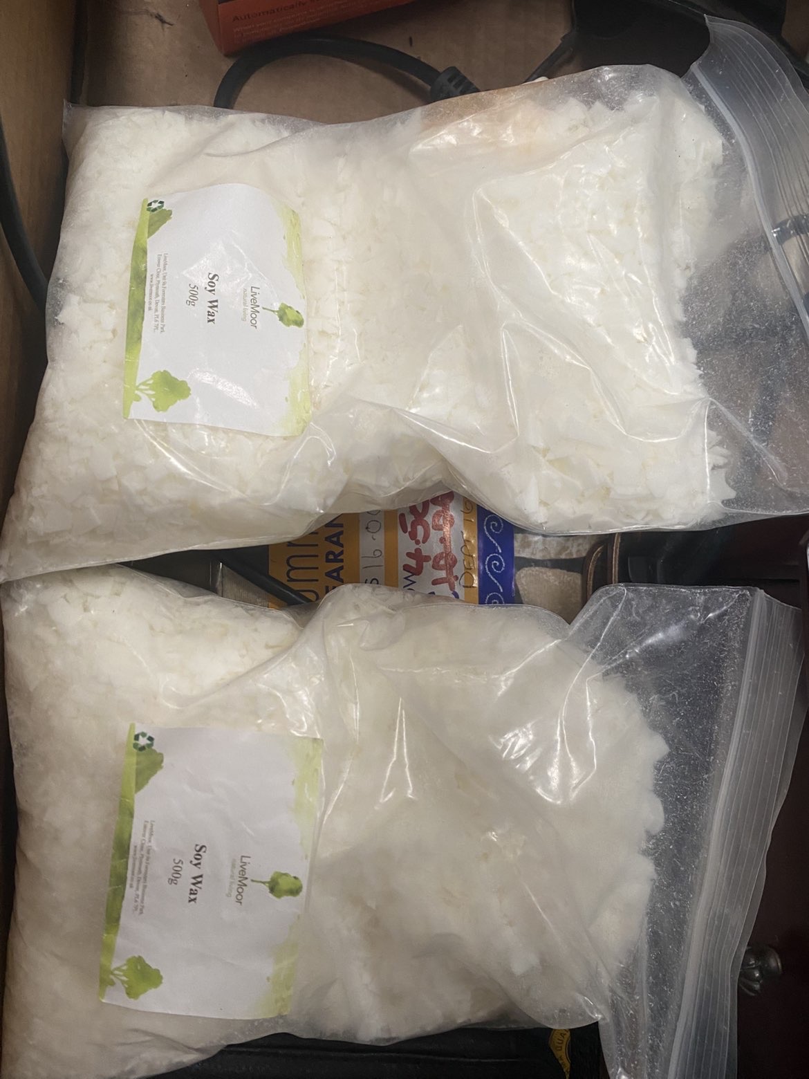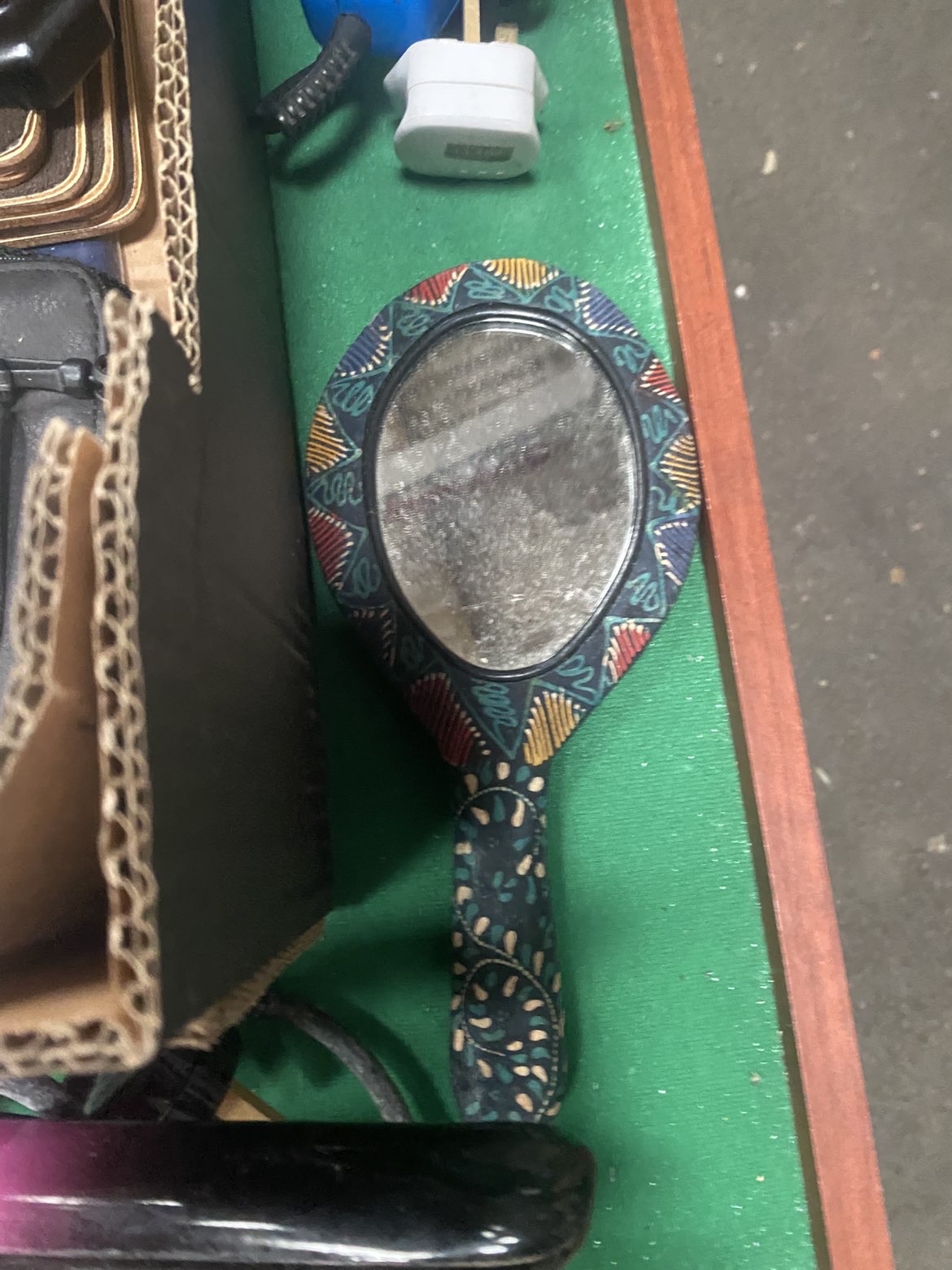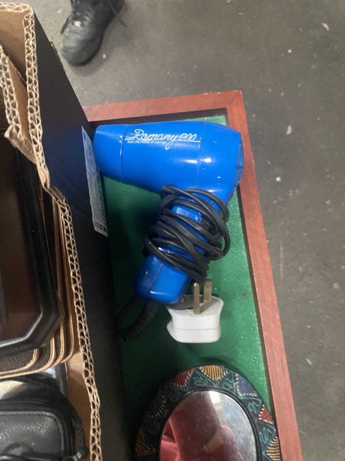 An assortment of hair care, craft, and vanity items. The lot includes two handheld hairdryers: a compact blue plastic model marked Romany 200 from the House of Carmen and a grey and black BaByliss model. Also present is a pair of hair straighteners featuring a pink to black gradient finish on the outer casing and black heating plates. For candle making, the collection includes two sealed 500g bags of LiveMoor soy wax flakes. Vanity accessories include a decorative hand mirror with a multi-coloured geometric patterned frame and a wooden tabletop organiser with clear acrylic multi-compartment inserts. The lot is completed by a black soft-shell carry case, a PowerDown instruction manual, and a white power adapter. Electrical items are fitted with integrated power cords and standard UK 3-pin plugs.