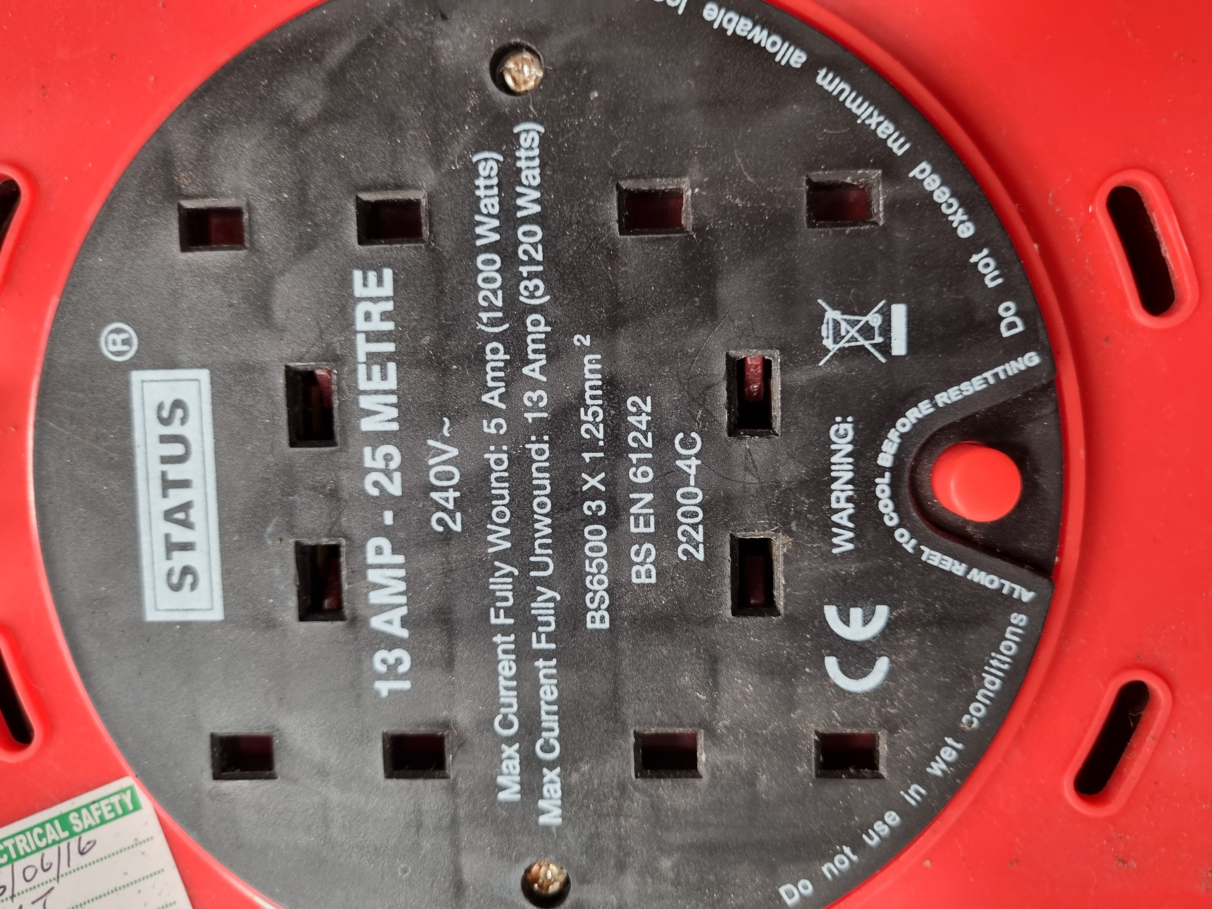 A Status model 2200-4C 4-gang cable reel extension lead. The unit features a red plastic reel housing mounted on a black tubular metal stand with a manual winding handle. The central hub provides four UK standard 3-pin socket outlets and incorporates an integrated thermal cut-out with a manual reset button. Technical specifications include a 25-metre cable length using BS6500 3 x 1.25mm² cable. The unit is rated for 240V~ with a maximum current of 13 Amps (3120 Watts) when fully unwound and 5 Amps (1200 Watts) when fully wound. It conforms to British Standard BS EN 61242 and bears the CE mark and WEEE disposal symbol.
