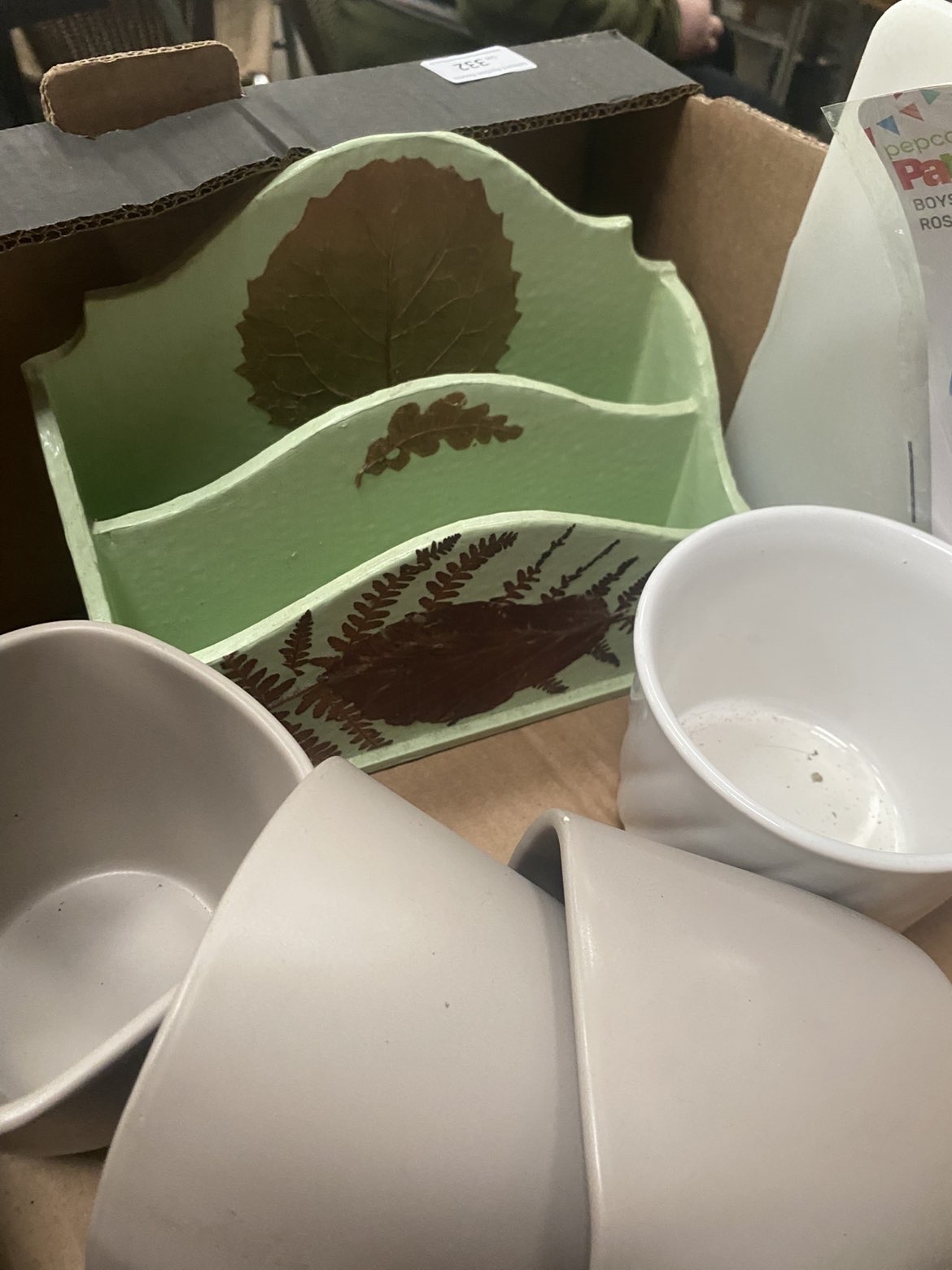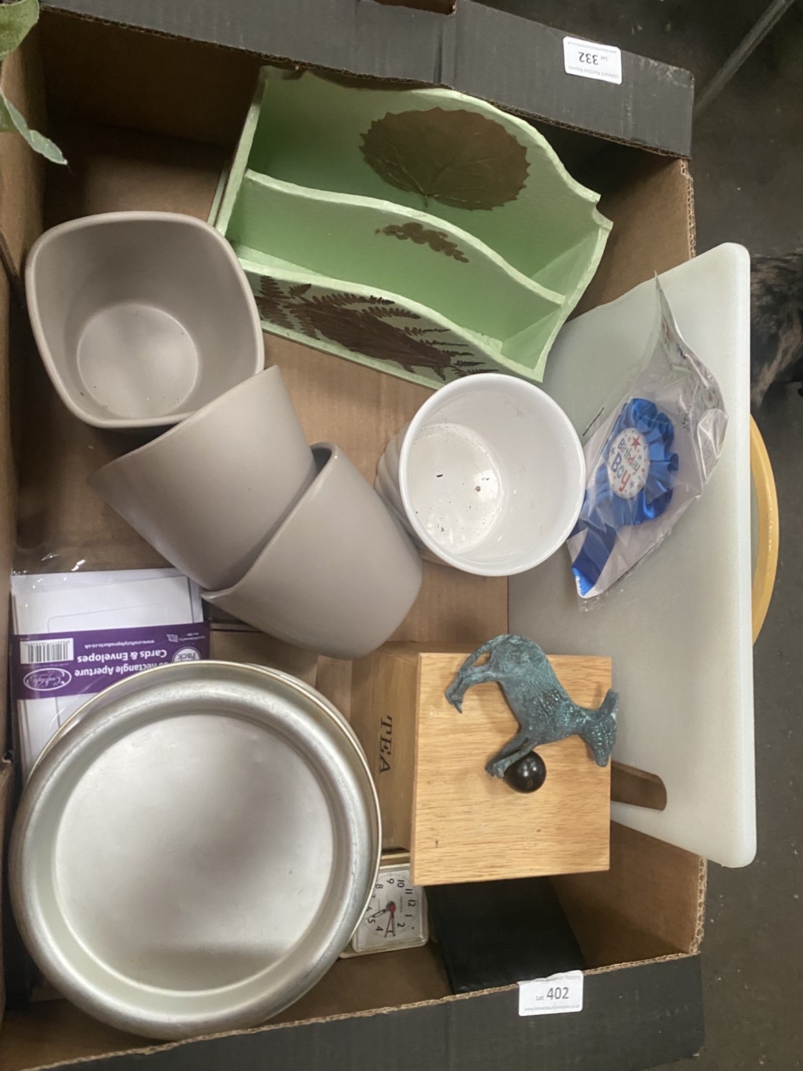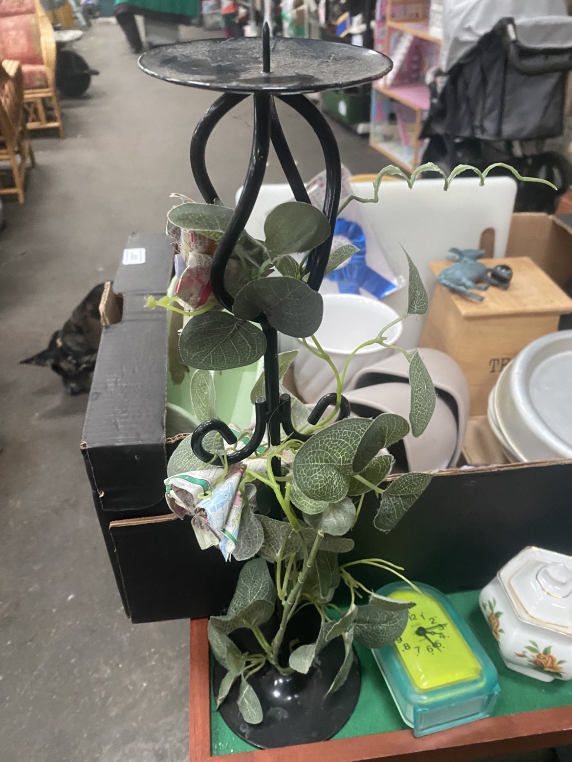 A mixed lot featuring decorative metalware and various household objects. The metalware includes a black-painted wrought-iron style candle stand with a circular top and central spike, the scrolled stem entwined with faux trailing foliage. Also present is a cast metal figurine of a goat balanced on a sphere with a verdigris-style patina, mounted to a light-coloured wooden box marked TEA. Ceramic components comprise a set of taupe-glazed planters, a white fluted pot, and a small hexagonal porcelain jar with floral transfers and gilt-toned accents. Additional items include a green-painted wooden stationery rack with botanical leaf transfers, a lime green and striped fabric bag, a white plastic chopping board, a lime green quartz travel clock, and two boxes of disposable face masks by Gauke and Fohwa. The lot is completed with a pack of aperture cards and a blue celebratory rosette.