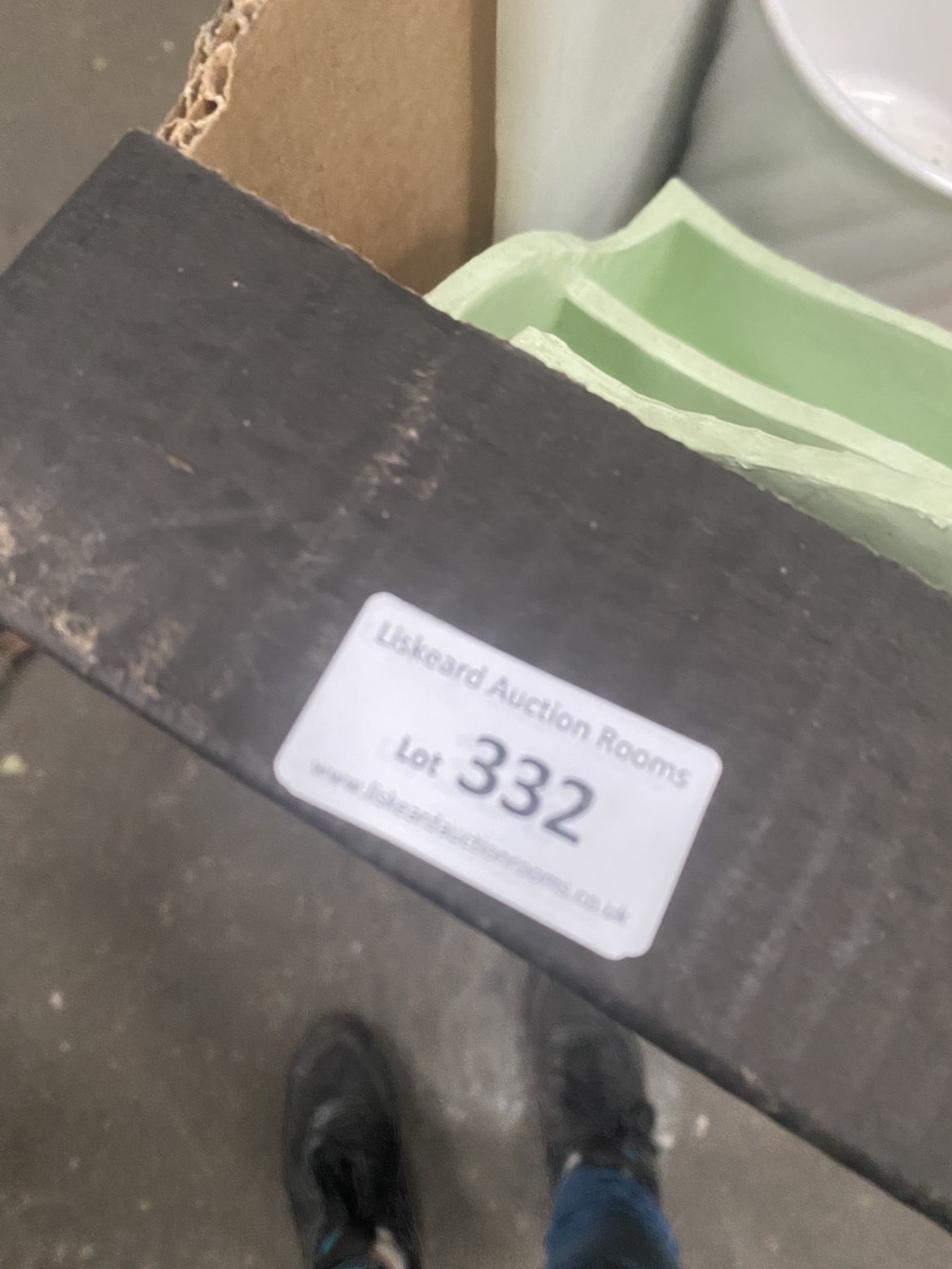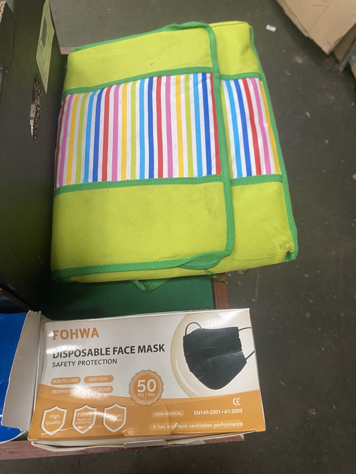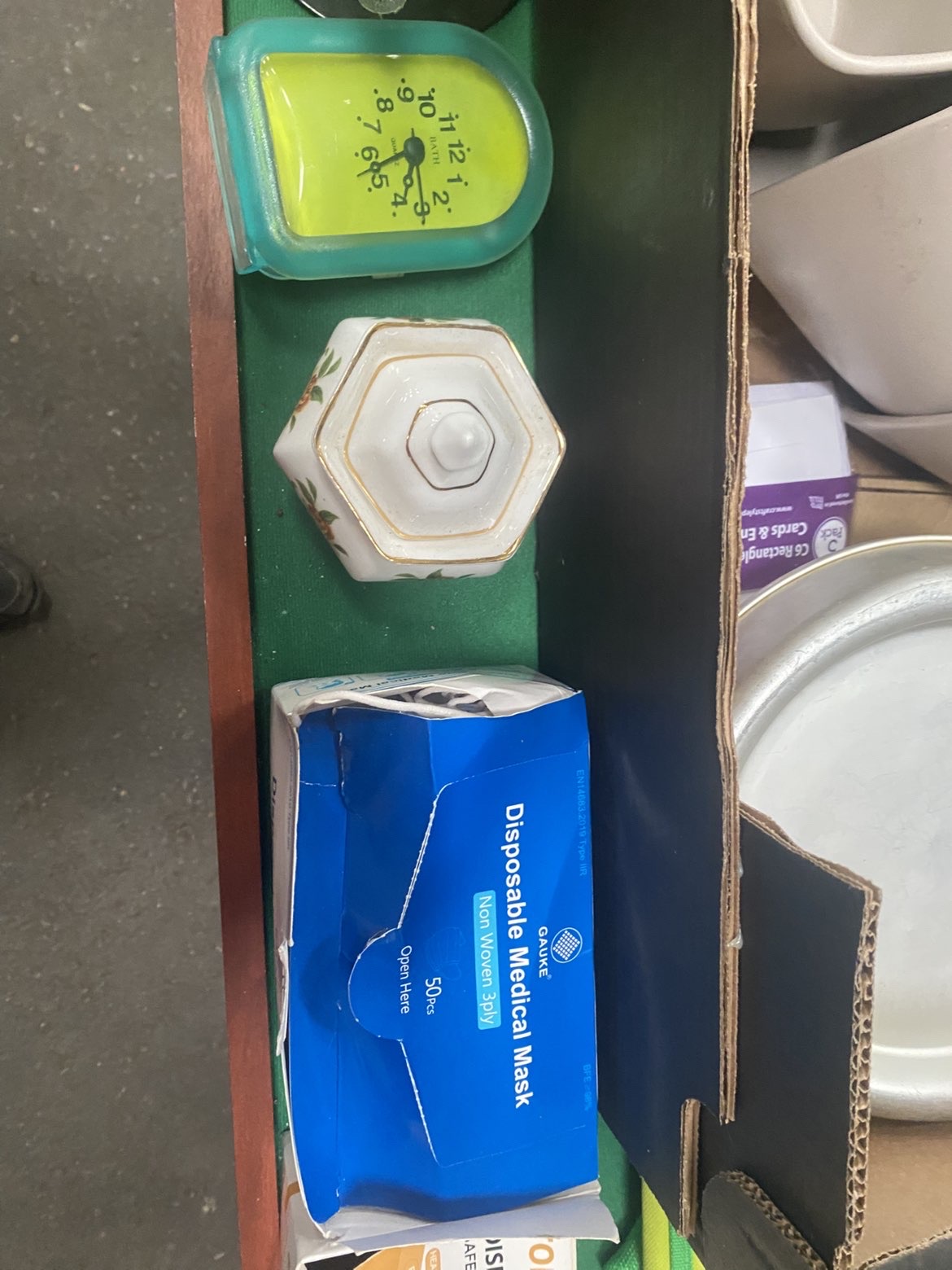 A mixed lot featuring decorative metalware and various household objects. The metalware includes a black-painted wrought-iron style candle stand with a circular top and central spike, the scrolled stem entwined with faux trailing foliage. Also present is a cast metal figurine of a goat balanced on a sphere with a verdigris-style patina, mounted to a light-coloured wooden box marked TEA. Ceramic components comprise a set of taupe-glazed planters, a white fluted pot, and a small hexagonal porcelain jar with floral transfers and gilt-toned accents. Additional items include a green-painted wooden stationery rack with botanical leaf transfers, a lime green and striped fabric bag, a white plastic chopping board, a lime green quartz travel clock, and two boxes of disposable face masks by Gauke and Fohwa. The lot is completed with a pack of aperture cards and a blue celebratory rosette.
