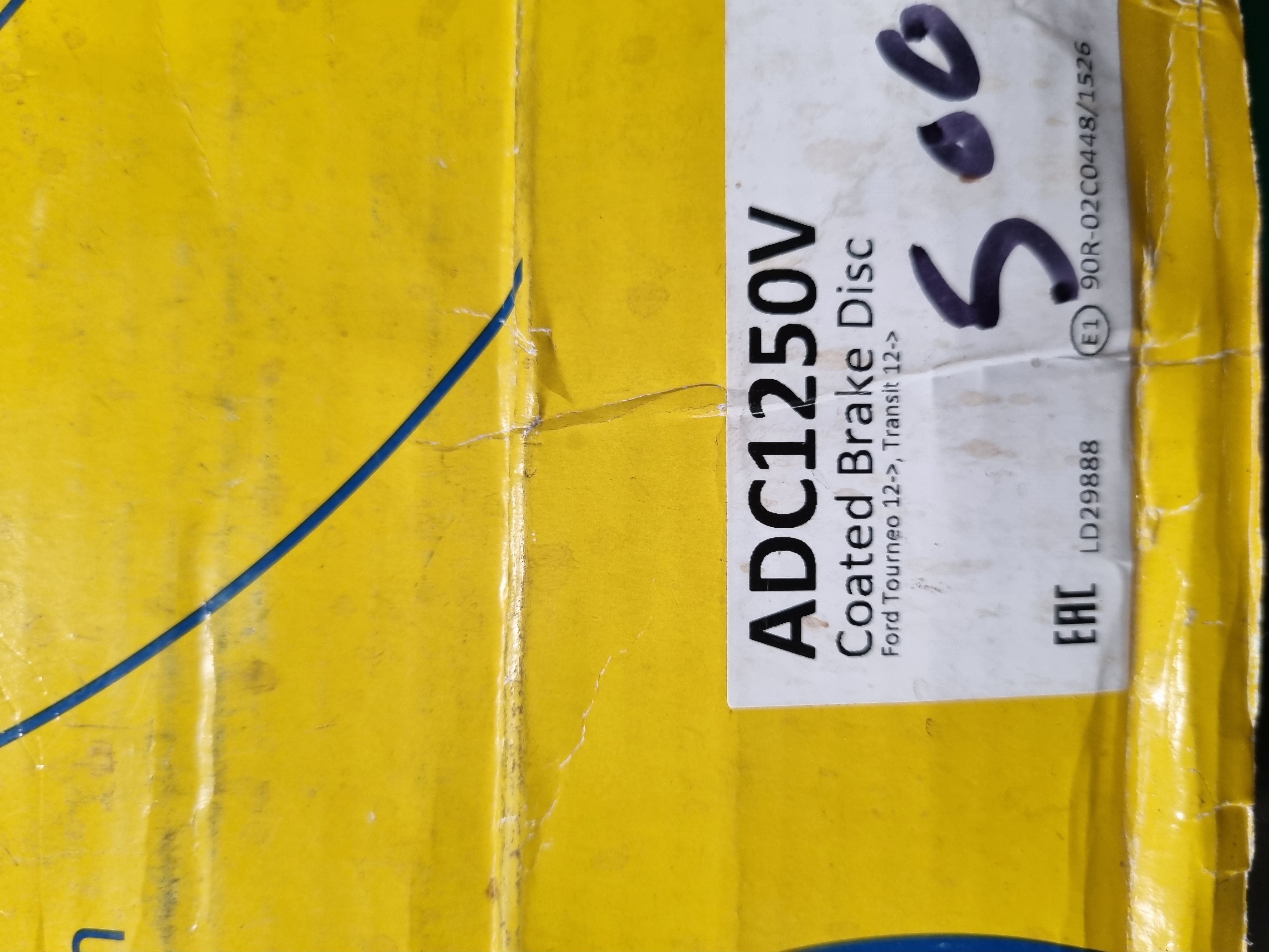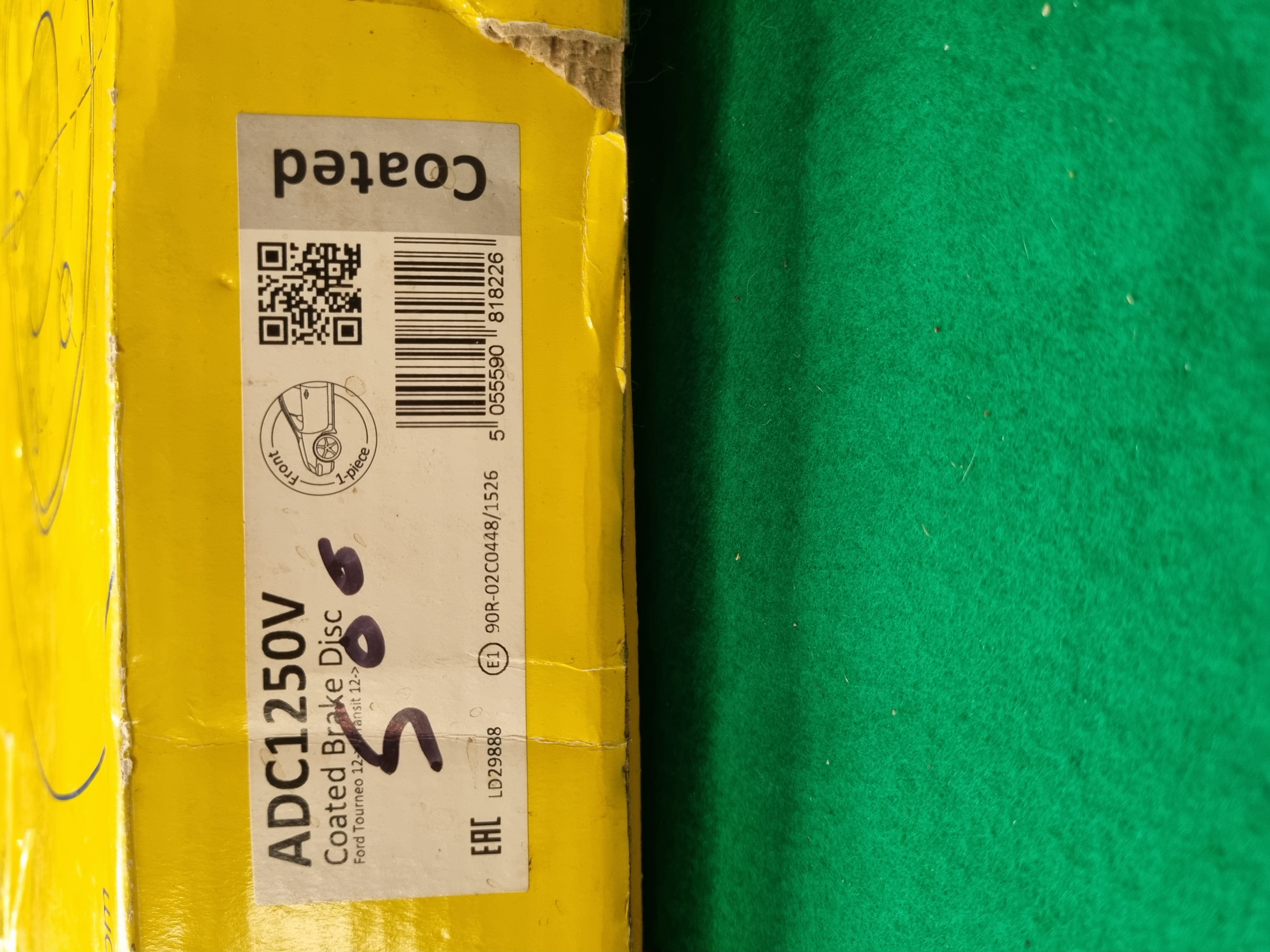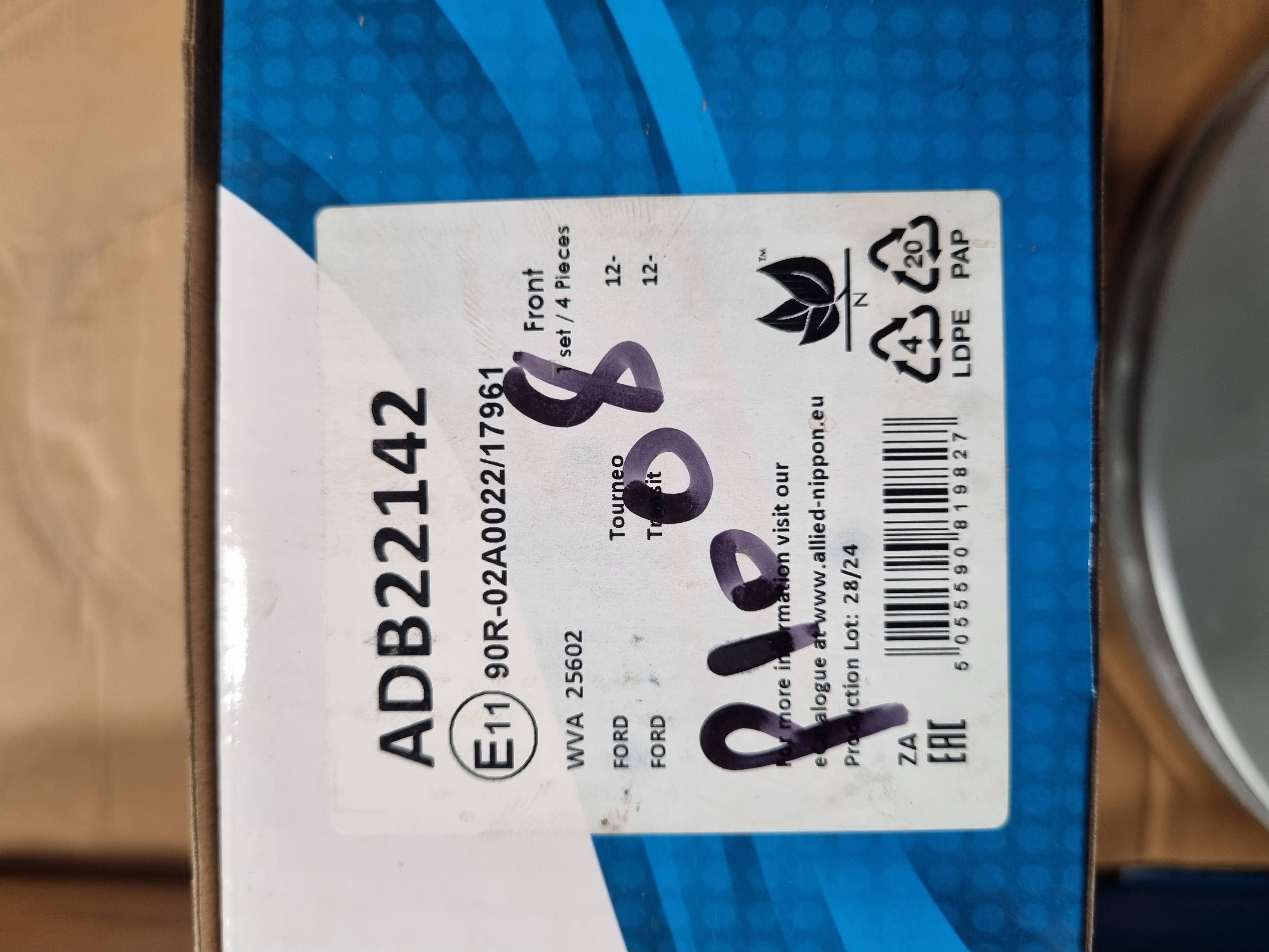 This lot comprises a collection of new automotive braking components manufactured by Allied Nippon and Comline. It includes one set of Allied Nippon front disc brake pads, part number ADB22142, WVA number 25602, which bear the E-mark E11 90R-02A0022/17961. The lot also contains two Comline coated front brake discs, part number ADC1250V, bearing the E-mark E1 90R-02C0448/1526. These parts are designed for compatibility with Ford Transit and Tourneo models from 2012 onwards. The brake discs feature a ventilated design and a factory-applied protective coating.