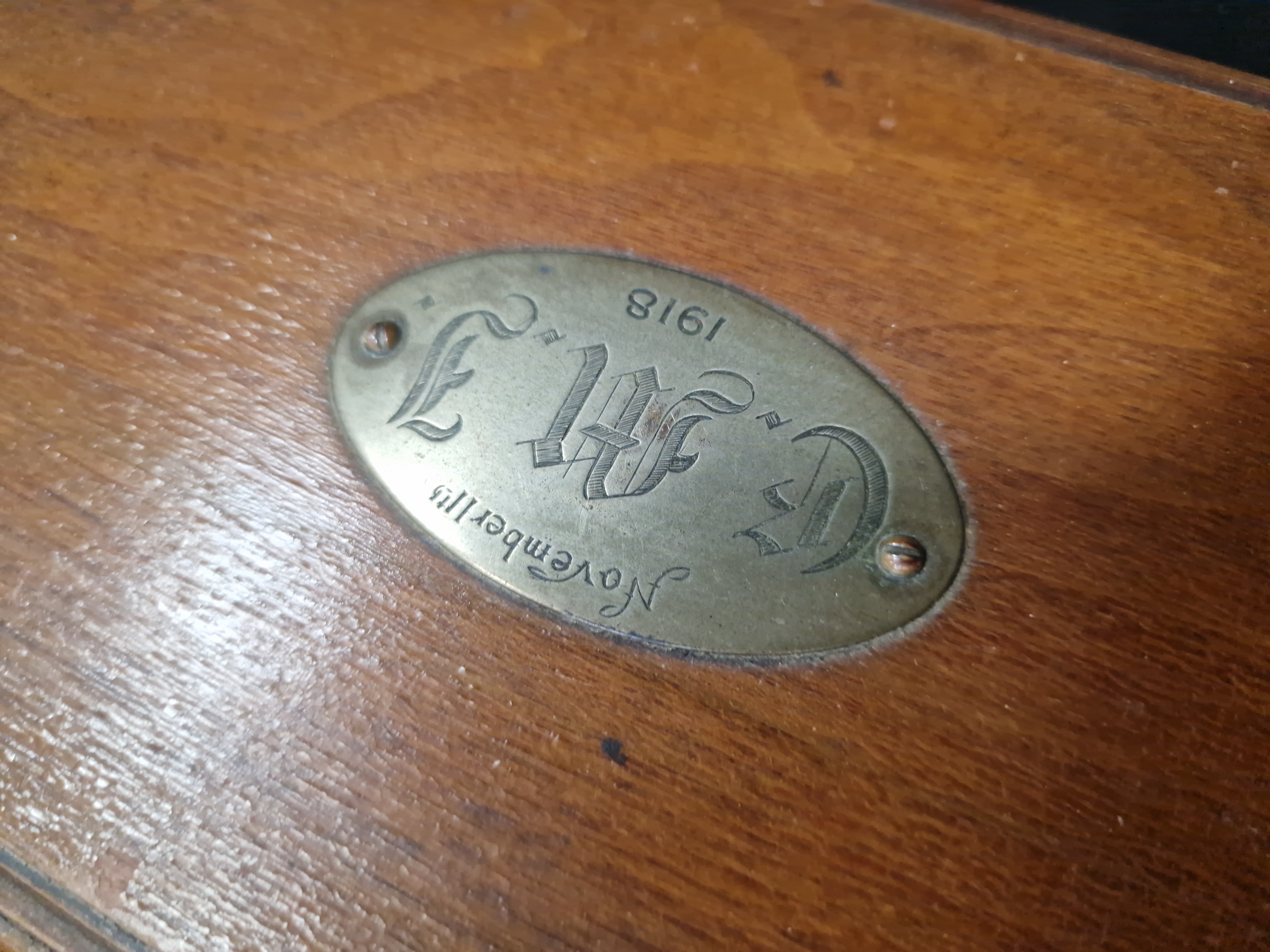 A collection of Masonic regalia and associated items, comprising Master Mason-style aprons in white with light blue ribbon borders, pleated rosettes, and metal chain-link tassels. The lot includes a black textile hood or sash featuring white and purple striped sections, white ceremonial gloves, and a blue textile piece with a gold-toned border. The collection is accompanied by wooden boxes, including one finished in black with hand-painted floral decorations and a rectangular polished wood box with a blue velvet-lined interior and a removable three-compartment tray. The polished wooden box lid is inset with an oval brass plaque engraved with the date November 11th 1918 and stylised Gothic-style initials, appearing to be E.W.L.