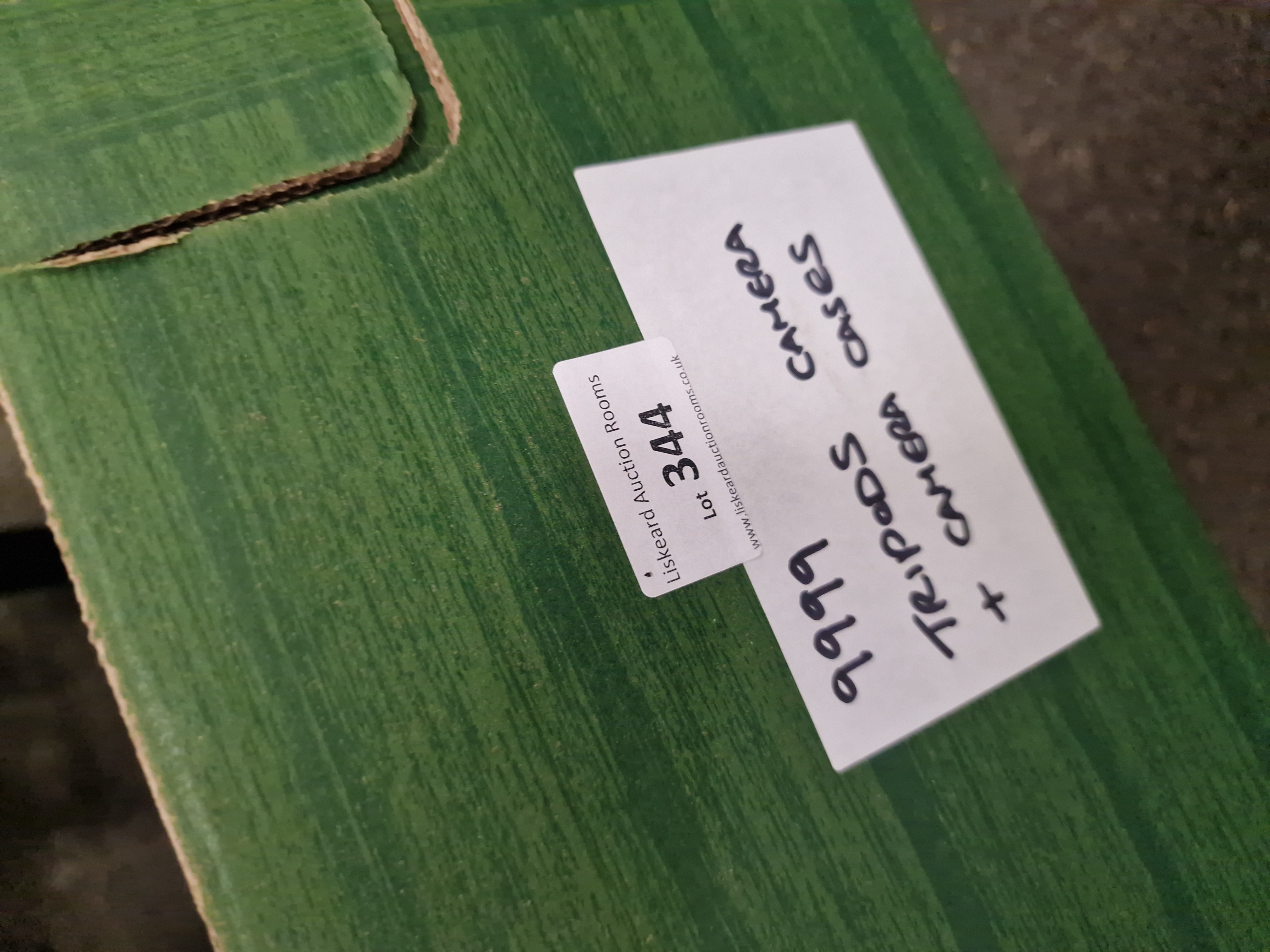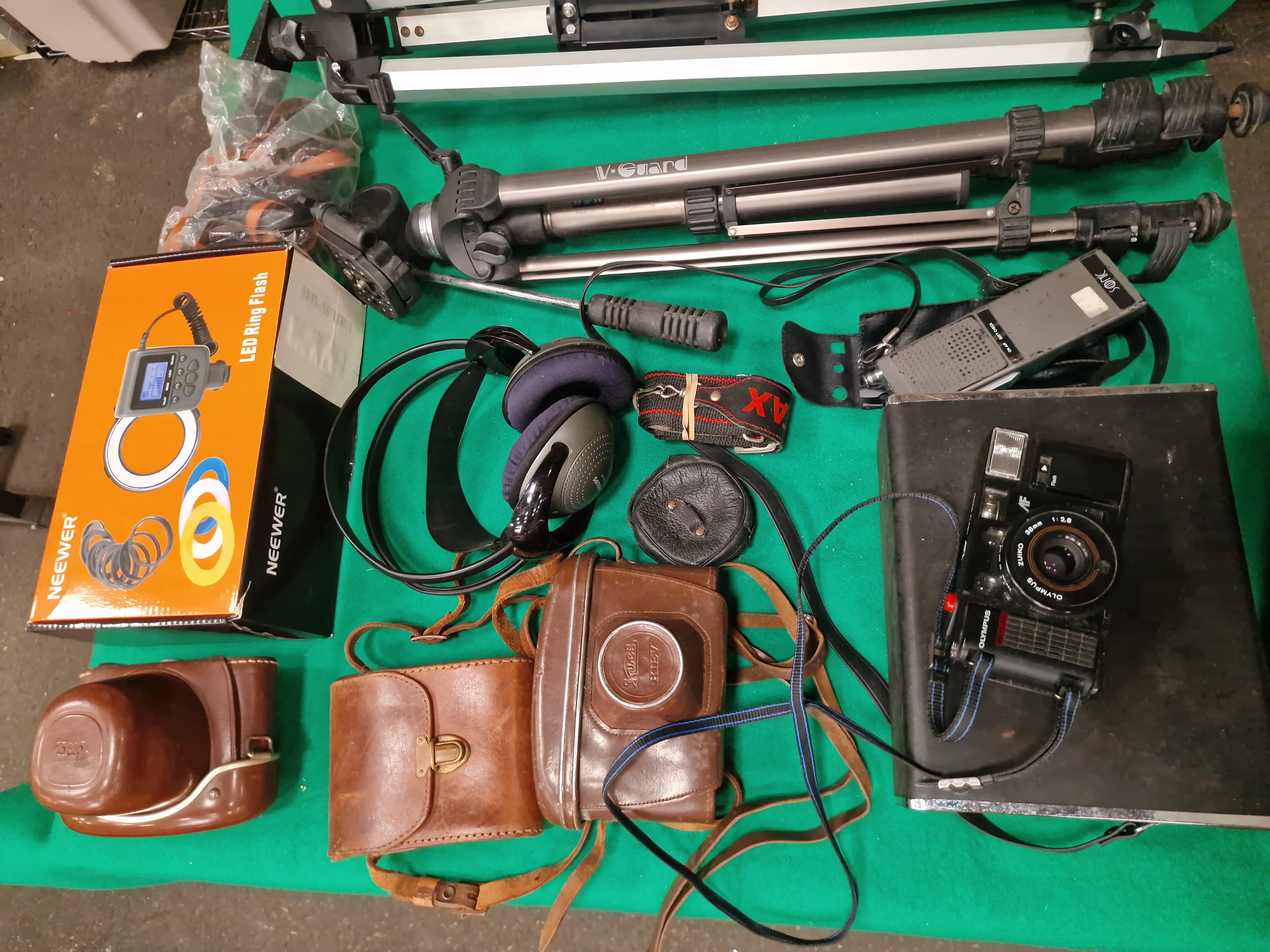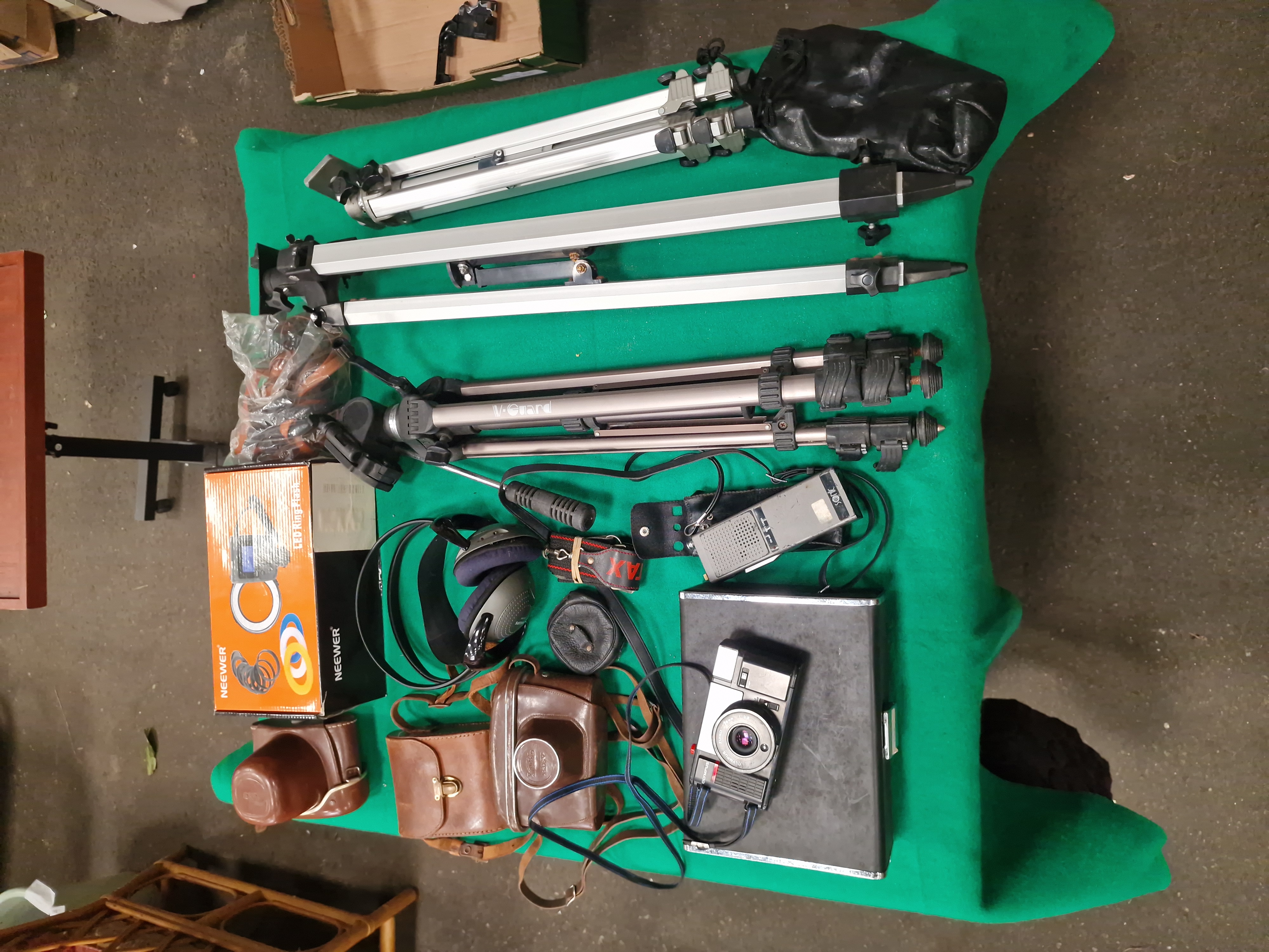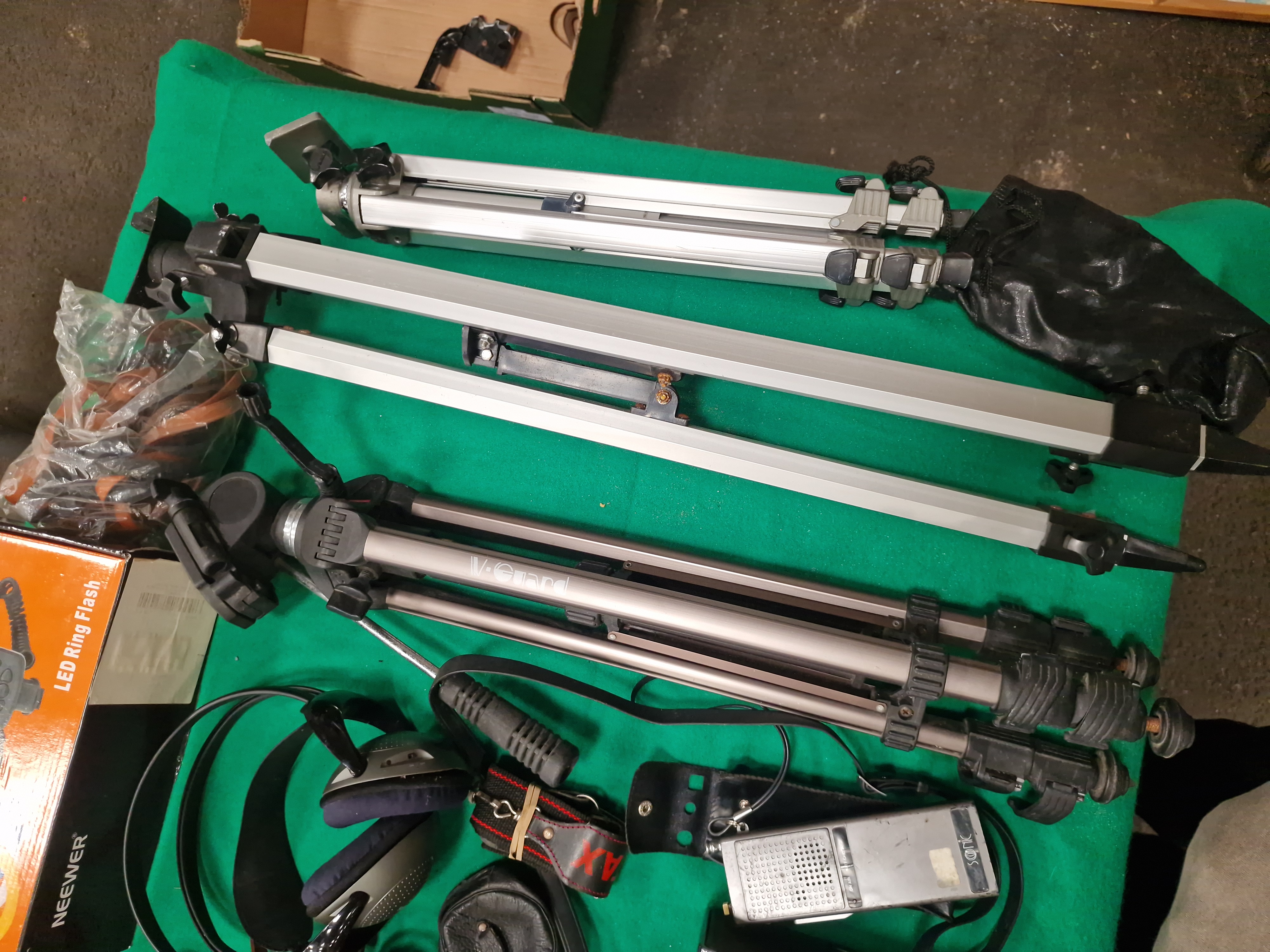 Lighting and support equipment includes a boxed Neewer LED Ring Flash and several tripods. The tripods consist of one metallic grey telescopic V-Guard tripod with a pan-and-tilt head and handle, and two heavy-duty aluminium surveying-style tripods with pointed feet and lever-lock legs.