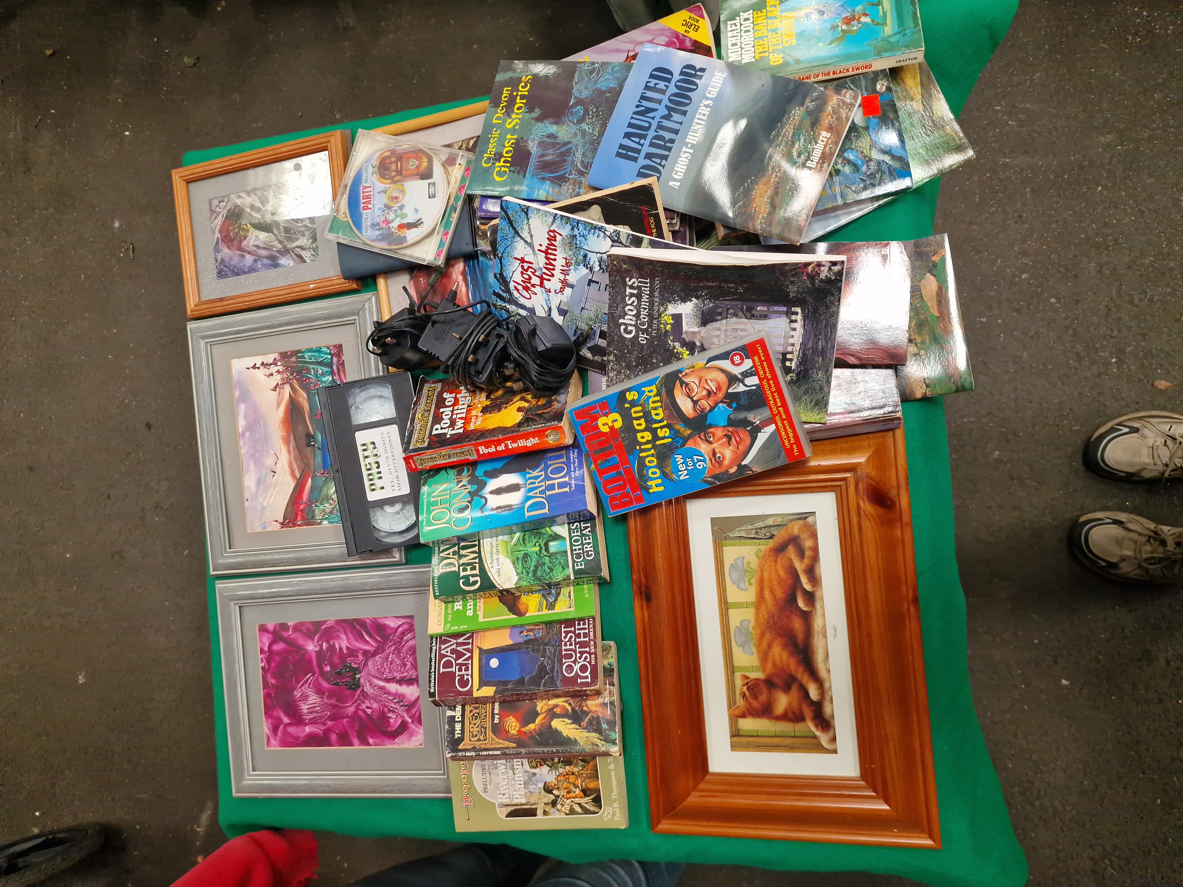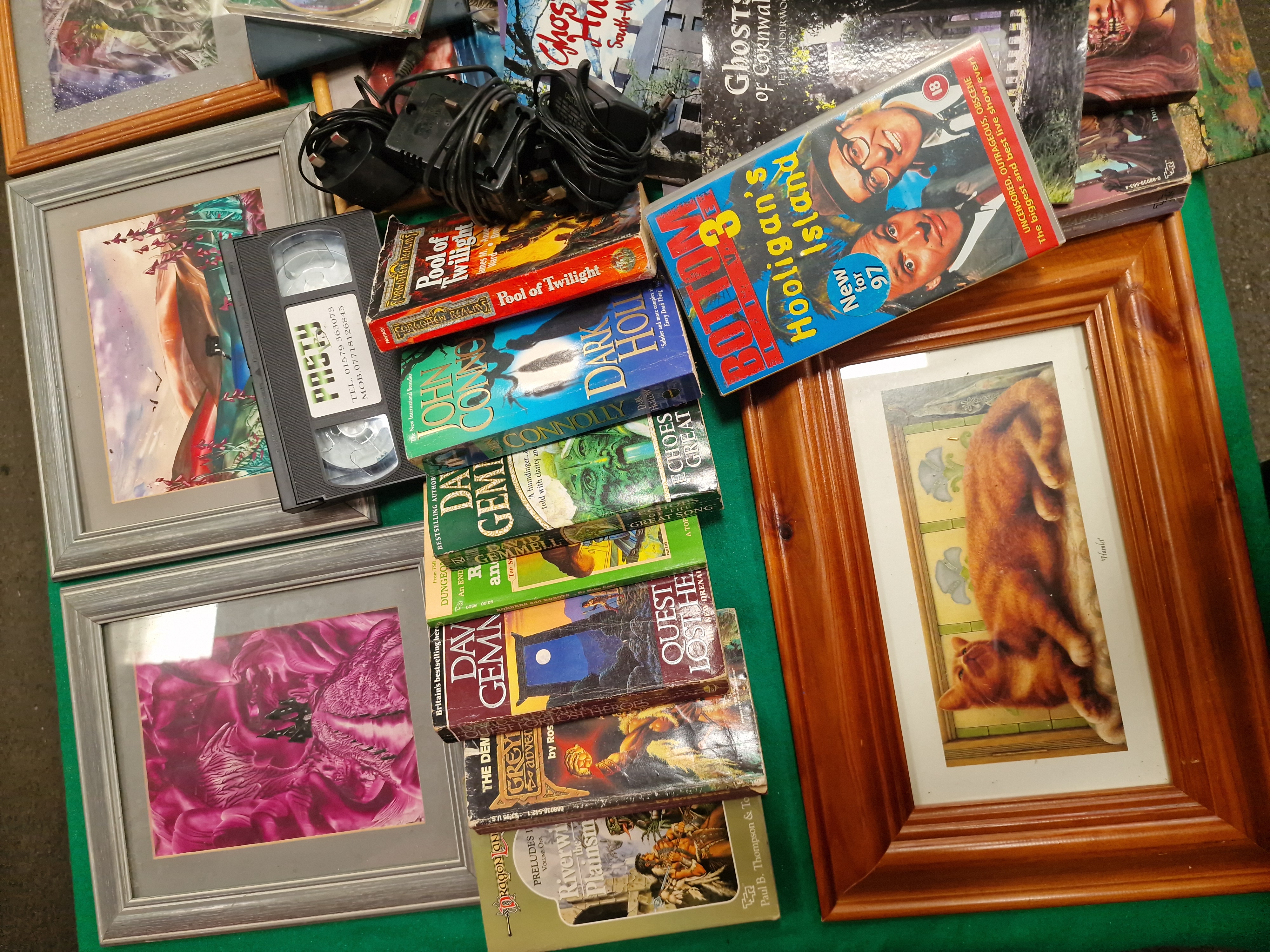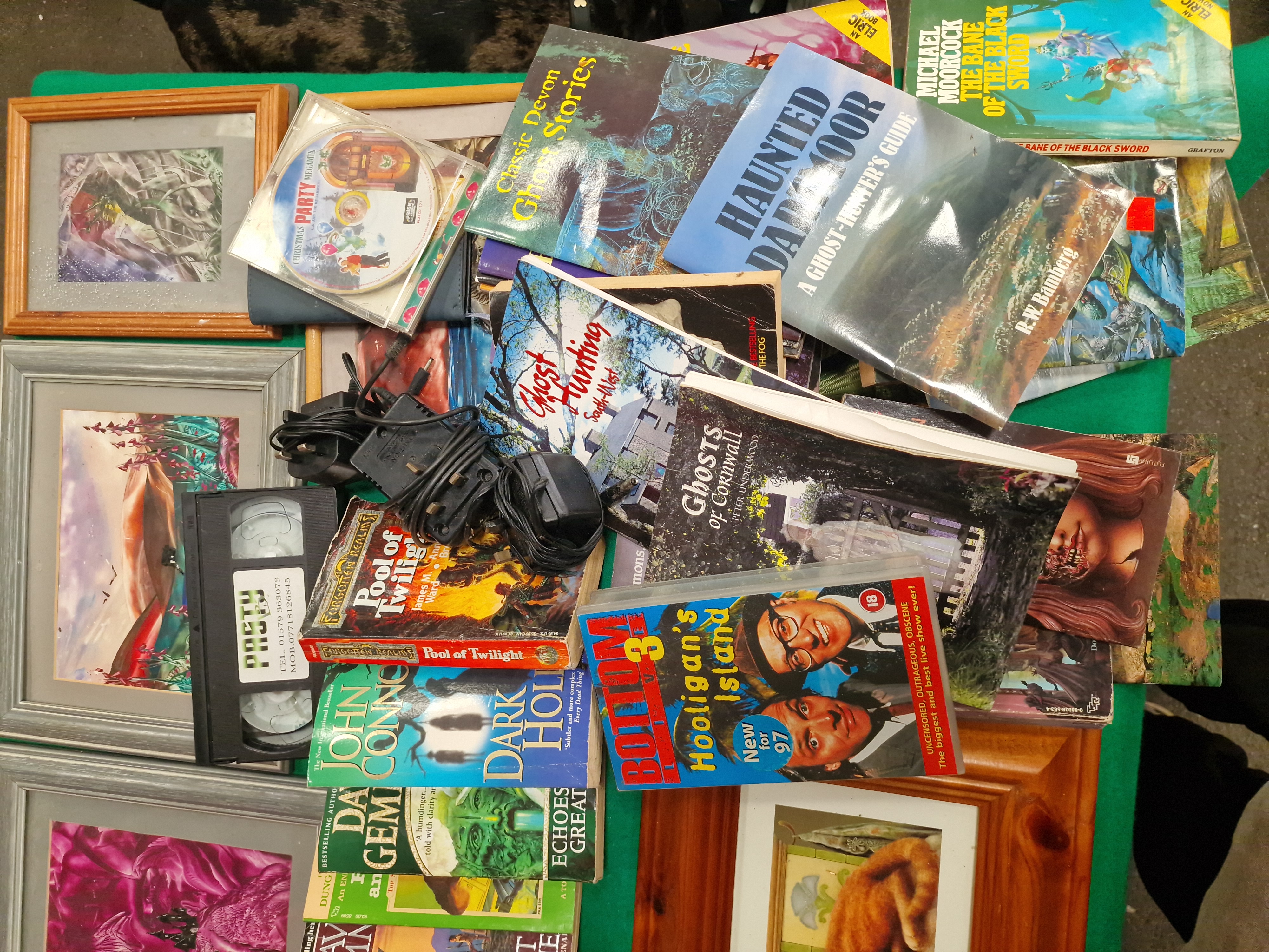An assortment of mass-market paperbacks and regional interest titles. Fantasy volumes include Michael Moorcock, The Bane of the Black Sword, Grafton, 1985 (ISBN 0586062300); Joe Dever, The Plague Lords of Ruel (Lone Wolf Grand Master); James M. Ward, Pool of Twilight (Forgotten Realms); Paul B. Thompson and Tonya R. Carter, Riverwind the Plainsman (Dragonlance); Rose Estes, The Demon Hand (Greyhawk Adventures); John Connolly, Dark Hollow; and David Gemmell, Echoes of the Great Song and Quest for Lost Heroes. Regional interest titles include R.W. Bamberg, Haunted Dartmoor: A Ghost-Hunter’s Guide; Peter Underwood, Ghosts of Cornwall; Classic Devon Ghost Stories; and Ghost Hunting South-West. The lot further comprises several framed prints, including a ginger cat titled Hamlet in a pine-effect frame, and various fantasy-themed illustrations in silver-toned and wooden frames. Media items include a Bottom 3: Hooligan’s Island VHS tape (rated 18), a VHS cassette with a typed label for Pretty Woman, and a Christmas Party Megamix CD by Prism Leisure. Also present are assorted electronic power cables and plugs. Items are housed in a yellow plastic bin and a larger storage crate, bearing an auction lot tag for Liskeard Auction Rooms, lot 345.