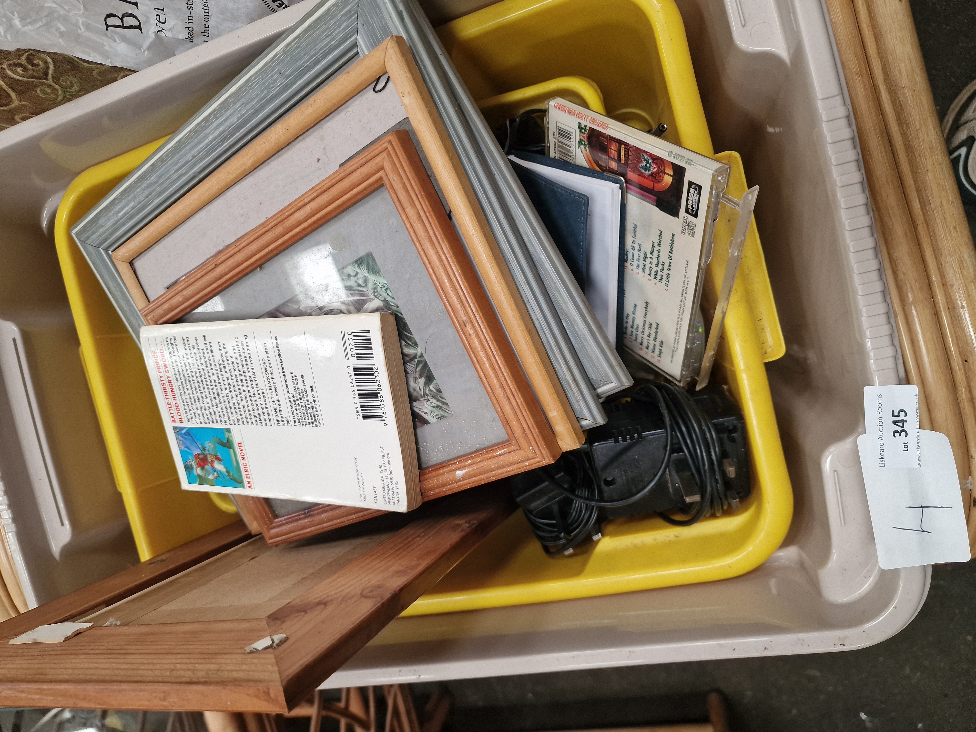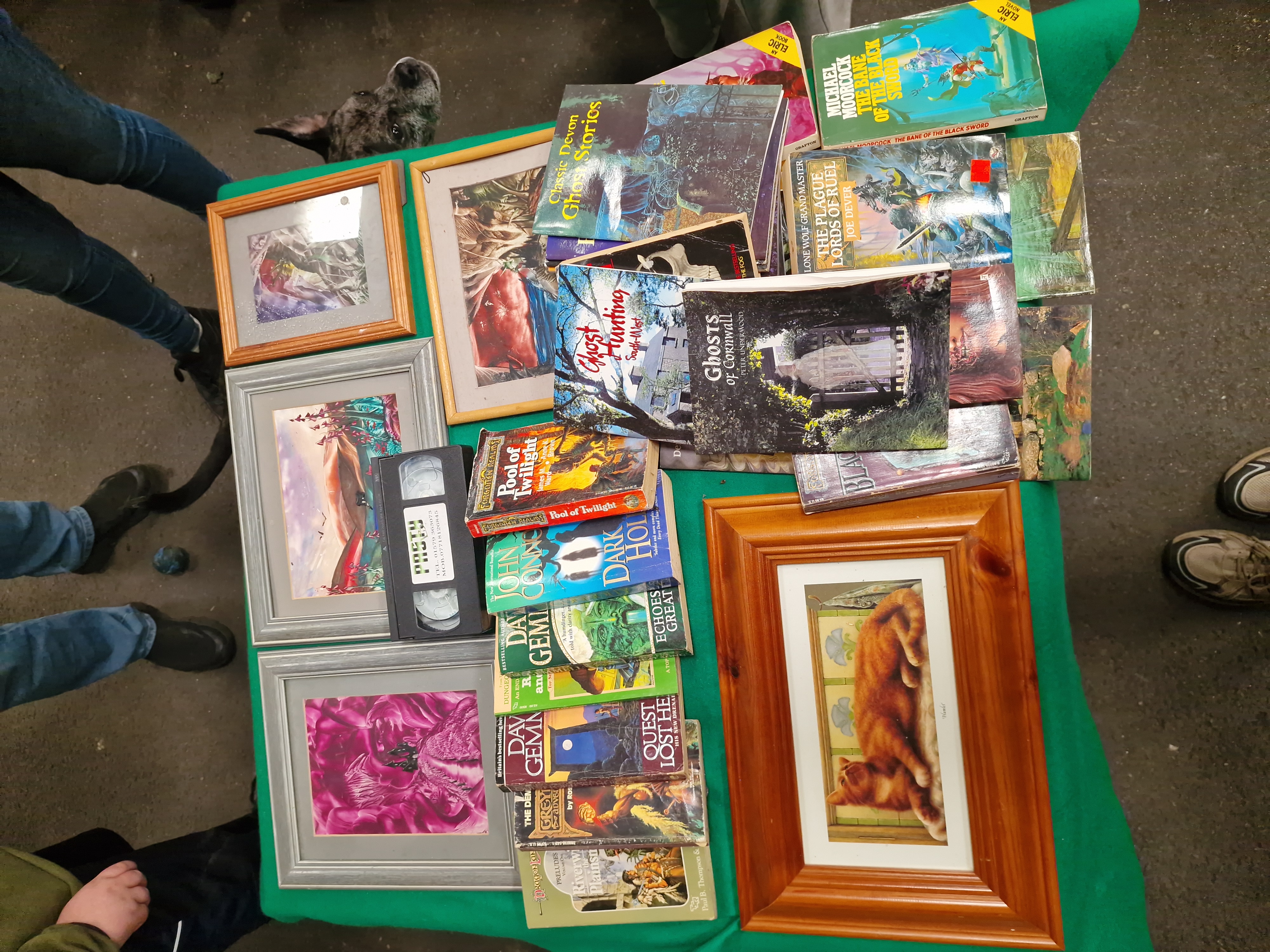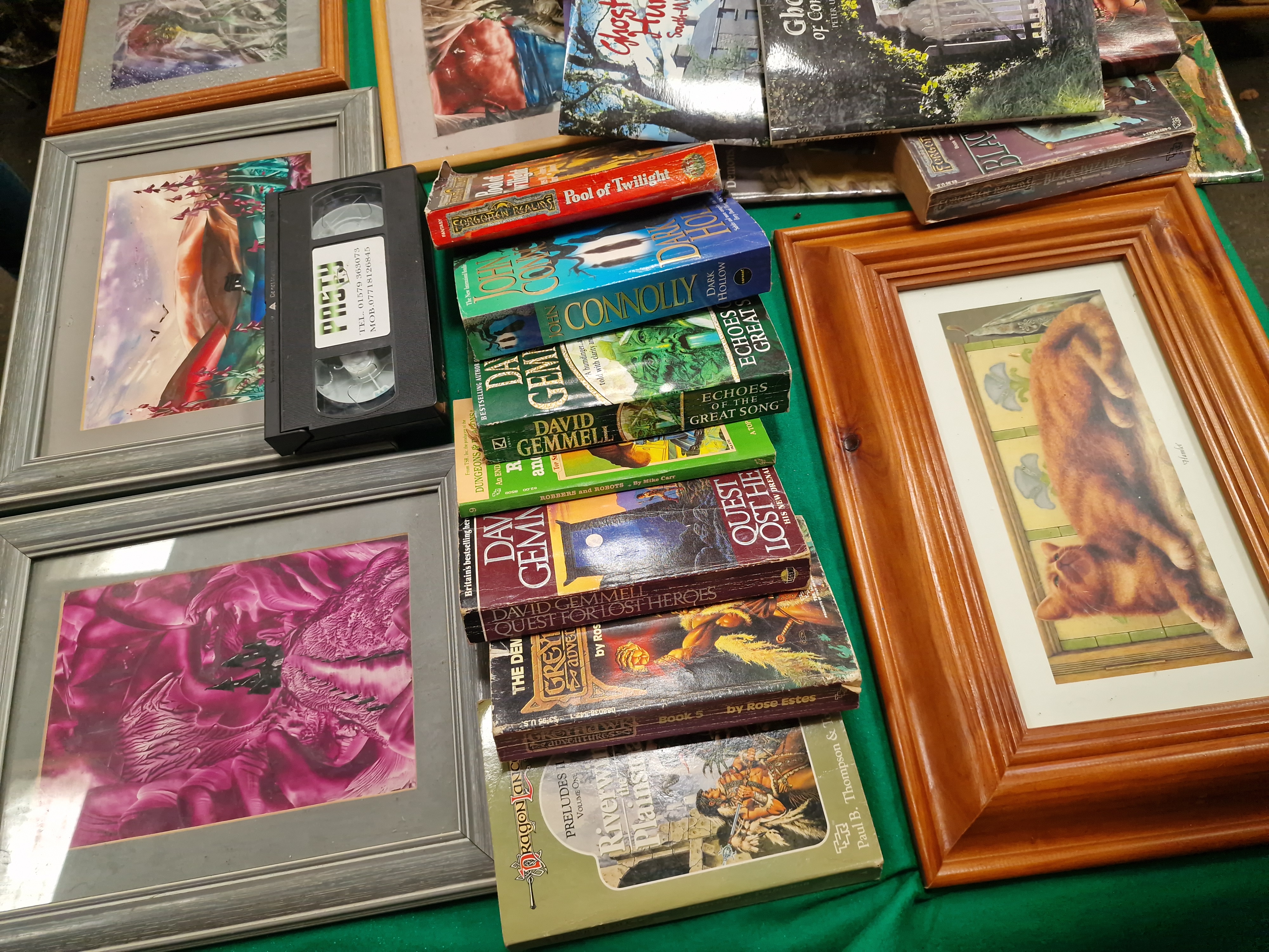 An assortment of mass-market paperbacks and regional interest titles. Fantasy volumes include Michael Moorcock, The Bane of the Black Sword, Grafton, 1985 (ISBN 0586062300); Joe Dever, The Plague Lords of Ruel (Lone Wolf Grand Master); James M. Ward, Pool of Twilight (Forgotten Realms); Paul B. Thompson and Tonya R. Carter, Riverwind the Plainsman (Dragonlance); Rose Estes, The Demon Hand (Greyhawk Adventures); John Connolly, Dark Hollow; and David Gemmell, Echoes of the Great Song and Quest for Lost Heroes. Regional interest titles include R.W. Bamberg, Haunted Dartmoor: A Ghost-Hunter’s Guide; Peter Underwood, Ghosts of Cornwall; Classic Devon Ghost Stories; and Ghost Hunting South-West. The lot further comprises several framed prints, including a ginger cat titled Hamlet in a pine-effect frame, and various fantasy-themed illustrations in silver-toned and wooden frames. Media items include a Bottom 3: Hooligan’s Island VHS tape (rated 18), a VHS cassette with a typed label for Pretty Woman, and a Christmas Party Megamix CD by Prism Leisure. Also present are assorted electronic power cables and plugs. Items are housed in a yellow plastic bin and a larger storage crate, bearing an auction lot tag for Liskeard Auction Rooms, lot 345.