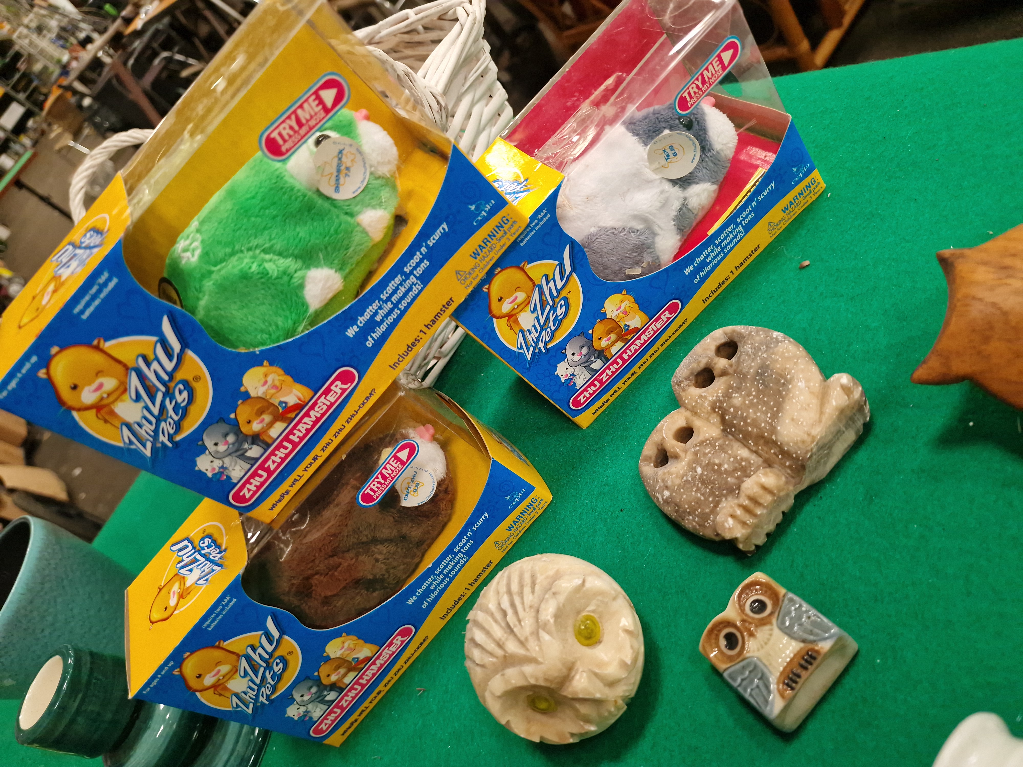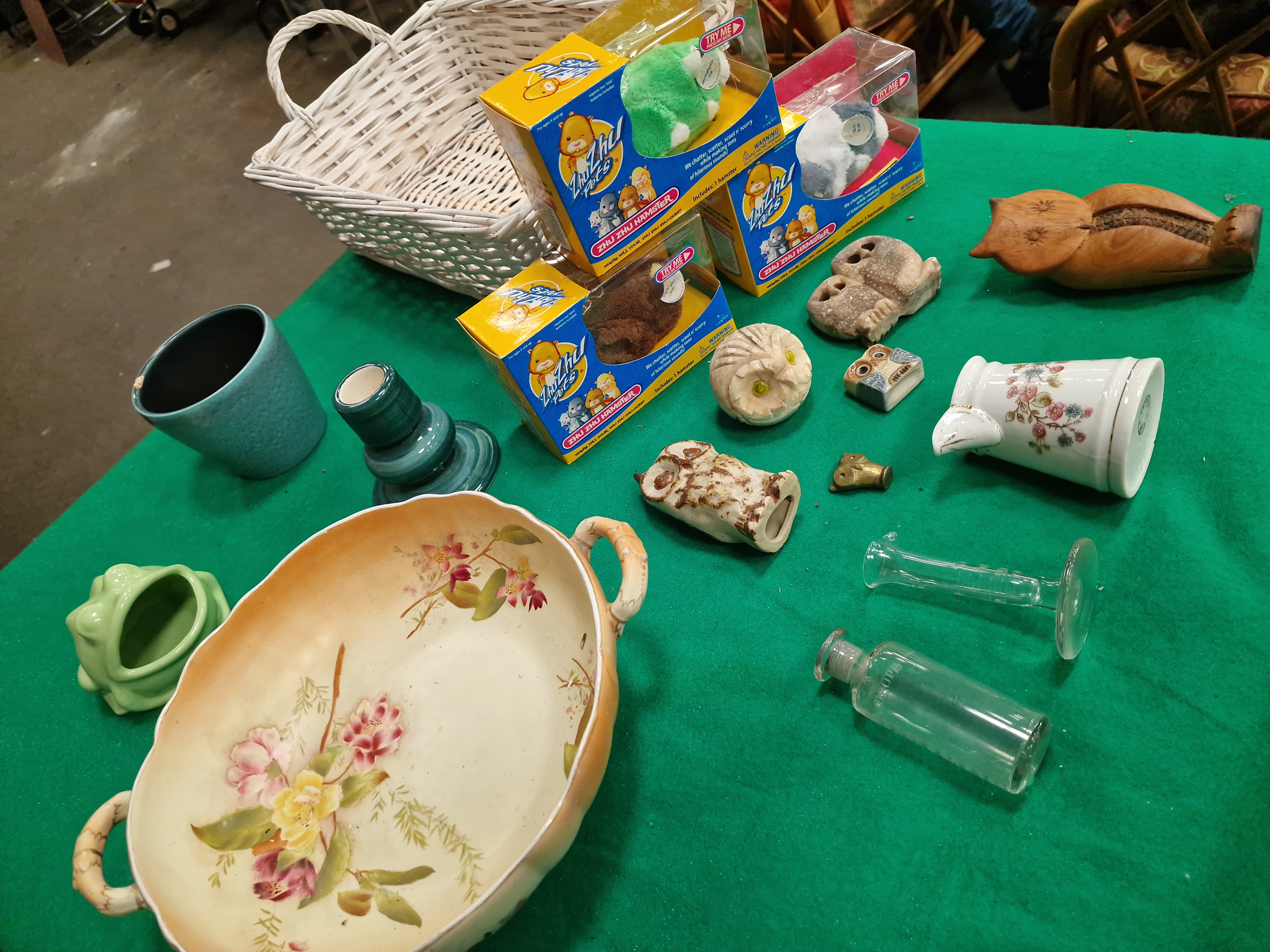 An assortment of household items and collectibles. The group includes three boxed Cepia ‘Zhu Zhu Pets’ robotic hamsters in green, grey, and brown colourways. Ceramic items comprise a large twin-handled bowl with a scalloped edge and polychrome floral decoration, a teal cylindrical planter, a dark green stepped candle holder, a lime green frog-shaped pot, and a small white floral cream jug with an illegible green circular mark to the base. The lot also features a collection of owl-themed figurines in various materials including wood, stone, and ceramic. Glassware includes two small clear glass bottles, one with a ground glass stopper and another embossed with the letters ‘S P O R T O’. Completing the lot is a rectangular white-painted wicker basket with a lot tag for Liskeard Auction Rooms (Lot 352) and a small brass-toned metal fitting.